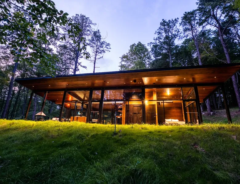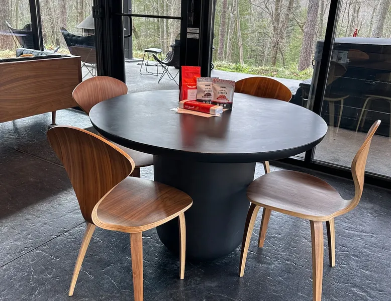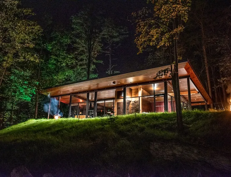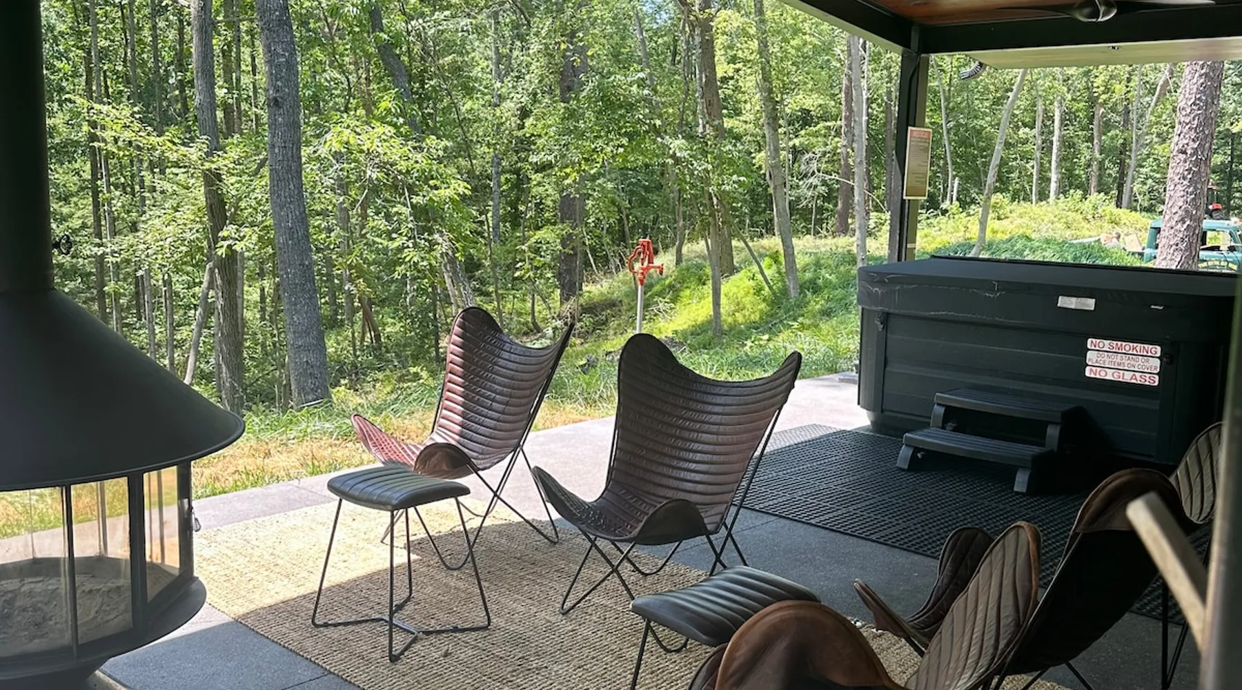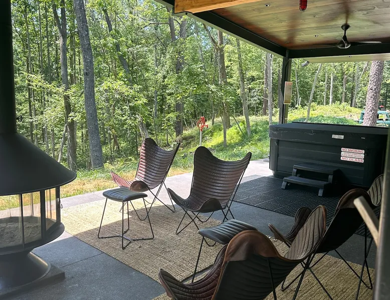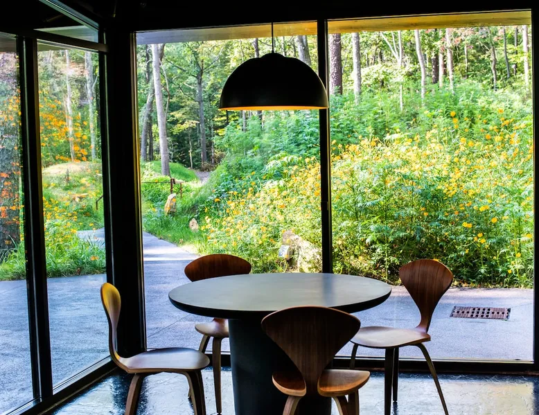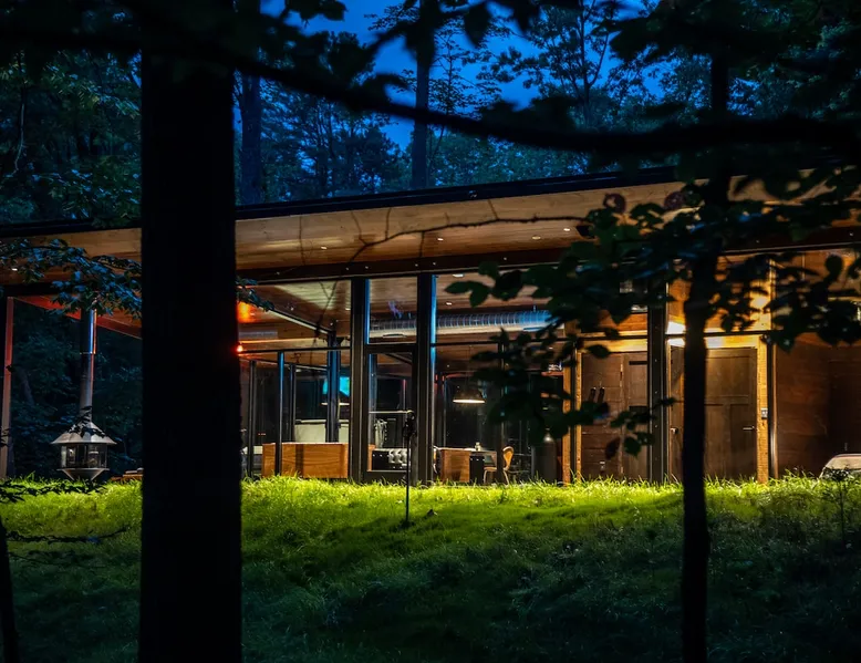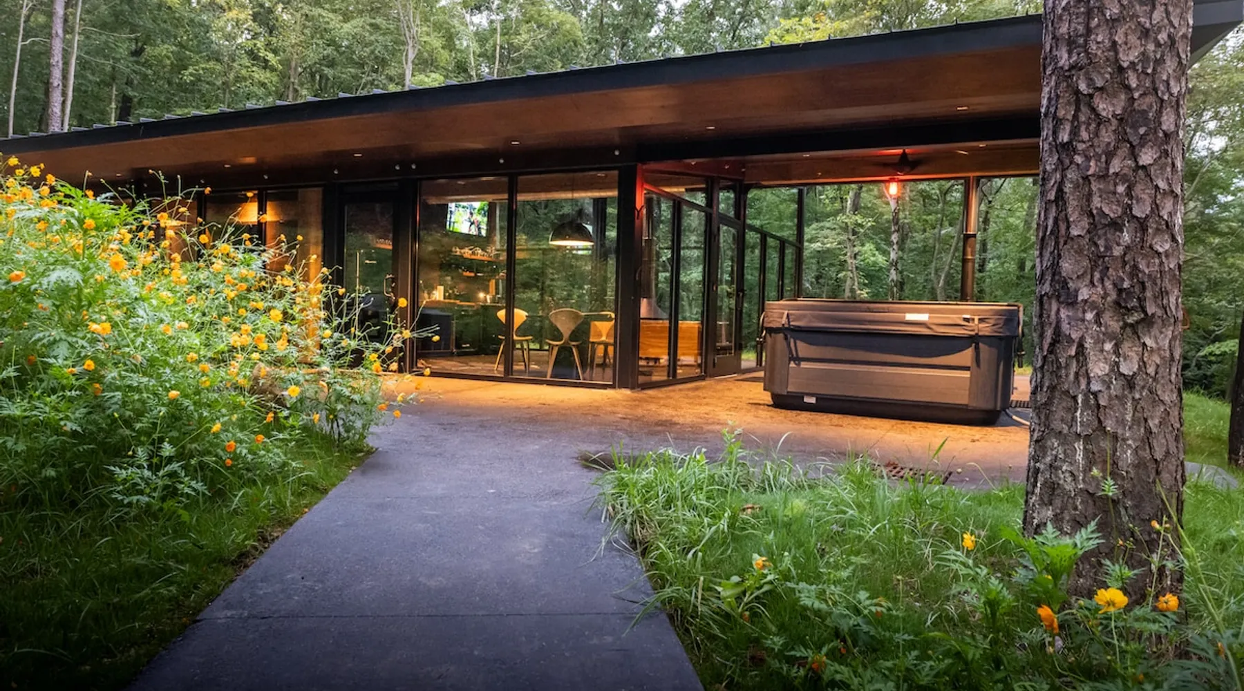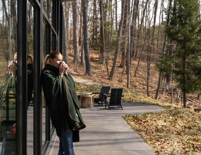The Study is a minimalist-modern cabin featuring 360-degree glass walls that invite you to gaze out while cozy inside. The indoor space seamlessly extends to spacious patios, complete with a 6-person hot tub, Malm fireplace, grill and dining area. Set on a peaceful, 24-acre forested property, you’ll enjoy tranquility and privacy just 5 miles from the renowned hiking trails of Hocking Hills. Whether you’re unwinding or exploring nearby nature, The Study offers an unforgettable luxe retreat. The space Created with 360 degree floor to ceiling glass, the Study allows total immersion into nature’s surroundings while lounging in comfort. With a strong nod to Philip Johnson’s Glass House, The Study blends mid-century appeal with the beauty of the area - including a hand-built shower with rocks from Lost Cavern, radiant-heated stamped concrete floors resembling the sandstone terrain, Douglas fir beams and a seamless transition from inside to outside patios. Featuring a carousel fireplace, Sonos speakers, 6-person hot tub, Solo stove, gas grill, bespoke furniture, and purple hybrid mattresses, we want everything about your stay to be memorable. Guest access Guests have access to the house and patios.