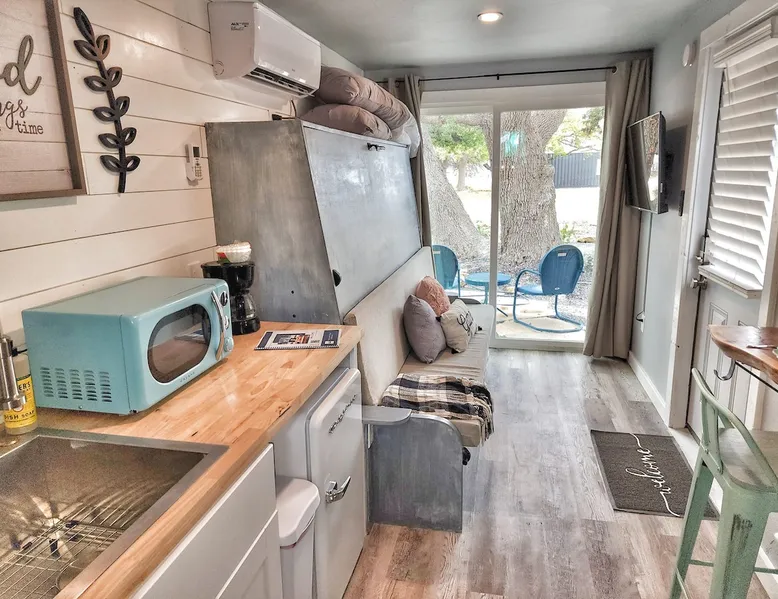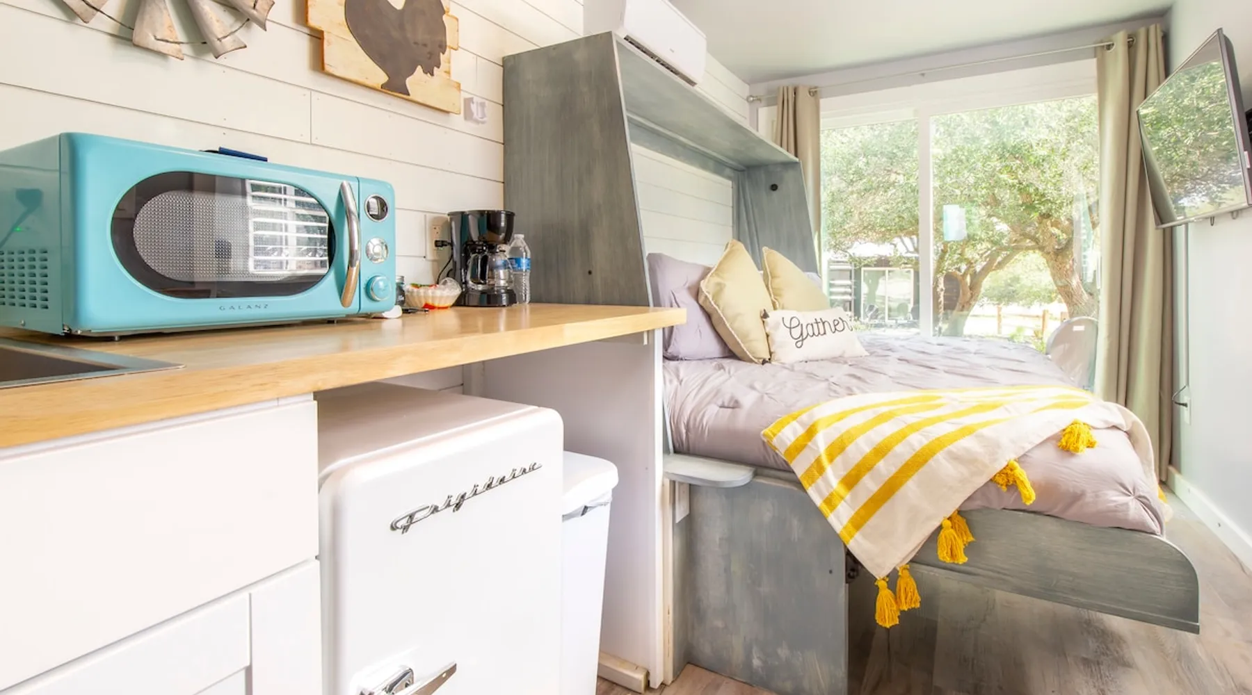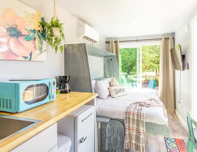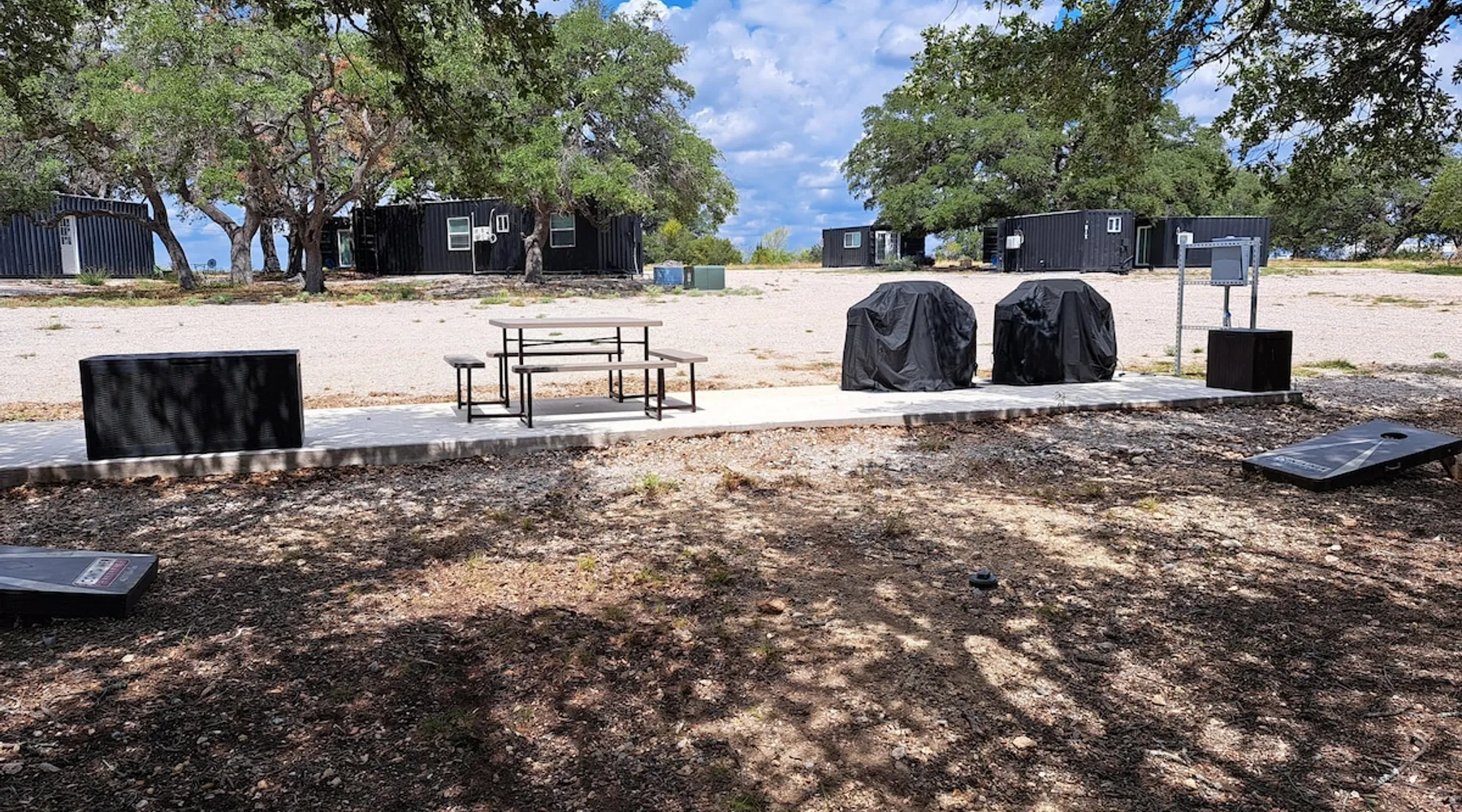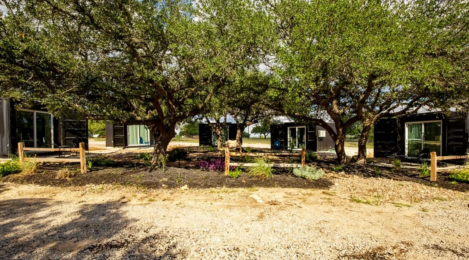 Welcome to The Container Retreat @ 290 Wine Trail! The perfect place to stay as you explore the beautiful Texas Hill Country and it's amazing wineries, parks, shops and people. We are happy to share our special getaway with you and truly hope you enjoy it as much as we do. The space This unit is a 20' shipping container that has been converted into a tiny home in the heart of the Texas Hill Country complete with a full bath with walk-in shower, kitchenette with mini fridge and microwave, dining counter and Queen-sized Murphy bed in the living room. It is a tiny home with just under 160 square feet but has everything you need for a comfortable night's sleep. The peace and tranquility is amazing and we are right in the middle of over 50 Texas Hill Country wineries. We have three within walking distance that you can begin to enjoy as you settle in: Blue Lotus Winery and Silver Dollar Winery to the east and Untamed to the west. So whether you are looking for a quick getaway or a home base while you attend one of the many festivals and events in the surrounding areas, we are the right choice. Guest access Our containers are arranged in pods of five surrounding majestic oak trees and lush landscaping with just enough ambient lighting to make it relaxing and comfortable. If you want to hang out, just walk over to the common area where you will find open space, chairs, a hammock, picnic tables, grills, giant beer pong, wooden tower game, ring games and our custom Container Retreat cornhole boards. Since we want to preserve our beautiful oak trees, we do not currently offer a fire pit. Other things to note Our mattresses were custom handmade locally from Cantwell Mattress in San Antonio. These mattresses are made in Texas with 100% All-Natural Cotton sourced in Texas. Our shampoo, conditioner and body wash are made with 100% Pure Morocco Argan Oil and are 100% Vegan & Cruelty-Free. In addition, our hand soap is made with essential oils, aloe vera, olive oil, and without parabens, phthalates or artificial colors. We have provided everything you need in our kitchenette, including a corkscrew and wine pourer to enjoy your Texas Hill Country wine. Couples getaway, check! Girls weekend, check! Bachelor or Bachelorette parties, check! Whatever the occasion, we are the right choice. We have twelve other listing and can accommodate groups of up to thirty two. Photos are representative of Containers Two - Eight and décor may vary, but the layout is the same. If you need to book larger parties, we have a total of ten 20' containers available that can accommodate up to 20 adults.