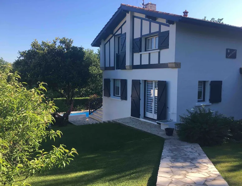 Ciboure,Beautiful cozy villa in the residential and sought after area of Bordagain, with views of the Rhune, and swimming pool 10 minutes walk from the beach of SOCOA. Calm and tranquility assured. The space I suggest you come and stay in my 160 m2 house in a wooded and flowered garden in Ciboure, Bordagain district, close to the sea 1 km) in a residential area. My house is ideal for couples, families, and friends who want to visit our beautiful region while having the feeling of being at home - 3 bedrooms including 1 master suite with bathroom and shower on the ground floor, 1 bedroom with a 160 double bed (master suite), one bedroom with a 160 double bed and one bedroom with a 140 bed upstairs. Linens, bath linen are provided ( from 15 days of rental) The garden offers 4 different "poles" of life: the pool house at aperitif time, kitchen for breakfasts, the dining table, a seating area that invites you to relax to read in the afternoon. Large terrace of 30m² facing south with views of the Rhune for lunch. - Pool house and garden furniture - South exposure - Laundry room with washing machine, dryer, oven and additional electric plates, freezer - Wifi throughout the house - 1 gas plancha is available but we ask you to clean it each time you use it and replace the gas refill if necessary - The American-style kitchen, very friendly, is fully equipped and very functional - Parking Guest access Nearby beach and shopping Other things to note 2 km from the train station and 15 min from BIARRITZ AIRPORT Registration Details 6418900064179