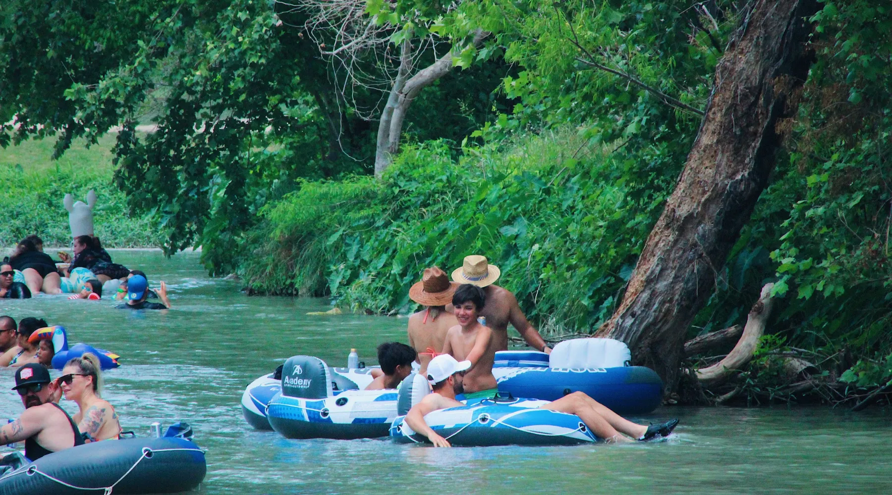 Stay the night in a brand new, insulated and air-conditioned, one of a kind Luxury Glamping Cabin! Our Luxury Glamping Cabins are fully furnished and have everything you need to stay comfortable including foam mattress beds, linens and towels, kitchenette comfortable outdoor furniture, hammock, firepit and more! If you want to enjoy the great Texas outdoors without the setup and hassle of tent camping, while having all the creature comforts of home, our Luxury Glamping Cabins are for you! With a Luxury Glamping Cabin rental, you and your guests will enjoy the beautiful scenery and peacefulness of Son’s Blue River Campground which sits on the San Marcos River with its blue spring water and majestic tree studded banks. Sit ‘round the campfire at night and gaze at the big, bright, Texas starry sky! We are surrounded by large ranches which makes for a great outdoor get away from it all experience! There are 40 Luxury Glamping Cabins in total, cabin #’s: A-Z come with: 2 queen sized beds with foam mattress (sheets, pillows and blankets provide as well as towels), a kitchenette with mini fridge, coffee maker, hot plate and blender. Note: we do not provide silverware and dinnerware, so be sure to bring these. For inside entertainment and relaxation, Guests will find a TV and DVD player. Outdoor amenities include: comfortable wicker seating, hammocks, fire-pits, BBQ pits, picnic table, outdoor lighting, water and electricity. We also have 12 other Luxury Glamping Cabins #’s 1 – 16 which are similar in every way but have 1 queen bed and 1 twin day bed. Be sure you are booking the type you want! The unique design of our Luxury Glamping Cabins allows you to open up the entire front wall to enjoy an indoor/outdoor living experience, perfect for eating, relaxing and reconnecting with your friends and family. There are three 5-unit bathroom trailers by our glamping cabins (15 full bathrooms in total with showers) for your use. While at Blue River Camp, rent a riverside cabana or covered picnic table for the day or evening and go tubing, kayaking or fishing! Hang out at the river, lay in a hammock, tube, kayak, BBQ, play beach volleyball, swim, fish, roast marshmallows under the stars and more! Son's Blue River Camp has it all! Son's River Ranch is only 2 miles up the river and is our tubing put in location. During the warmer months we have shuttle vans and buses taking gusts upriver to enjoy a nice float back down to Son's Blue River Camp. The trip takes around 2 hours to tube and is very enjoyable! The property is only 30 miles from all the exciting attractions of New Braunfels and Gruene including: Schlitterbahn Water Park, Gruene Dance Hall, Son’s Island and much more. The exciting town of San Marcos with its great restaurants, shopping and night life is only 16 miles away. San Antonio is an approximate 50-minute drive and Downtown Austin is only a quick 30 minutes driving down the new 85 MPH I-130. The town of Lockhart and Luling are nearby and have some of Texas’ best BBQ!