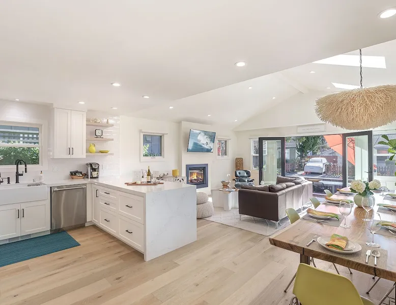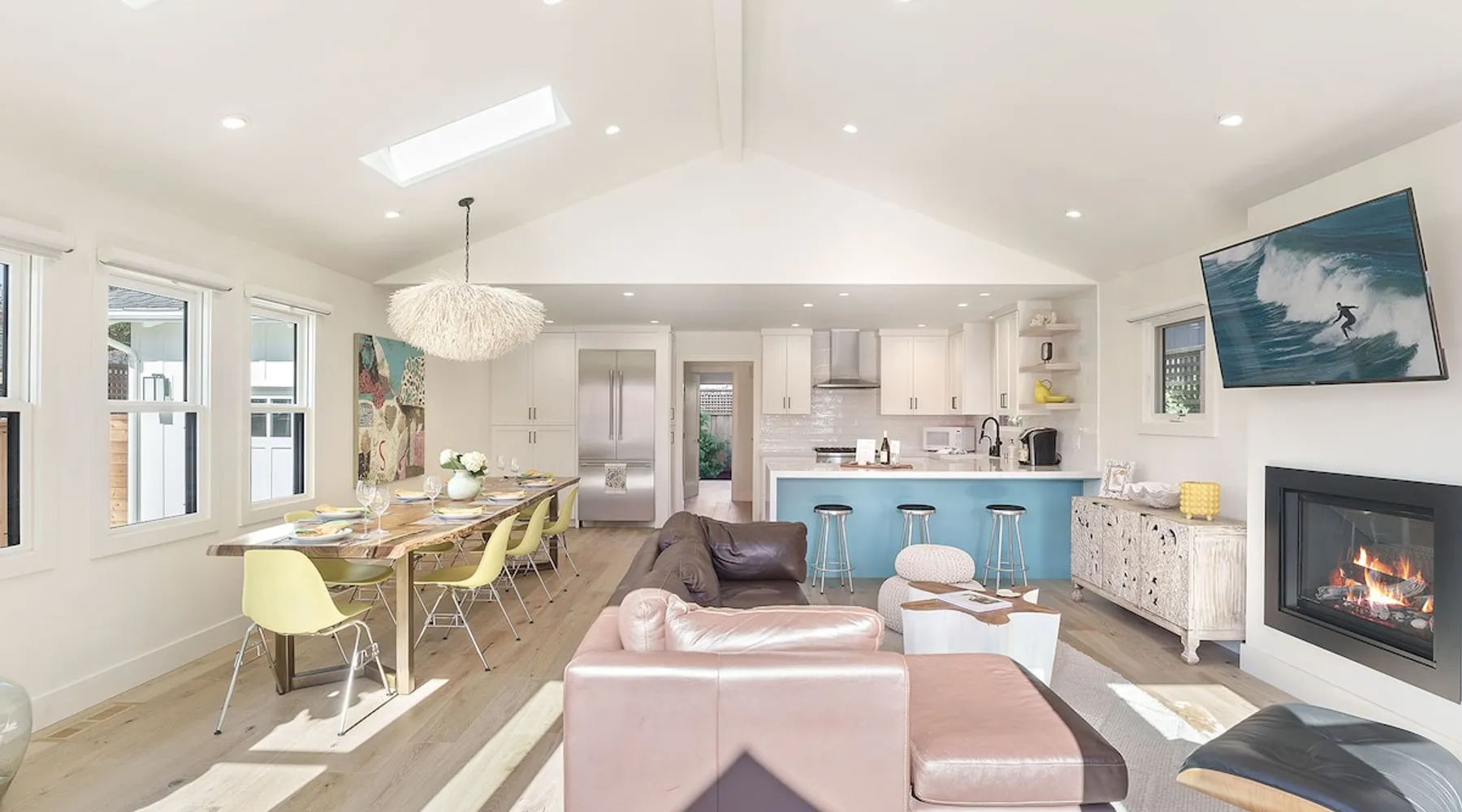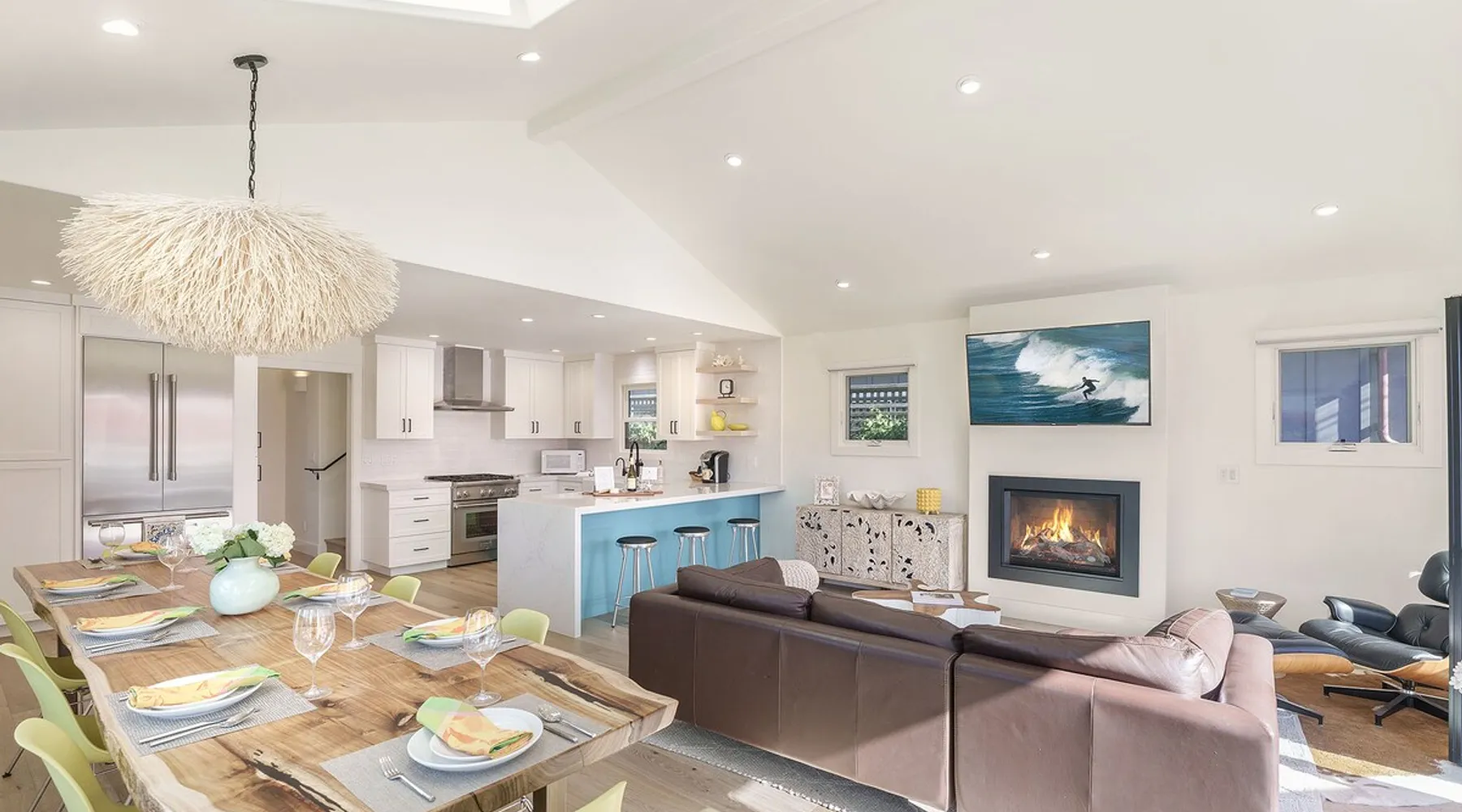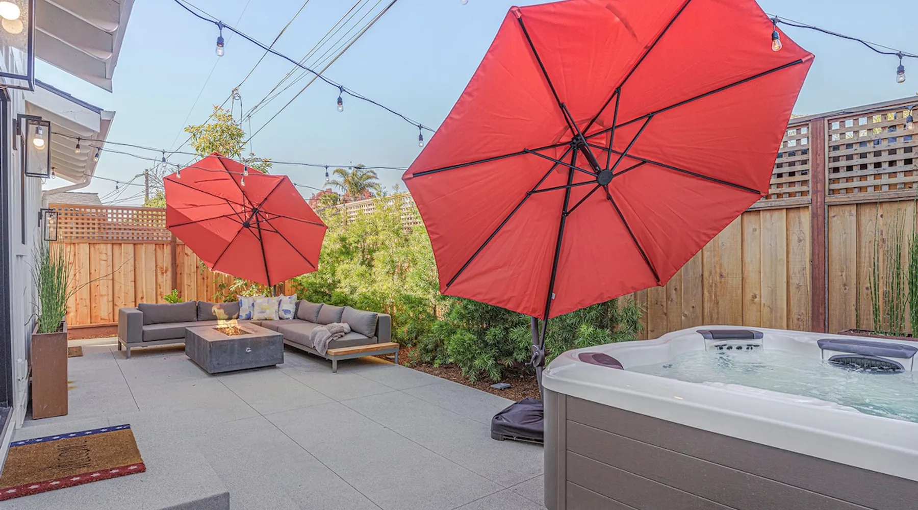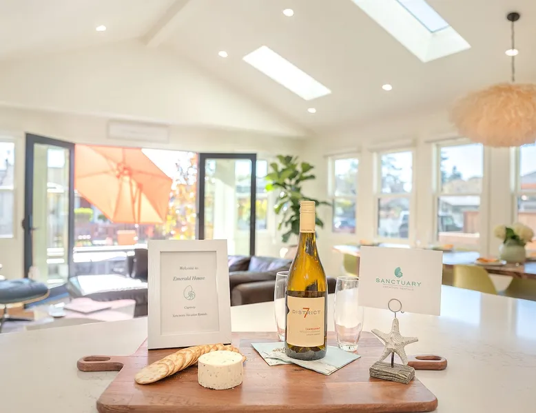 This unit is a monthly rental. We request that all nights of your stay are within the same month. Some exceptions may be made, with the approval of our team and the homeowner. Please refer to our House Rules for further information. 1,475 sf, 3 bedroom, 2.5 bathroom vacation home sleeps up to 6 guests. King, Queen, Queen. Bonus room. Dog OK. No garage. Sanctuary Vacation Rentals is proud to present "Emerald House"! This home sleeps up to 6 guests. The space This completely updated gem sits on a quiet street a short walk from Hooper Beach and Capitola State Beach, Capitola Wharf and countless other attractions and conveniences. This home-away-from-home has everything the family needs to enjoy their vacation time from beach gear, BBQ grill and fire pit to a backyard hot tub and outdoor shower. Get out the ping pong table and games and create some good-time memories together. Living Space Open concept style living/dining/kitchen flow seamlessly onto the front deck with a grill and seating where meals can be enjoyed al fresco. Lofty living areas are gracious and the family can gather around a large live-edge acacia table. The living area has a large flat screen Smart TV mounted over a gas fireplace, where you can cozy up in front of your Netflix queue and binge watch your favorite programs. There is even a super comfortable, very high-end, Restoration Hardware "Cloud Sectional" providing the ultimate in relaxed lounging. This home is very well equipped for extended stays! Kitchen and Dining The fully-equipped gourmet kitchen with stainless steel Thermador appliances will surely please even the most discriminating of chefs. Kitchen includes peninsula seating, luxury finishes and extras like both Keurig and drip coffee makers. A large table is at the center of the home and will be a favorite gathering spot for the family. Bedrooms and Bathrooms Main/lower level primary bedroom with king bed and en suite bathroom featuring a large shower with handheld wand and custom tile work. Also on the lower level near the living areas is a half-bath. Two upper level bedrooms each have a queen bed and are adjacent to the hall bath with standing shower and custom tile. Bonus Room The garage space has been converted to a bonus room with a comfortable sofa, large flat screen Smart TV with streaming services, games, beach gear and the washer and dryer. The folding ping pong table can be rolled out into the driveway for more fun and games. Outdoor Spaces When you aren't frolicking on the beach or exploring the Capitola area, you'll want to hang out on the front deck with a BBQ grill, dining table with umbrella or on the rear patio with comfortable seating, large umbrella, a hot tub and an outdoor shower. 1,475 square feet, but the open floor plan makes the home feel larger, modern, light and airy. Well-behaved dogs are welcome with pre-approval, an additional pet fee and a signed pet addendum. Dogs should not be left alone anywhere on the property during your stay. Quiet Street with a Driveway for 1-2 cars and street parking available. This home is a monthly rental because the City of Capitola does not allow rental terms of less than 30 days. We request that all nights of your stay are within the same calendar month. Some exceptions may be possible, with the approval of our team and the homeowner. Extended stays are often possible. This vacation home is professionally managed by Sanctuary Vacation Rentals. With over 15 years of property management experience, Sanctuary strives to provide environments that nurture and inspire with all the comforts of home. Each home has beach towels, shower and bath amenities and spa-style robes. Our team is available 7 days a week to assist you. We look forward to hosting you! Other things to note This unit is a monthly rental. We request that all nights of your stay are within the same month. Some exceptions may be made, with the approval of our team and the homeowner. Please refer to our House Rules for further information.