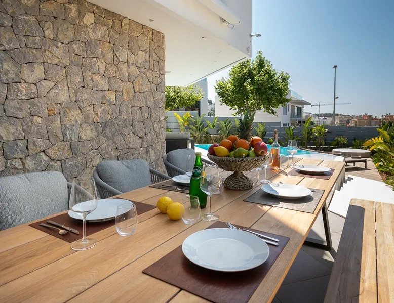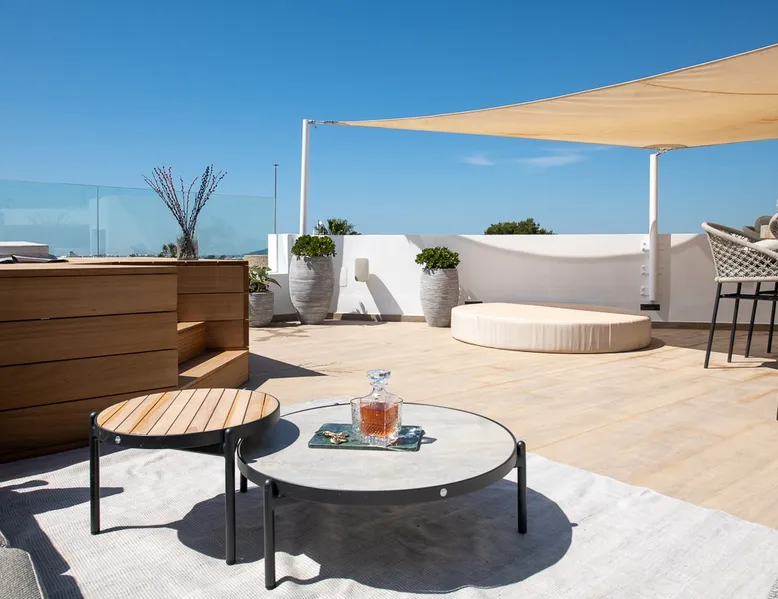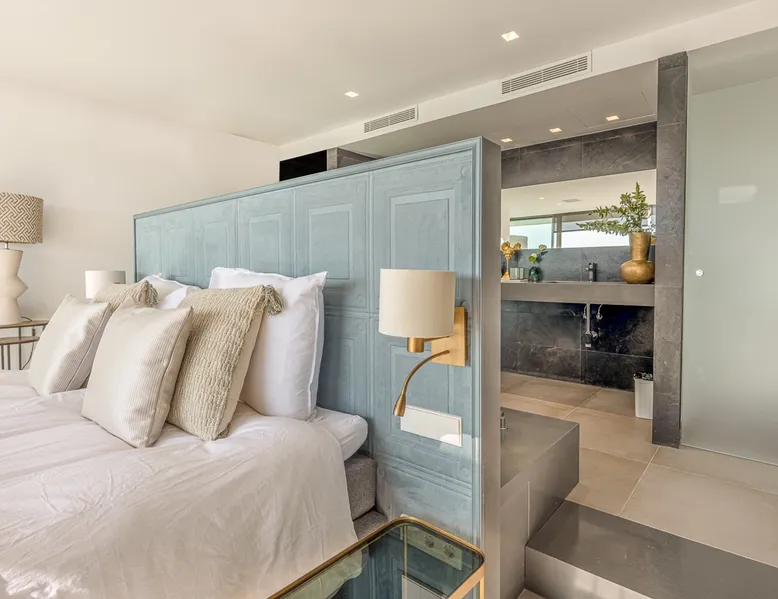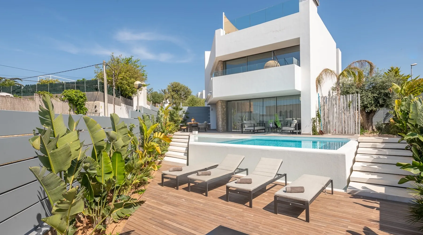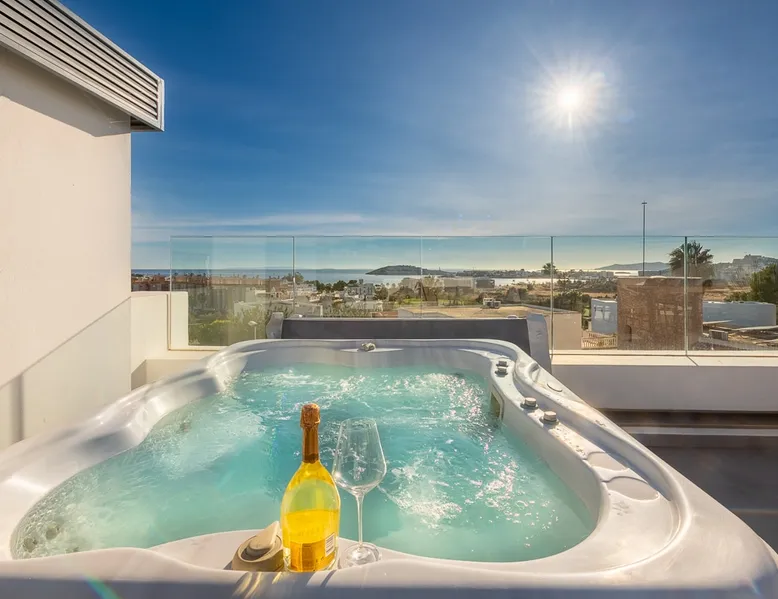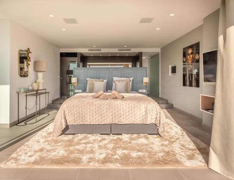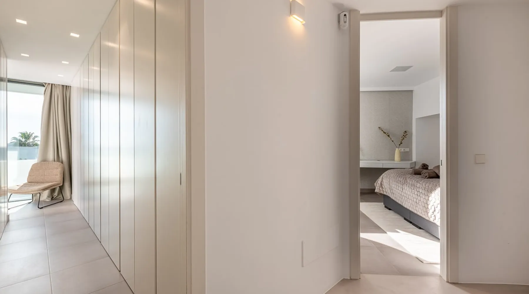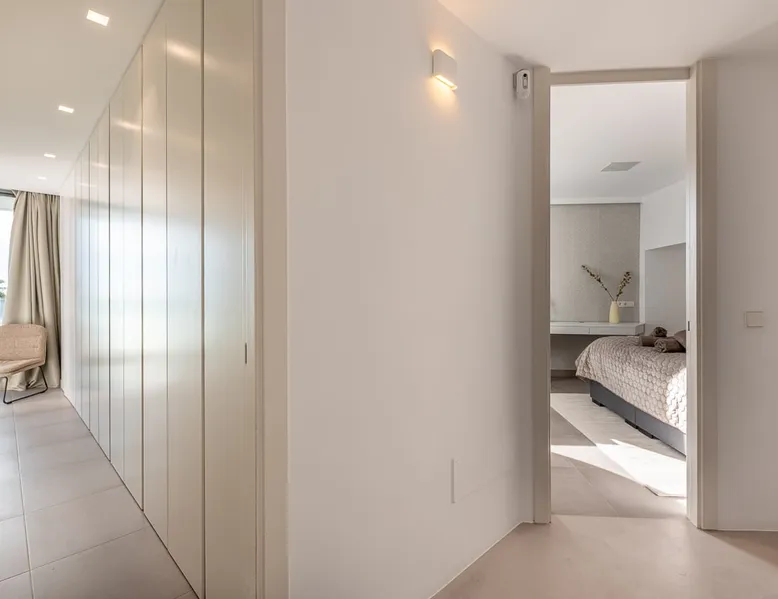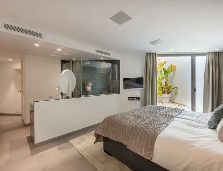 Besides the ideal location, luxury and high quality there are two other aspects that stand out about the villa. Spread over three floors, innovation and minimalism define the residence. The open living room is on the lowest level. It results into the dining room and the kitchen in high-gloss white. The kitchen area facilitates a cooking island, high-end builtin appliances and is completely handle-less; for a sleek finish. The living room is surrounded by sliding doors, allowing plenty of natural light to enter. The floating staircase leads to the higher floors. The first floor has three suites, all with a bathroom en-suite. The master bedroom has a private terrace with stunning views of the bay of Talamanca and the island of Formentera. The fourth bedroom can be found on the basement floor as well as the private gym. The residence also facilitates several terraces on different levels. The swimming pool is located near the living room and is surrounded by a terrace too. The top floor Besides the ideal consists of a spacious roof terrace where you can dine. At only 400 meters distance from Talamanca Bay, stands this luxury villa in Ses-Torres. From this small-scale urbanization, you can walk to the beach as well as to the idyllic village of Jesús. Here you will find all kinds of amenities, such as several supermarkets, restaurants and banks. You can also reach Ibiza-town in no time. The center is less than two kilometers from the villa. Composition: 4x bedroom, 4x bathroom, 4x WC Amenities: iron & ironing board, bed linen & towels, washing machine, dishwasher, cable tv, terrace, satellite tv, air conditioning, garden, elevator, no smoking rooms/facilities, no pets allowed, smoke detectors, heating, no parties, first aid kit Registration details Spain – National registration number ESFCTU00000703600039800000000000000000000000ETV2404E0