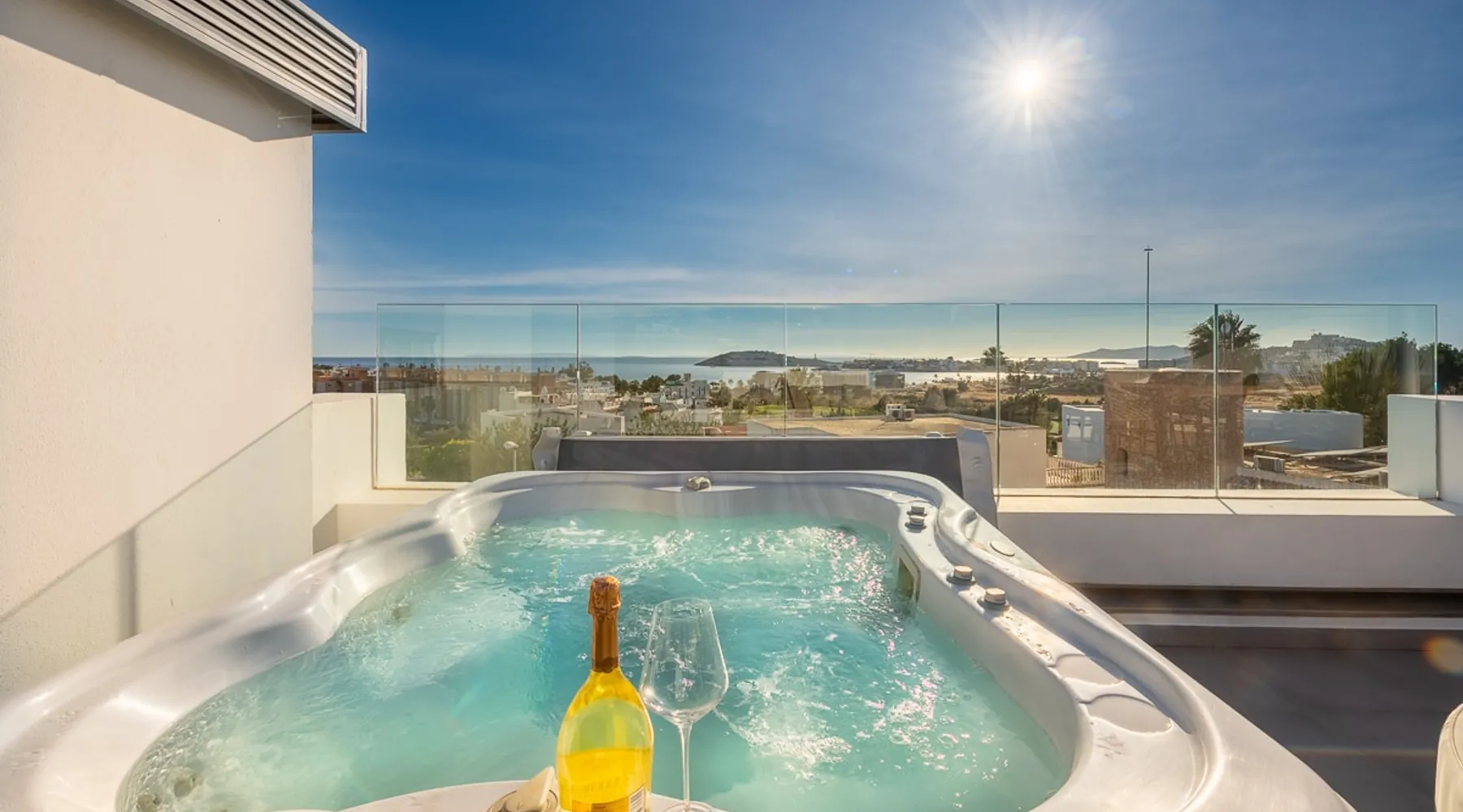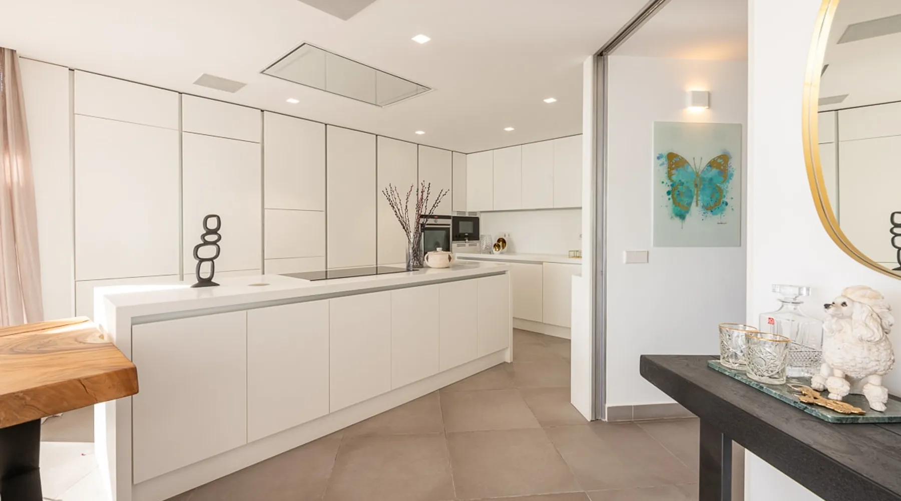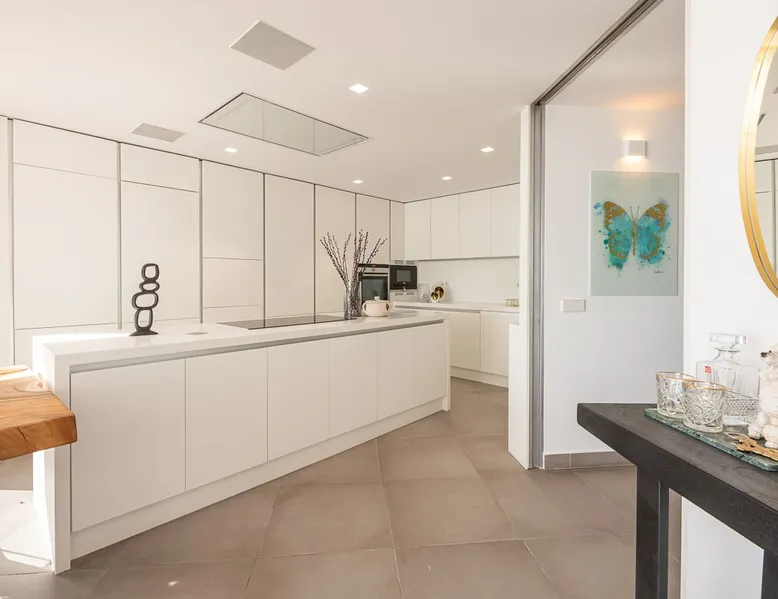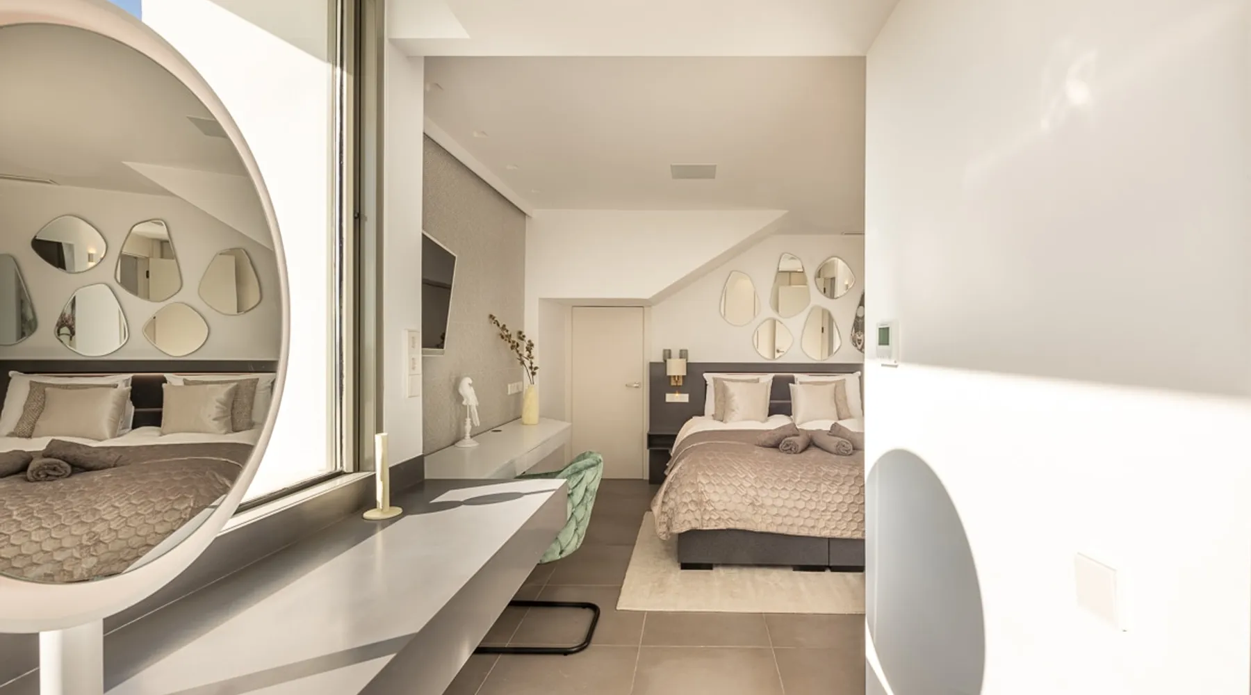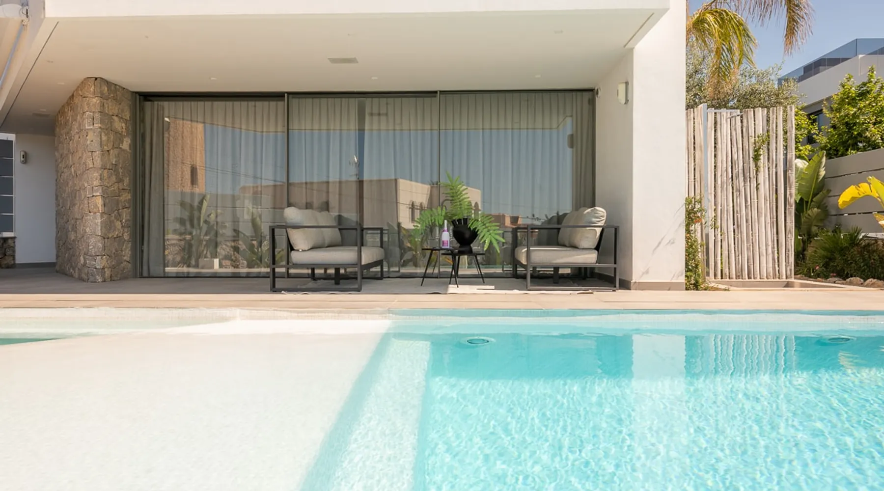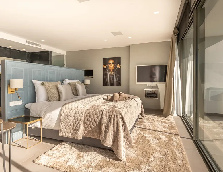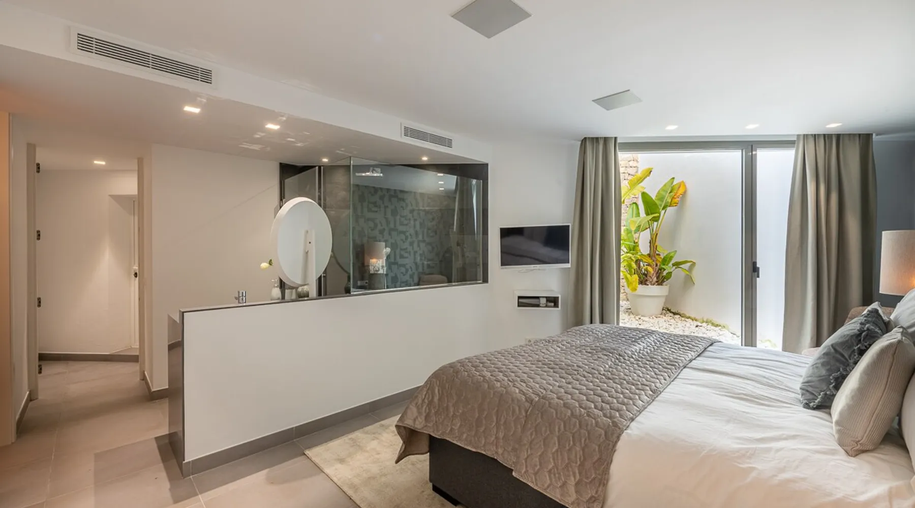 Besides the ideal location, luxury and high quality there are two other aspects that stand out about the villa. Spread over three floors, innovation and minimalism define the residence. The open living room is on the lowest level. It results into the dining room and the kitchen in high-gloss white. The kitchen area facilitates a cooking island, high-end builtin appliances and is completely handle-less; for a sleek finish. The living room is surrounded by sliding doors, allowing plenty of natural light to enter. The floating staircase leads to the higher floors. The first floor has three suites, all with a bathroom en-suite. The master bedroom has a private terrace with stunning views of the bay of Talamanca and the island of Formentera. The fourth bedroom can be found on the basement floor as well as the private gym. The residence also facilitates several terraces on different levels. The swimming pool is located near the living room and is surrounded by a terrace too. The top floor Besides the ideal consists of a spacious roof terrace where you can dine. At only 400 meters distance from Talamanca Bay, stands this luxury villa in Ses-Torres. From this small-scale urbanization, you can walk to the beach as well as to the idyllic village of Jesús. Here you will find all kinds of amenities, such as several supermarkets, restaurants and banks. You can also reach Ibiza-town in no time. The center is less than two kilometers from the villa. Composition: 4x bedroom, 4x bathroom, 4x WC Amenities: iron & ironing board, bed linen & towels, washing machine, dishwasher, cable tv, terrace, satellite tv, air conditioning, garden, elevator, no smoking rooms/facilities, no pets allowed, smoke detectors, heating, no parties, first aid kit Registration details Spain – National registration number ESFCTU00000703600039800000000000000000000000ETV2404E0