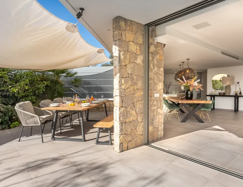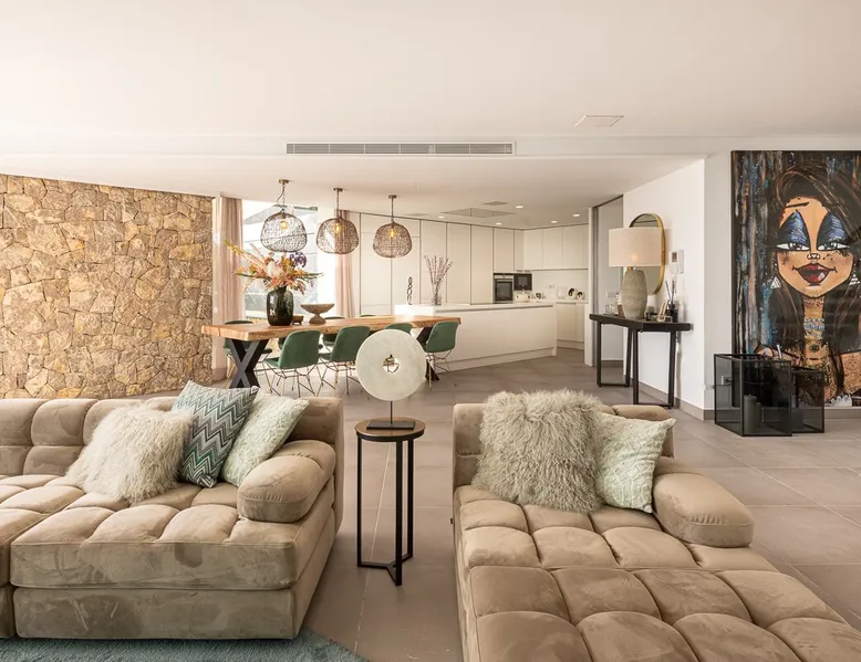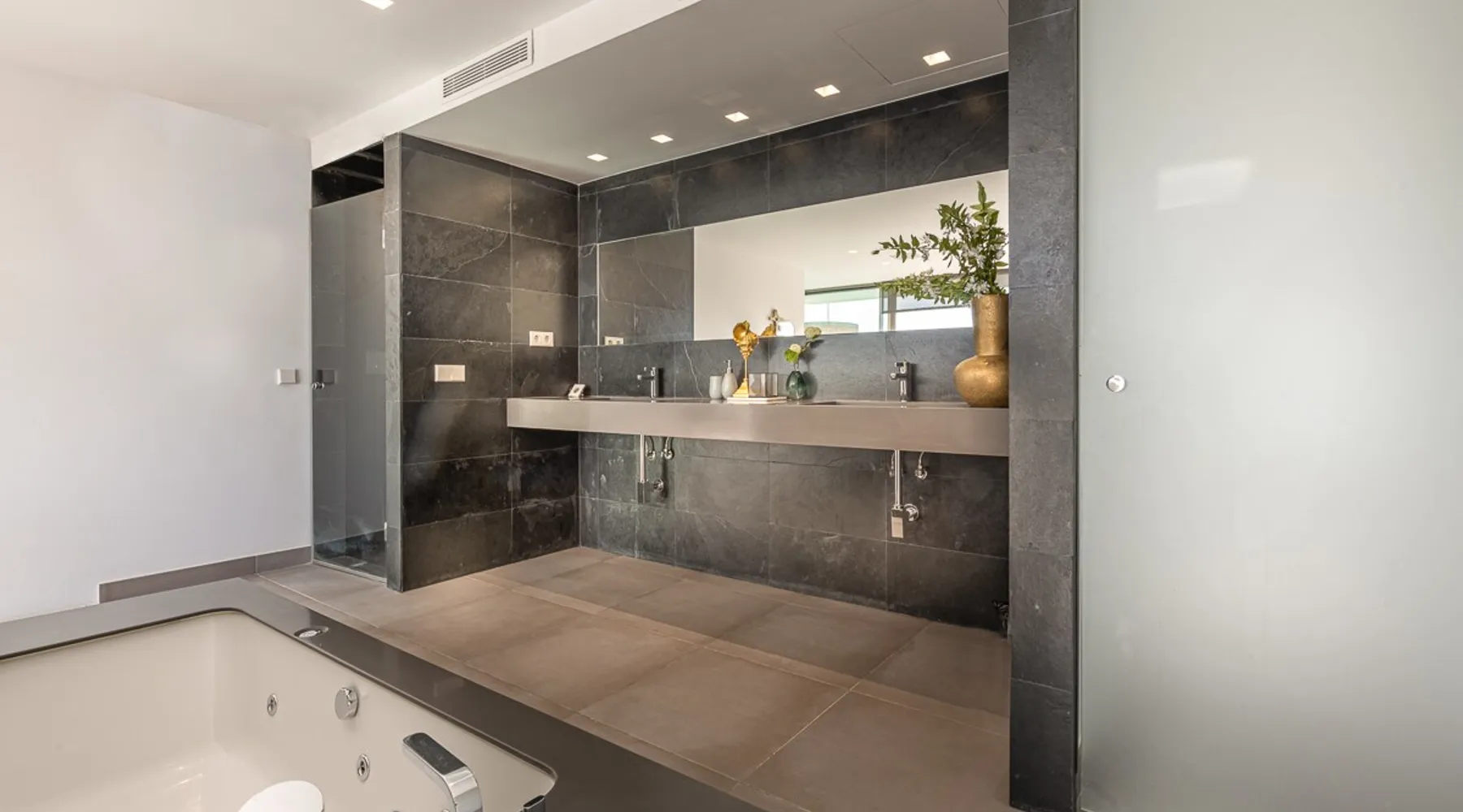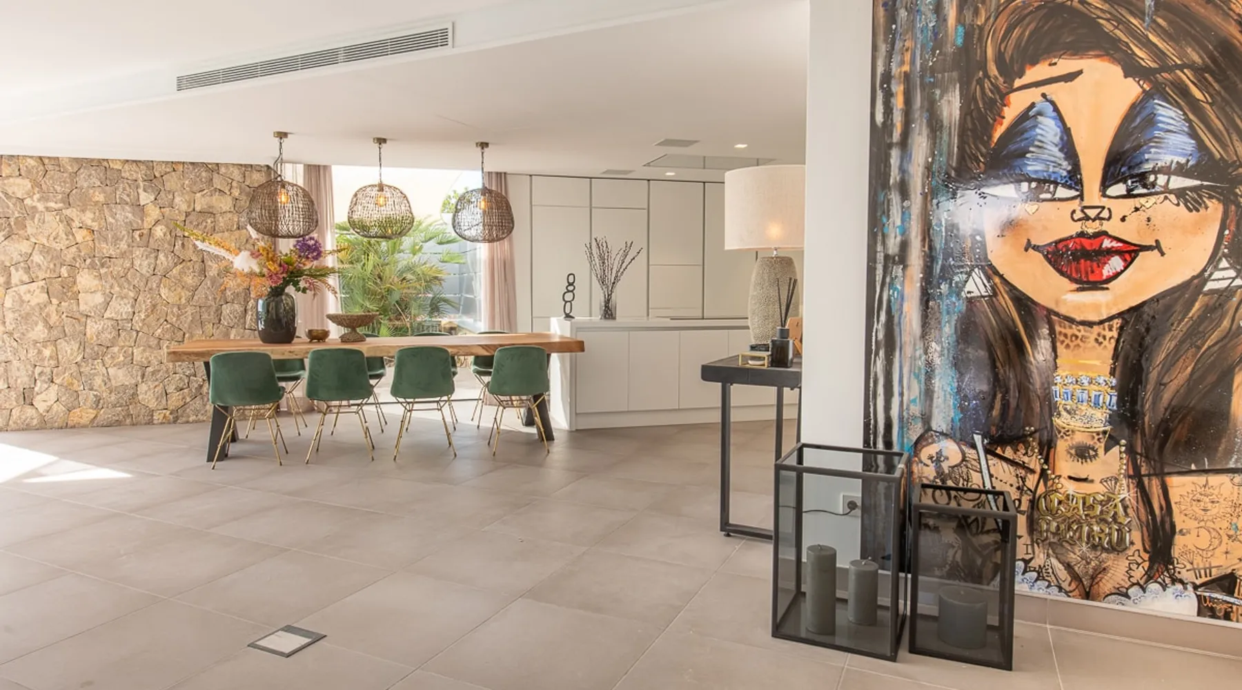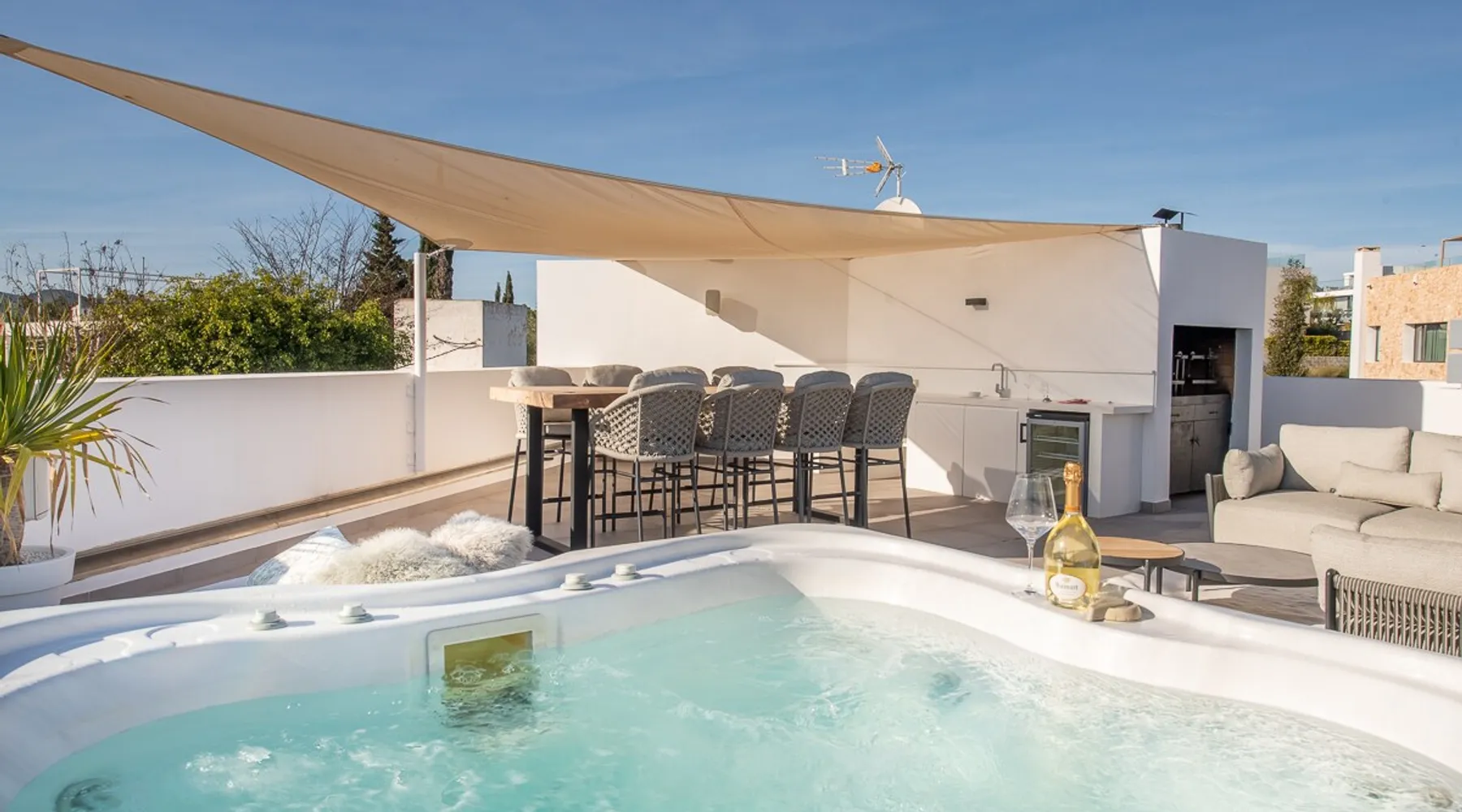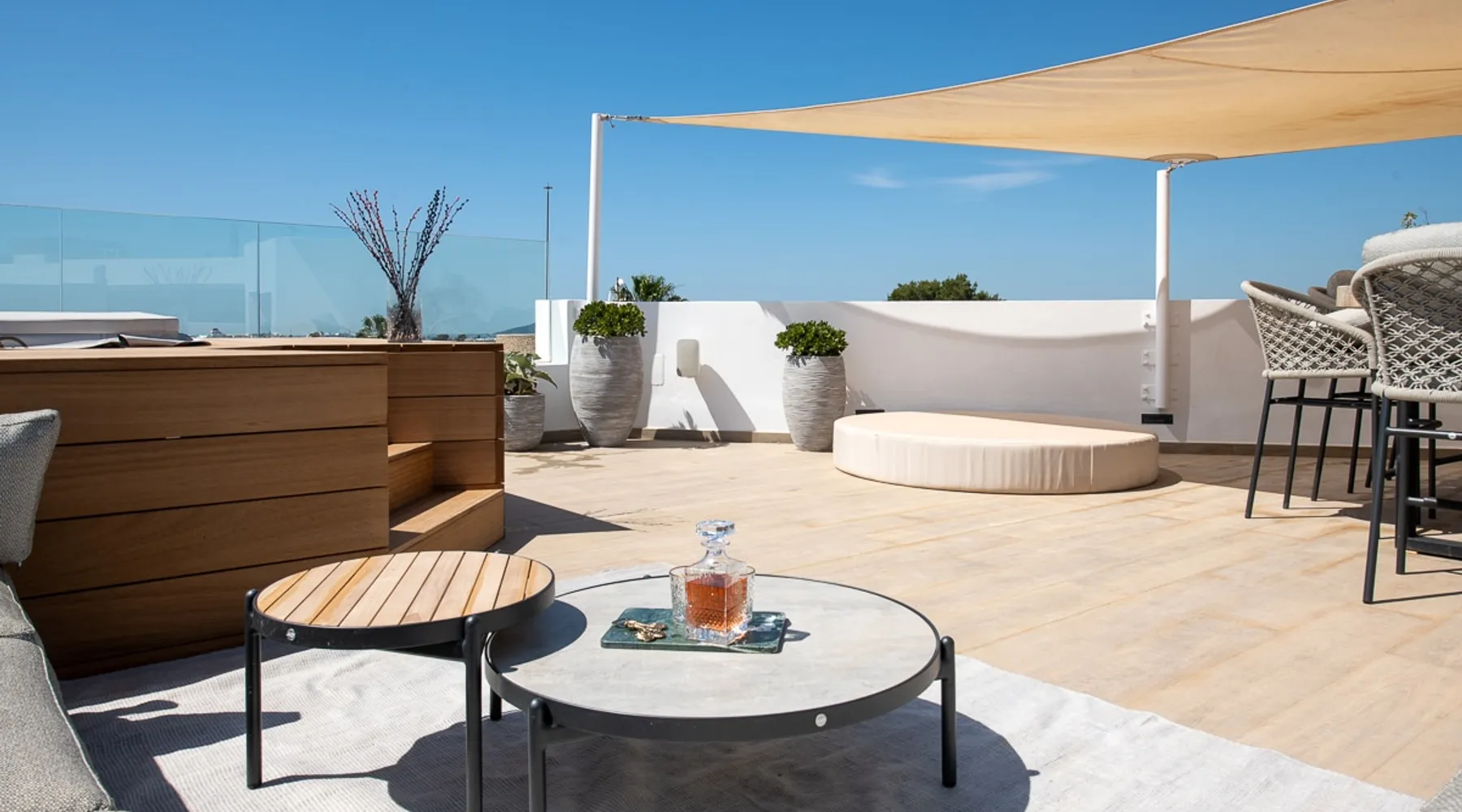 Besides the ideal location, luxury and high quality there are two other aspects that stand out about the villa. Spread over three floors, innovation and minimalism define the residence. The open living room is on the lowest level. It results into the dining room and the kitchen in high-gloss white. The kitchen area facilitates a cooking island, high-end builtin appliances and is completely handle-less; for a sleek finish. The living room is surrounded by sliding doors, allowing plenty of natural light to enter. The floating staircase leads to the higher floors. The first floor has three suites, all with a bathroom en-suite. The master bedroom has a private terrace with stunning views of the bay of Talamanca and the island of Formentera. The fourth bedroom can be found on the basement floor as well as the private gym. The residence also facilitates several terraces on different levels. The swimming pool is located near the living room and is surrounded by a terrace too. The top floor Besides the ideal consists of a spacious roof terrace where you can dine. At only 400 meters distance from Talamanca Bay, stands this luxury villa in Ses-Torres. From this small-scale urbanization, you can walk to the beach as well as to the idyllic village of Jesús. Here you will find all kinds of amenities, such as several supermarkets, restaurants and banks. You can also reach Ibiza-town in no time. The center is less than two kilometers from the villa. Composition: 4x bedroom, 4x bathroom, 4x WC Amenities: iron & ironing board, bed linen & towels, washing machine, dishwasher, cable tv, terrace, satellite tv, air conditioning, garden, elevator, no smoking rooms/facilities, no pets allowed, smoke detectors, heating, no parties, first aid kit Registration details Spain – National registration number ESFCTU00000703600039800000000000000000000000ETV2404E0