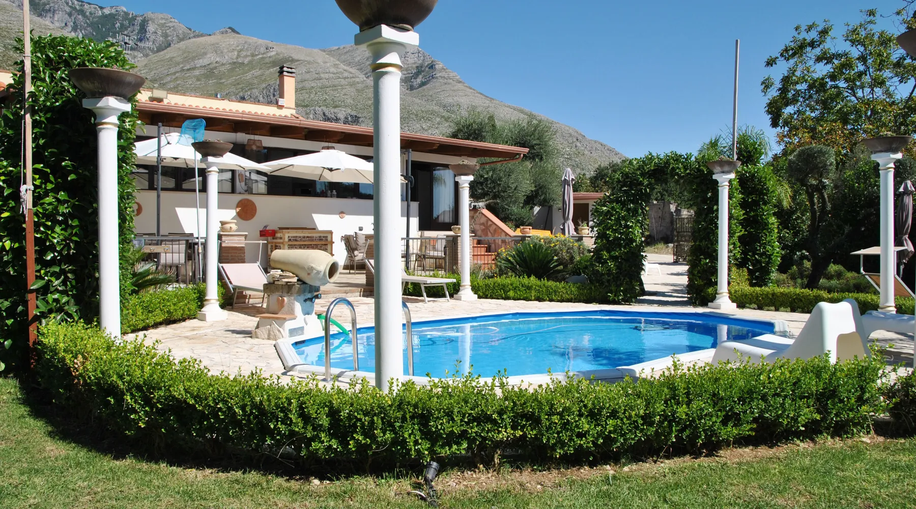 Rental basis: Entire house or apartment Number of bedrooms: 3; Number of other rooms with beds: 0 Number of bathrooms: 2 If you cause damage to the property during your stay, you may be required to pay according to YourRentals’s property damage policy. Villa Giselda with private pool is located on the hill of Formia, ideal for those who love living in tranquillity surrounded by nature. Relax while sunbathing in the garden or take a refreshing swim in the pool or enjoy our outdoor whirlpool! Completely fenced off, with an automatic entrance gate, a beautiful private garden of about 500 square metres, a swimming pool for exclusive use (6.10 x 3.75 x h 1.20 metres) and a patio with whirpool. Villa Giselda offers the possibility of regenerating oneself in an enchanting place without renouncing the proximity of the neighbouring tourist centres and the most beautiful beaches of the Latium Coast. Only 8 km from the centre of Formia with its shops, railway station, ferries to the islands and the beach of Vindicio famous for windsurfing, kitesurfing and water sports; 13 km from Gaeta with its monuments, the Park of Monte Orlando with its Bourbon military strongholds and the beautiful white sandy beaches; 25 km from Sperlonga with its characteristic old town, marina and sandy beaches. Rome and Naples can be reached in just over an hour and a half with trains leaving every hour from Formia station. A semi-detached villa with an independent entrance, the area available to guests is about 120 square metres on a single level on a raised floor. The house, fully air-conditioned, with mosquito nets, consists of a large living room with suede sofa, 65-inch satellite TV, dining area with table and chairs, open kitchen with dishwasher, 5-plate induction hob, oven, microwave oven, coffee machine, double-door refrigerator. Relaxation area, with billiard table, leading to a bathroom with shower and 3 air-conditioned double bedrooms with TV in the room. A patio outside the house with the barbecue area, pizza oven, hob and a large table with chairs. The house is surrounded by 500 square metres of garden with palm trees and a play area equipped with a swing and jumping, loungers in the oval pool area, an outdoor shower and another complete bathroom with washing machine. All this to fully enjoy this magical place! Parking inside the property, Washing machine, dishwasher, Wifi, Small pets allowed. Air conditioning in every room. Security webcam outside the house. Car required to move around.