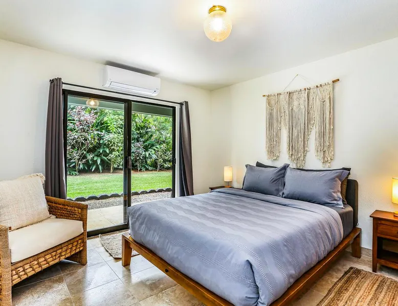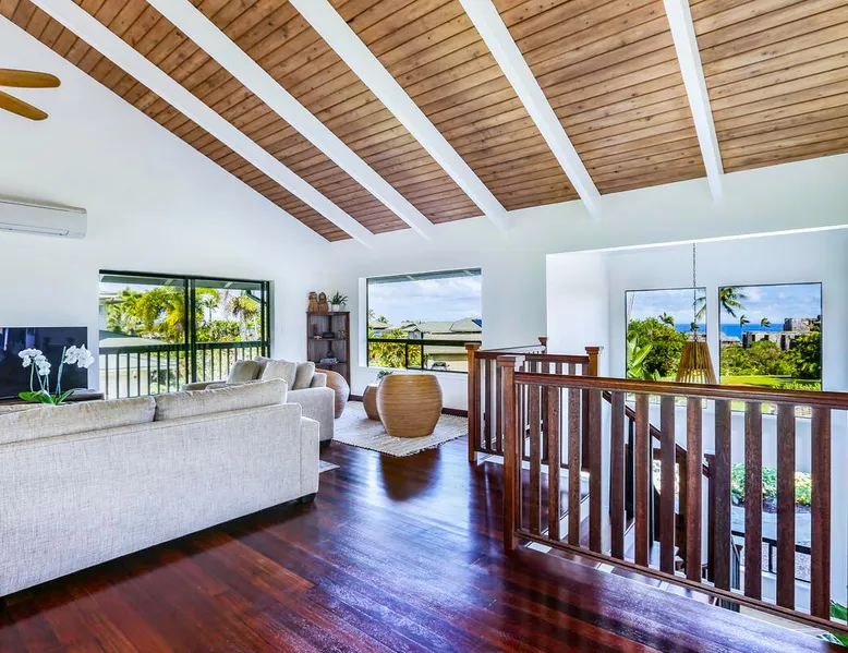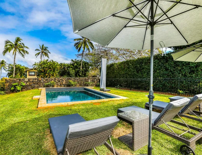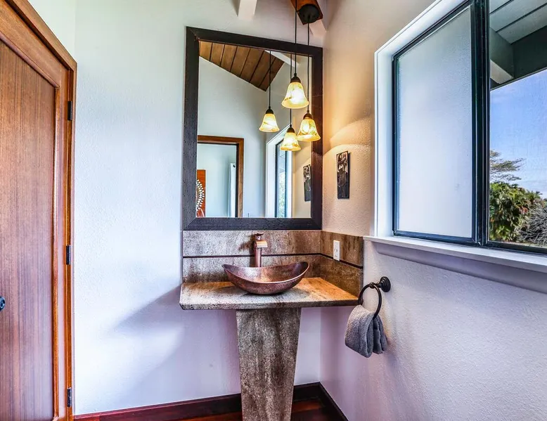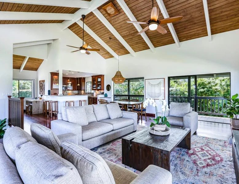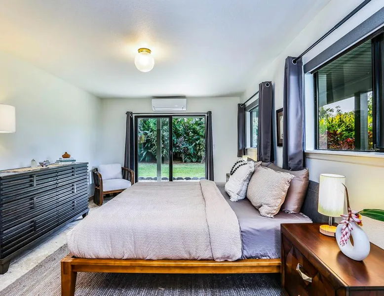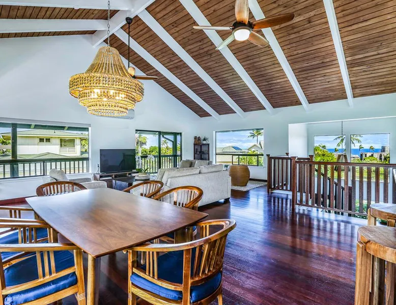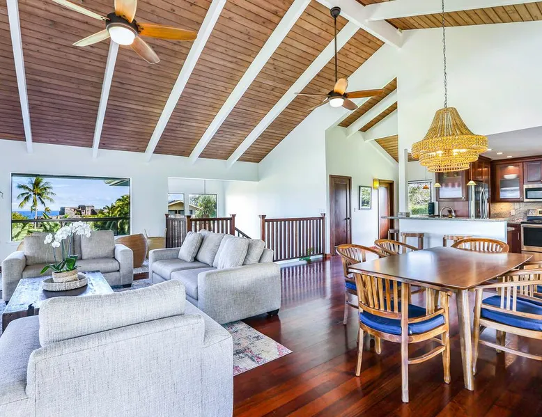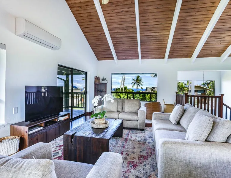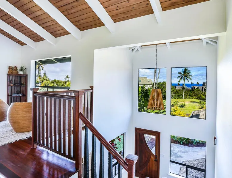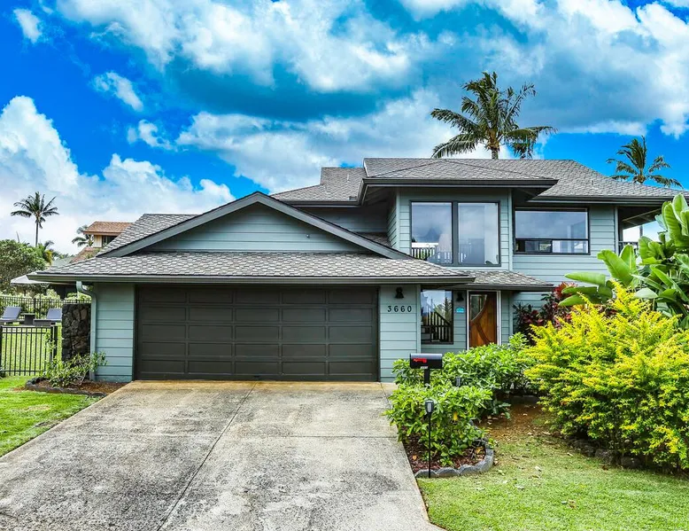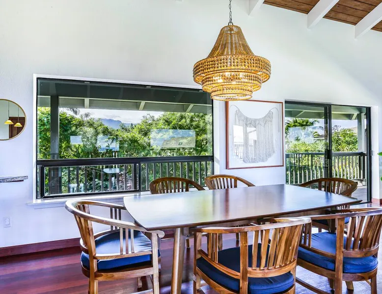 Hawaii Life Presents Hale Kaweonui - Nestled within the tranquil community of Princeville, Hale Kaweonui offers guests a one of a kind experience. Nearby to beautiful beaches, shopping, and dining. Your own private oasis in the middle of it all. The space Nestled within the tranquil community of Princeville, Hale Kaweonui offers guests a one of a kind experience. From the moment you step inside, you are greeted with original designs with thoughtful details throughout. Ascend the custom-designed staircase with Merbau railing and hammered metal spindles to the second floor of the home which features the kitchen and living area. Intentionally designed in this way to showcase the beautiful ocean and mountain views from large windows. An open floor plan with vaulted ceilings allows Kauai’s natural light and cooling trade winds to fill all of the spaces. Step outside onto the wraparound, covered lanai to take in the sights and sound of the island. The ideal location to enjoy year-round Princeville sunsets! Mature landscaping also offers privacy and settles you within the lush foliage and treetops. Gather some local ingredients and prepare island-inspired meals from the fully-equipped kitchen, providing everything you need to enjoy cooking at home. The lower level features the master bedroom with bathroom and walk-in closet, two more bedrooms and a second bathroom. Each bedroom also includes a newly installed split air conditioning and direct access to a covered lanai and garden. Features: Master Bedroom - King Bed and Ensuite bathroom with shower only Bedroom 2 - Queen Bed Bedroom 3 - King Bed Downstairs Shared Bathroom with combination shower/tub Upstairs Half Bathroom Amenities: Air Conditioning in Living Room and Bedrooms Coffee Drip and French press Designated work spaces with desk Gated Pool (not heated) Two Bikes Two Boogie Boards Beach Umbrella Children Accessories Pack n Play Stoller Stokke Trip Trap high chair Baby Bjorn Diaper changing pad Black Out Curtains Sound Machines Board books The Area: Nearby to beaches, golf, biking/walking trails, restaurants and shopping. Just a short drive to world-famous Hanalei Bay. Hawaii Life Rentals is a locally owned, licensed real estate company with rentals on Kauai, Maui, Oahu, and Hawaii. We offer on-island personal assistance and Concierge services. Rates do not include taxes, cleaning and applicable fees. Hawaii Life/VRBO bookings: Guests must sign a rental contract within 48 hours of booking to confirm the reservation. TA-131-604-6336-01 Registration Details 540130450000, TA-131-604-6336-01