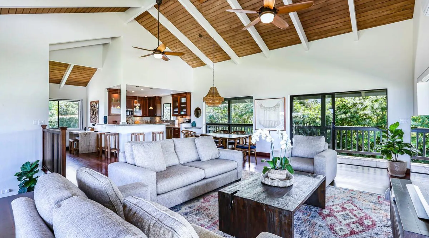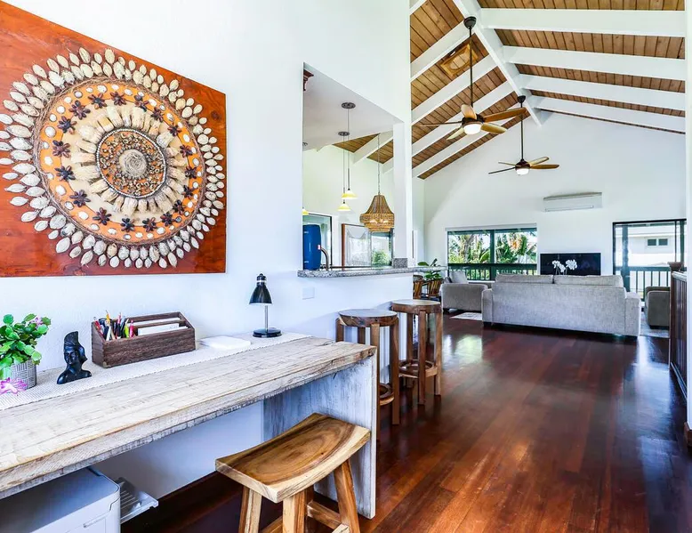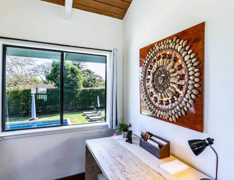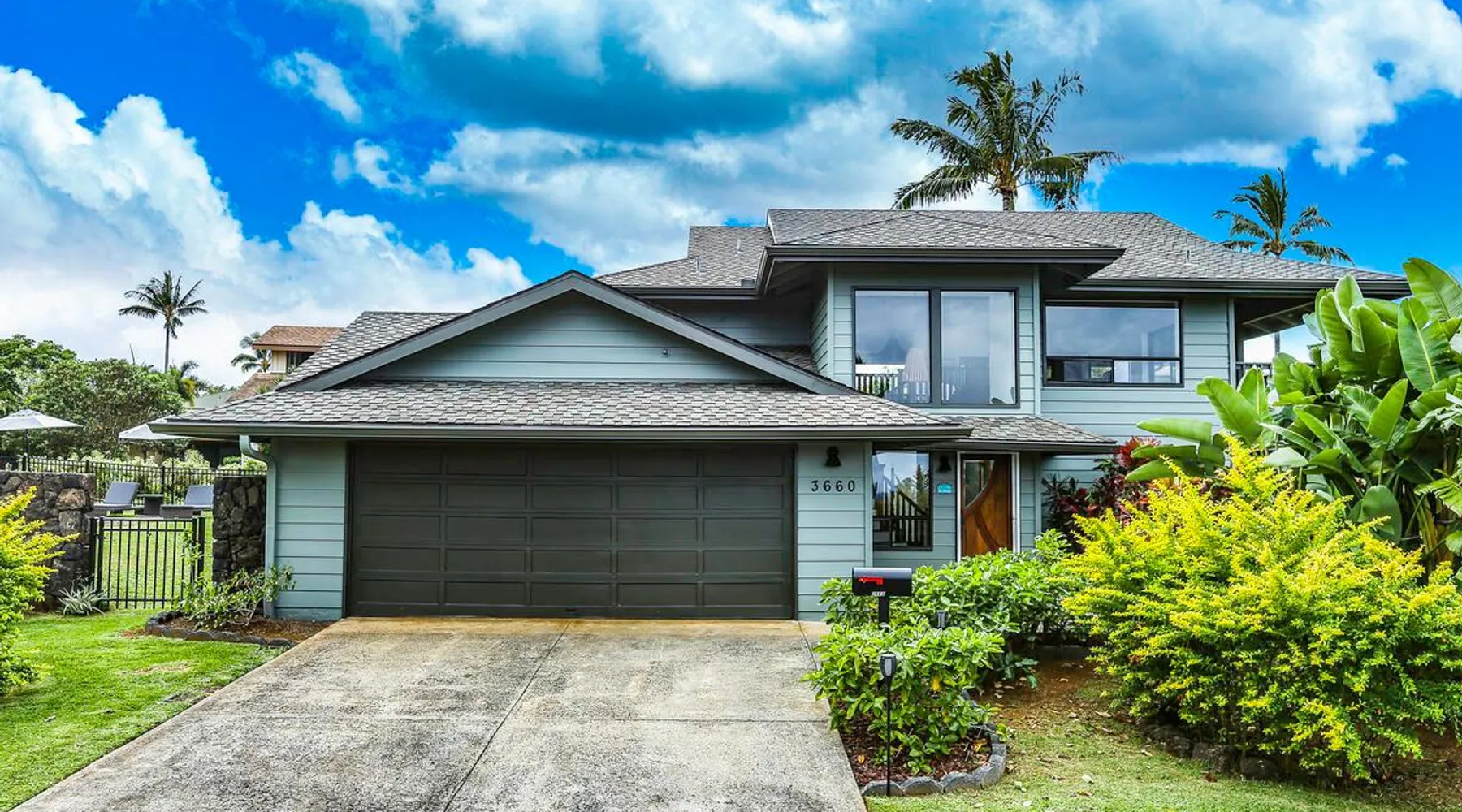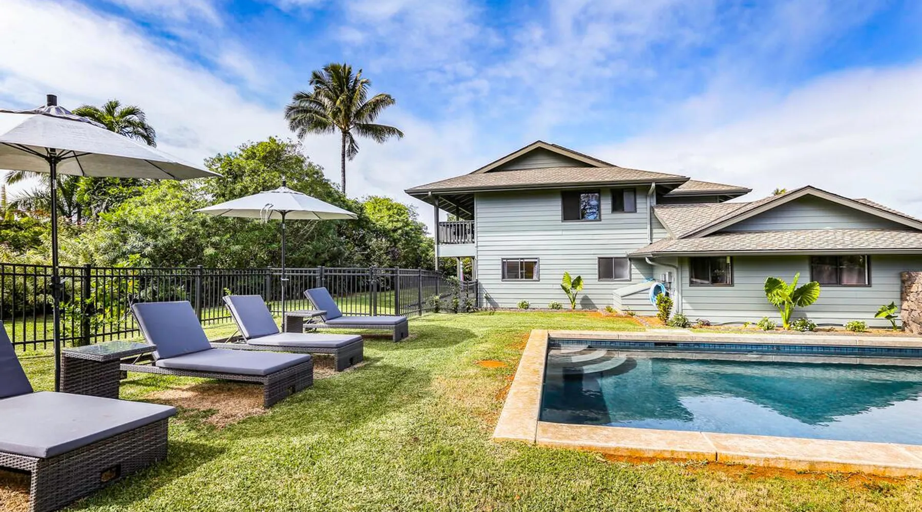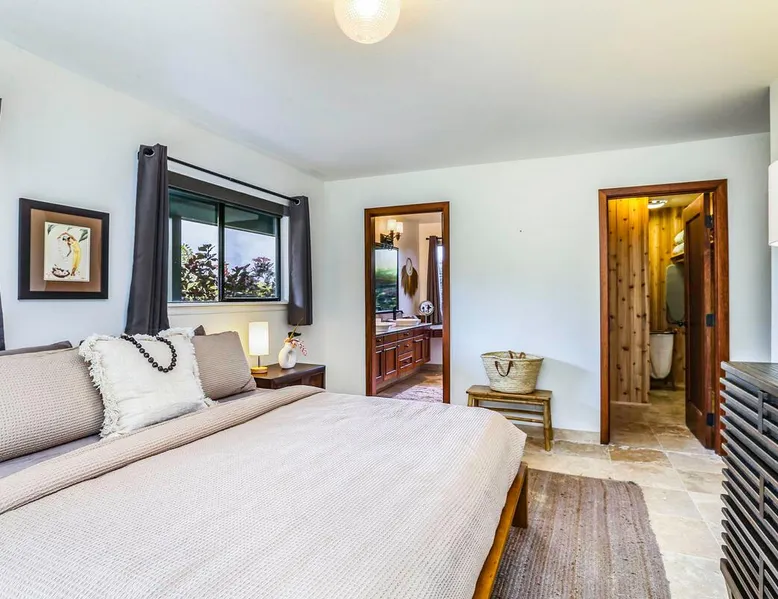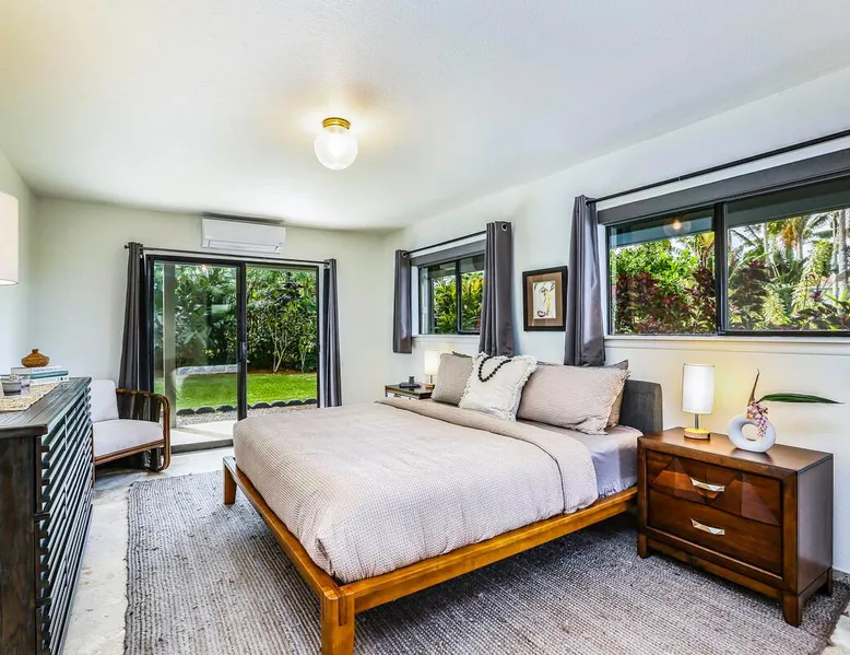 Hawaii Life Presents Hale Kaweonui - Nestled within the tranquil community of Princeville, Hale Kaweonui offers guests a one of a kind experience. Nearby to beautiful beaches, shopping, and dining. Your own private oasis in the middle of it all. The space Nestled within the tranquil community of Princeville, Hale Kaweonui offers guests a one of a kind experience. From the moment you step inside, you are greeted with original designs with thoughtful details throughout. Ascend the custom-designed staircase with Merbau railing and hammered metal spindles to the second floor of the home which features the kitchen and living area. Intentionally designed in this way to showcase the beautiful ocean and mountain views from large windows. An open floor plan with vaulted ceilings allows Kauai’s natural light and cooling trade winds to fill all of the spaces. Step outside onto the wraparound, covered lanai to take in the sights and sound of the island. The ideal location to enjoy year-round Princeville sunsets! Mature landscaping also offers privacy and settles you within the lush foliage and treetops. Gather some local ingredients and prepare island-inspired meals from the fully-equipped kitchen, providing everything you need to enjoy cooking at home. The lower level features the master bedroom with bathroom and walk-in closet, two more bedrooms and a second bathroom. Each bedroom also includes a newly installed split air conditioning and direct access to a covered lanai and garden. Features: Master Bedroom - King Bed and Ensuite bathroom with shower only Bedroom 2 - Queen Bed Bedroom 3 - King Bed Downstairs Shared Bathroom with combination shower/tub Upstairs Half Bathroom Amenities: Air Conditioning in Living Room and Bedrooms Coffee Drip and French press Designated work spaces with desk Gated Pool (not heated) Two Bikes Two Boogie Boards Beach Umbrella Children Accessories Pack n Play Stoller Stokke Trip Trap high chair Baby Bjorn Diaper changing pad Black Out Curtains Sound Machines Board books The Area: Nearby to beaches, golf, biking/walking trails, restaurants and shopping. Just a short drive to world-famous Hanalei Bay. Hawaii Life Rentals is a locally owned, licensed real estate company with rentals on Kauai, Maui, Oahu, and Hawaii. We offer on-island personal assistance and Concierge services. Rates do not include taxes, cleaning and applicable fees. Hawaii Life/VRBO bookings: Guests must sign a rental contract within 48 hours of booking to confirm the reservation. TA-131-604-6336-01 Registration Details 540130450000, TA-131-604-6336-01