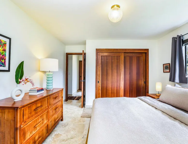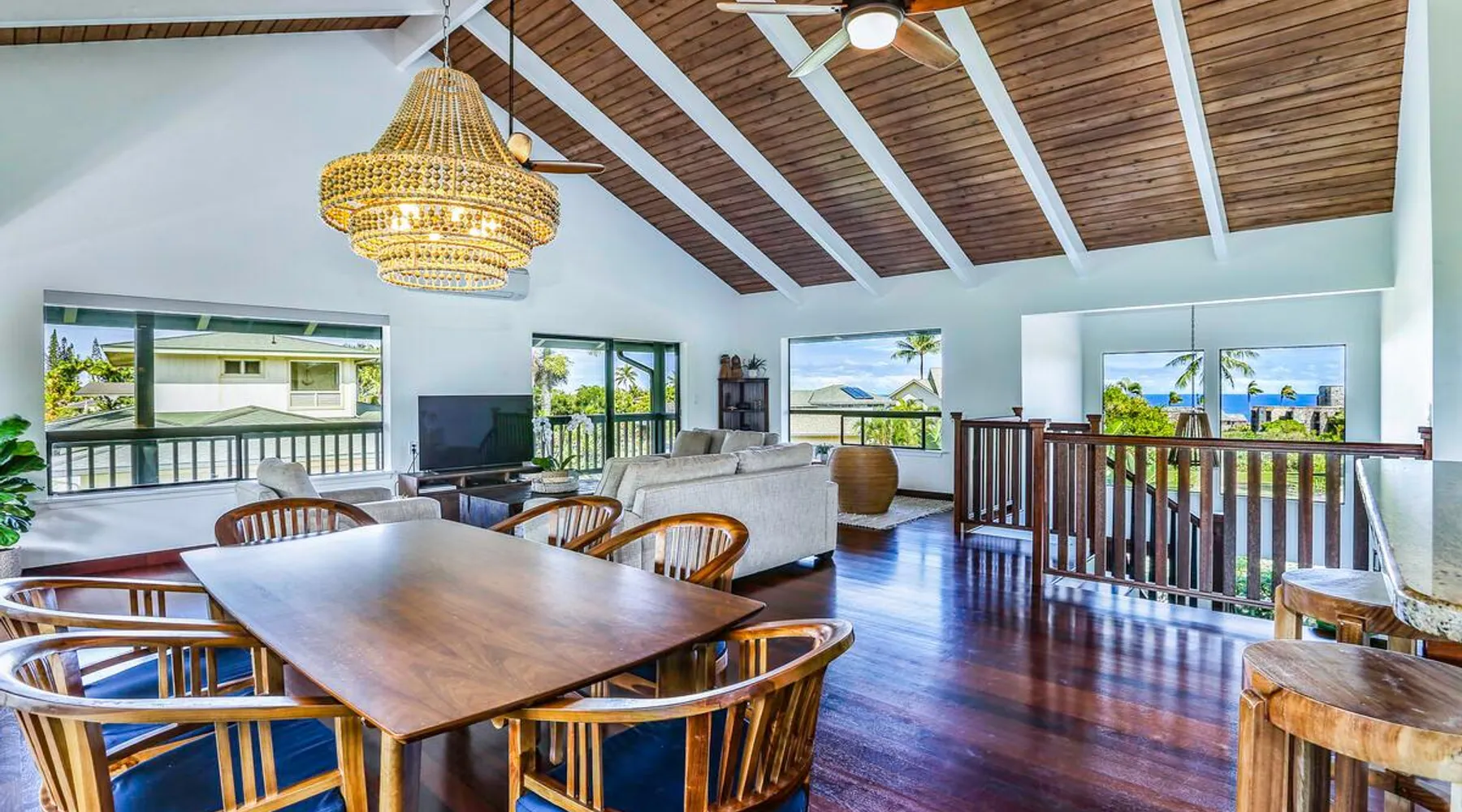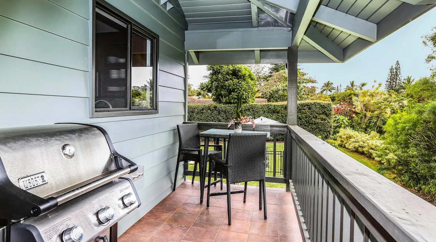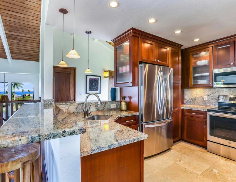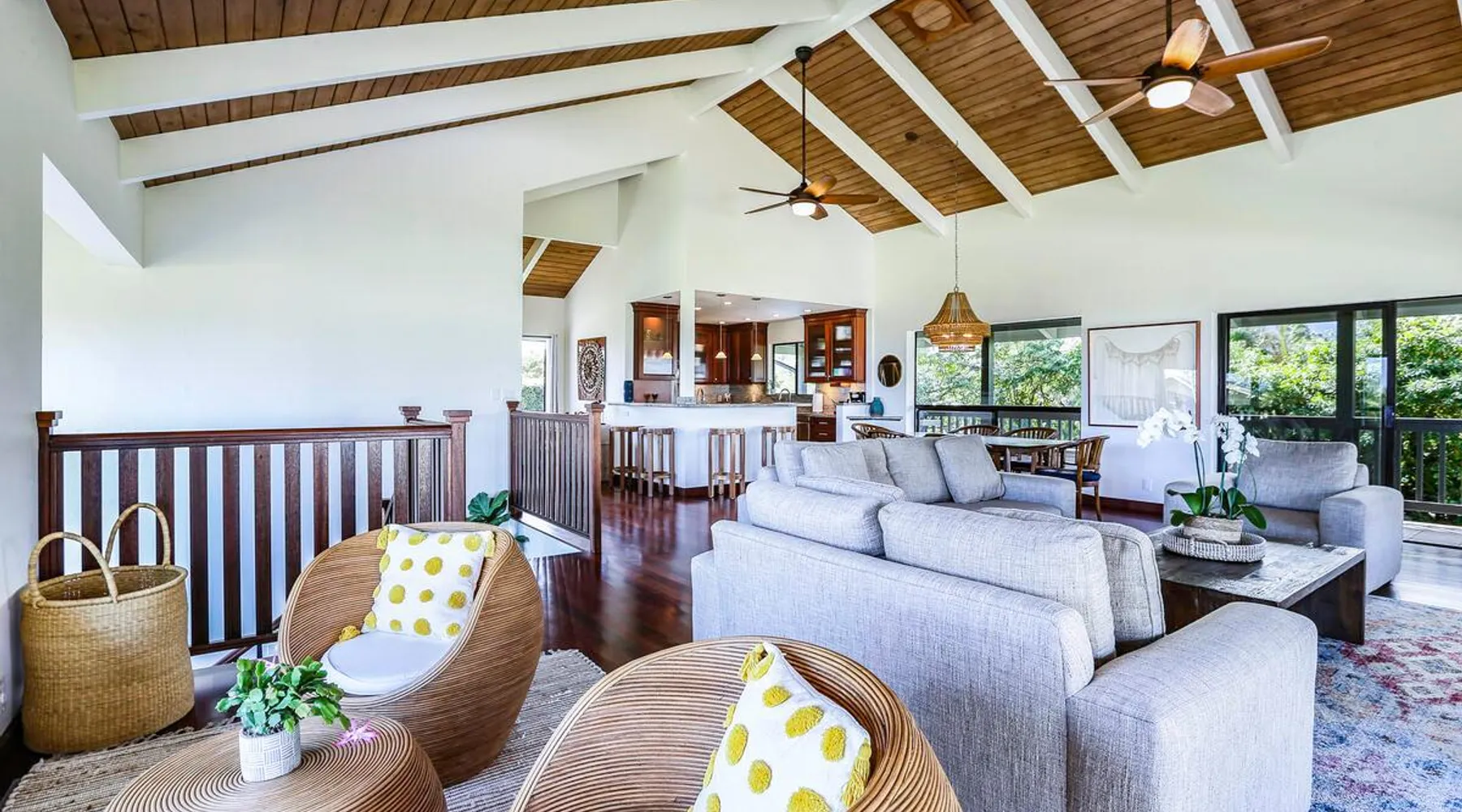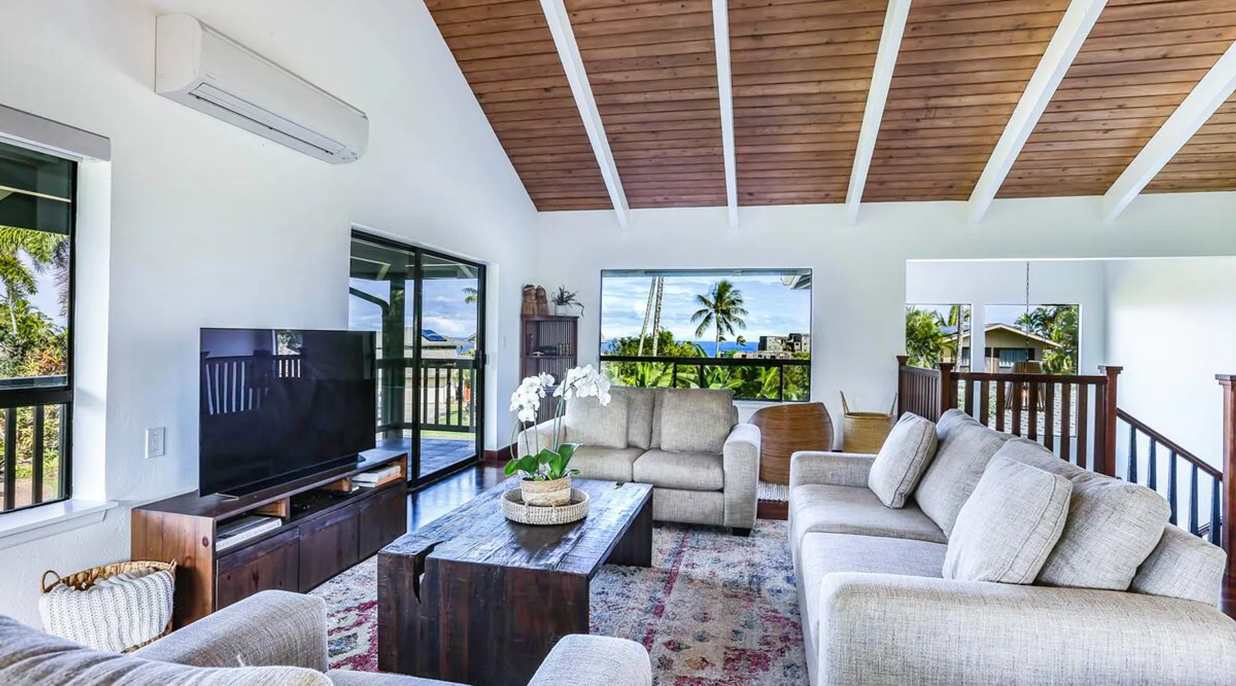 Hawaii Life Presents Hale Kaweonui - Nestled within the tranquil community of Princeville, Hale Kaweonui offers guests a one of a kind experience. Nearby to beautiful beaches, shopping, and dining. Your own private oasis in the middle of it all. The space Nestled within the tranquil community of Princeville, Hale Kaweonui offers guests a one of a kind experience. From the moment you step inside, you are greeted with original designs with thoughtful details throughout. Ascend the custom-designed staircase with Merbau railing and hammered metal spindles to the second floor of the home which features the kitchen and living area. Intentionally designed in this way to showcase the beautiful ocean and mountain views from large windows. An open floor plan with vaulted ceilings allows Kauai’s natural light and cooling trade winds to fill all of the spaces. Step outside onto the wraparound, covered lanai to take in the sights and sound of the island. The ideal location to enjoy year-round Princeville sunsets! Mature landscaping also offers privacy and settles you within the lush foliage and treetops. Gather some local ingredients and prepare island-inspired meals from the fully-equipped kitchen, providing everything you need to enjoy cooking at home. The lower level features the master bedroom with bathroom and walk-in closet, two more bedrooms and a second bathroom. Each bedroom also includes a newly installed split air conditioning and direct access to a covered lanai and garden. Features: Master Bedroom - King Bed and Ensuite bathroom with shower only Bedroom 2 - Queen Bed Bedroom 3 - King Bed Downstairs Shared Bathroom with combination shower/tub Upstairs Half Bathroom Amenities: Air Conditioning in Living Room and Bedrooms Coffee Drip and French press Designated work spaces with desk Gated Pool (not heated) Two Bikes Two Boogie Boards Beach Umbrella Children Accessories Pack n Play Stoller Stokke Trip Trap high chair Baby Bjorn Diaper changing pad Black Out Curtains Sound Machines Board books The Area: Nearby to beaches, golf, biking/walking trails, restaurants and shopping. Just a short drive to world-famous Hanalei Bay. Hawaii Life Rentals is a locally owned, licensed real estate company with rentals on Kauai, Maui, Oahu, and Hawaii. We offer on-island personal assistance and Concierge services. Rates do not include taxes, cleaning and applicable fees. Hawaii Life/VRBO bookings: Guests must sign a rental contract within 48 hours of booking to confirm the reservation. TA-131-604-6336-01 Registration Details 540130450000, TA-131-604-6336-01
