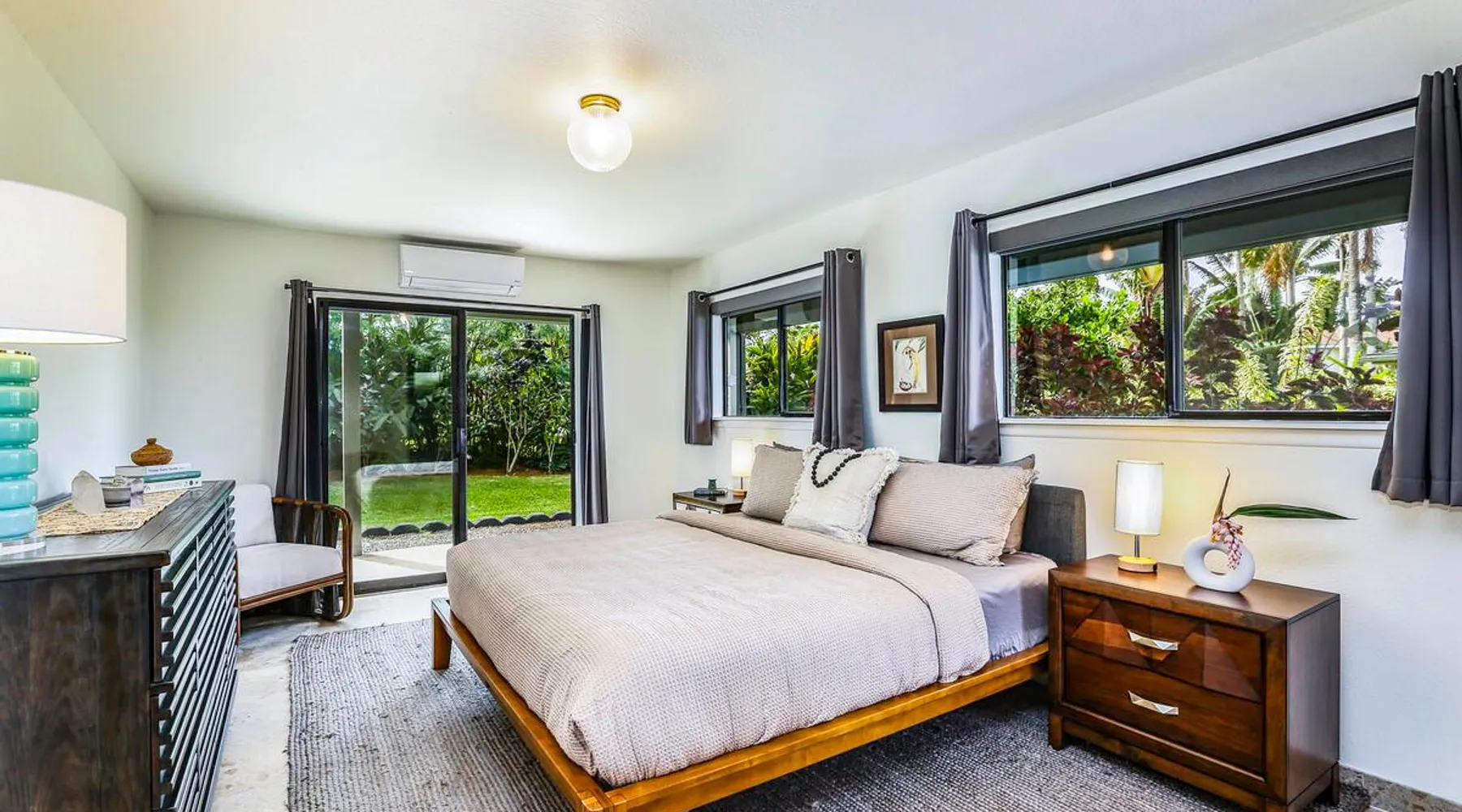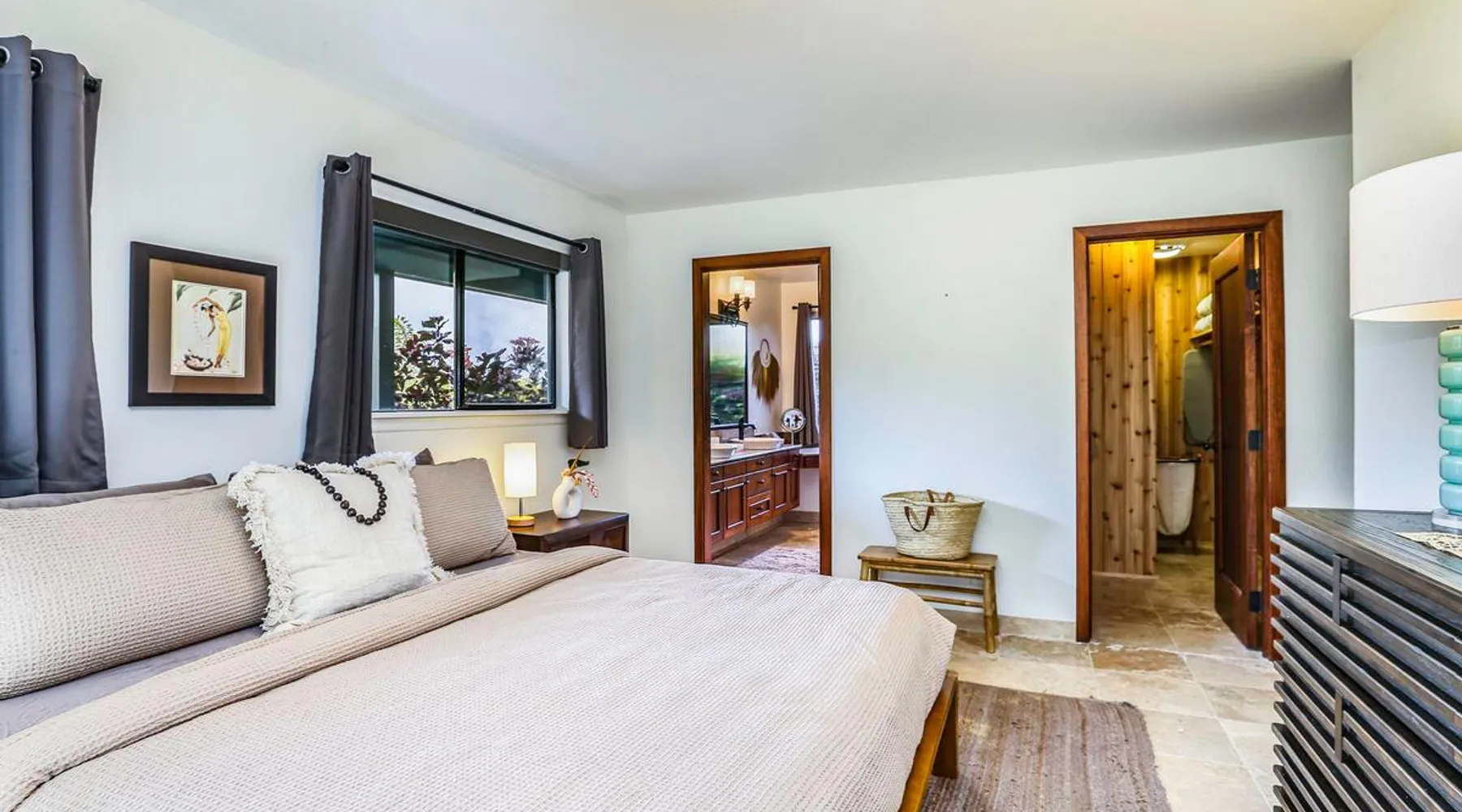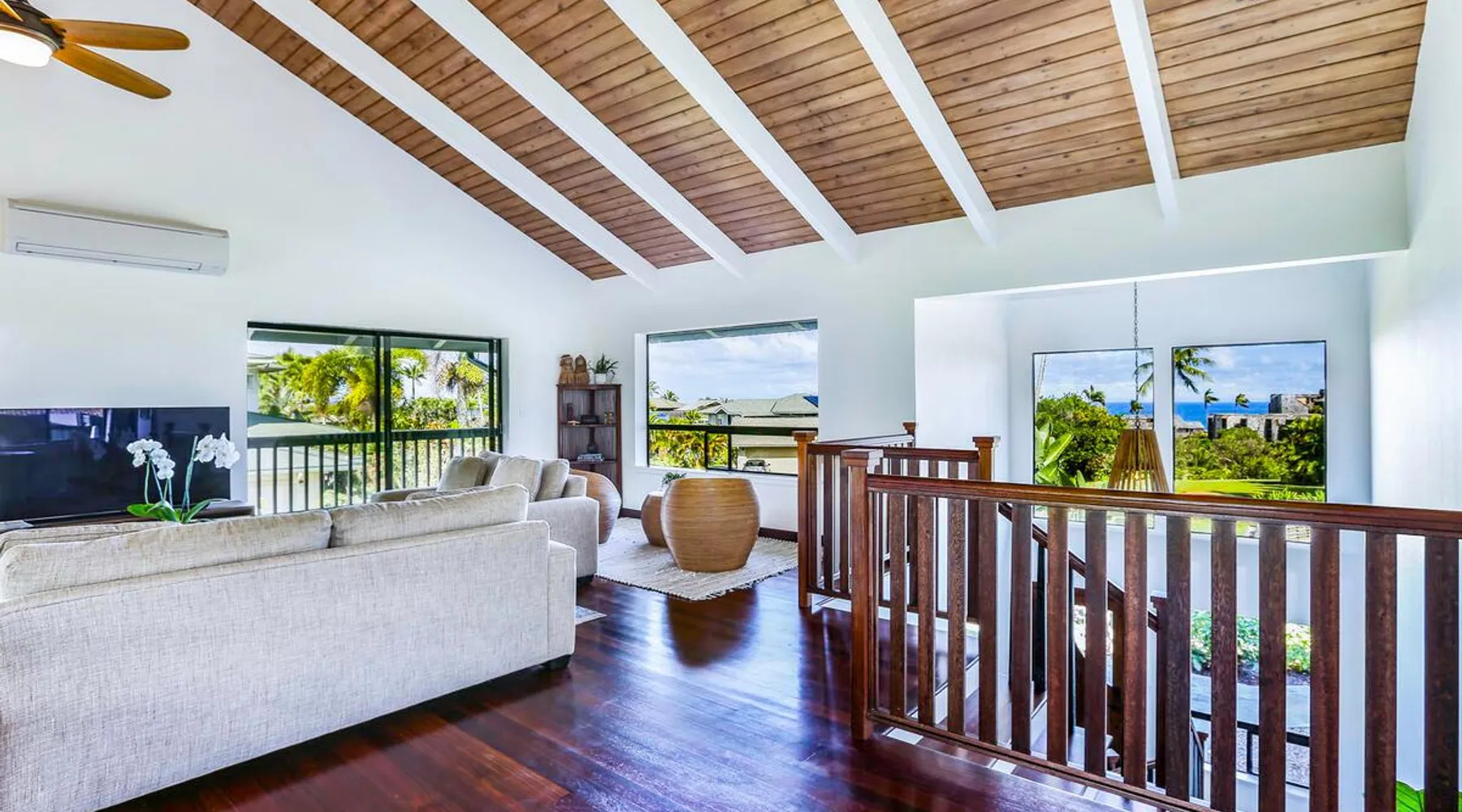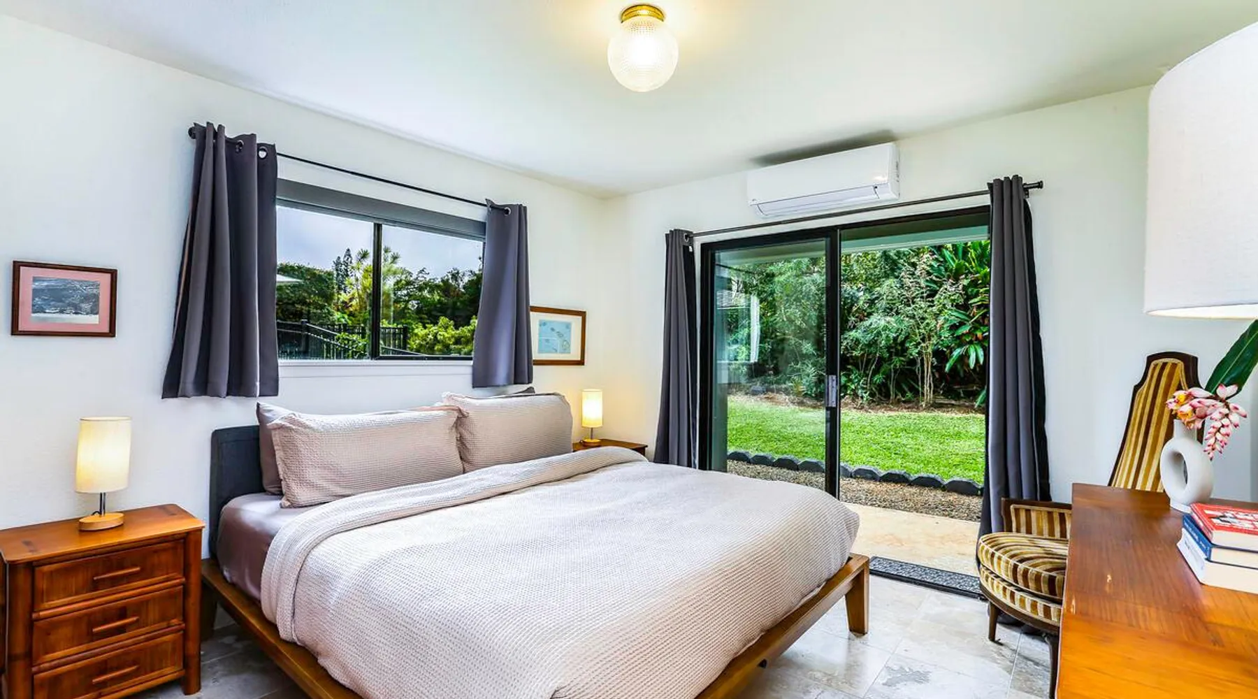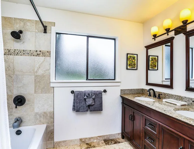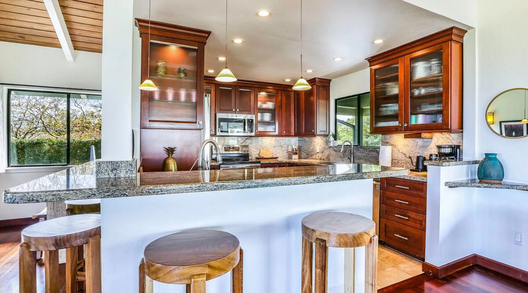Hawaii Life Presents Hale Kaweonui - Nestled within the tranquil community of Princeville, Hale Kaweonui offers guests a one of a kind experience. Nearby to beautiful beaches, shopping, and dining. Your own private oasis in the middle of it all. The space Nestled within the tranquil community of Princeville, Hale Kaweonui offers guests a one of a kind experience. From the moment you step inside, you are greeted with original designs with thoughtful details throughout. Ascend the custom-designed staircase with Merbau railing and hammered metal spindles to the second floor of the home which features the kitchen and living area. Intentionally designed in this way to showcase the beautiful ocean and mountain views from large windows. An open floor plan with vaulted ceilings allows Kauai’s natural light and cooling trade winds to fill all of the spaces. Step outside onto the wraparound, covered lanai to take in the sights and sound of the island. The ideal location to enjoy year-round Princeville sunsets! Mature landscaping also offers privacy and settles you within the lush foliage and treetops. Gather some local ingredients and prepare island-inspired meals from the fully-equipped kitchen, providing everything you need to enjoy cooking at home. The lower level features the master bedroom with bathroom and walk-in closet, two more bedrooms and a second bathroom. Each bedroom also includes a newly installed split air conditioning and direct access to a covered lanai and garden. Features: Master Bedroom - King Bed and Ensuite bathroom with shower only Bedroom 2 - Queen Bed Bedroom 3 - King Bed Downstairs Shared Bathroom with combination shower/tub Upstairs Half Bathroom Amenities: Air Conditioning in Living Room and Bedrooms Coffee Drip and French press Designated work spaces with desk Gated Pool (not heated) Two Bikes Two Boogie Boards Beach Umbrella Children Accessories Pack n Play Stoller Stokke Trip Trap high chair Baby Bjorn Diaper changing pad Black Out Curtains Sound Machines Board books The Area: Nearby to beaches, golf, biking/walking trails, restaurants and shopping. Just a short drive to world-famous Hanalei Bay. Hawaii Life Rentals is a locally owned, licensed real estate company with rentals on Kauai, Maui, Oahu, and Hawaii. We offer on-island personal assistance and Concierge services. Rates do not include taxes, cleaning and applicable fees. Hawaii Life/VRBO bookings: Guests must sign a rental contract within 48 hours of booking to confirm the reservation. TA-131-604-6336-01 Registration Details 540130450000, TA-131-604-6336-01