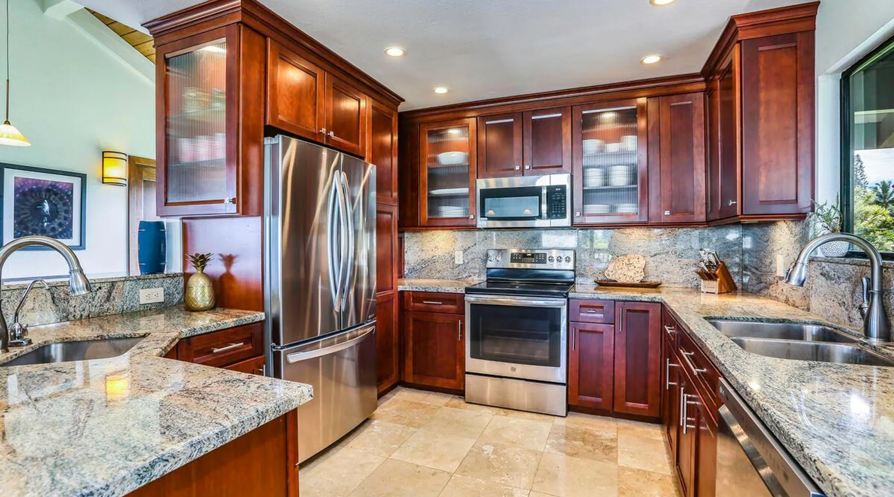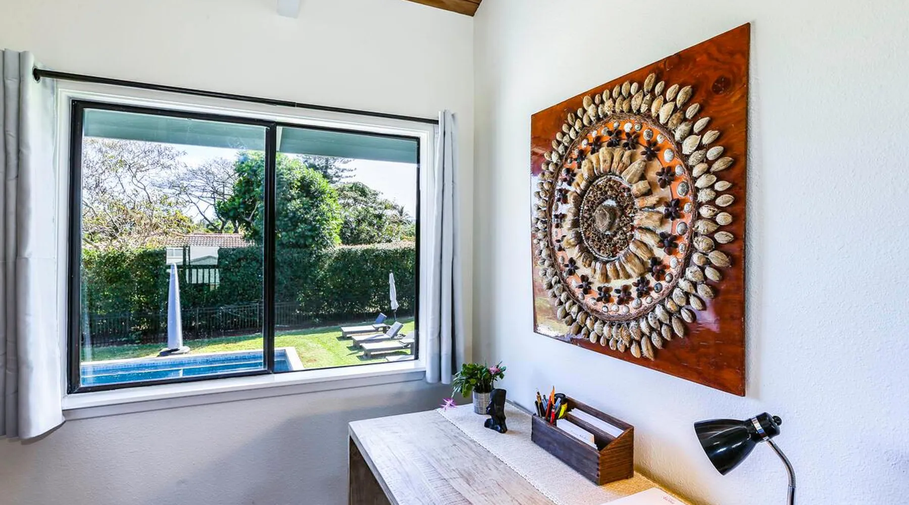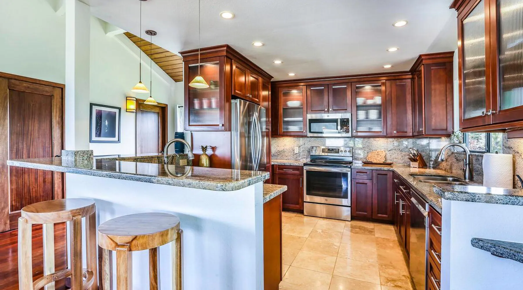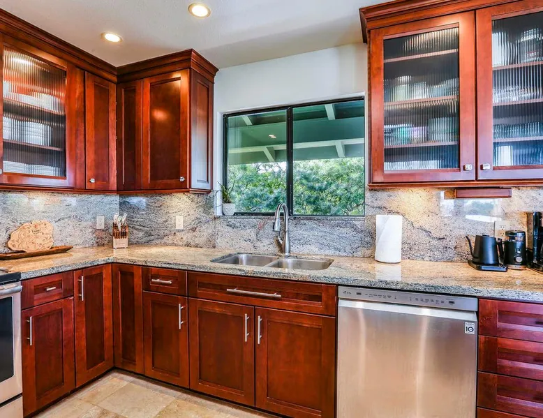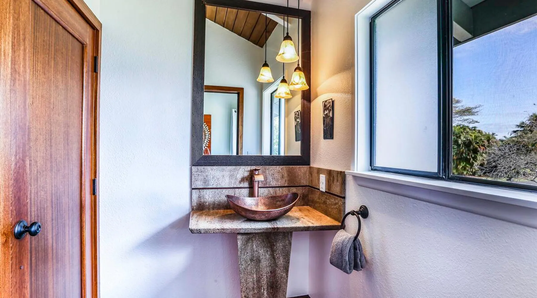 Hawaii Life Presents Hale Kaweonui - Nestled within the tranquil community of Princeville, Hale Kaweonui offers guests a one of a kind experience. Nearby to beautiful beaches, shopping, and dining. Your own private oasis in the middle of it all. The space Nestled within the tranquil community of Princeville, Hale Kaweonui offers guests a one of a kind experience. From the moment you step inside, you are greeted with original designs with thoughtful details throughout. Ascend the custom-designed staircase with Merbau railing and hammered metal spindles to the second floor of the home which features the kitchen and living area. Intentionally designed in this way to showcase the beautiful ocean and mountain views from large windows. An open floor plan with vaulted ceilings allows Kauai’s natural light and cooling trade winds to fill all of the spaces. Step outside onto the wraparound, covered lanai to take in the sights and sound of the island. The ideal location to enjoy year-round Princeville sunsets! Mature landscaping also offers privacy and settles you within the lush foliage and treetops. Gather some local ingredients and prepare island-inspired meals from the fully-equipped kitchen, providing everything you need to enjoy cooking at home. The lower level features the master bedroom with bathroom and walk-in closet, two more bedrooms and a second bathroom. Each bedroom also includes a newly installed split air conditioning and direct access to a covered lanai and garden. Features: Master Bedroom - King Bed and Ensuite bathroom with shower only Bedroom 2 - Queen Bed Bedroom 3 - King Bed Downstairs Shared Bathroom with combination shower/tub Upstairs Half Bathroom Amenities: Air Conditioning in Living Room and Bedrooms Coffee Drip and French press Designated work spaces with desk Gated Pool (not heated) Two Bikes Two Boogie Boards Beach Umbrella Children Accessories Pack n Play Stoller Stokke Trip Trap high chair Baby Bjorn Diaper changing pad Black Out Curtains Sound Machines Board books The Area: Nearby to beaches, golf, biking/walking trails, restaurants and shopping. Just a short drive to world-famous Hanalei Bay. Hawaii Life Rentals is a locally owned, licensed real estate company with rentals on Kauai, Maui, Oahu, and Hawaii. We offer on-island personal assistance and Concierge services. Rates do not include taxes, cleaning and applicable fees. Hawaii Life/VRBO bookings: Guests must sign a rental contract within 48 hours of booking to confirm the reservation. TA-131-604-6336-01 Registration Details 540130450000, TA-131-604-6336-01