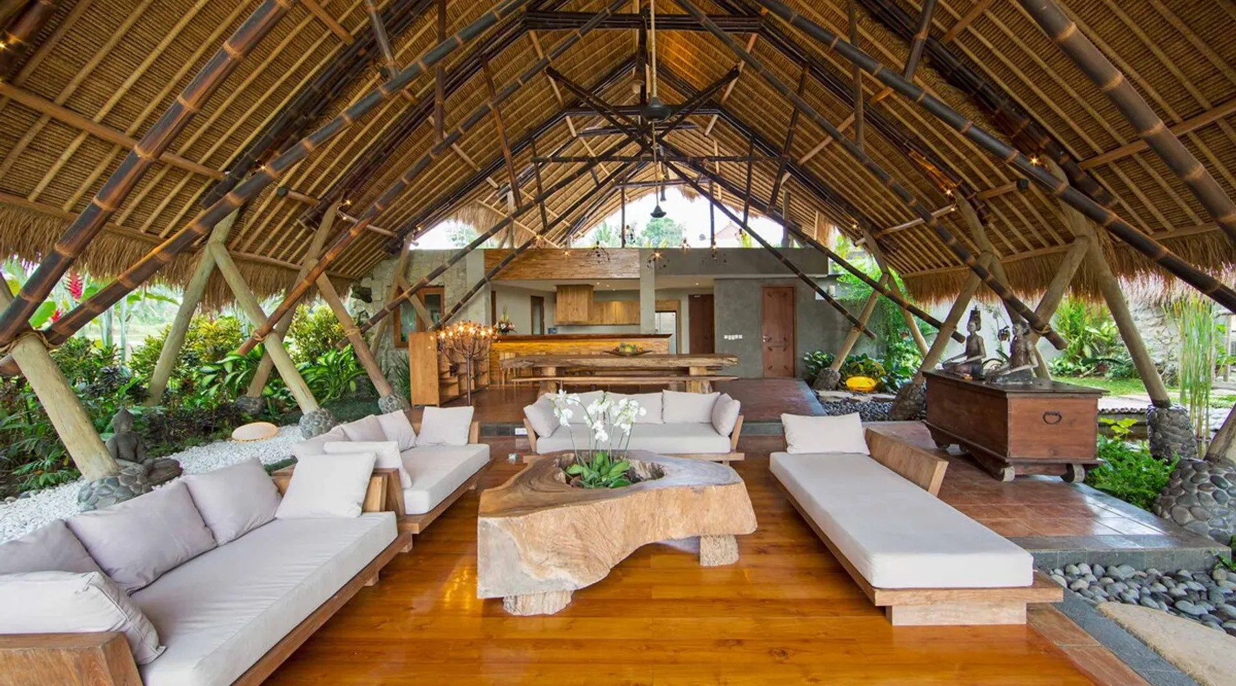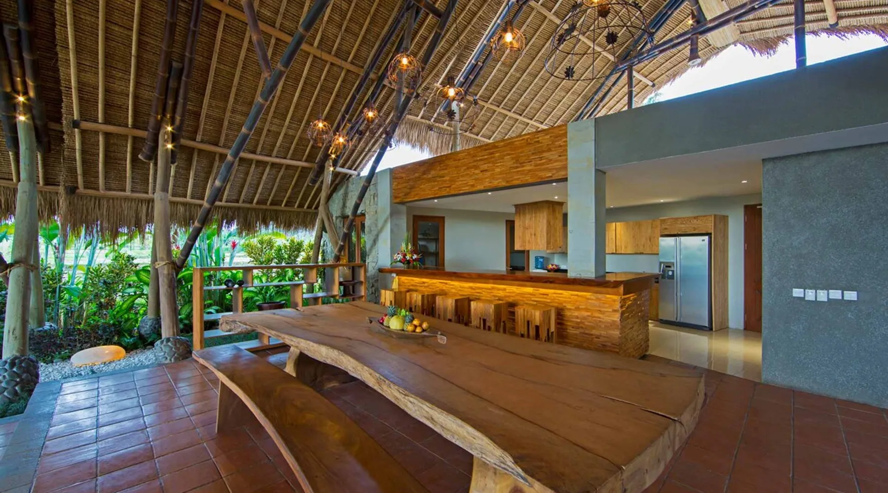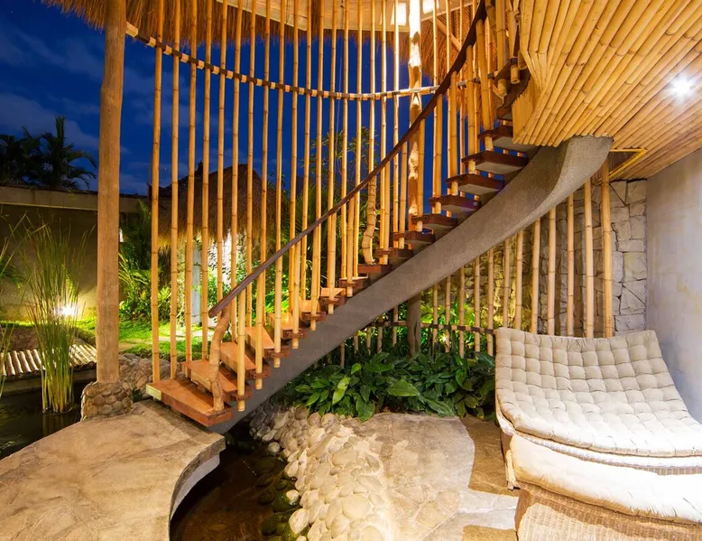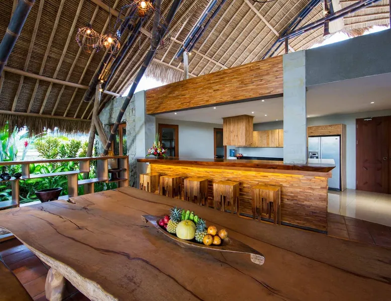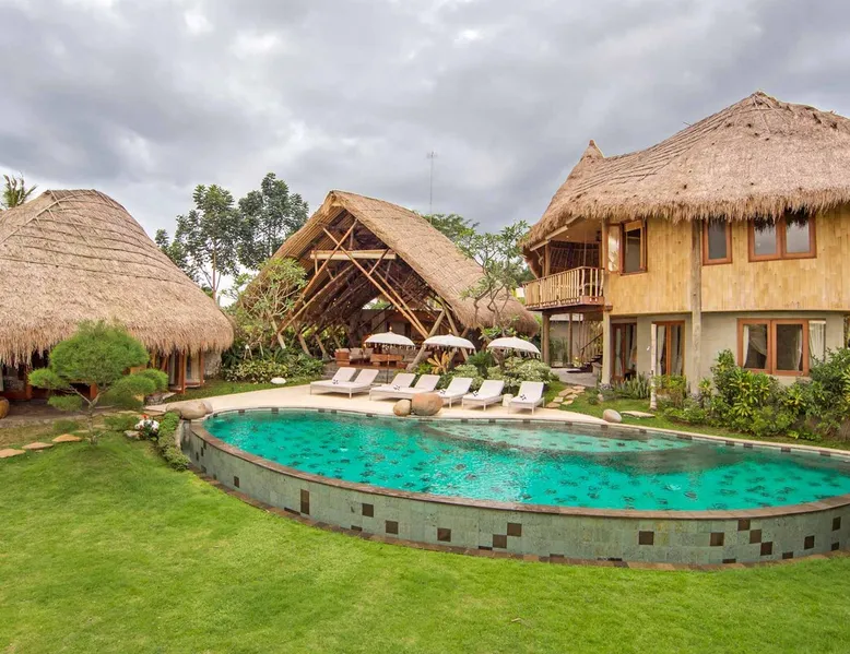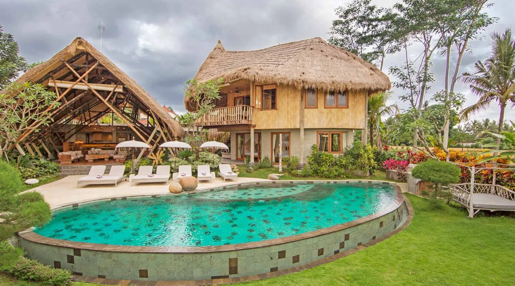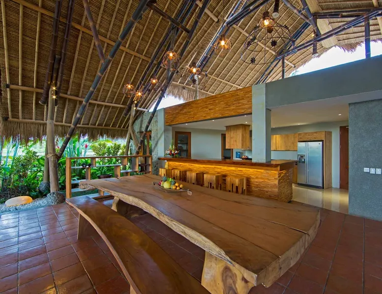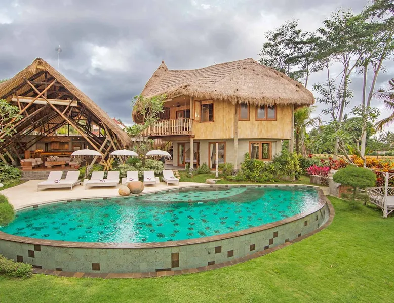 Indulge in the allure of our remarkable 5-bedroom private villa, a testament to unique and captivating architecture. Nestled in a tranquil enclave surrounded by lush tropical beauty, this retreat is tailor-made for large families or groups of friends seeking a serene haven, where nature's untouched beauty intertwines with luxury. Embark on a journey where architectural magnificence embraces serene nature. Book your stay in our villa and experience a realm where luxury and tranquility unite. The space As you step into this property, a sprawling garden greets you, crowned by a picturesque free-form infinity pool. Here, relaxation finds a new definition, with comfortable sun loungers inviting you to unwind. A central pavilion plays host to the villa's living areas, adorned with art pieces and designer furniture. This space boasts panoramic views of the outdoor expanse. A lounge corner, furnished with wooden sofas, beckons for moments of repose. A grand dining table, accommodating large groups, stands ready for lavish feasts. The modern kitchen, complete with a bar and stools, invites culinary exploration. Five resplendent bedrooms await, each an epitome of comfort. Air-conditioning embraces you as you enter, and lavish canopied king or queen beds promise nights of absolute repose. Televisions with DVD players and en-suite bathrooms, featuring invigorating rain showers, complete the offerings. The master bedroom, elevated on the second floor of a captivating pavilion, unfolds a balcony with tranquil seating and an en-suite bathroom graced with a stone tub. Two ground-floor bedrooms in the same pavilion extend a familial warmth. The remaining two bedrooms, nestled in a separate bungalow, unveil private verandas adorned with plush sofas.