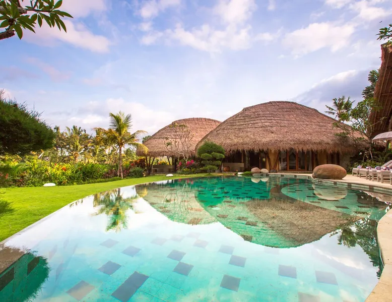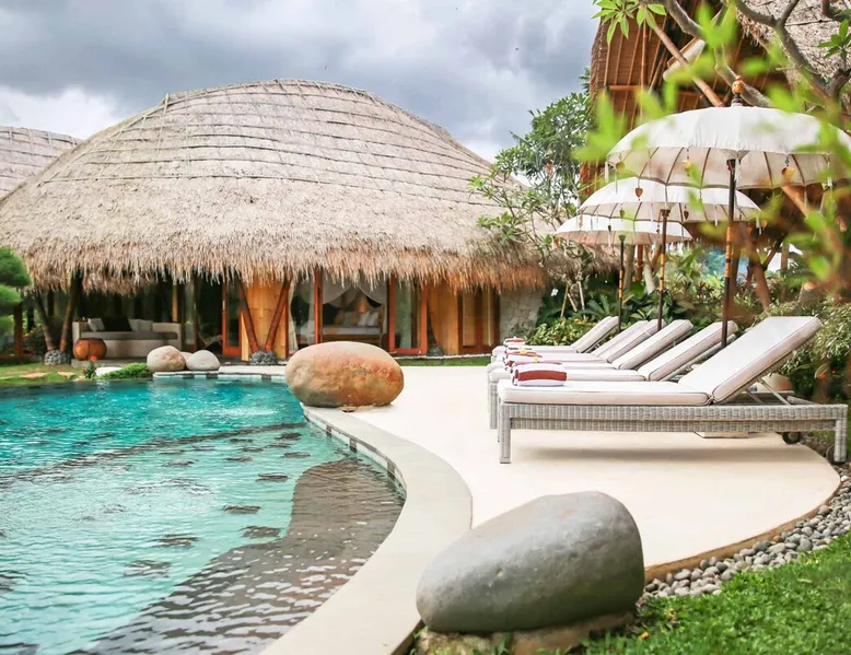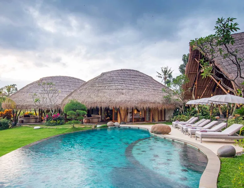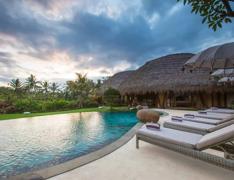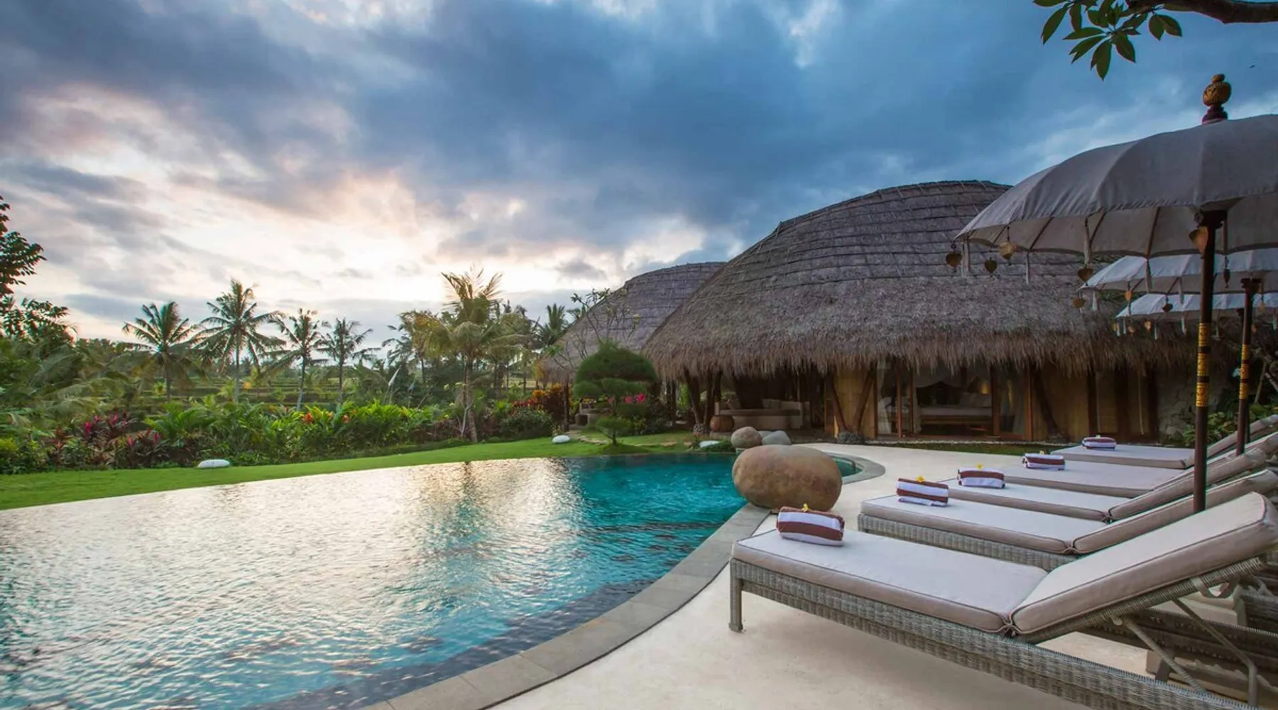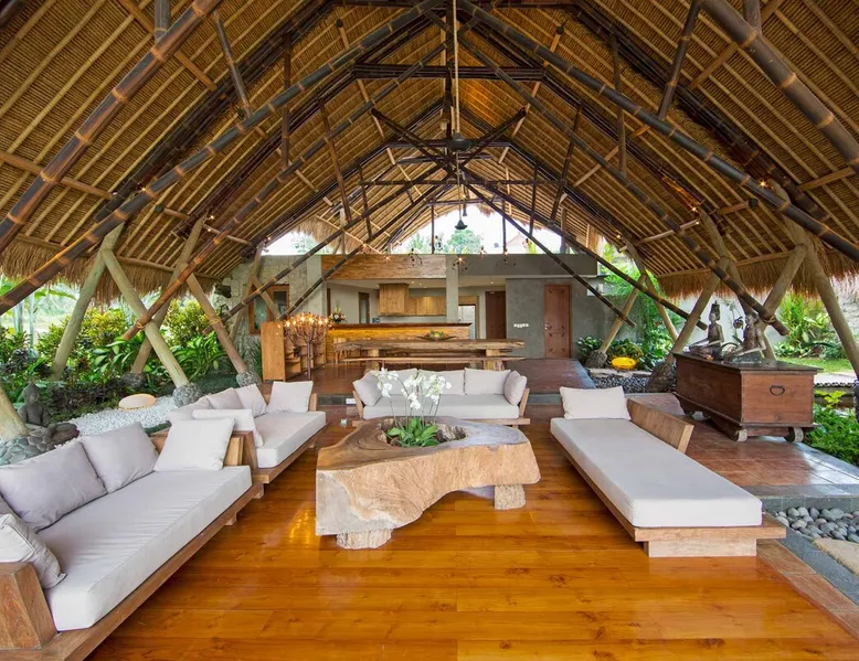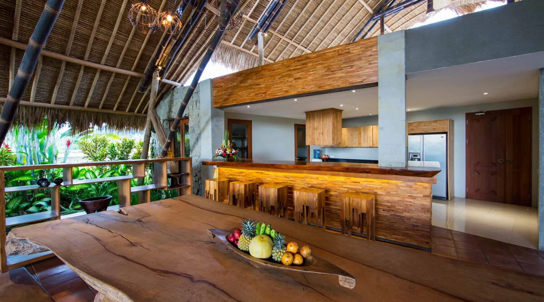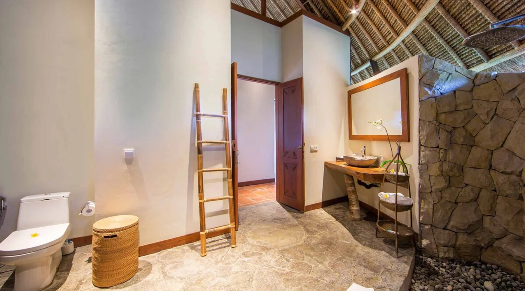Indulge in the allure of our remarkable 5-bedroom private villa, a testament to unique and captivating architecture. Nestled in a tranquil enclave surrounded by lush tropical beauty, this retreat is tailor-made for large families or groups of friends seeking a serene haven, where nature's untouched beauty intertwines with luxury. Embark on a journey where architectural magnificence embraces serene nature. Book your stay in our villa and experience a realm where luxury and tranquility unite. The space As you step into this property, a sprawling garden greets you, crowned by a picturesque free-form infinity pool. Here, relaxation finds a new definition, with comfortable sun loungers inviting you to unwind. A central pavilion plays host to the villa's living areas, adorned with art pieces and designer furniture. This space boasts panoramic views of the outdoor expanse. A lounge corner, furnished with wooden sofas, beckons for moments of repose. A grand dining table, accommodating large groups, stands ready for lavish feasts. The modern kitchen, complete with a bar and stools, invites culinary exploration. Five resplendent bedrooms await, each an epitome of comfort. Air-conditioning embraces you as you enter, and lavish canopied king or queen beds promise nights of absolute repose. Televisions with DVD players and en-suite bathrooms, featuring invigorating rain showers, complete the offerings. The master bedroom, elevated on the second floor of a captivating pavilion, unfolds a balcony with tranquil seating and an en-suite bathroom graced with a stone tub. Two ground-floor bedrooms in the same pavilion extend a familial warmth. The remaining two bedrooms, nestled in a separate bungalow, unveil private verandas adorned with plush sofas.