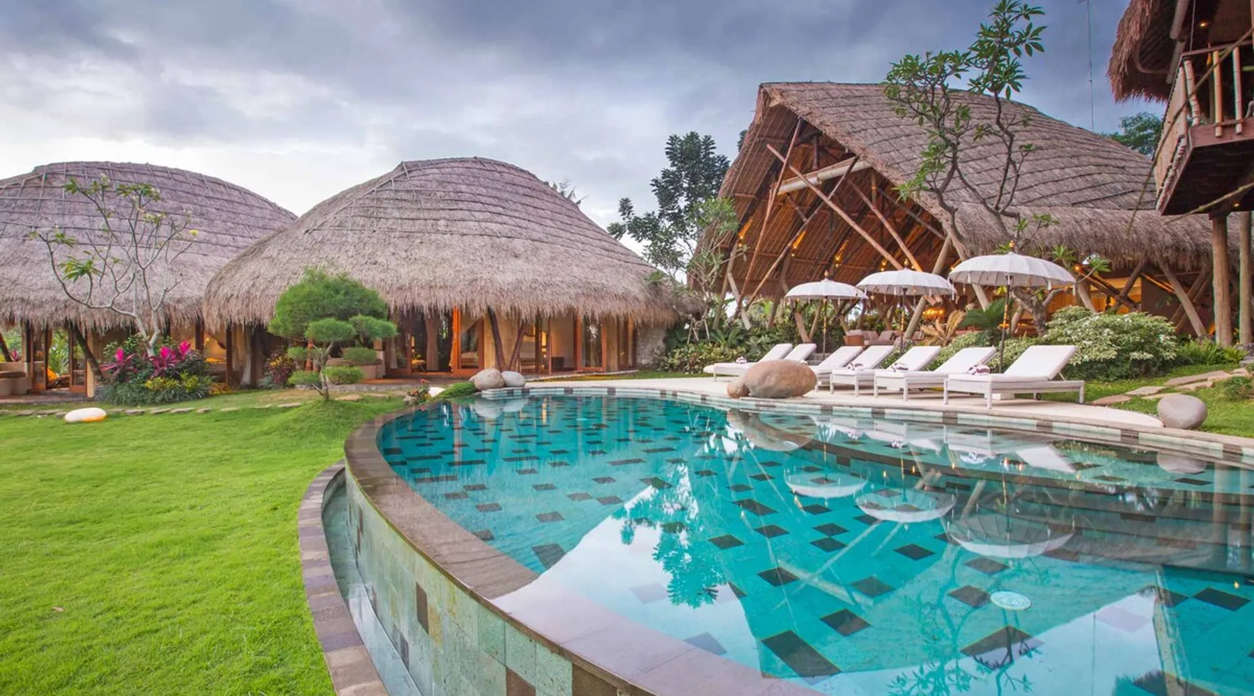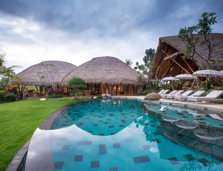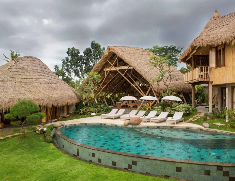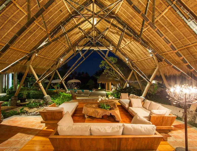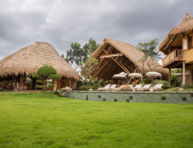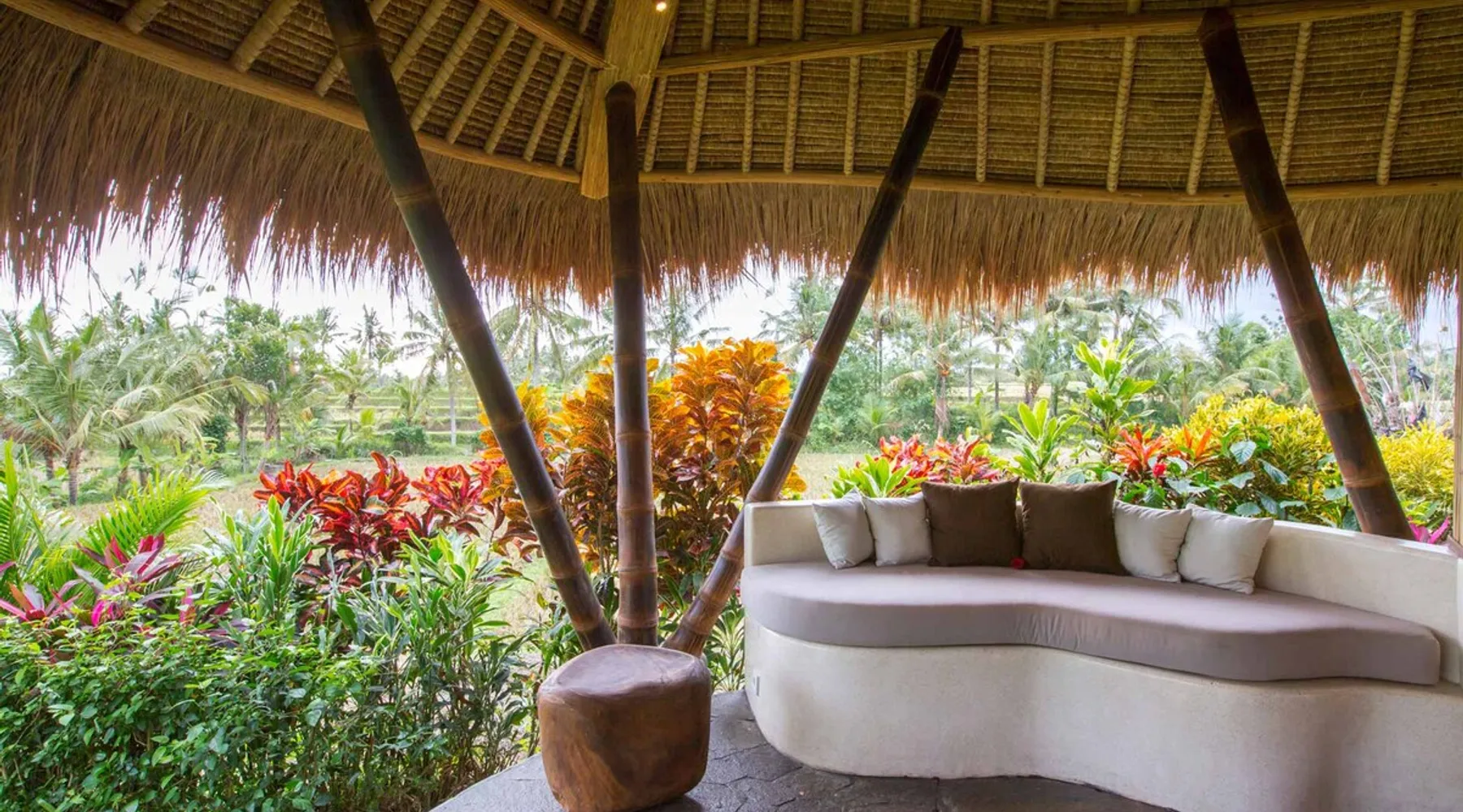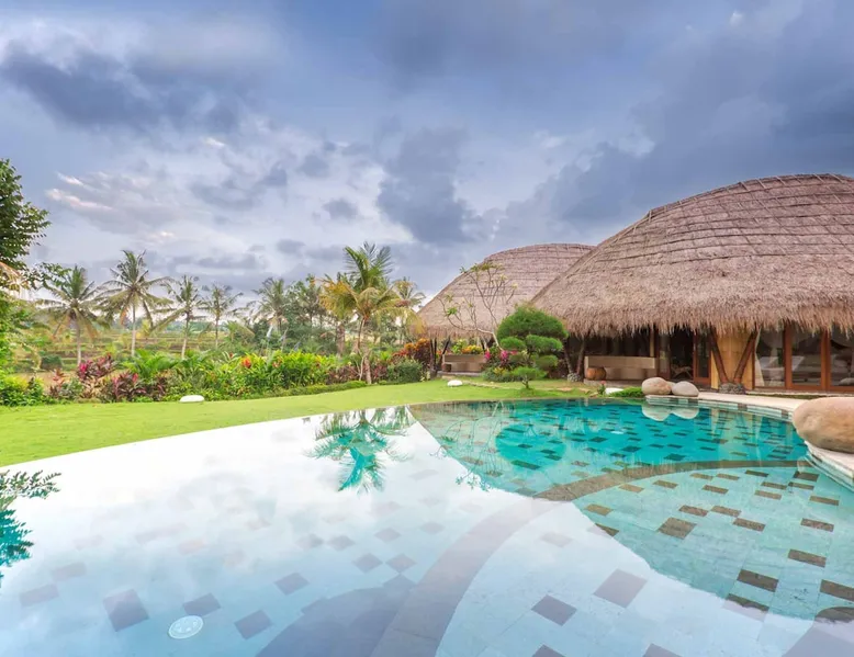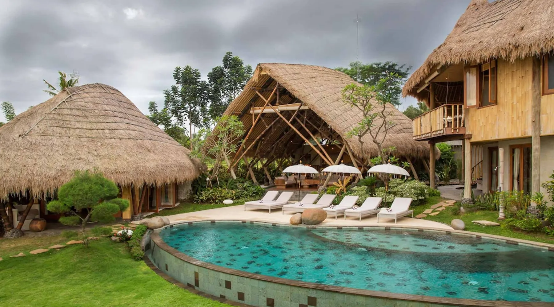 Indulge in the allure of our remarkable 5-bedroom private villa, a testament to unique and captivating architecture. Nestled in a tranquil enclave surrounded by lush tropical beauty, this retreat is tailor-made for large families or groups of friends seeking a serene haven, where nature's untouched beauty intertwines with luxury. Embark on a journey where architectural magnificence embraces serene nature. Book your stay in our villa and experience a realm where luxury and tranquility unite. The space As you step into this property, a sprawling garden greets you, crowned by a picturesque free-form infinity pool. Here, relaxation finds a new definition, with comfortable sun loungers inviting you to unwind. A central pavilion plays host to the villa's living areas, adorned with art pieces and designer furniture. This space boasts panoramic views of the outdoor expanse. A lounge corner, furnished with wooden sofas, beckons for moments of repose. A grand dining table, accommodating large groups, stands ready for lavish feasts. The modern kitchen, complete with a bar and stools, invites culinary exploration. Five resplendent bedrooms await, each an epitome of comfort. Air-conditioning embraces you as you enter, and lavish canopied king or queen beds promise nights of absolute repose. Televisions with DVD players and en-suite bathrooms, featuring invigorating rain showers, complete the offerings. The master bedroom, elevated on the second floor of a captivating pavilion, unfolds a balcony with tranquil seating and an en-suite bathroom graced with a stone tub. Two ground-floor bedrooms in the same pavilion extend a familial warmth. The remaining two bedrooms, nestled in a separate bungalow, unveil private verandas adorned with plush sofas.