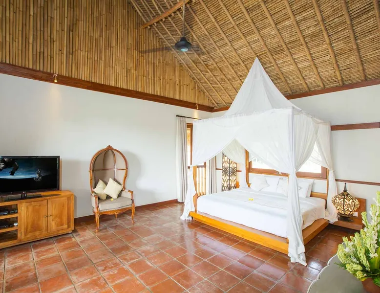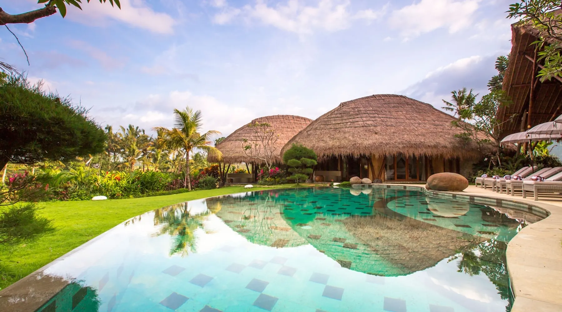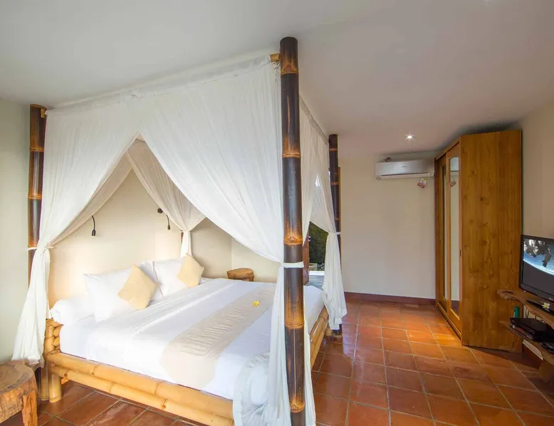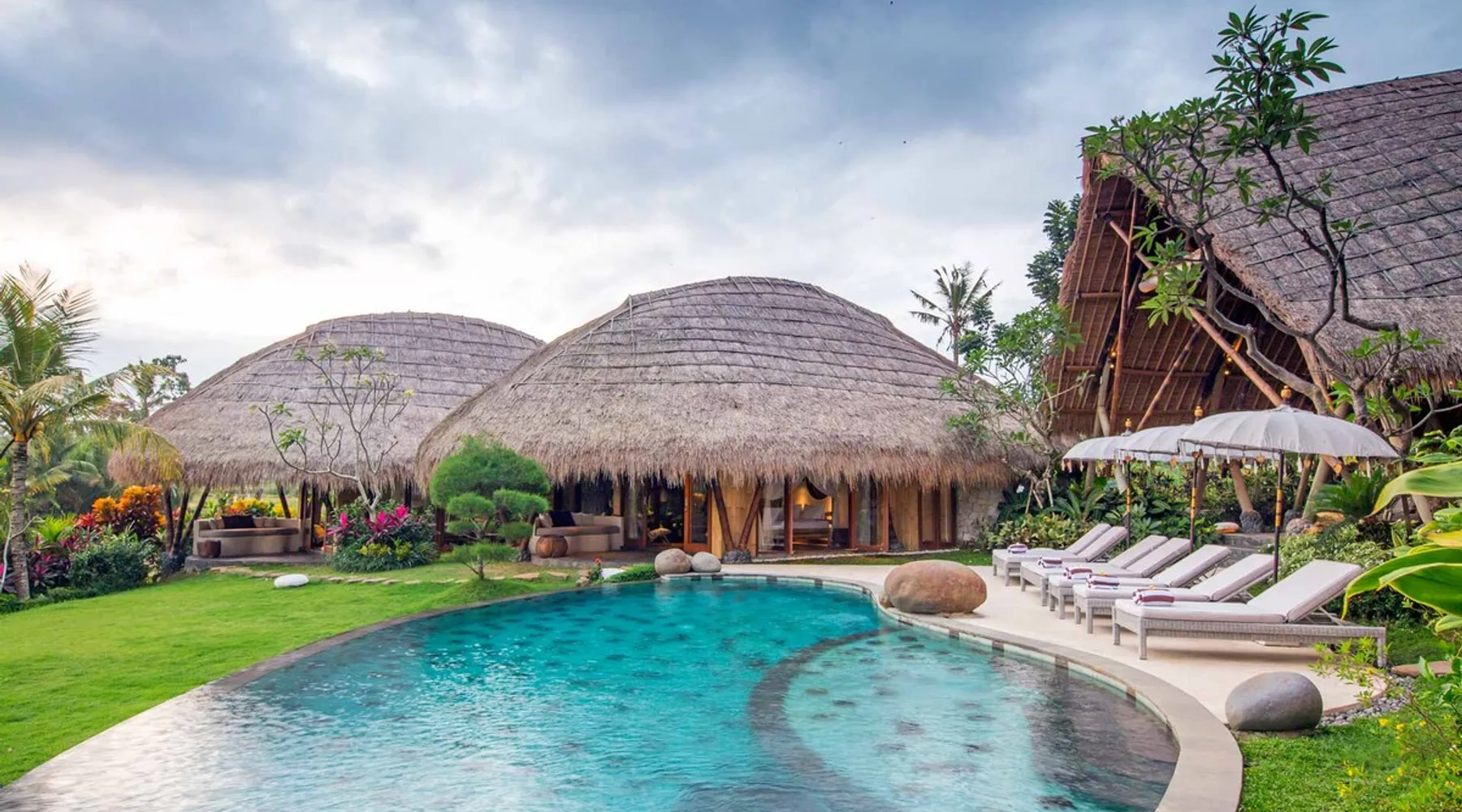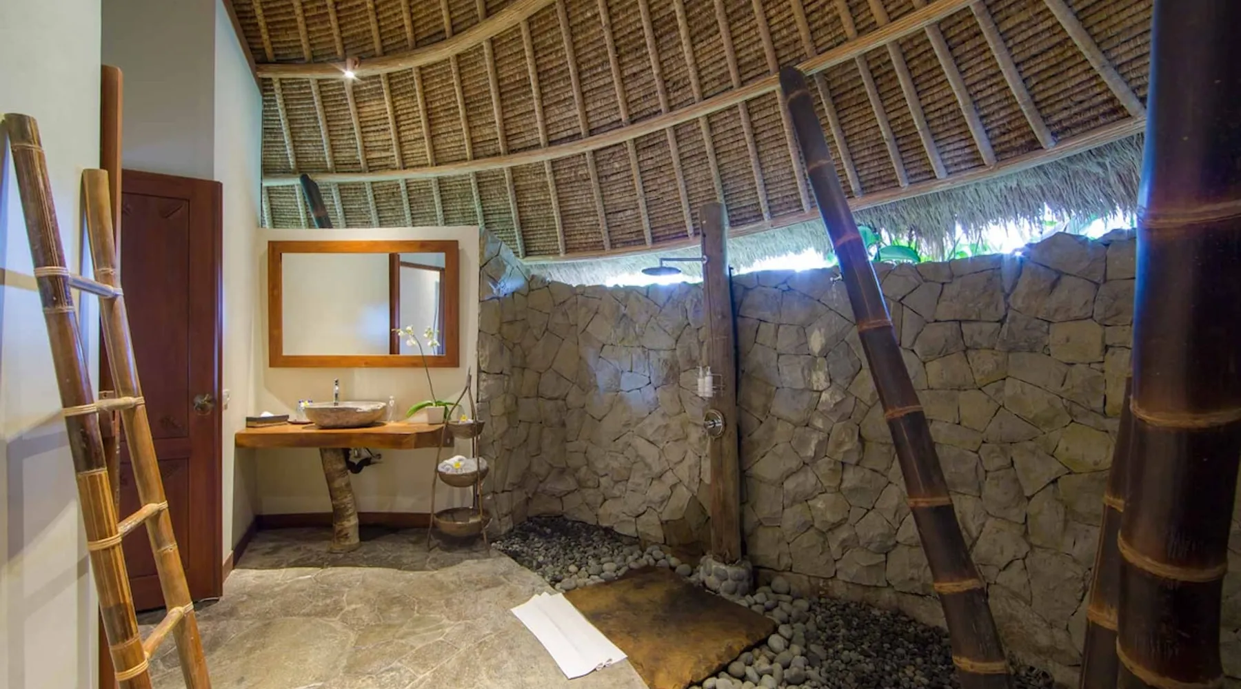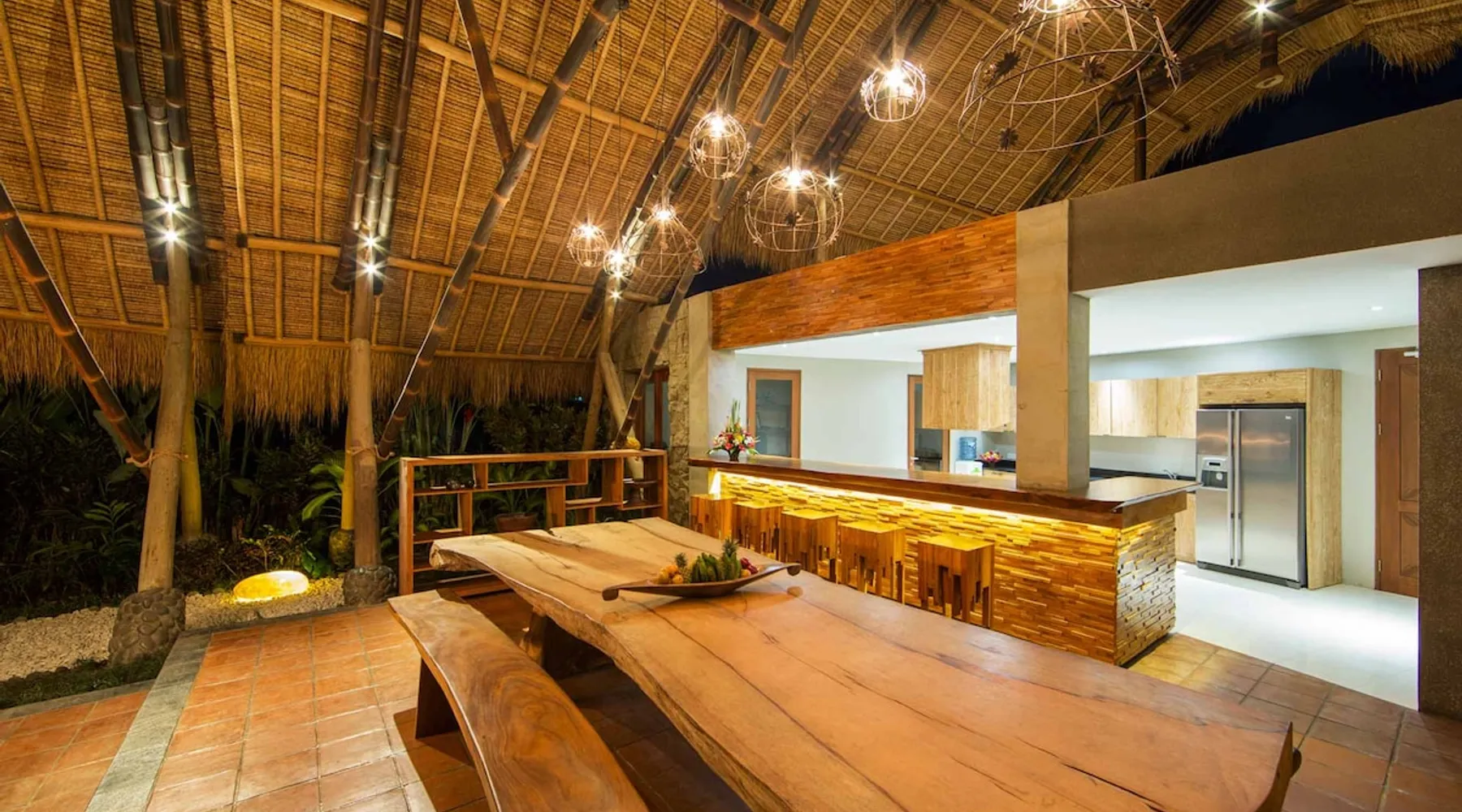 Indulge in the allure of our remarkable 5-bedroom private villa, a testament to unique and captivating architecture. Nestled in a tranquil enclave surrounded by lush tropical beauty, this retreat is tailor-made for large families or groups of friends seeking a serene haven, where nature's untouched beauty intertwines with luxury. Embark on a journey where architectural magnificence embraces serene nature. Book your stay in our villa and experience a realm where luxury and tranquility unite. The space As you step into this property, a sprawling garden greets you, crowned by a picturesque free-form infinity pool. Here, relaxation finds a new definition, with comfortable sun loungers inviting you to unwind. A central pavilion plays host to the villa's living areas, adorned with art pieces and designer furniture. This space boasts panoramic views of the outdoor expanse. A lounge corner, furnished with wooden sofas, beckons for moments of repose. A grand dining table, accommodating large groups, stands ready for lavish feasts. The modern kitchen, complete with a bar and stools, invites culinary exploration. Five resplendent bedrooms await, each an epitome of comfort. Air-conditioning embraces you as you enter, and lavish canopied king or queen beds promise nights of absolute repose. Televisions with DVD players and en-suite bathrooms, featuring invigorating rain showers, complete the offerings. The master bedroom, elevated on the second floor of a captivating pavilion, unfolds a balcony with tranquil seating and an en-suite bathroom graced with a stone tub. Two ground-floor bedrooms in the same pavilion extend a familial warmth. The remaining two bedrooms, nestled in a separate bungalow, unveil private verandas adorned with plush sofas.