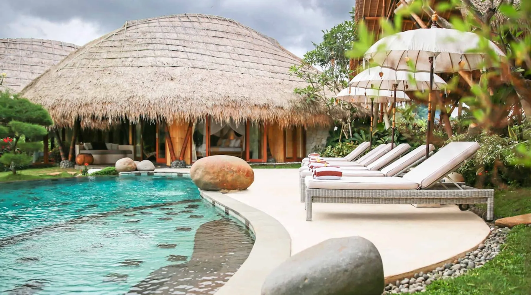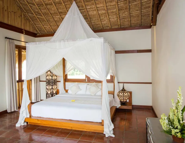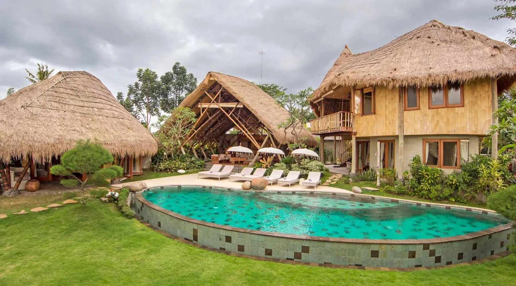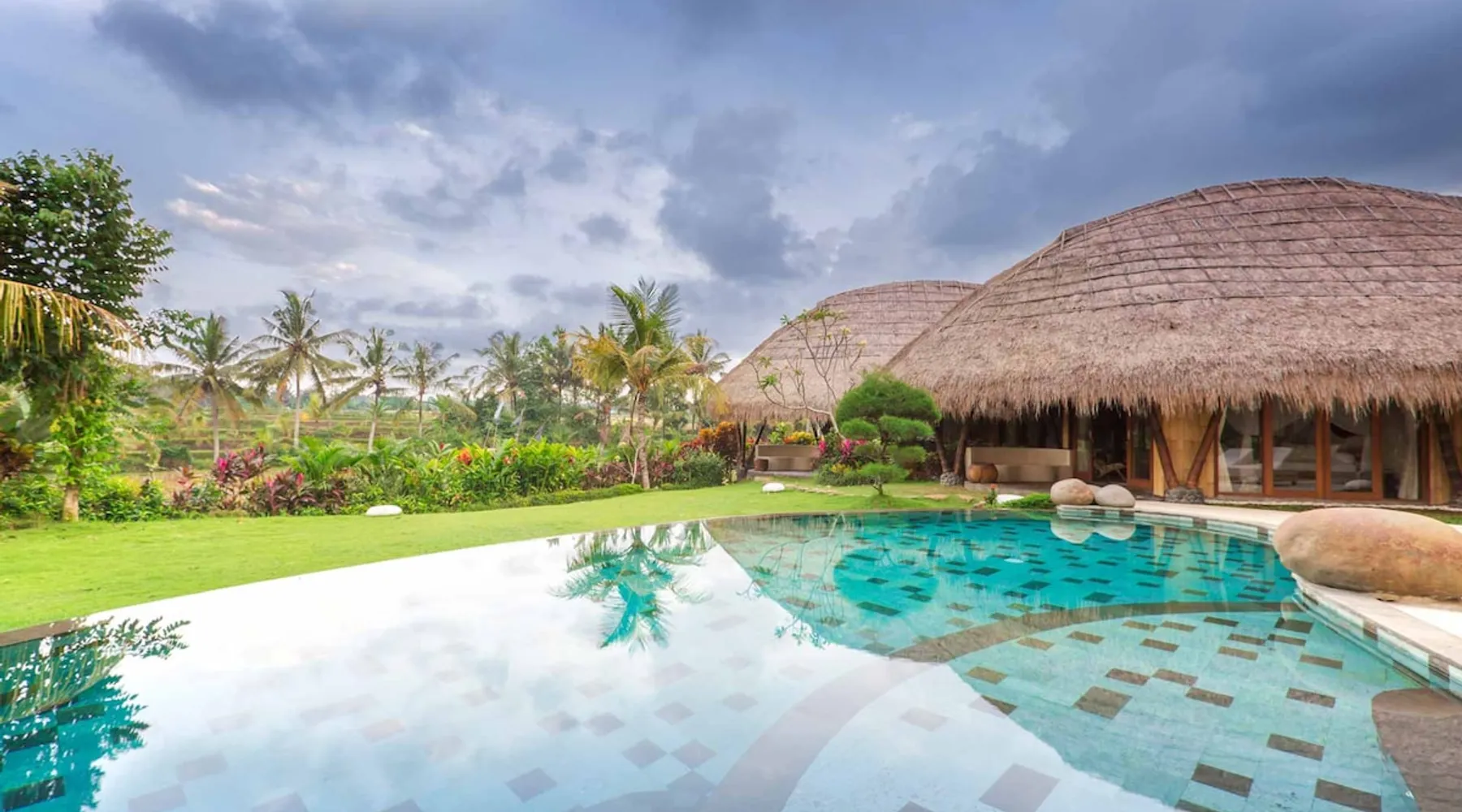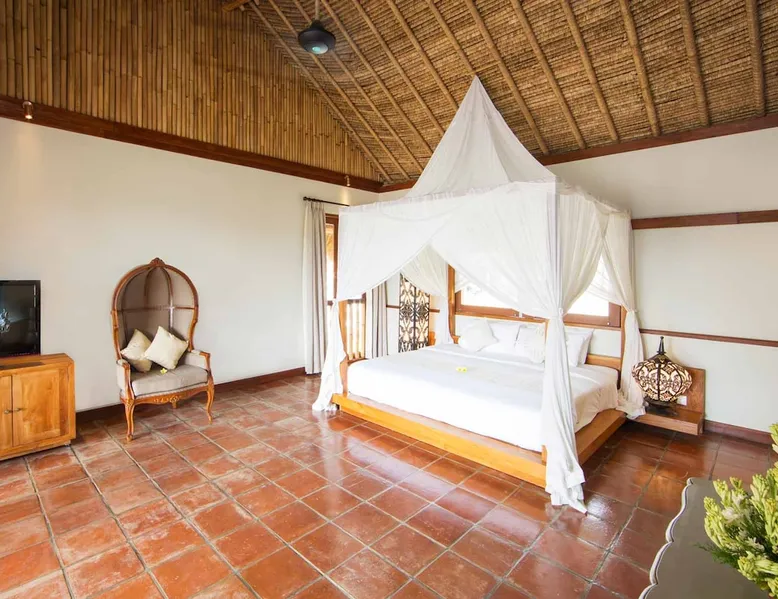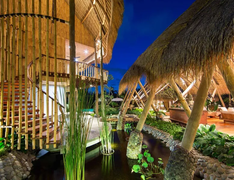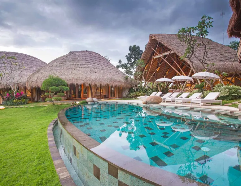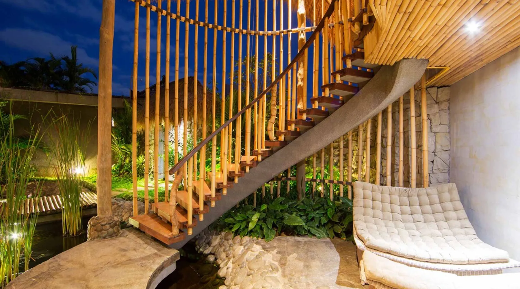 Indulge in the allure of our remarkable 5-bedroom private villa, a testament to unique and captivating architecture. Nestled in a tranquil enclave surrounded by lush tropical beauty, this retreat is tailor-made for large families or groups of friends seeking a serene haven, where nature's untouched beauty intertwines with luxury. Embark on a journey where architectural magnificence embraces serene nature. Book your stay in our villa and experience a realm where luxury and tranquility unite. The space As you step into this property, a sprawling garden greets you, crowned by a picturesque free-form infinity pool. Here, relaxation finds a new definition, with comfortable sun loungers inviting you to unwind. A central pavilion plays host to the villa's living areas, adorned with art pieces and designer furniture. This space boasts panoramic views of the outdoor expanse. A lounge corner, furnished with wooden sofas, beckons for moments of repose. A grand dining table, accommodating large groups, stands ready for lavish feasts. The modern kitchen, complete with a bar and stools, invites culinary exploration. Five resplendent bedrooms await, each an epitome of comfort. Air-conditioning embraces you as you enter, and lavish canopied king or queen beds promise nights of absolute repose. Televisions with DVD players and en-suite bathrooms, featuring invigorating rain showers, complete the offerings. The master bedroom, elevated on the second floor of a captivating pavilion, unfolds a balcony with tranquil seating and an en-suite bathroom graced with a stone tub. Two ground-floor bedrooms in the same pavilion extend a familial warmth. The remaining two bedrooms, nestled in a separate bungalow, unveil private verandas adorned with plush sofas.