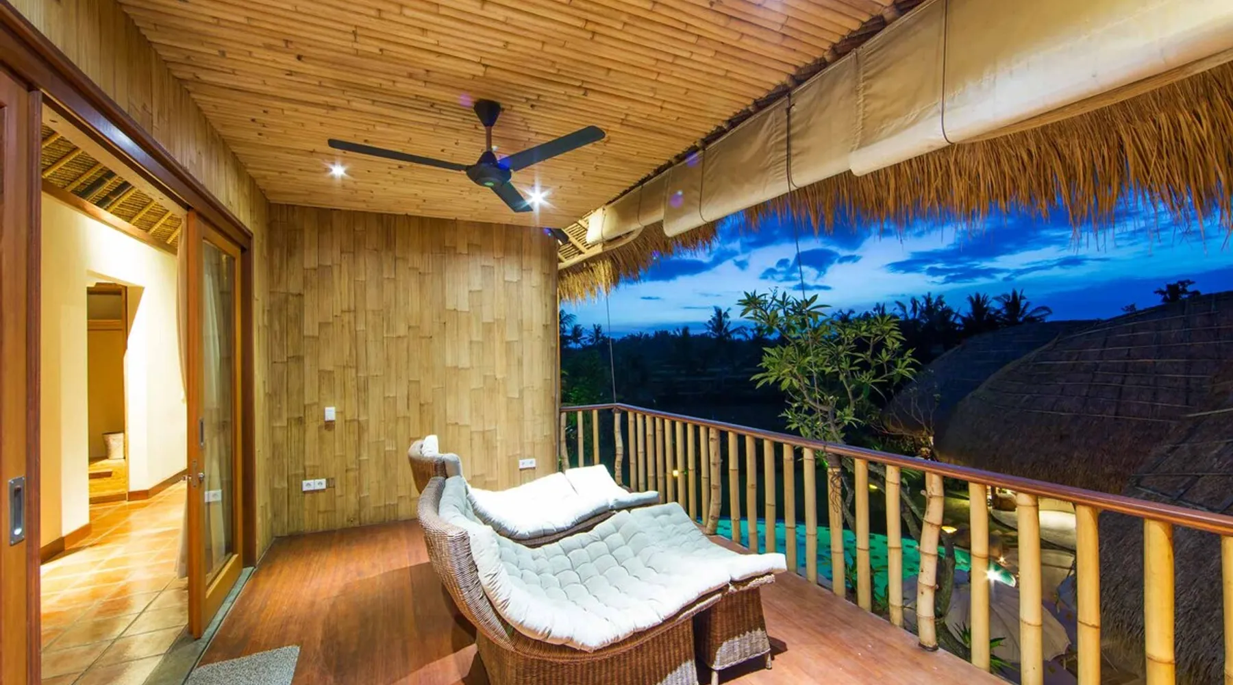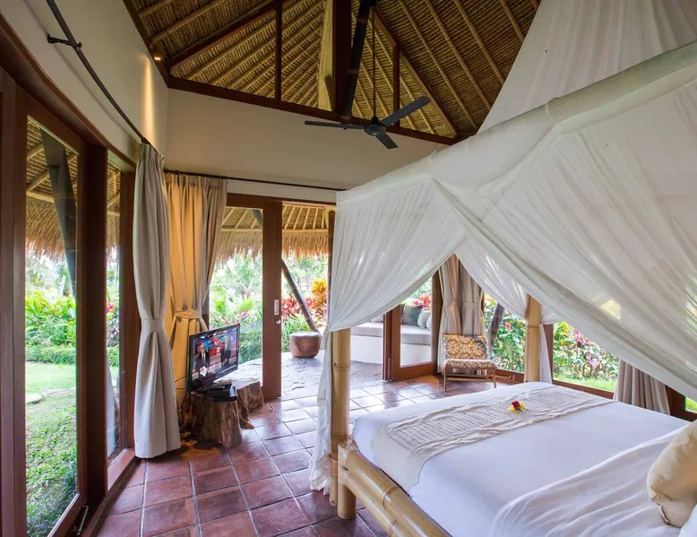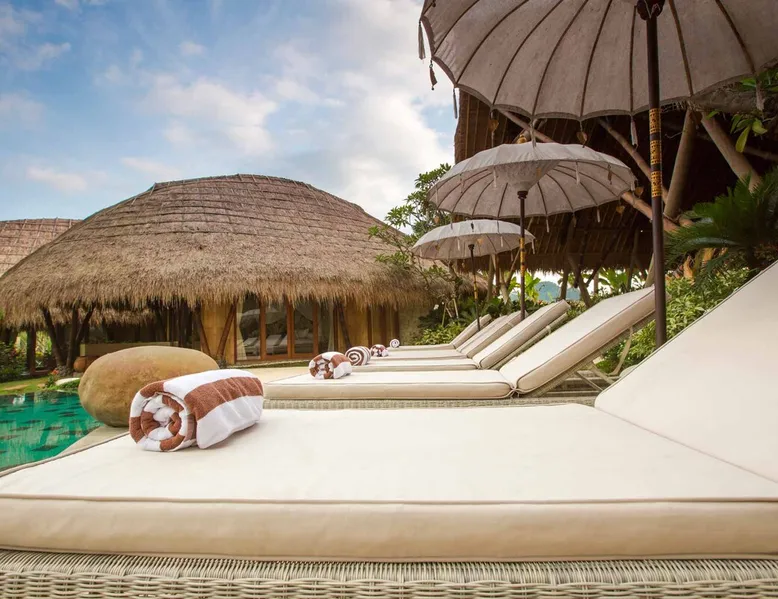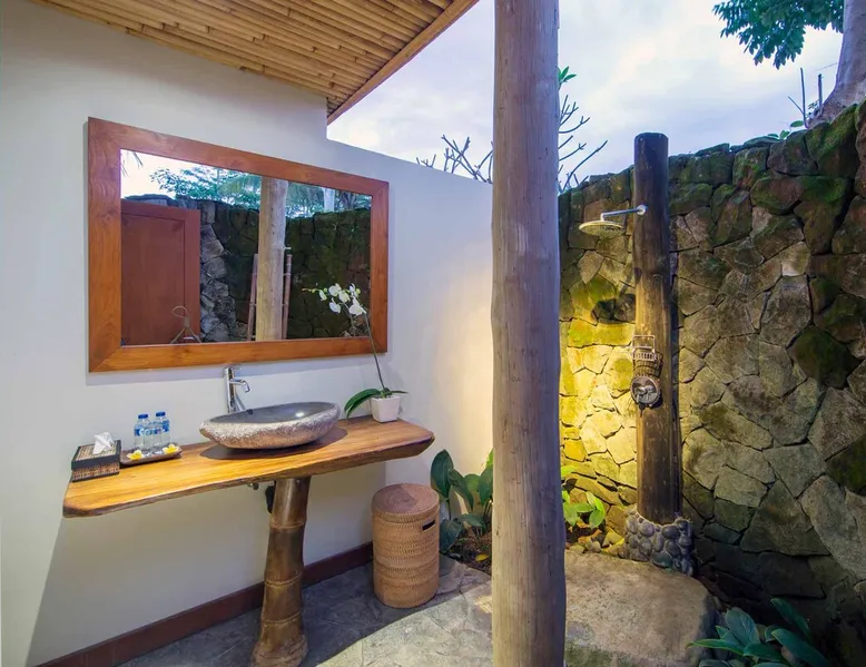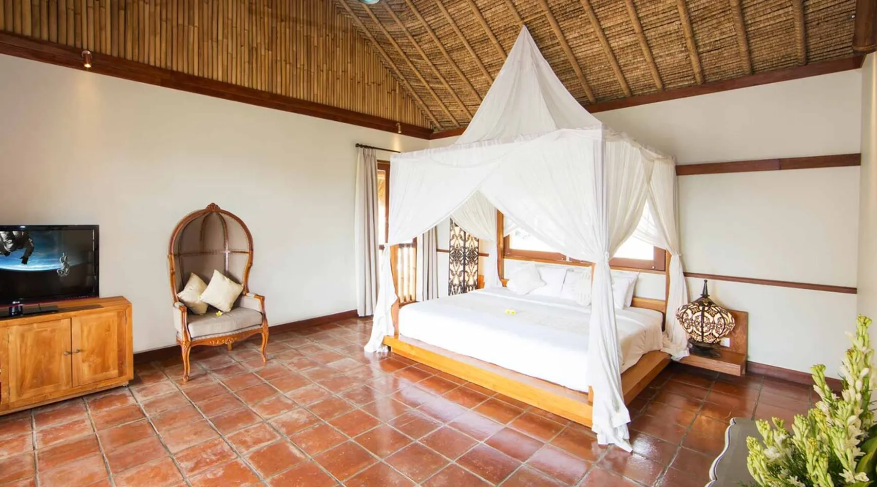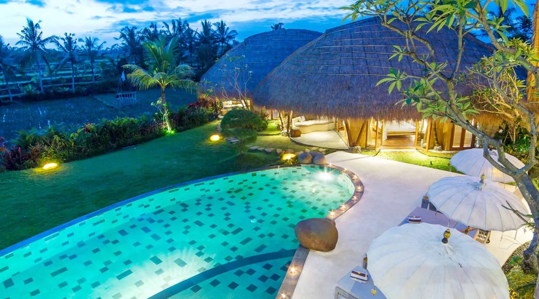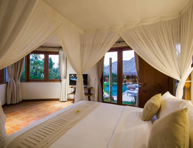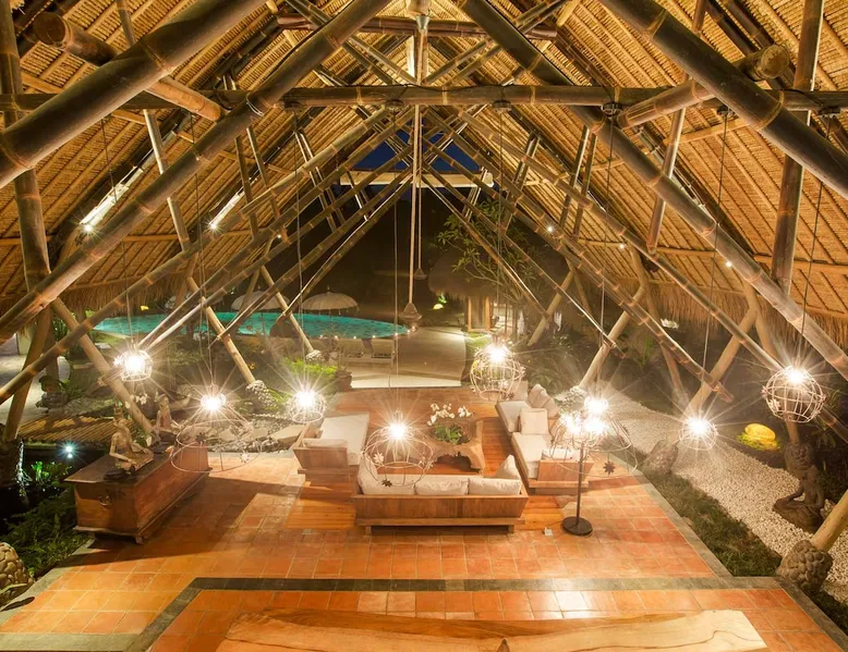 Indulge in the allure of our remarkable 5-bedroom private villa, a testament to unique and captivating architecture. Nestled in a tranquil enclave surrounded by lush tropical beauty, this retreat is tailor-made for large families or groups of friends seeking a serene haven, where nature's untouched beauty intertwines with luxury. Embark on a journey where architectural magnificence embraces serene nature. Book your stay in our villa and experience a realm where luxury and tranquility unite. The space As you step into this property, a sprawling garden greets you, crowned by a picturesque free-form infinity pool. Here, relaxation finds a new definition, with comfortable sun loungers inviting you to unwind. A central pavilion plays host to the villa's living areas, adorned with art pieces and designer furniture. This space boasts panoramic views of the outdoor expanse. A lounge corner, furnished with wooden sofas, beckons for moments of repose. A grand dining table, accommodating large groups, stands ready for lavish feasts. The modern kitchen, complete with a bar and stools, invites culinary exploration. Five resplendent bedrooms await, each an epitome of comfort. Air-conditioning embraces you as you enter, and lavish canopied king or queen beds promise nights of absolute repose. Televisions with DVD players and en-suite bathrooms, featuring invigorating rain showers, complete the offerings. The master bedroom, elevated on the second floor of a captivating pavilion, unfolds a balcony with tranquil seating and an en-suite bathroom graced with a stone tub. Two ground-floor bedrooms in the same pavilion extend a familial warmth. The remaining two bedrooms, nestled in a separate bungalow, unveil private verandas adorned with plush sofas.