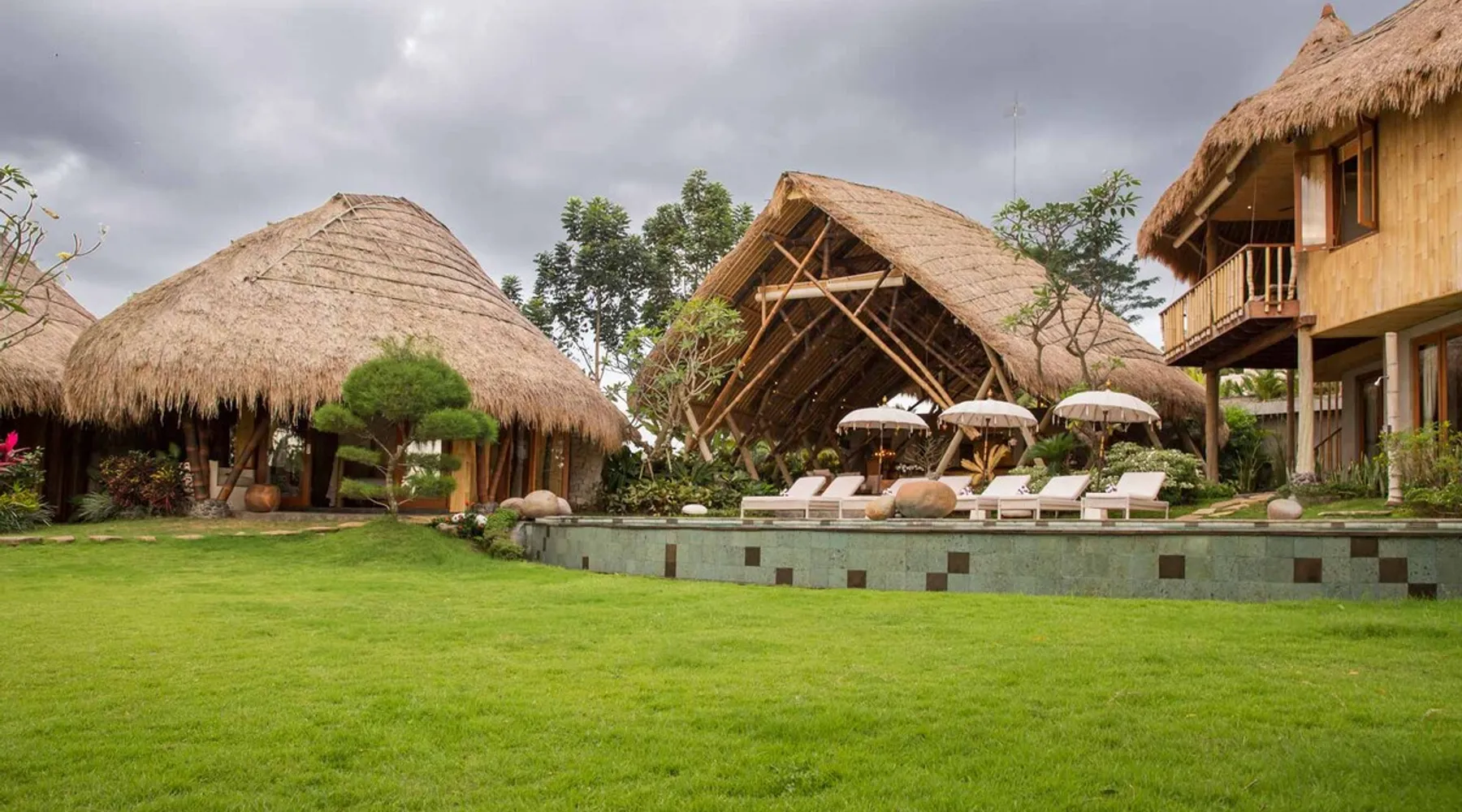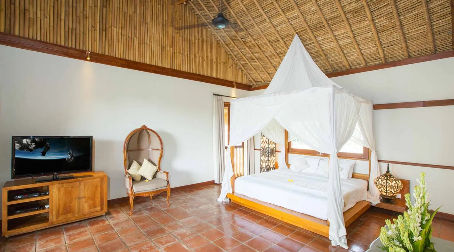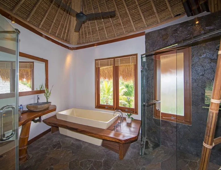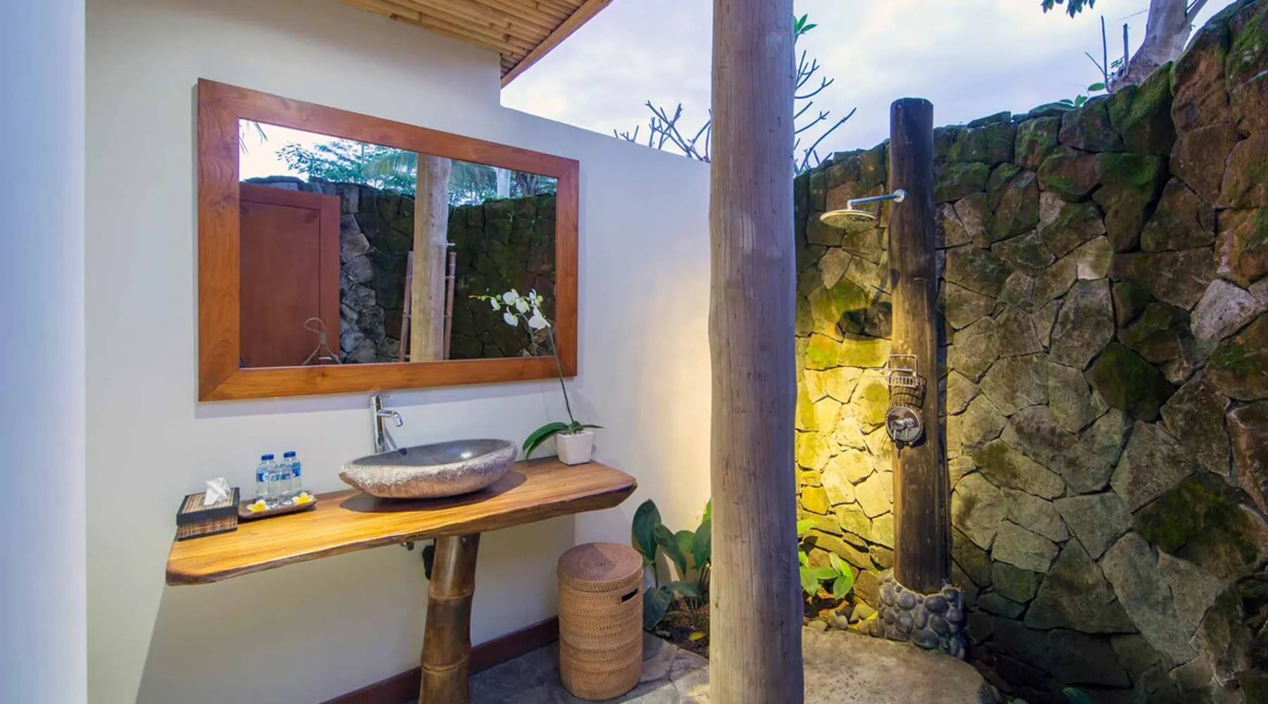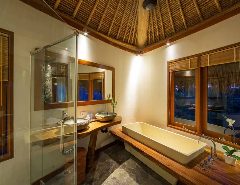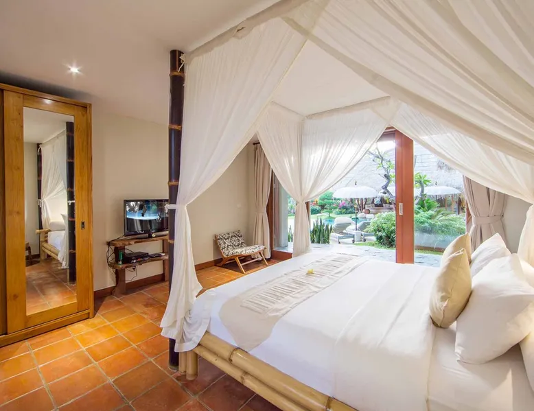 Indulge in the allure of our remarkable 5-bedroom private villa, a testament to unique and captivating architecture. Nestled in a tranquil enclave surrounded by lush tropical beauty, this retreat is tailor-made for large families or groups of friends seeking a serene haven, where nature's untouched beauty intertwines with luxury. Embark on a journey where architectural magnificence embraces serene nature. Book your stay in our villa and experience a realm where luxury and tranquility unite. The space As you step into this property, a sprawling garden greets you, crowned by a picturesque free-form infinity pool. Here, relaxation finds a new definition, with comfortable sun loungers inviting you to unwind. A central pavilion plays host to the villa's living areas, adorned with art pieces and designer furniture. This space boasts panoramic views of the outdoor expanse. A lounge corner, furnished with wooden sofas, beckons for moments of repose. A grand dining table, accommodating large groups, stands ready for lavish feasts. The modern kitchen, complete with a bar and stools, invites culinary exploration. Five resplendent bedrooms await, each an epitome of comfort. Air-conditioning embraces you as you enter, and lavish canopied king or queen beds promise nights of absolute repose. Televisions with DVD players and en-suite bathrooms, featuring invigorating rain showers, complete the offerings. The master bedroom, elevated on the second floor of a captivating pavilion, unfolds a balcony with tranquil seating and an en-suite bathroom graced with a stone tub. Two ground-floor bedrooms in the same pavilion extend a familial warmth. The remaining two bedrooms, nestled in a separate bungalow, unveil private verandas adorned with plush sofas.