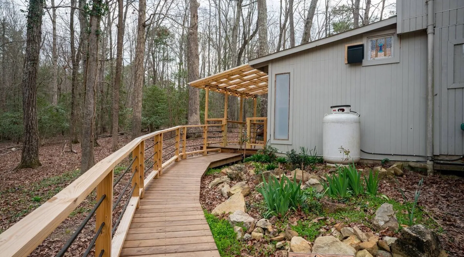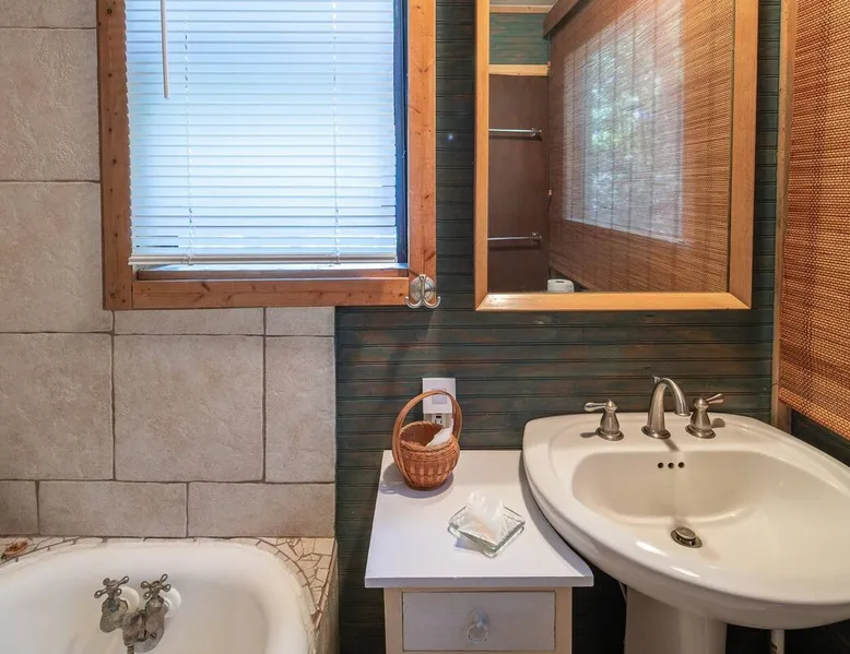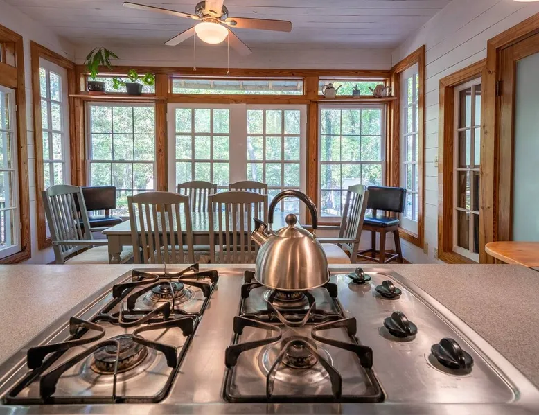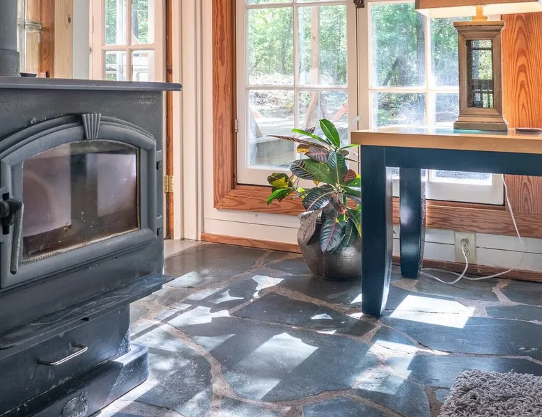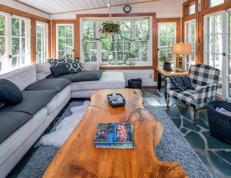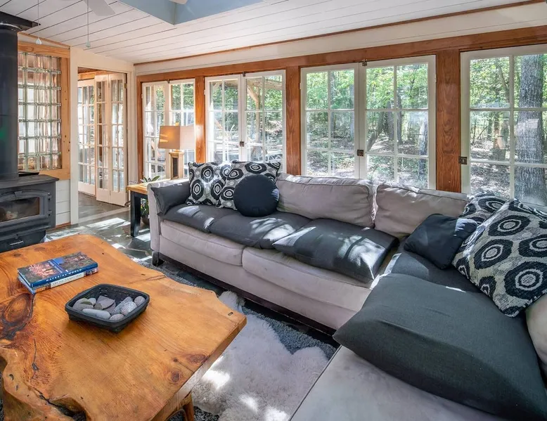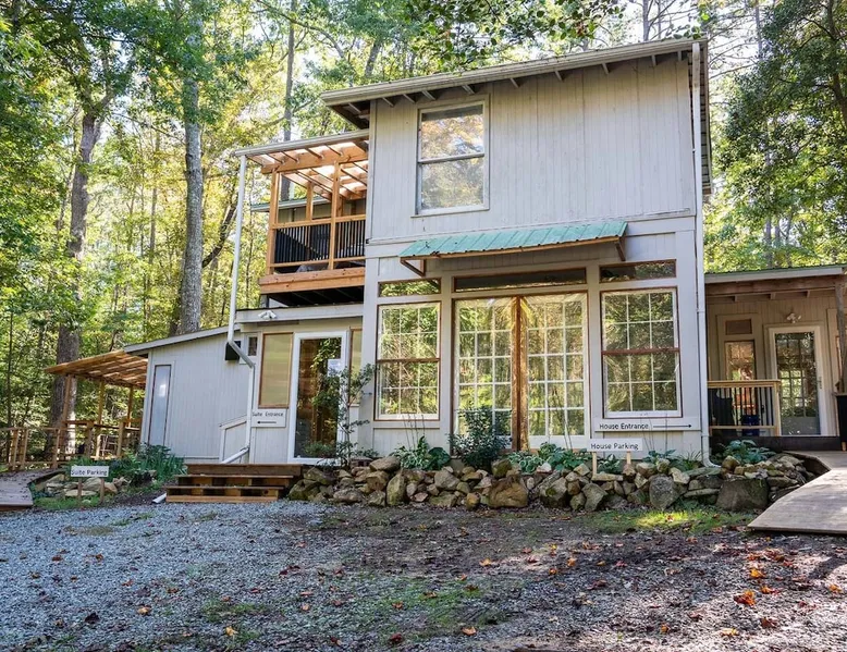 This hand-built artist haven is full of character and charm. Located about 15 minutes from Chapel Hill, Pittsboro, and Saxapahaw, this is an ideal getaway for those who want to spend time in nature while still being close to the city. The rustic atmosphere is complemented by modern amenities, say no more! Build a fire, soak in the tub, and admire the great outdoors from our picture windows. The space This 3BR / 2BA home sits on 5 acres for a spacious and peaceful getaway while still being 15 minutes from town. Our photographer described this place as "Cozy and super charming. Lots of windows and great art make it feel warm and inviting." There are more windows in this house than in most houses of three times the size. Handmade feel with many artsy touches like original mosaics, wood and slate floors. A wood stove for experienced fire tenders on cold days and evenings. This is a one of a kind place that is unique and hard to find. NOTE: It has a very outdoorsy feel. You're likely to see squirrels, birds, maybe even a fox or raccoon. Summertimes are usually full of bugs — and they might find themselves inside your home. Cobwebs can appear literally overnight. For those weary of the great outdoors or nature's creatures, this place is not for you. We do not fumigate and choose to use natural pest management strategies whenever possible. The home is chemical and fragrance-free for easier breathing and better sleep. The owners built the home by hand using recycled and repurposed materials. Enjoy the mosaics made from recycled tiles, the amazing re-homed picture windows and stained glass, and notice that each part of the home was built with love and appreciation for the materials used. This place is truly a work of art that stands in collaboration with nature. Guest access There is parking for 3-5 cars. Uber and Lyft do not usually come out here, so having your own car is important. The closest corner store is 5 minutes away - larger grocery stores are 15 minutes out, as are most restaurants. Other things to note Caution to older and physically challenged people: There are stairs and many levels in this house. Not a good place for those wanting a single-level place. Please let us know if you're going to bring a pet or pets so I can send you our Pet Policy so we are on the same page about how to have that happen in a happy way for all! PET FEE: Well-behaved pets are welcome with a $50 fee (per pet) per stay. Please inquire about our pet policy.