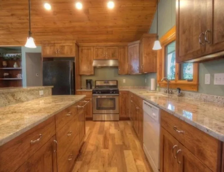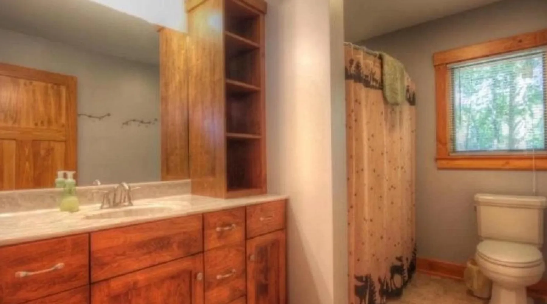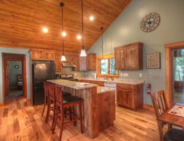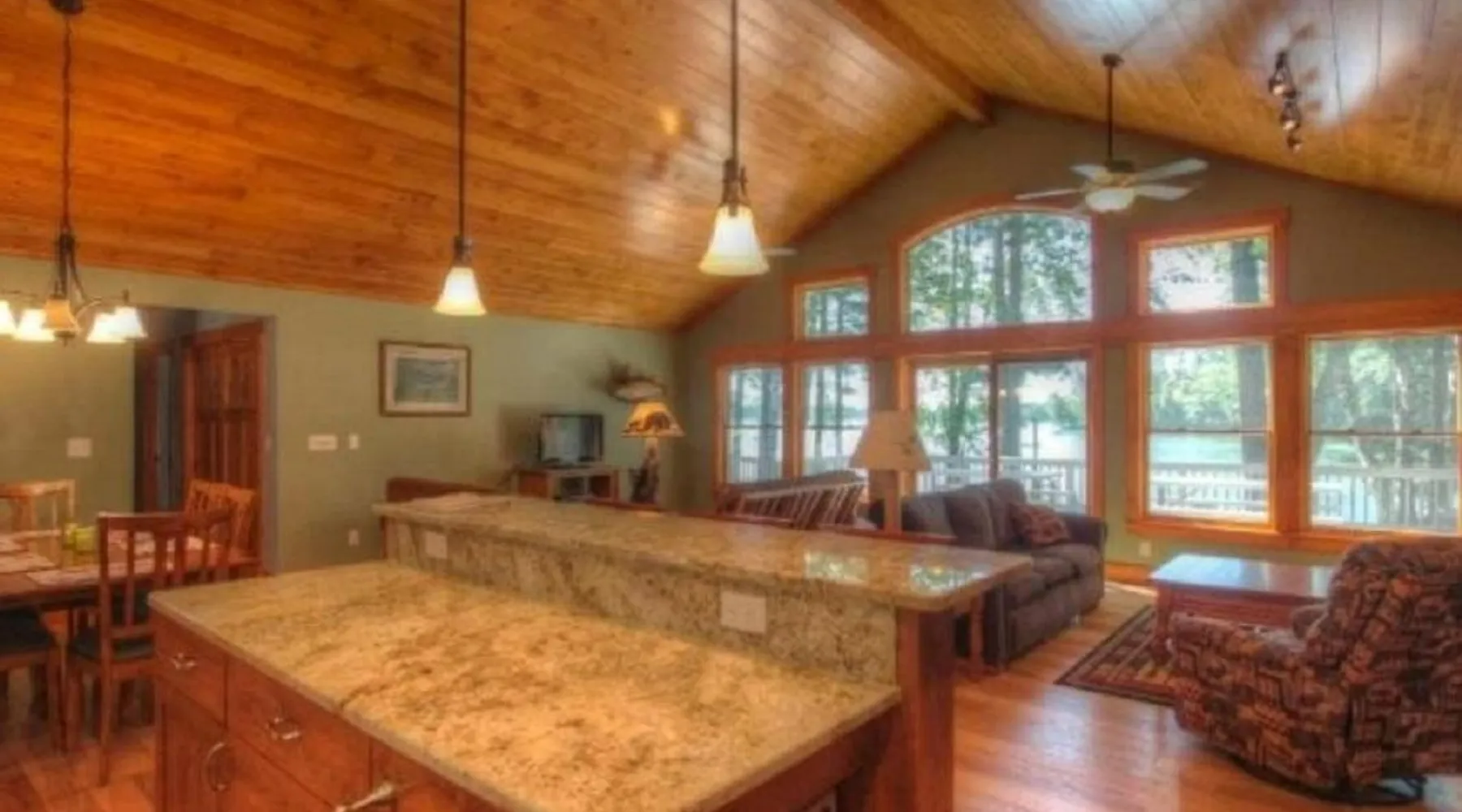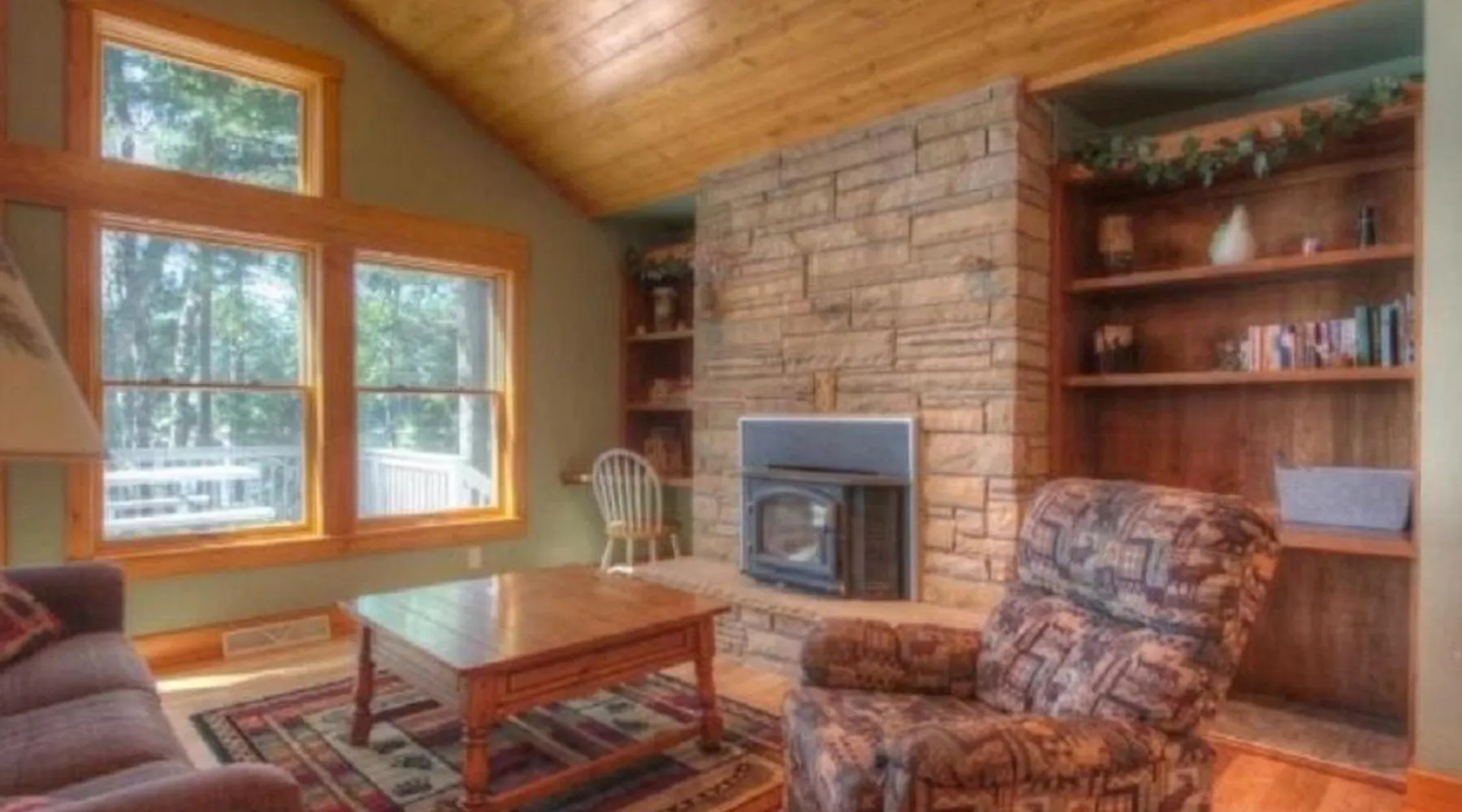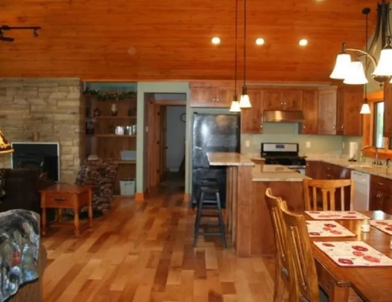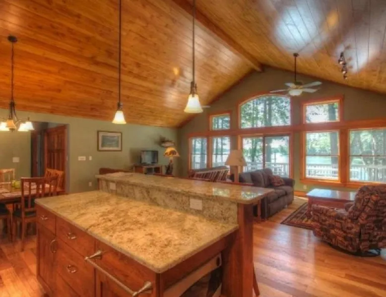 Enjoy Northwoods luxury with South Point’s open concept floor plan and raised ceiling. The space South Point is a large 3 bedroom, 2 1/2 bath home with a deck and screened porch. Located on Little St. Germain Lake on a wide point between South Bay and No Fish Bay with outstanding views in all directions. South Point is very private as it is at the end of a dead end road. The house is located on a spacious lot with level frontage and a sandy lake bottom. There are wood floors, tile showers and granite countertops. Each bedroom has a queen and a twin bed. There is also a futon and sofa bed in the great room. It has a fully equipped kitchen with a microwave, toaster, and coffee maker and dishwasher. Outside there is a deck and a screened porch, picnic tables, lawn chairs, a charcoal Weber grill, and a campfire pit with wood. The South Point Lake House has a private lot with lots of trees, a small beach and sandy swimming area.