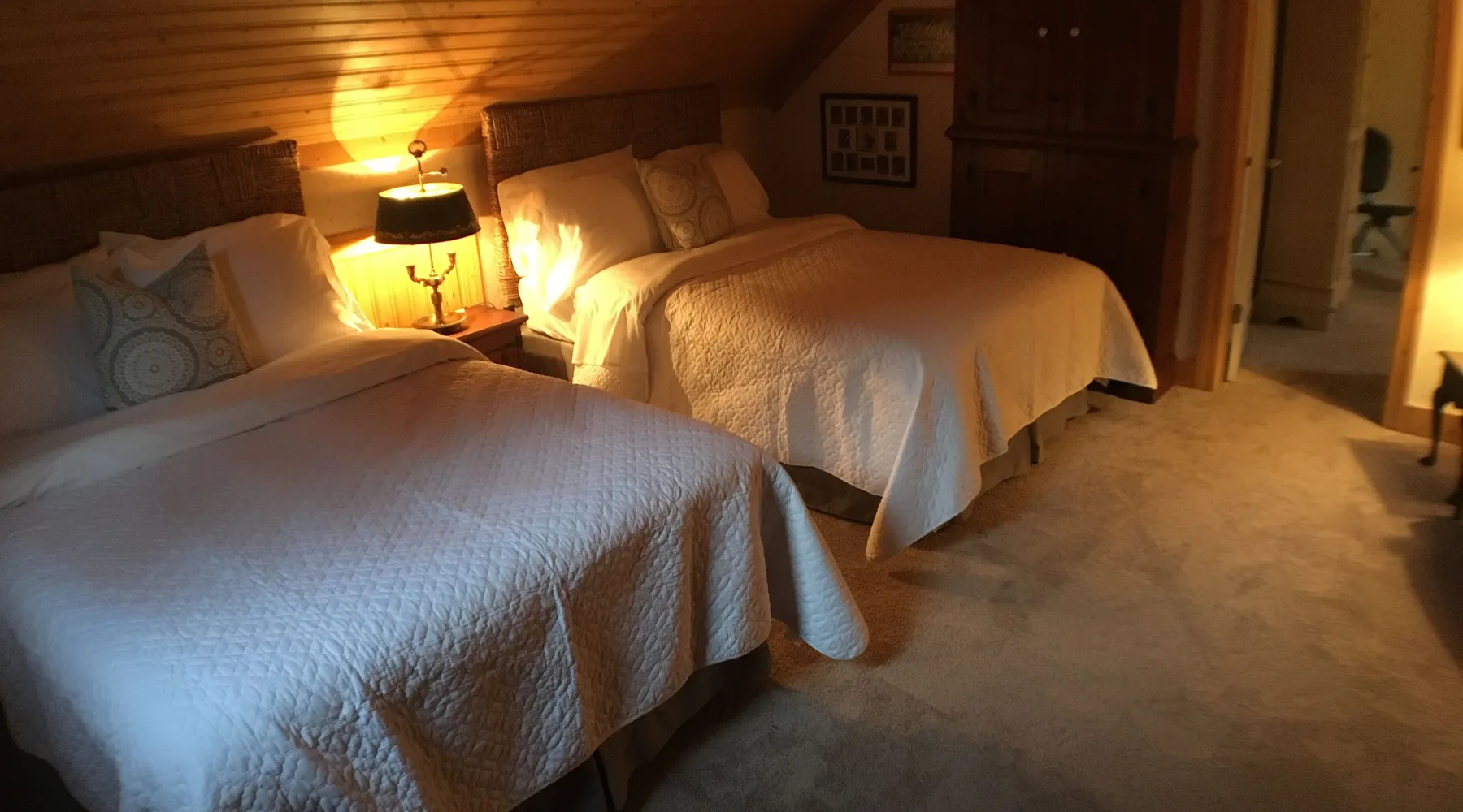 You will love staying in our Country Manor House. With it's beautiful furnishings and artwork you will find yourself completely at home here. Whether you grab a book to read in front of the fireplace or take a little stroll in the surrounding woods, we're sure you won't find a more peaceful place to spend your time. The house has been updated for bed sizes. Downstairs is a king size bed in the bedroom and a queen size sleeper at the back of the dining area. Upstairs is a bedroom with a king a bedroom with a queen a bedroom with 2 full size beds and a small bedroom with a pair of bunk beds (You have to walk through the bunk bed room to get to the 2 double bed room) that are pretty comfy actually. So that makes 5 bedrooms and a Luxury sleeper downstairs. The Front Room of the Manor House is where everyone gathers for morning coffee, or evening drinks around the fireplace. It just couldn't be any more comfortable. This is a quiet residential neighborhood so please respect the neighbors privacy.