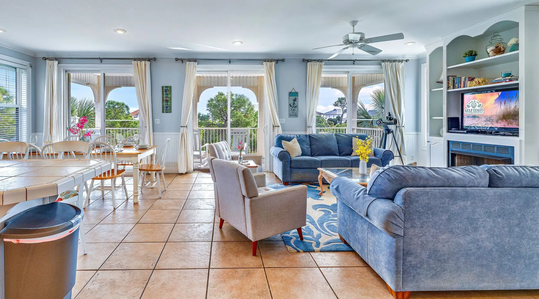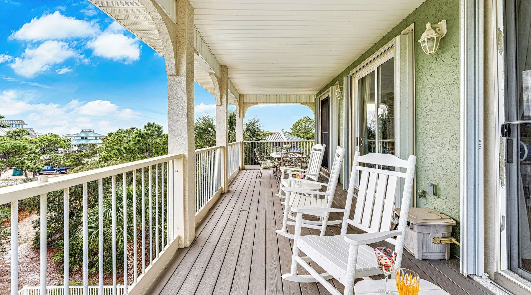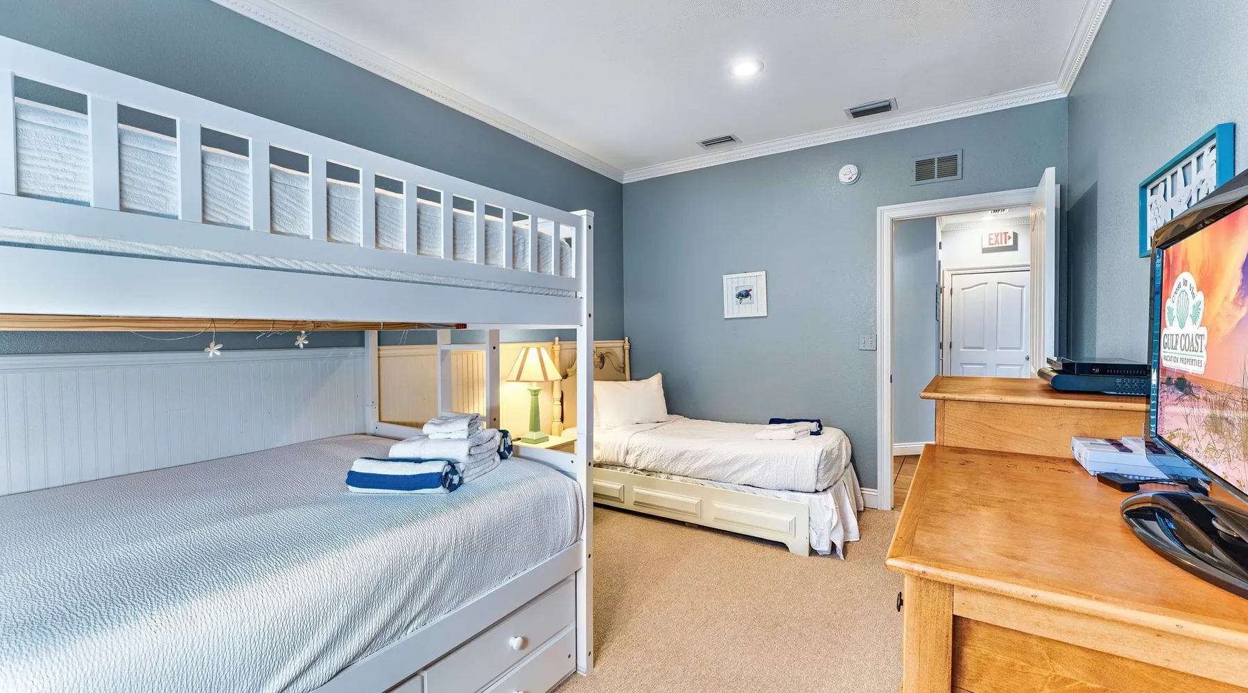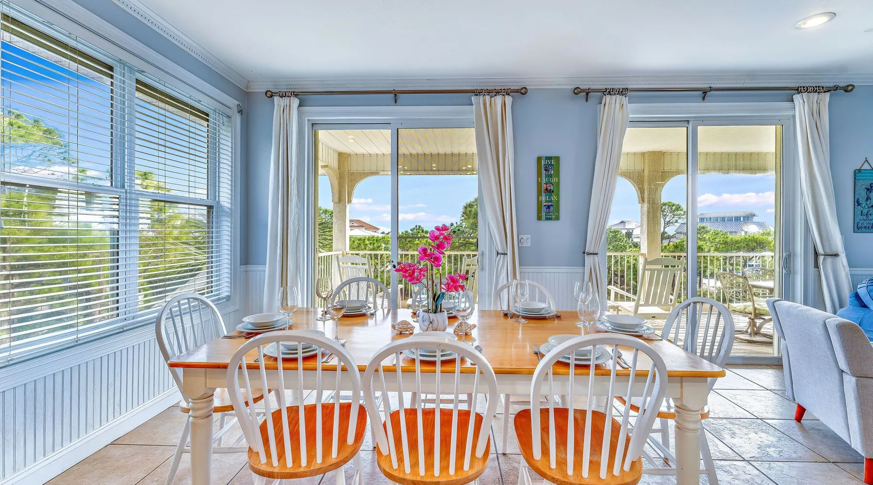 This charming beach vacation home in the exclusive St. George Plantation community features a private swimming pool, spacious decks to take in coastal views and Island breezes, comfortable beachy décor and community amenities including beach boardwalks, multi-use paths, nature trails, access to Bob Sikes Cut, fitness center, 2 Olympic sized swimming pools and tennis and pickleball courts! Just a short walk to our award-winning white sugar sands beaches, this property sleeps 12, so bring the whole family! Although secluded in a gated community, Top 'Sea Turvy Turtle is just minutes by car to local restaurants, nightlife, St. George Lighthouse Museum and playground, fishing pier and State Park. Apalachicola's shops, restaurants and arts scene are just 30 minutes by car, so this property delivers an amazing, secluded location with the best of the Forgotten Coast within easy reach! The exterior of this vacation home features plenty of private parking, a beautiful private swimming pool with lounge chairs, community path to the beach and enclosed outdoor shower. The fish cleaning station and gas grill are perfect for preparing that Fresh from Florida seafood feast. A short set of stairs leads to the covered deck overlooking the driveway. Entering Top 'Sea Turvy Turtle, the tiled foyer greets you. The laundry room with full sized washer and dryer is on the first floor, as well as access to a large deck overlooking the gated, sparkling pool. Stairs take you to the second level's sleeping accommodations. The beautiful large king master bedroom with flat screen TV features private deck access, full bathroom featuring a jetted tub and separate shower stall. A bedroom with a queen bed, flat screen TV and private deck access and bunk room with a twin/full bunk bed, separate single bed and flat screen TV share a full bathroom in the hallway. The third floor of Top 'Sea Turvy Turtle provides lots of open space for your crew to gather in the comfortable living/dining/kitchen area. The living area with smart TV provides indoor entertainment options and the large deck off this living area offers outdoor spaces to enjoy coastal views and Island breezes. The fully stocked kitchen has lots of counter space and stainless appliances and the kitchen counter with 4 stools provides a great spot for visiting with the chef in your crew while the dining table comfortably seats 8, providing plenty of room for everyone at mealtime. The queen master bedroom on this floor has a full bath and direct access to a private deck. An additional half bath off the living area on the third floor offers additional guest convenience. Bed Sizes: 1 King, 2 Queen, 1 Bunk bed (Single/Double), 1 Twin SPECIAL AMENITIES AND PROPERTY RULES Sorry, fireplace is not available for guest use. Golf carts are not allowed with vacation rentals in St. George Plantation. Your beach vacation rental through Gulf Coast Vacation Properties includes a$250 beach gear credit that can be applied to beach chairs, umbrellas, bicycles, paddleboards, kayaks, beach wagons and more! 2026 Monthly Rates (before taxes): January (Jan 3-Jan 30) - $5985 February (Jan 31-Feb 27) - $5985 March (Feb 28-March 27) - $6995 September (Sept 5-Oct 2) - $6995 October (Oct 3-Oct 30) - $6995 November (Oct 31-Nov 28) - $6995 December (Dec 5-Jan 1) - $5985