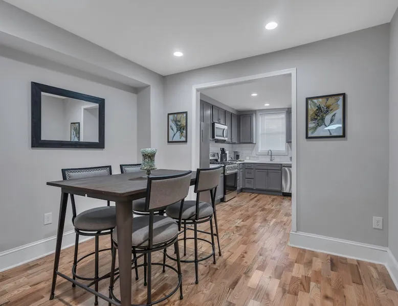 Are you a traveling medical professional looking for a place to call home while you work at Johns Hopkins Hospital? Look no further! Our open concept fully furnished town home is tastefully decorated and include all the amenities you need to live in comfort and feel at home! Enjoy modern amenities in a convenient location, close to Johns Hopkins East Baltimore Campus and all the attractions Baltimore has to offer. Book today and make your next work trip a breeze! The space One of our newest homes! This beautiful, fully furnished townhome offers the perfect blend of modern convenience and classic Baltimore charm. Boasting a modern floor plan with hardwood floors, the main floor features a gourmet kitchen with stainless steel gas appliances, granite countertops, and a dining room table that seats four. For added convenience, the main level also features a powder room so your guests will never have to go upstairs. Step outside to the fenced patio and enjoy the outdoors. As you walk upstairs, you will find two spacious bedrooms and two full bathrooms. Each bedroom also includes a queen bed, dresser, closet, floating nightstand, Samsung Smart TV, blinds, and black out curtains. The upper level also features a full-size washer and dryer, making laundry a breeze. The unfinished lower level offers extra storage space but can also be used as an office, workout room, or whatever else you can imagine. You can rest assured that this space is only accessed through inside of the home, giving you extra security and peace of mind. Our homes are designed with your security in mind. Feel at ease with security front and rear doors, as well as a Ring Alarm security system and Ring doorbell. With this state-of-the-art security system, you can rest assured that your home and belongings are safe and secure. Enjoy a cool and comfortable stay with our central heating and cooling system and stay connected with high-speed Wi-Fi available throughout the home. We also want to make sure you don't have to worry about a thing when you arrive, so we've included starter toiletries and cleaning supplies for your convenience. We also welcome pets, so your furry friends can stay with you. Whether you're looking for a place to call home for a short time or a long time, this home has it all. Book today and make your next work trip a breeze! Guest access The entire home is exclusively yours, without interruption for the duration of your stay, so relax, unwind, and make yourself at home! Other things to note Perfect for travel nurses, residents, or medical/nursing students! The monthly rate includes a generous $350 utility allowance, which covers gas/electric, water, and WiFi. In our experience, most guests stay well within this amount. If your usage exceeds the allowance, we’ll provide copies of the bills and submit a payment request through Airbnb for the difference. Guests with pets: there is an additional $150 pet cleaning fee. We’ll send the payment request link on the day of your check-in.