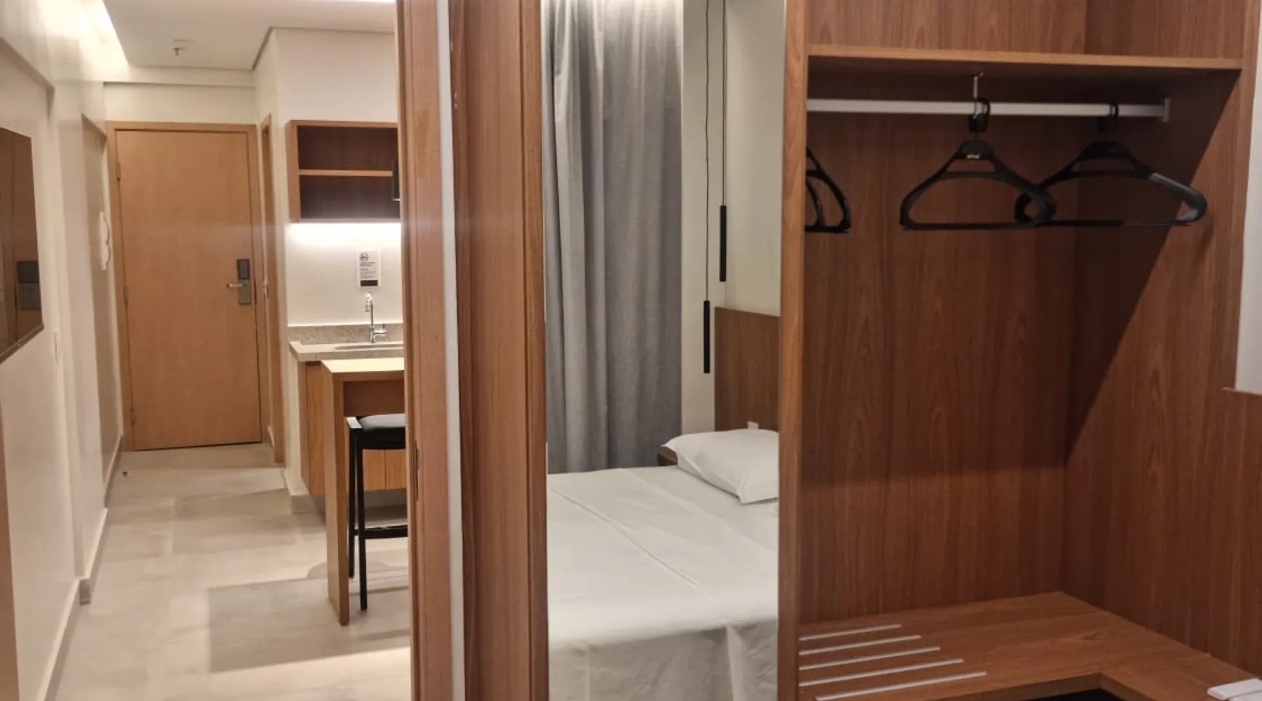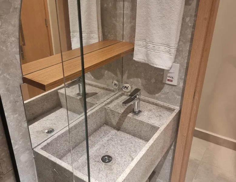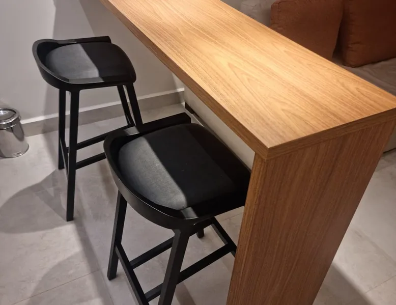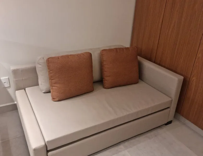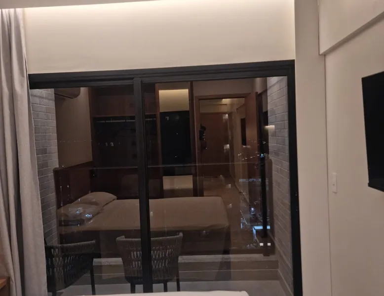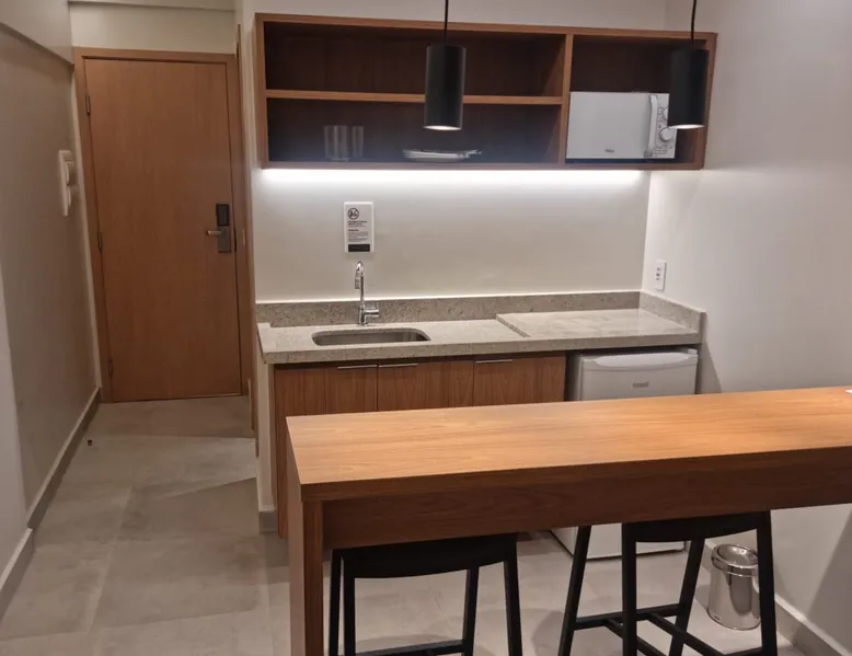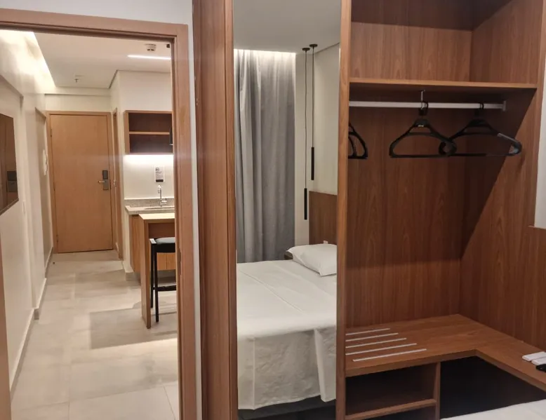 Apartment of 30m². Integrated American kitchen and living room. Living room with sofa bed, 40”smart TV and air-conditioning. Kitchen with counter and stools, microwave, minibar and basic utensils. Room with a double bed, 40”Smart TV, air-conditioning and balcony. Apartment has 01 bathroom, amenities and complete linen. Free wifi in the apartment and social areas. Maximum capacity of 4 adults.