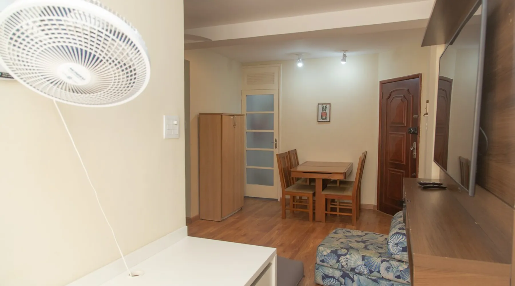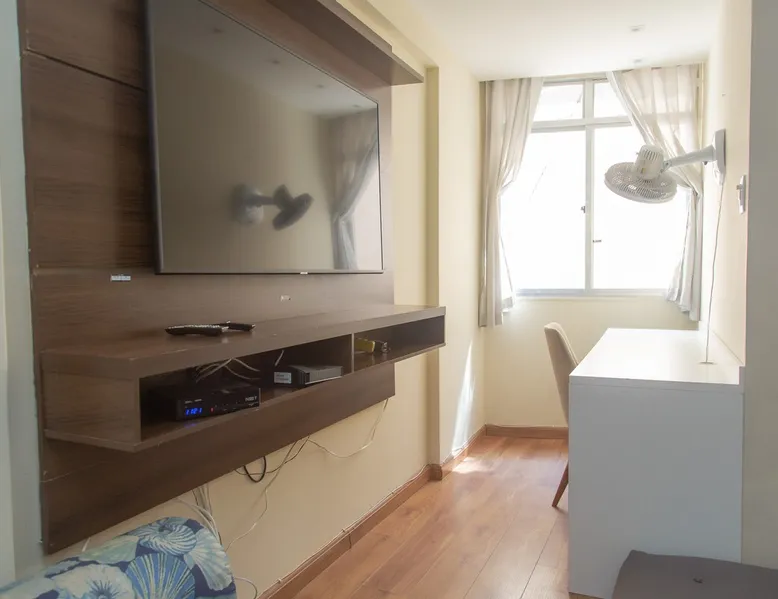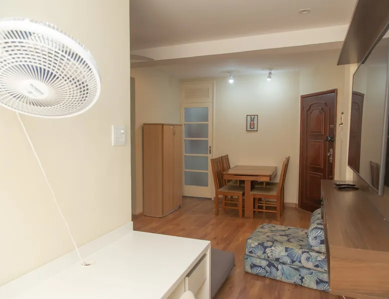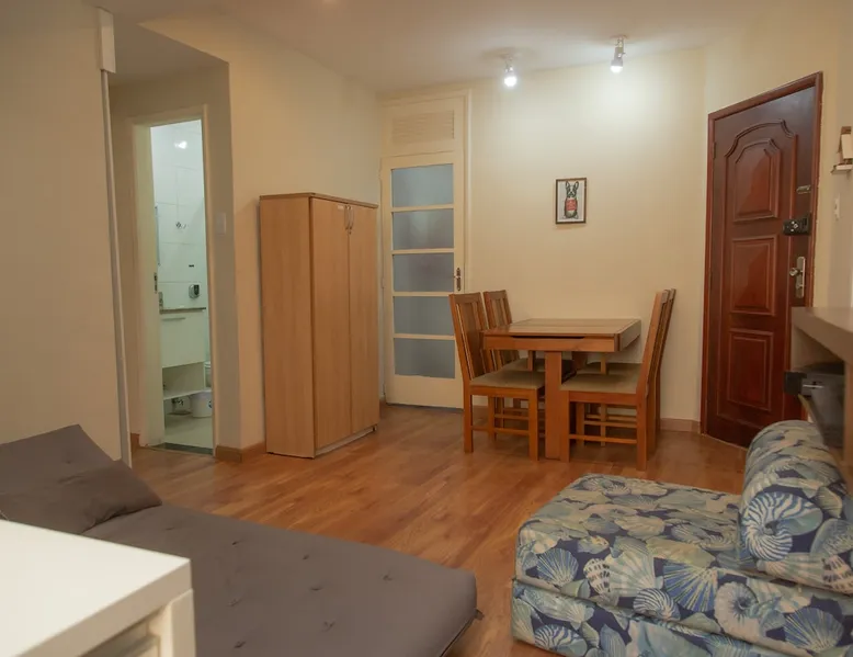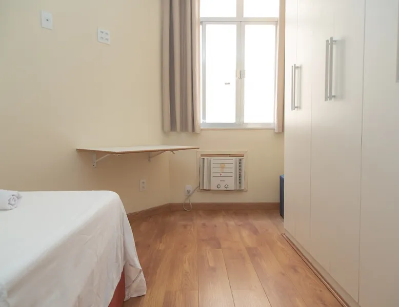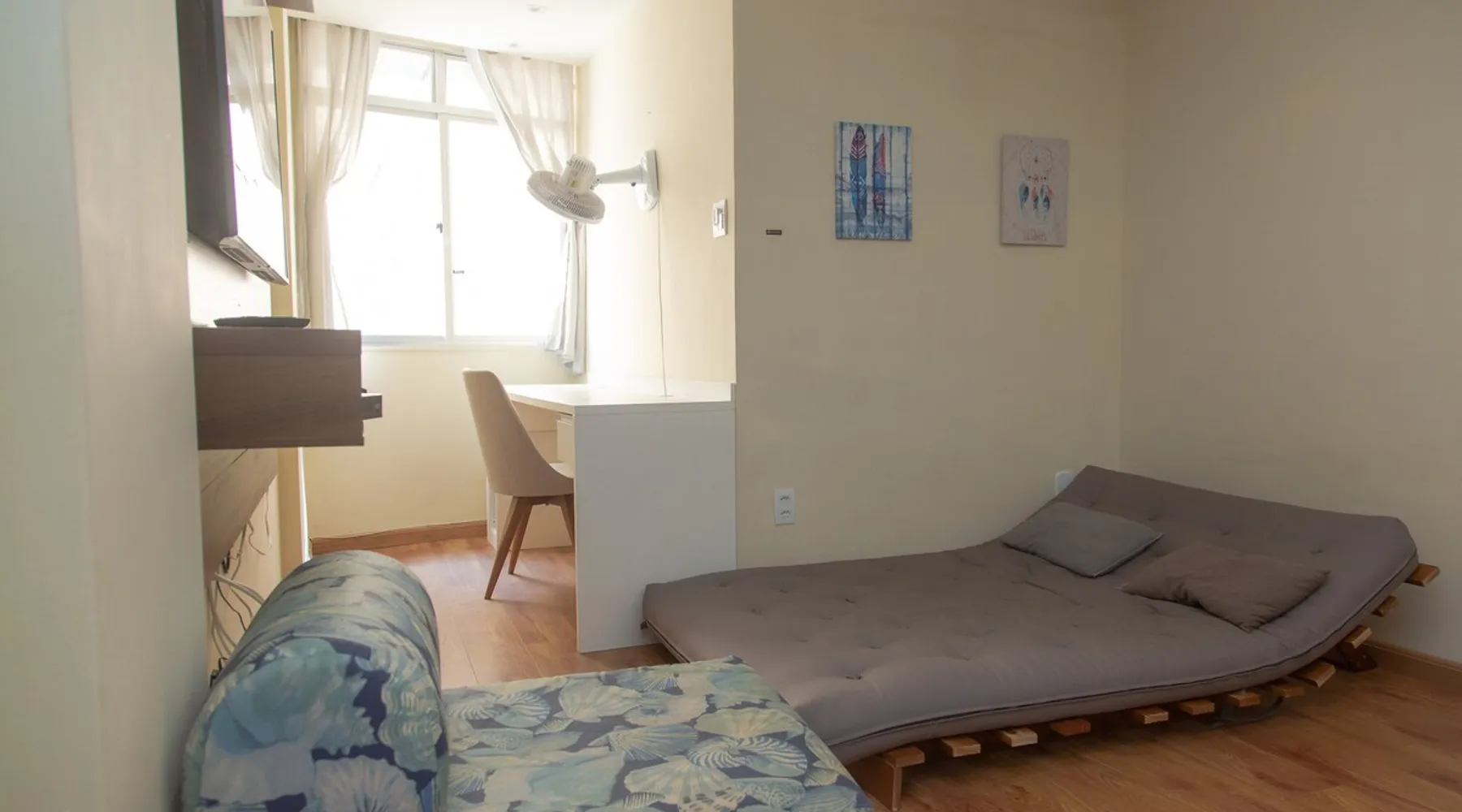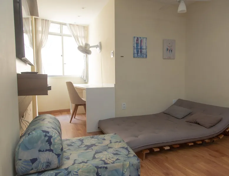 Feel the maximum comfort in this peaceful and centrally-located place. Perfect for work or play. Leme is a quiet and family-friendly neighborhood in the South Zone of Rio de Janeiro, with many shopping and dining options. Just 1 minute from Leme Beach (post 1). Next to the famous Copacabana. Easy access to Rio's main tourist landmarks. Welcome! The space The space features: - Fast Wi-Fi - Cable TV Electro-electronics: - Refrigerator - Microwave - Electric oven - Dishwasher - Washing machine - Stove - Cold water filter - Electric kettle - Iron - Hair dryer For long stays and home office: - Office desks - Cabinets Sleeps up to 5 guests: - Double bed - Full sofa bed - Single sofa bed Comfort: - Gas shower - Hot and cold water throughout the property - Air-conditioning (only in the bedroom) Convenience: - Two beach chairs Guest access To access there is a 24-hour concierge, then the entrance to the apartment is with a security code on the electronic lock. Other things to note Early check-in/late check-out: 6-hour difference from check-in/check-out: Half a day's pay. More time: full day.