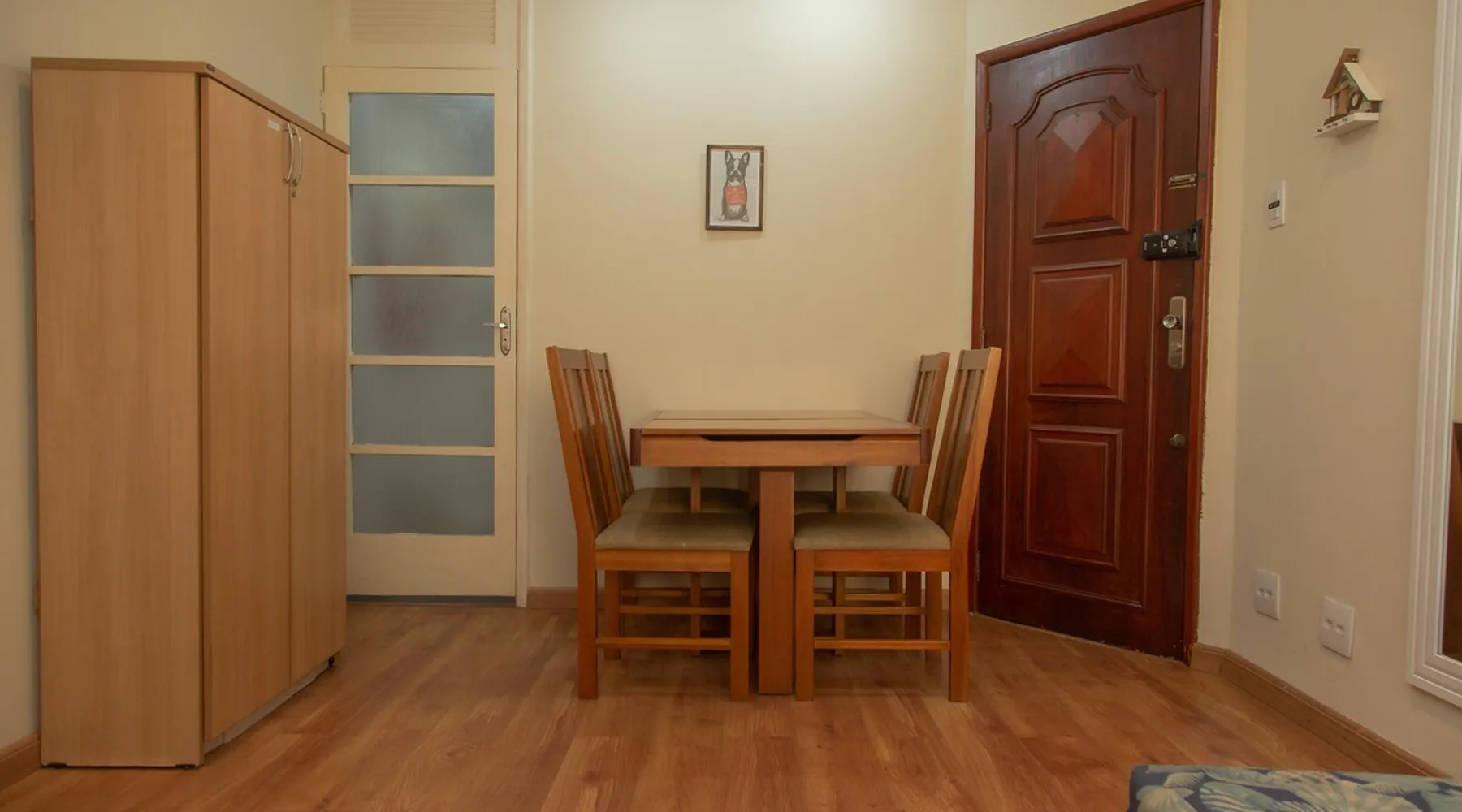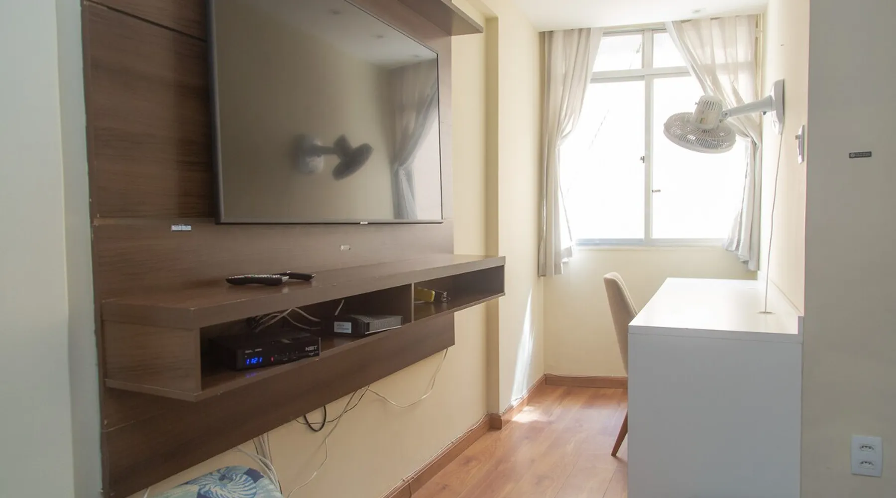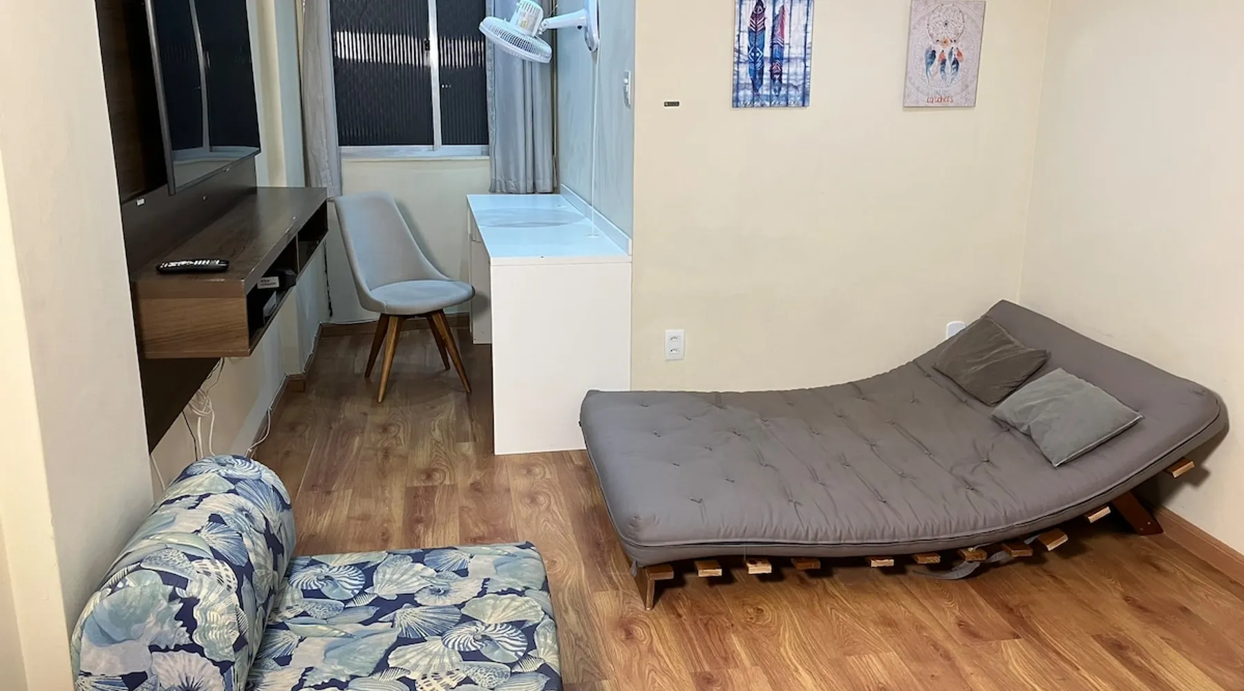 Feel the maximum comfort in this peaceful and centrally-located place. Perfect for work or play. Leme is a quiet and family-friendly neighborhood in the South Zone of Rio de Janeiro, with many shopping and dining options. Just 1 minute from Leme Beach (post 1). Next to the famous Copacabana. Easy access to Rio's main tourist landmarks. Welcome! The space The space features: - Fast Wi-Fi - Cable TV Electro-electronics: - Refrigerator - Microwave - Electric oven - Dishwasher - Washing machine - Stove - Cold water filter - Electric kettle - Iron - Hair dryer For long stays and home office: - Office desks - Cabinets Sleeps up to 5 guests: - Double bed - Full sofa bed - Single sofa bed Comfort: - Gas shower - Hot and cold water throughout the property - Air-conditioning (only in the bedroom) Convenience: - Two beach chairs Guest access To access there is a 24-hour concierge, then the entrance to the apartment is with a security code on the electronic lock. Other things to note Early check-in/late check-out: 6-hour difference from check-in/check-out: Half a day's pay. More time: full day.