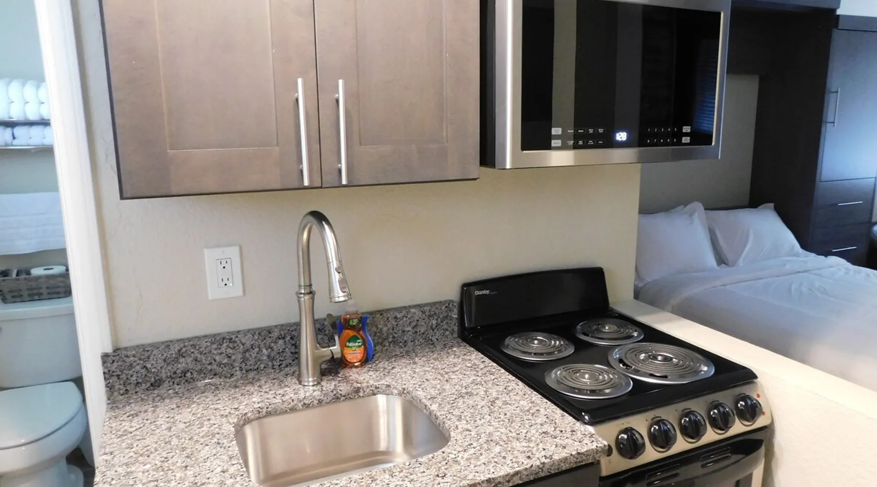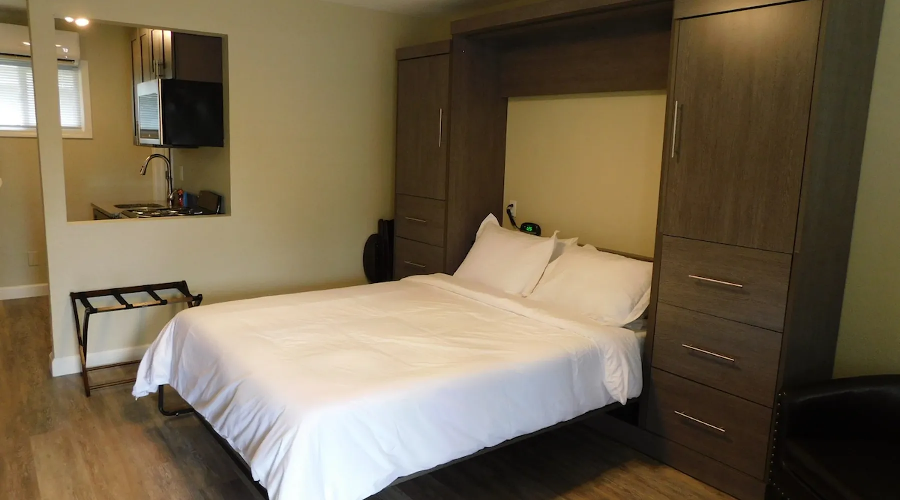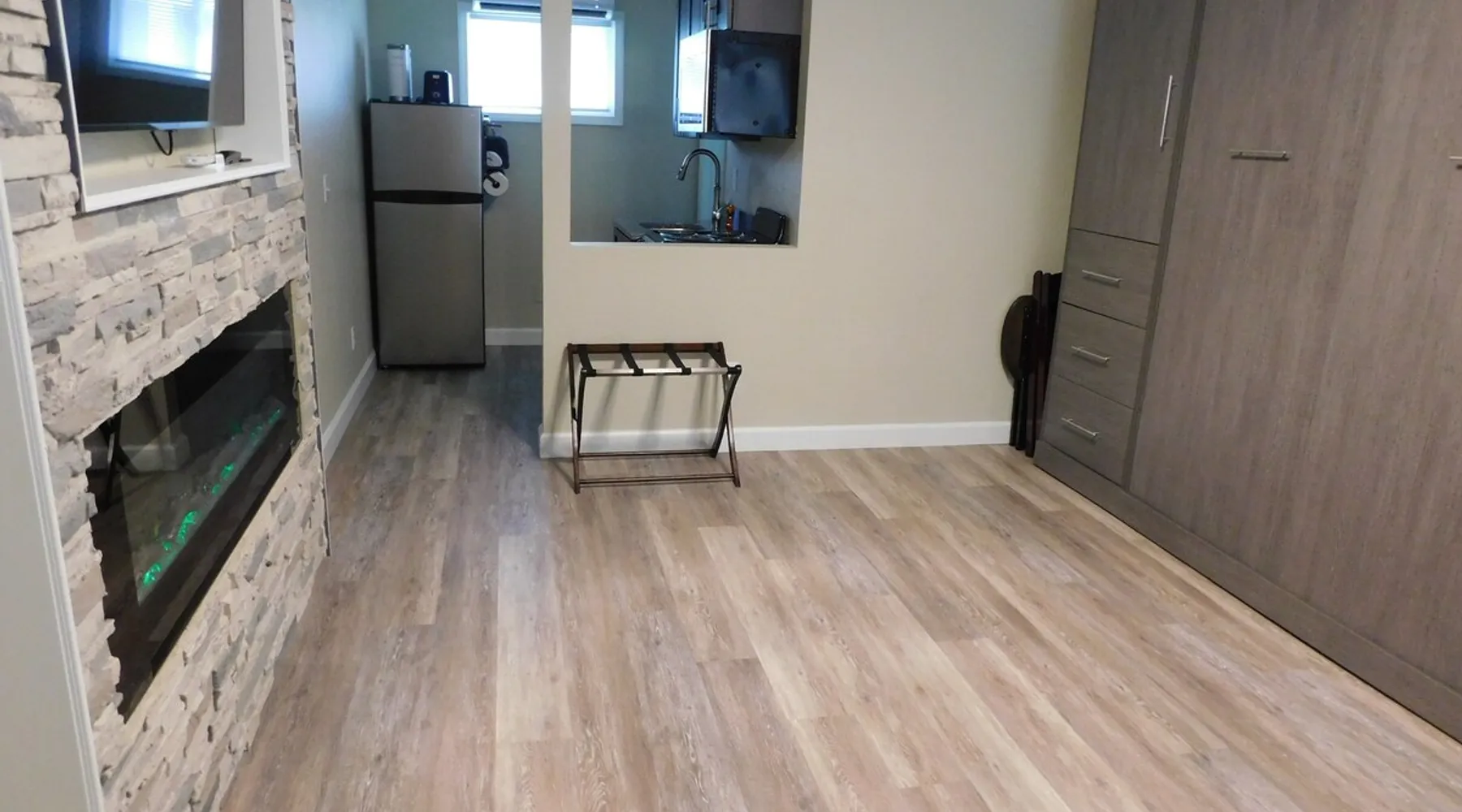 Renovated micro unit among short and long-term rentals in prime East Lansing location within a mile of MSU and two doors down from Whole Foods and in close proximity to restaurants, bars, shopping, and the Meridian Mall. Easy access to MSU sporting events, Wharton Center performances, rodeo and agricultural events, horticulture gardens, and museums including the Eli & Edythe Broad Art Museum. Furthermore, Downtown Lansing and the State Capitol is less than six miles away. The space While small, this unit is newly renovated and offers everything necessary to have a great short or long-term stay in East Lansing. The living area features a queen Murphy bed with a Tuft & Needle mattress and plush linens and four pillows for a full night’s rest. The bed easily lifts into a hidden position if you desire more room to work or do yoga. There is a closet on each side of the bed with dresser drawers, shelves, and hanging rod. There are two club chairs, an adjustable table with locking rollers, a luggage rack, 55 inch LG Smart TV, electric fireplace with 10 flame colors (operated with or without heat), sound machine, and an alarm clock with two USB ports. There are two sturdy padded folding chairs and two TV trays next to the closet if needed. The kitchen features a 20 inch oven/range with four cooktop burners, above range microwave, new cabinets, granite counter-top with undermount stainless steel sink and Kohler gooseneck pulldown faucet, and an 11 cubic foot refrigerator with a separate freezer. The kitchen is stocked with pots/pans, dinnerware and silverware, cooking utensils, wine glasses, can/bottle/wine bottle openers, vacuum wine bottle stopper, and all the basics necessary to make your stay comfortable. Also, there is a toaster and Keurig Coffee Maker (limited coffee K-pods and tea bags provided). The bathroom has a walk-in shower with glass doors and is stocked with plush towels. The vanity cabinet includes a hairdryer for your convenience. Toothpaste, disposable toothbrushes, and soaps/lotions are also provided. Guest access You will have access to open covered parking a few feet from the entry door. There is a six foot covered sidewalk to allow for dry unloading in case of rain or snow. There is a common laundry room for your convenience shared by other tenants at the north end of the building with coin-operated machines. Quarters, laundry basket, detergent, and fabric softeners, will be provided upon request. The unit has direct access via a secure Schlage Encode smart lock system utilizing a personalized 4 digit access code. A key storage box is also provided next to the entry door in case of a Wi-Fi outage. It doesn't get any easier than that!!!