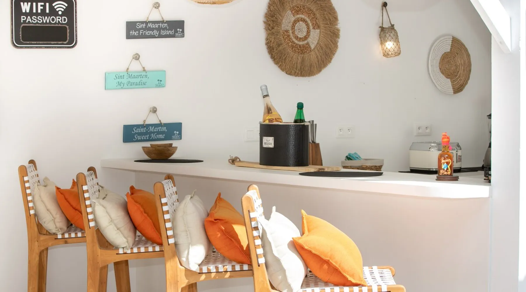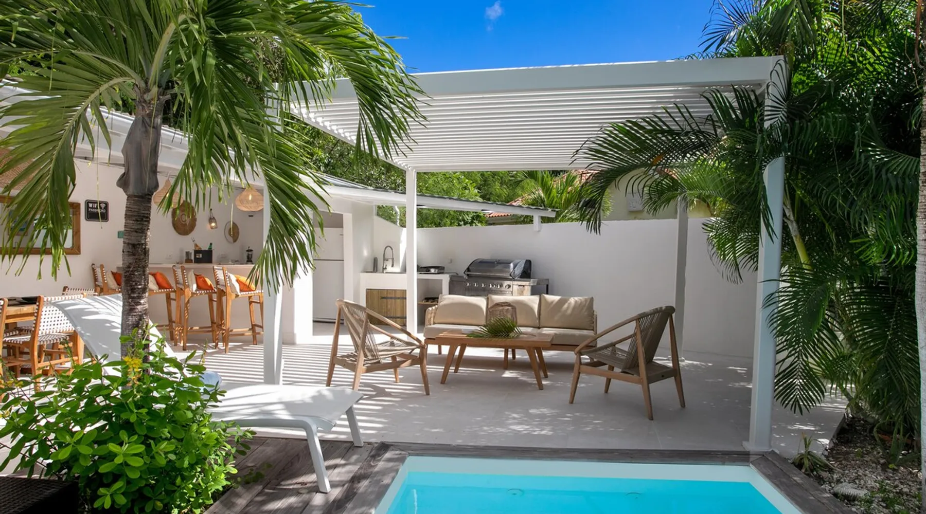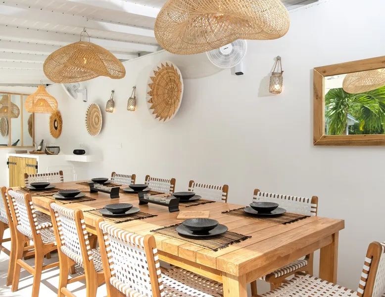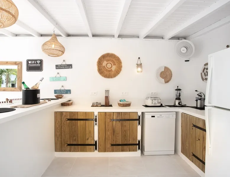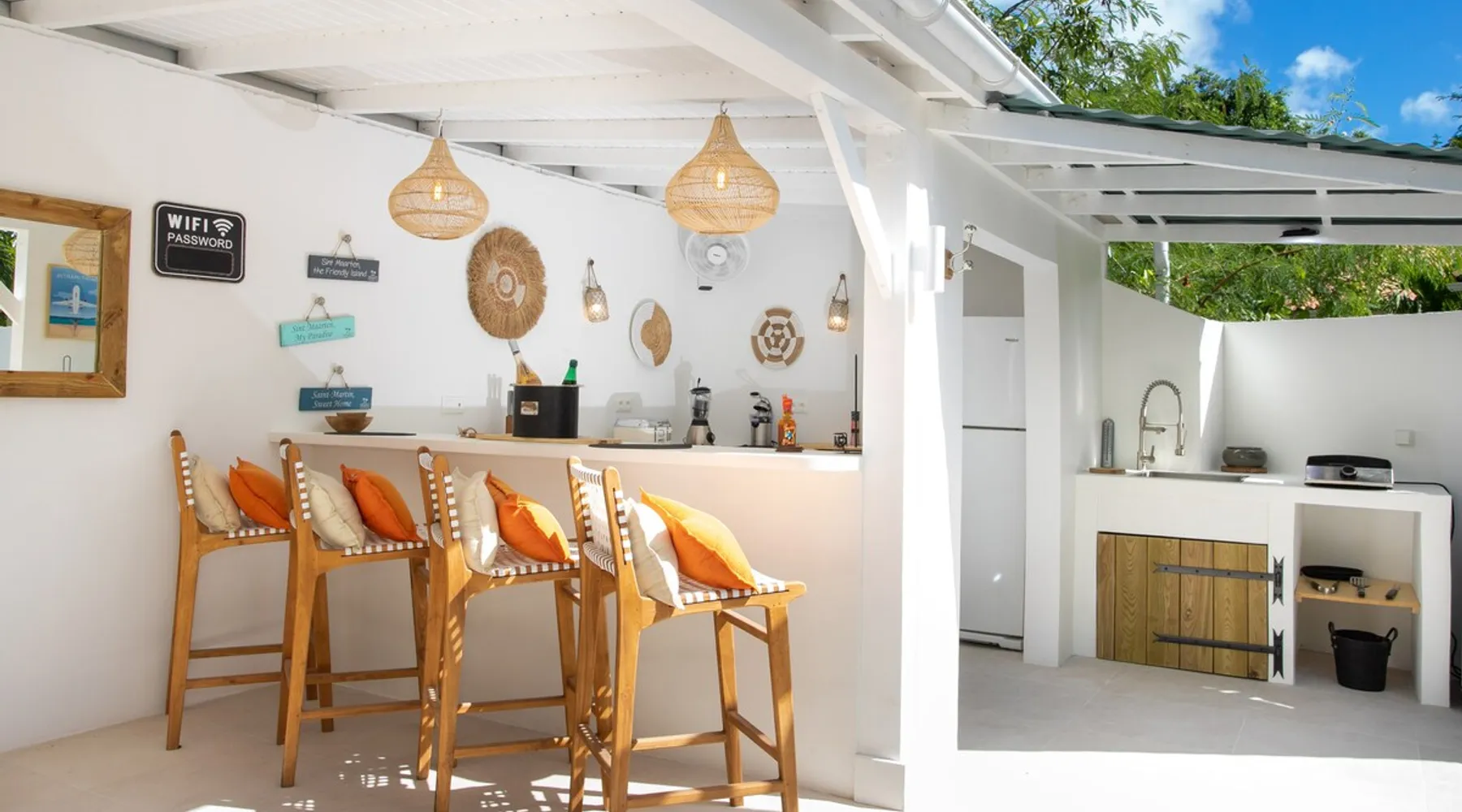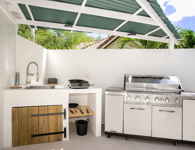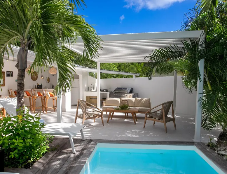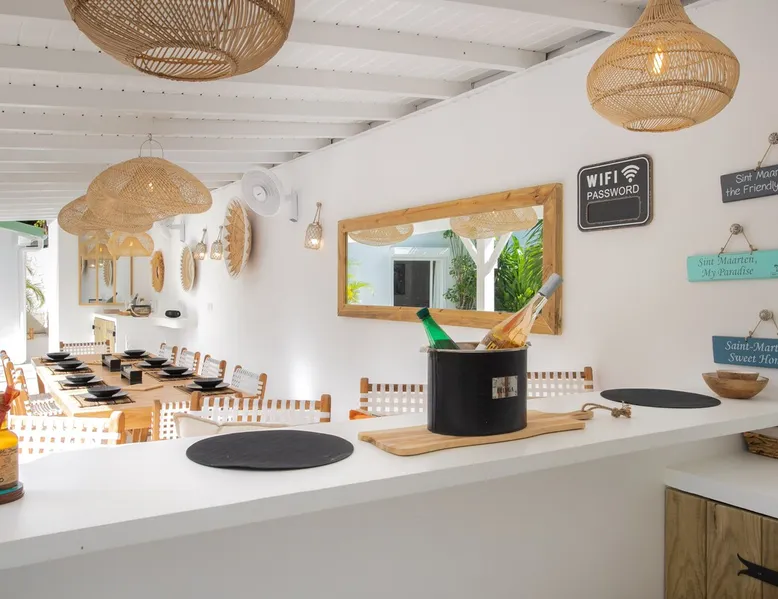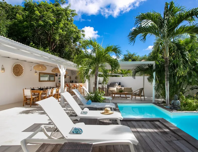Welcome to paradise. Only 4 minutes from the famous Orient beach and equipped with all the essentials, this place will deliver that peaceful serenity you have been seeking. Spend the day around the pool and BBQ, or keep inside the house fully air conditioned… it’s up to you !. Followed by a night at the Orient Bay Village and restaurants , or relaxing on the beach with a delicious cocktail regarding the Caribbean sea. Whether you’re planning for a tropical vacation or looking for a longer stay.. The space Make this year-round sanctuary your next destination in St Martin ! The space This beautiful 4 bedroom, 4 bathroom, included one outside shower, comfortably sleeps up to 8 guests (all are queen sized beds, and one could be 2 double singles beds for kids) and is fully supplied with all the basic essentials to make you feel right at home. The bright and open living room contains two comfortable couches and a mounted 85” Smart TV with Netflix and international cable full access. The illuminating inside kitchen features an island with additional seating, and all the equipment needed to prepare, cook and eat your meals! Enjoy them in the dining room (table seats 8), at the breakfast bar, or on the outside patio. A coffee lover's dream station is found in the kitchen and set up with a coffee maker, and Nespresso for your use. The outside kitchen Patio is a cozy set up for a year round vacation with chairs and side tables under the covered area. Step out of the patio and into the spacious backyard where you will conveniently find a bar and BBQ, Fridge and dishwasher for you to prep your fresh dinner after a day out on the beach side. A washer and dryer is available for use in the pool house Master bedroom features a Queen size bed, 56” Smart TV with Chromecast, installed shelving in the open closet, and a beautifully attached bathroom with a walk-in shower. Second and Third bedroom has a queen bed, workspace, and a standard closet, with a smart TV connected the fourth bedroom contains 2 singles beds, possibility to have a queen bed, a standard closet, natural sunlight and smart tv A starter set of toilet paper, paper towels, bath soap, shampoo and conditioner, dish soap, and trash bags is provided, and should be enough for 1-2 days. If you plan on staying for an extended period of time, additional items can be purchased from nearby stores. Guest access HOME ACCESS: - your Manager will be there to welcome you upon arrival - This entire single-family home is available for your enjoyment. PARKING: - Automatic gate give access to 2 parking lots - The garage is partially occupied. Other things to note SECURITY: - This Gated community have a full time closed gate, you will have a code to open it ! Guest access Then Entire house is only for you inside and outside