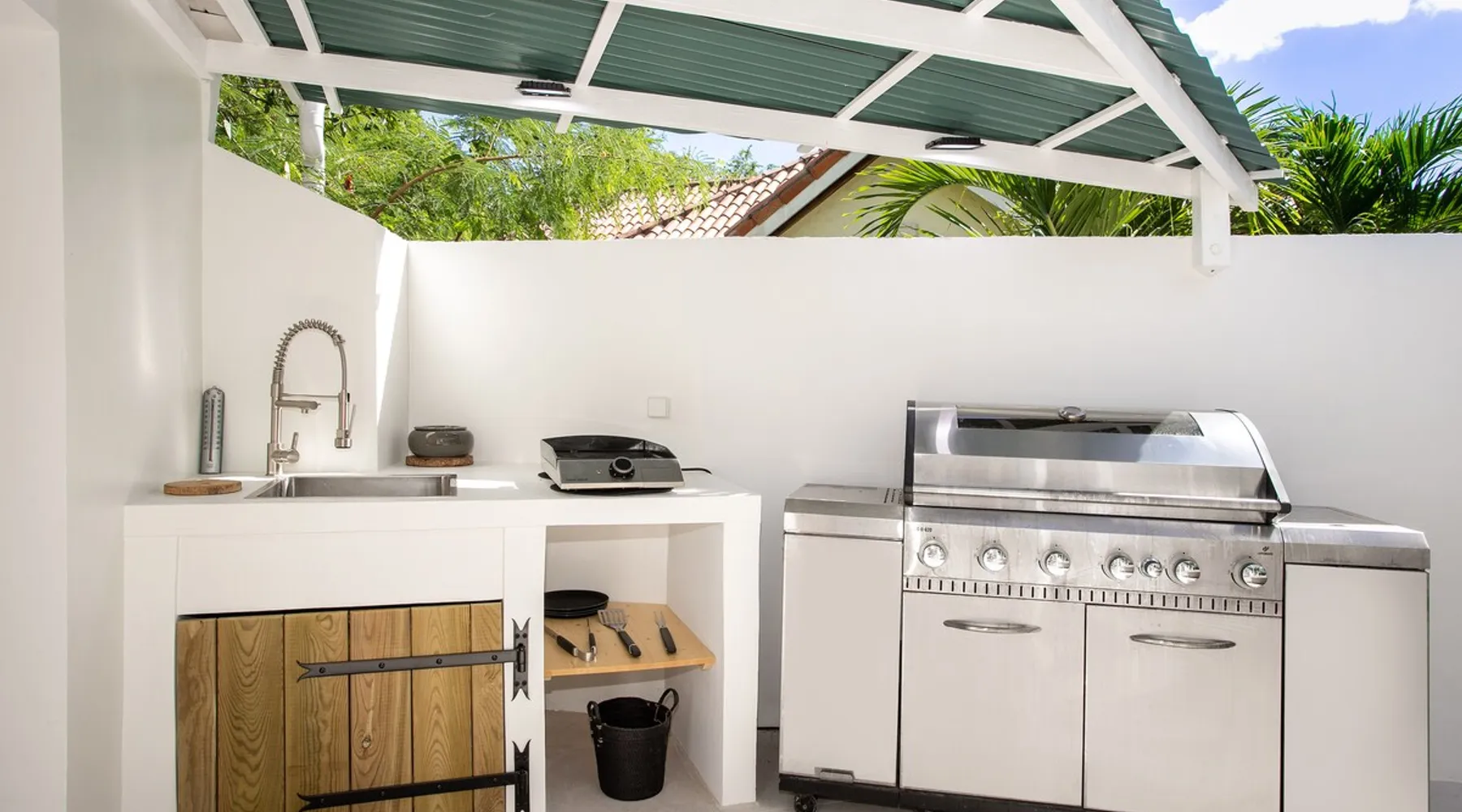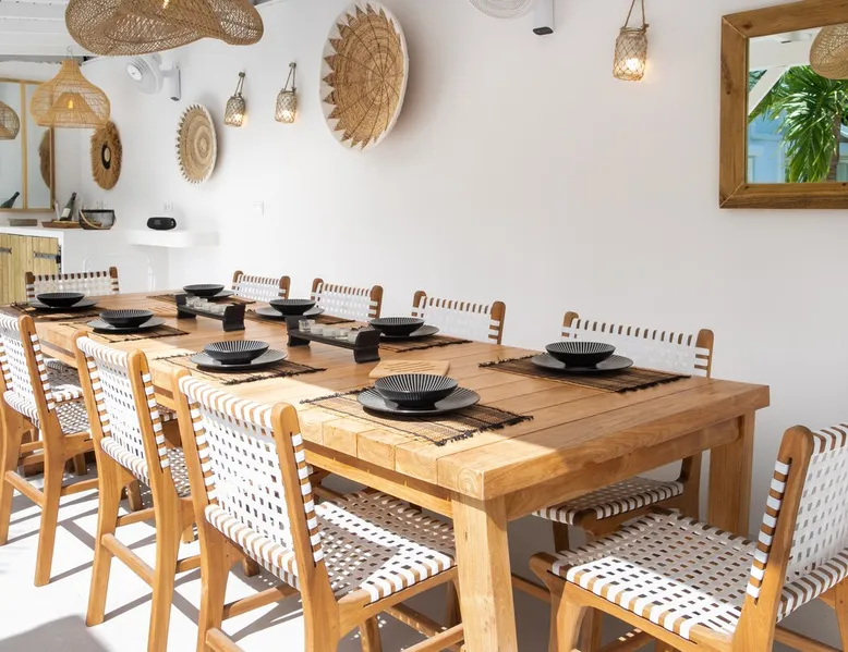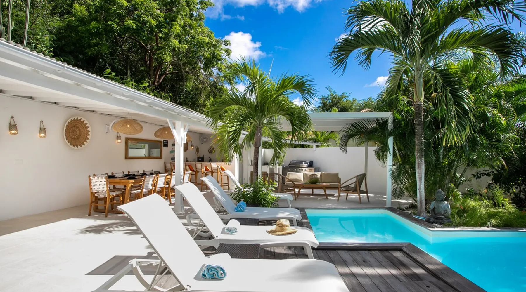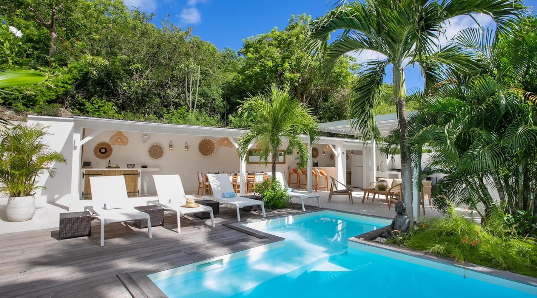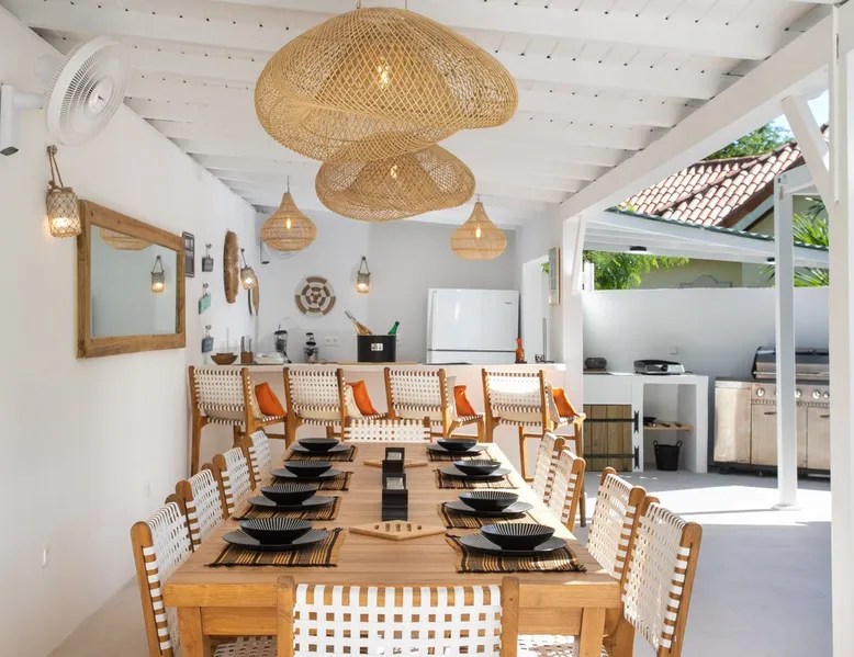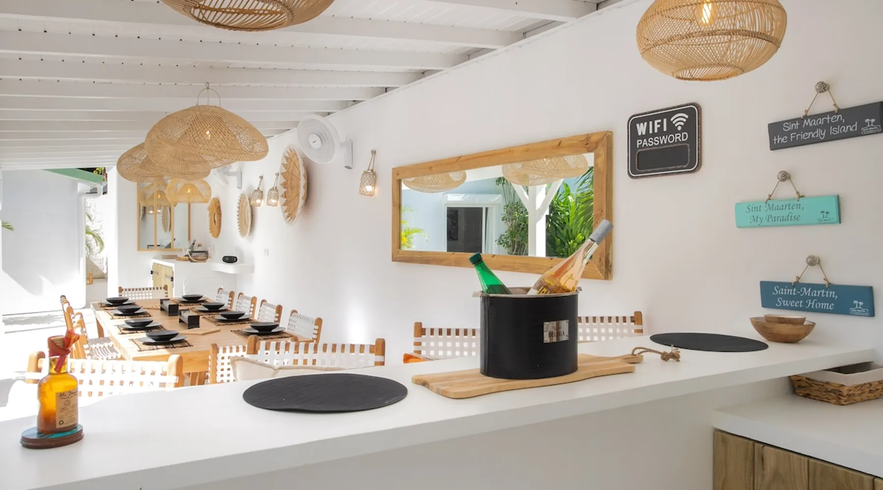 Welcome to paradise. Only 4 minutes from the famous Orient beach and equipped with all the essentials, this place will deliver that peaceful serenity you have been seeking. Spend the day around the pool and BBQ, or keep inside the house fully air conditioned… it’s up to you !. Followed by a night at the Orient Bay Village and restaurants , or relaxing on the beach with a delicious cocktail regarding the Caribbean sea. Whether you’re planning for a tropical vacation or looking for a longer stay.. The space Make this year-round sanctuary your next destination in St Martin ! The space This beautiful 4 bedroom, 4 bathroom, included one outside shower, comfortably sleeps up to 8 guests (all are queen sized beds, and one could be 2 double singles beds for kids) and is fully supplied with all the basic essentials to make you feel right at home. The bright and open living room contains two comfortable couches and a mounted 85” Smart TV with Netflix and international cable full access. The illuminating inside kitchen features an island with additional seating, and all the equipment needed to prepare, cook and eat your meals! Enjoy them in the dining room (table seats 8), at the breakfast bar, or on the outside patio. A coffee lover's dream station is found in the kitchen and set up with a coffee maker, and Nespresso for your use. The outside kitchen Patio is a cozy set up for a year round vacation with chairs and side tables under the covered area. Step out of the patio and into the spacious backyard where you will conveniently find a bar and BBQ, Fridge and dishwasher for you to prep your fresh dinner after a day out on the beach side. A washer and dryer is available for use in the pool house Master bedroom features a Queen size bed, 56” Smart TV with Chromecast, installed shelving in the open closet, and a beautifully attached bathroom with a walk-in shower. Second and Third bedroom has a queen bed, workspace, and a standard closet, with a smart TV connected the fourth bedroom contains 2 singles beds, possibility to have a queen bed, a standard closet, natural sunlight and smart tv A starter set of toilet paper, paper towels, bath soap, shampoo and conditioner, dish soap, and trash bags is provided, and should be enough for 1-2 days. If you plan on staying for an extended period of time, additional items can be purchased from nearby stores. Guest access HOME ACCESS: - your Manager will be there to welcome you upon arrival - This entire single-family home is available for your enjoyment. PARKING: - Automatic gate give access to 2 parking lots - The garage is partially occupied. Other things to note SECURITY: - This Gated community have a full time closed gate, you will have a code to open it ! Guest access Then Entire house is only for you inside and outside