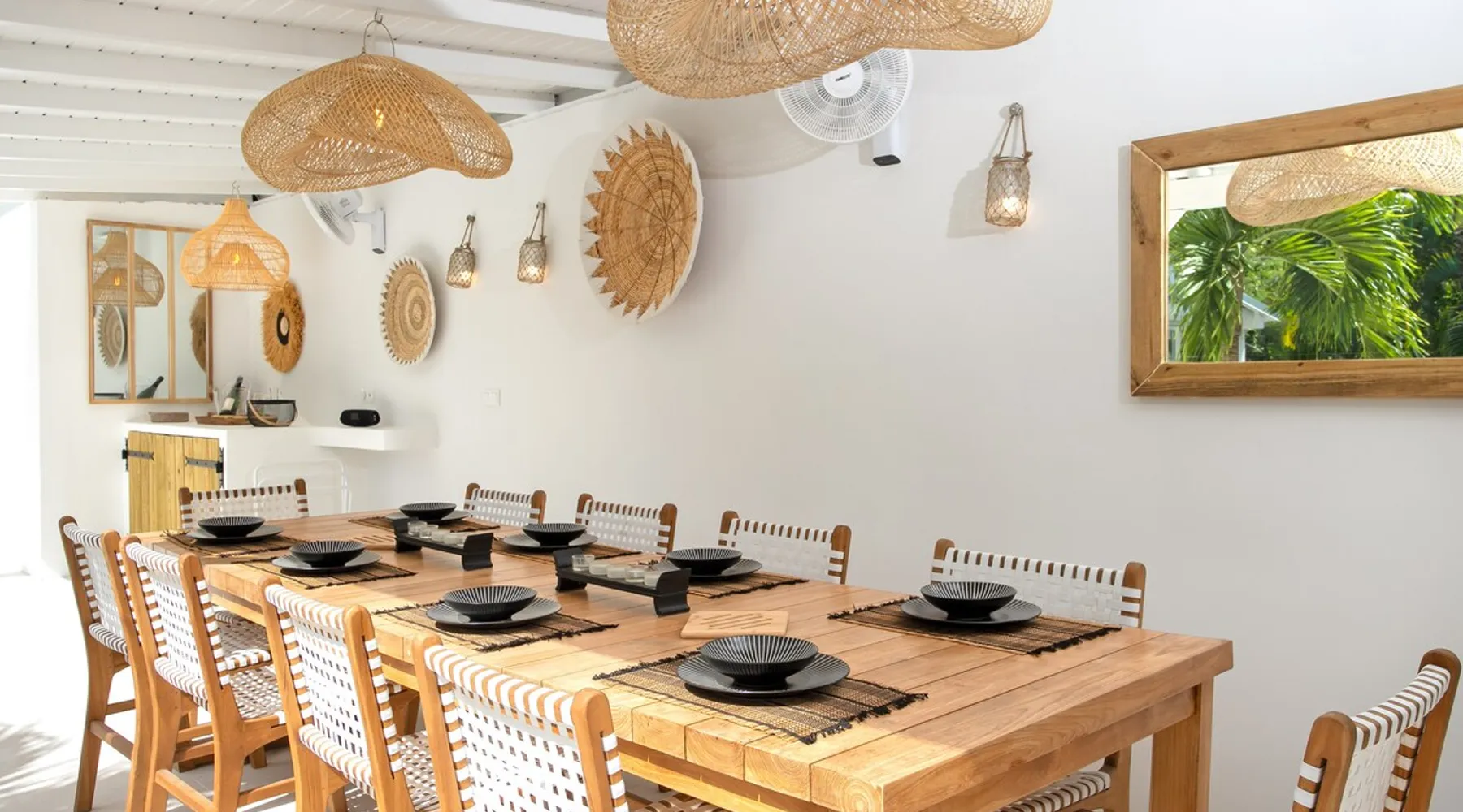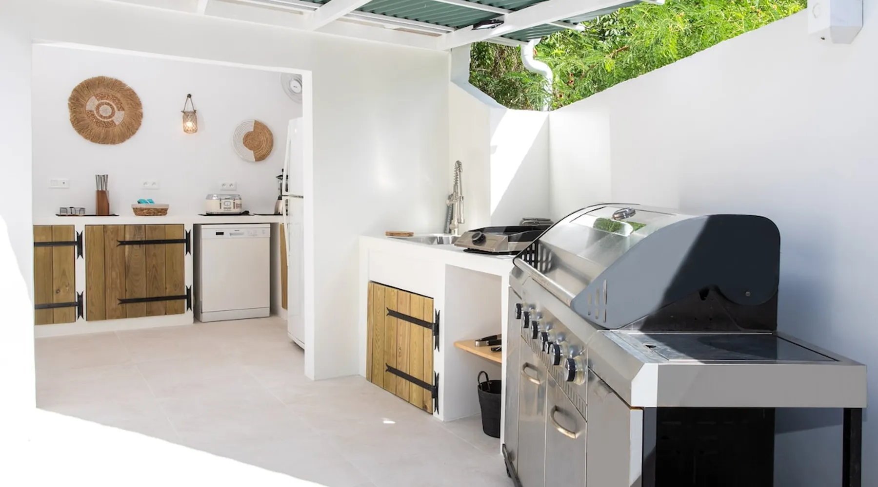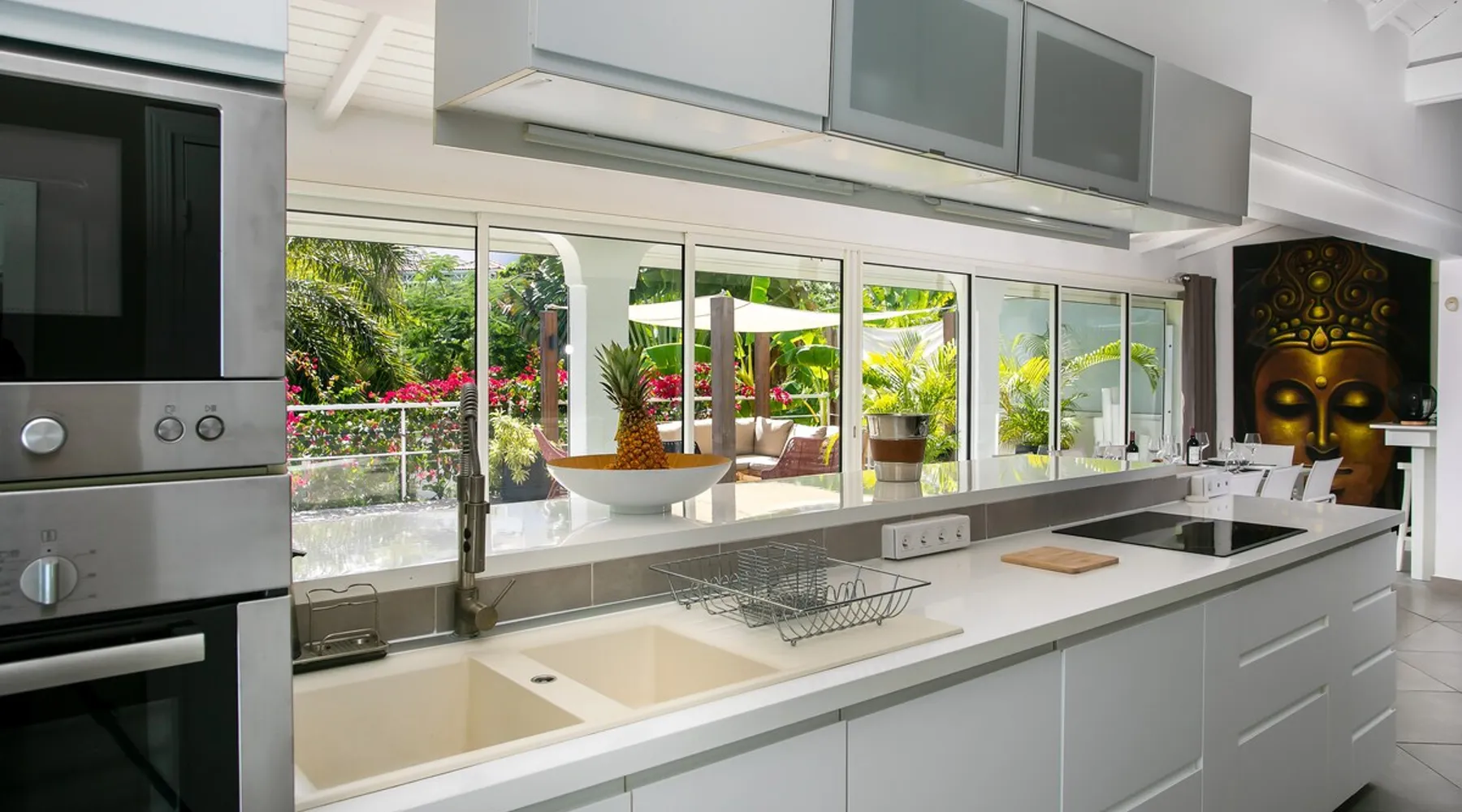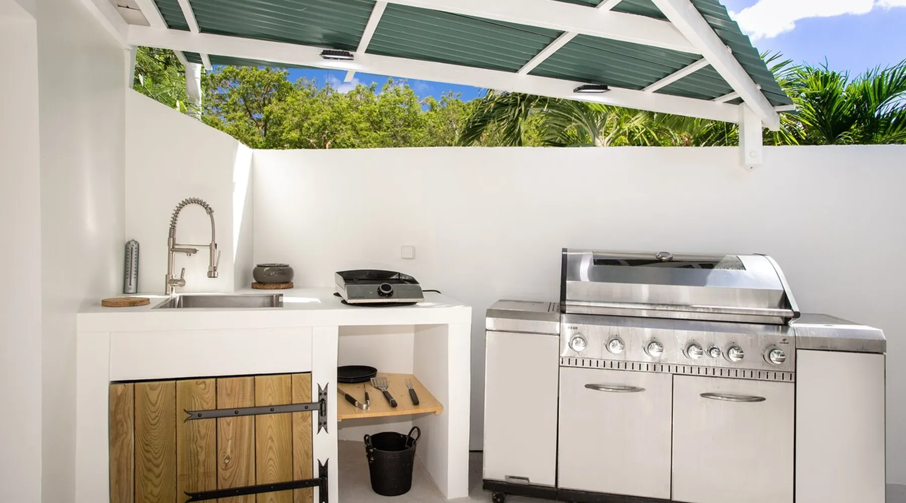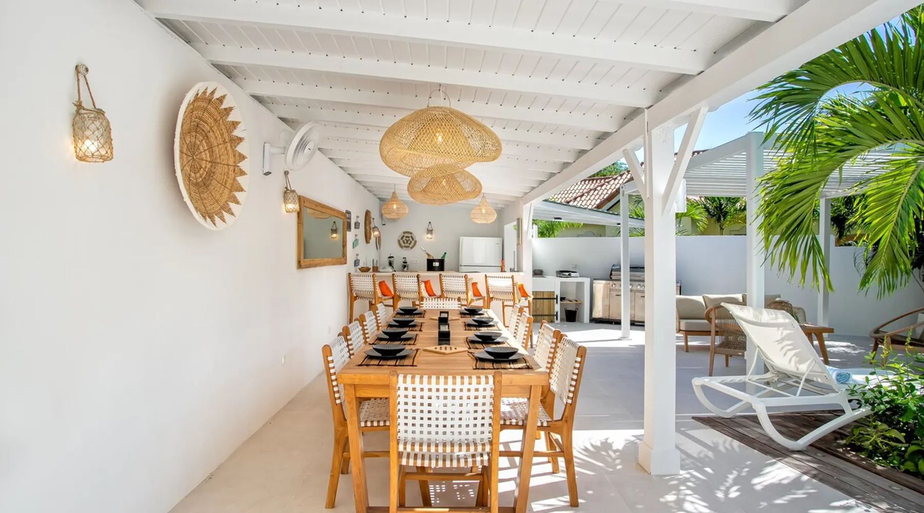 Welcome to paradise. Only 4 minutes from the famous Orient beach and equipped with all the essentials, this place will deliver that peaceful serenity you have been seeking. Spend the day around the pool and BBQ, or keep inside the house fully air conditioned… it’s up to you !. Followed by a night at the Orient Bay Village and restaurants , or relaxing on the beach with a delicious cocktail regarding the Caribbean sea. Whether you’re planning for a tropical vacation or looking for a longer stay.. The space Make this year-round sanctuary your next destination in St Martin ! The space This beautiful 4 bedroom, 4 bathroom, included one outside shower, comfortably sleeps up to 8 guests (all are queen sized beds, and one could be 2 double singles beds for kids) and is fully supplied with all the basic essentials to make you feel right at home. The bright and open living room contains two comfortable couches and a mounted 85” Smart TV with Netflix and international cable full access. The illuminating inside kitchen features an island with additional seating, and all the equipment needed to prepare, cook and eat your meals! Enjoy them in the dining room (table seats 8), at the breakfast bar, or on the outside patio. A coffee lover's dream station is found in the kitchen and set up with a coffee maker, and Nespresso for your use. The outside kitchen Patio is a cozy set up for a year round vacation with chairs and side tables under the covered area. Step out of the patio and into the spacious backyard where you will conveniently find a bar and BBQ, Fridge and dishwasher for you to prep your fresh dinner after a day out on the beach side. A washer and dryer is available for use in the pool house Master bedroom features a Queen size bed, 56” Smart TV with Chromecast, installed shelving in the open closet, and a beautifully attached bathroom with a walk-in shower. Second and Third bedroom has a queen bed, workspace, and a standard closet, with a smart TV connected the fourth bedroom contains 2 singles beds, possibility to have a queen bed, a standard closet, natural sunlight and smart tv A starter set of toilet paper, paper towels, bath soap, shampoo and conditioner, dish soap, and trash bags is provided, and should be enough for 1-2 days. If you plan on staying for an extended period of time, additional items can be purchased from nearby stores. Guest access HOME ACCESS: - your Manager will be there to welcome you upon arrival - This entire single-family home is available for your enjoyment. PARKING: - Automatic gate give access to 2 parking lots - The garage is partially occupied. Other things to note SECURITY: - This Gated community have a full time closed gate, you will have a code to open it ! Guest access Then Entire house is only for you inside and outside