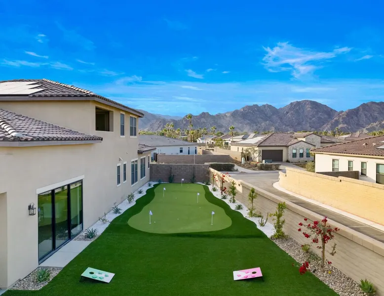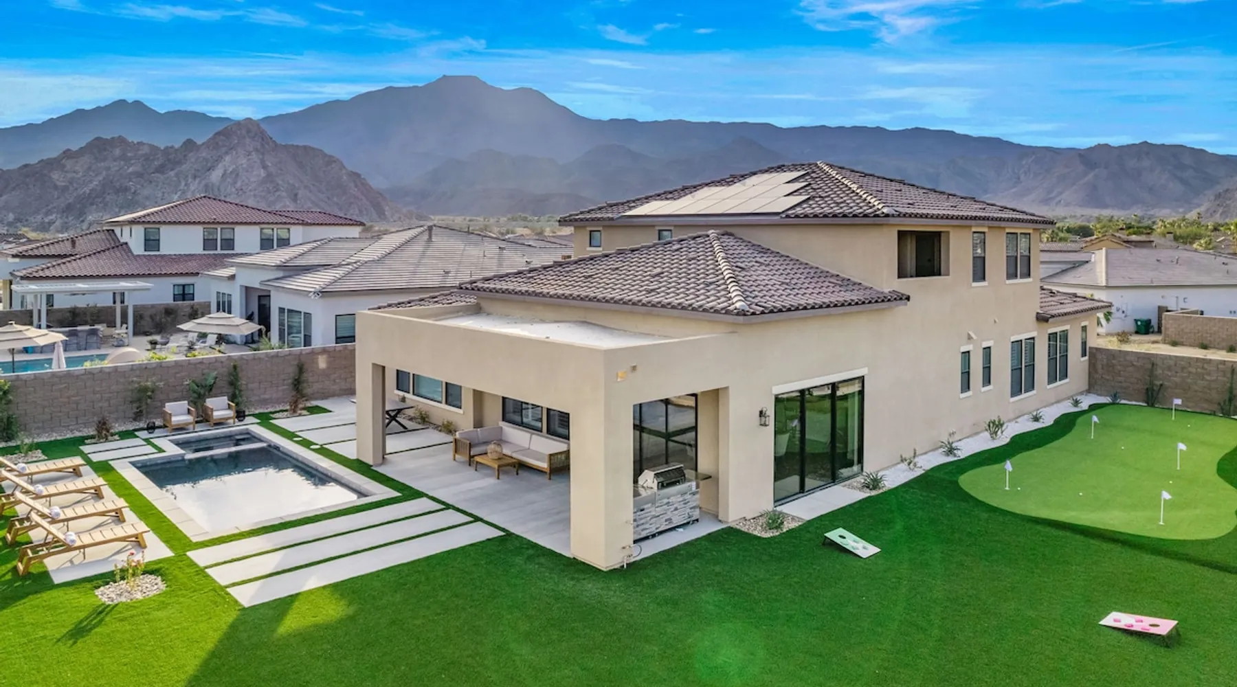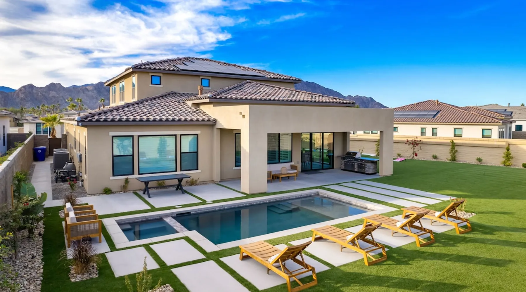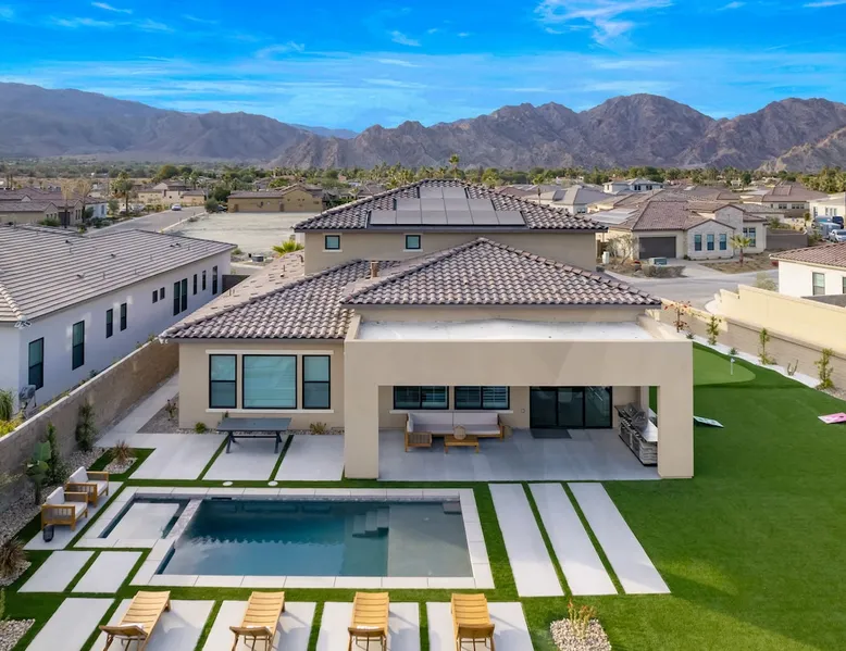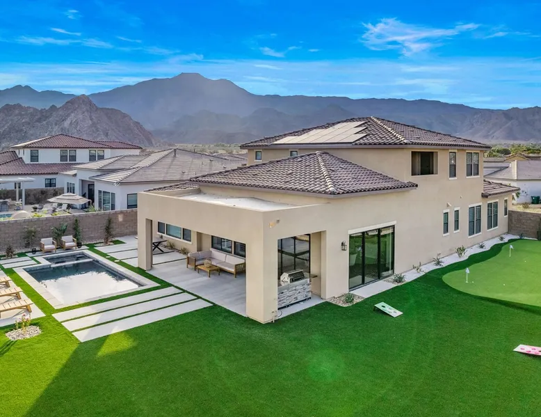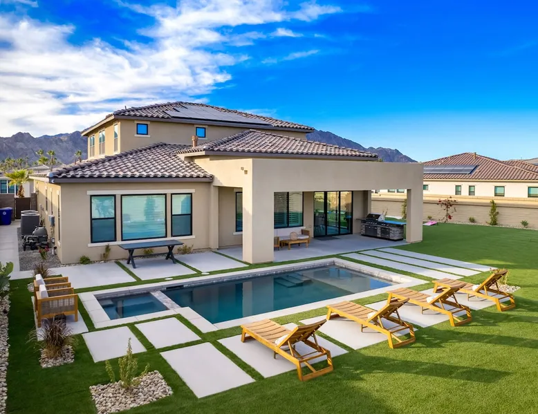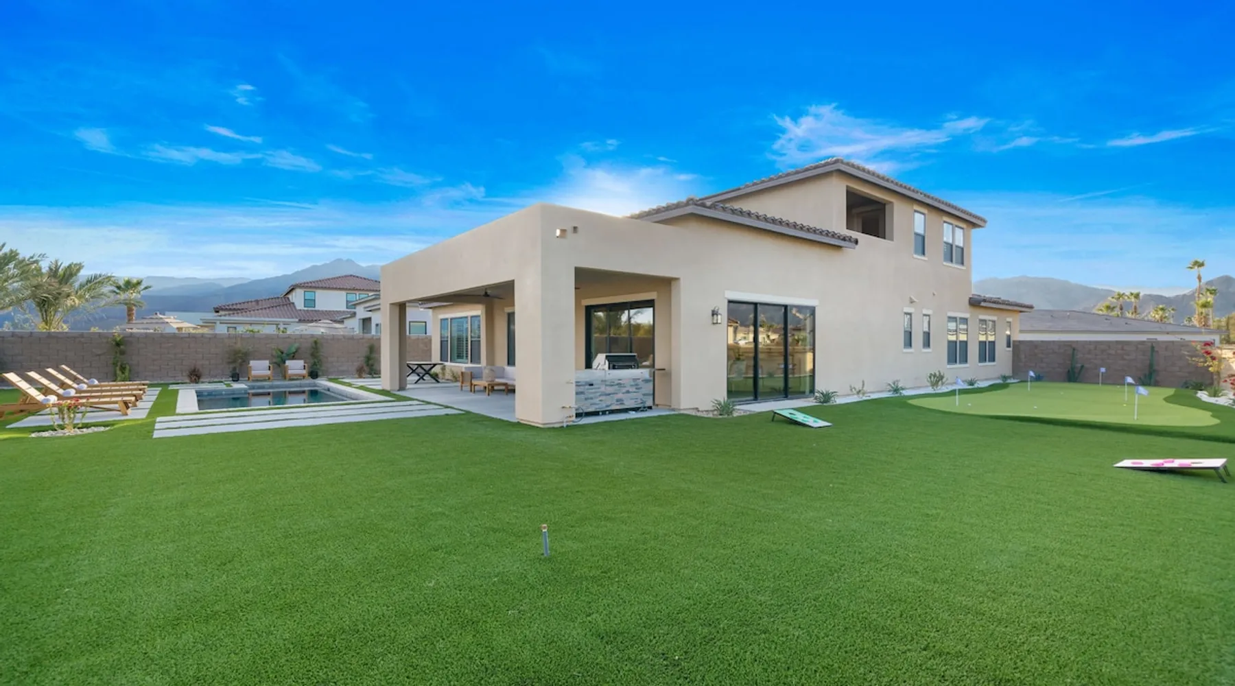 Experience luxury in this new gated Toll Bros. home in La Quinta. Featuring over 10-ft ceilings and large sliding doors, it opens to a resort-like backyard with a saltwater pool, spa, oversized putting green, games area, BBQ, & firepit. The main level includes a gourmet kitchen, master suite, 2 additional bedrooms, 2 bathrooms, and an office. Upstairs offers a spacious loft w/ air hockey, arcade games, covered patio with mountain views, plus 2 more bedrooms and bathroom. Perfect for 2 families ! Guest access Entire home