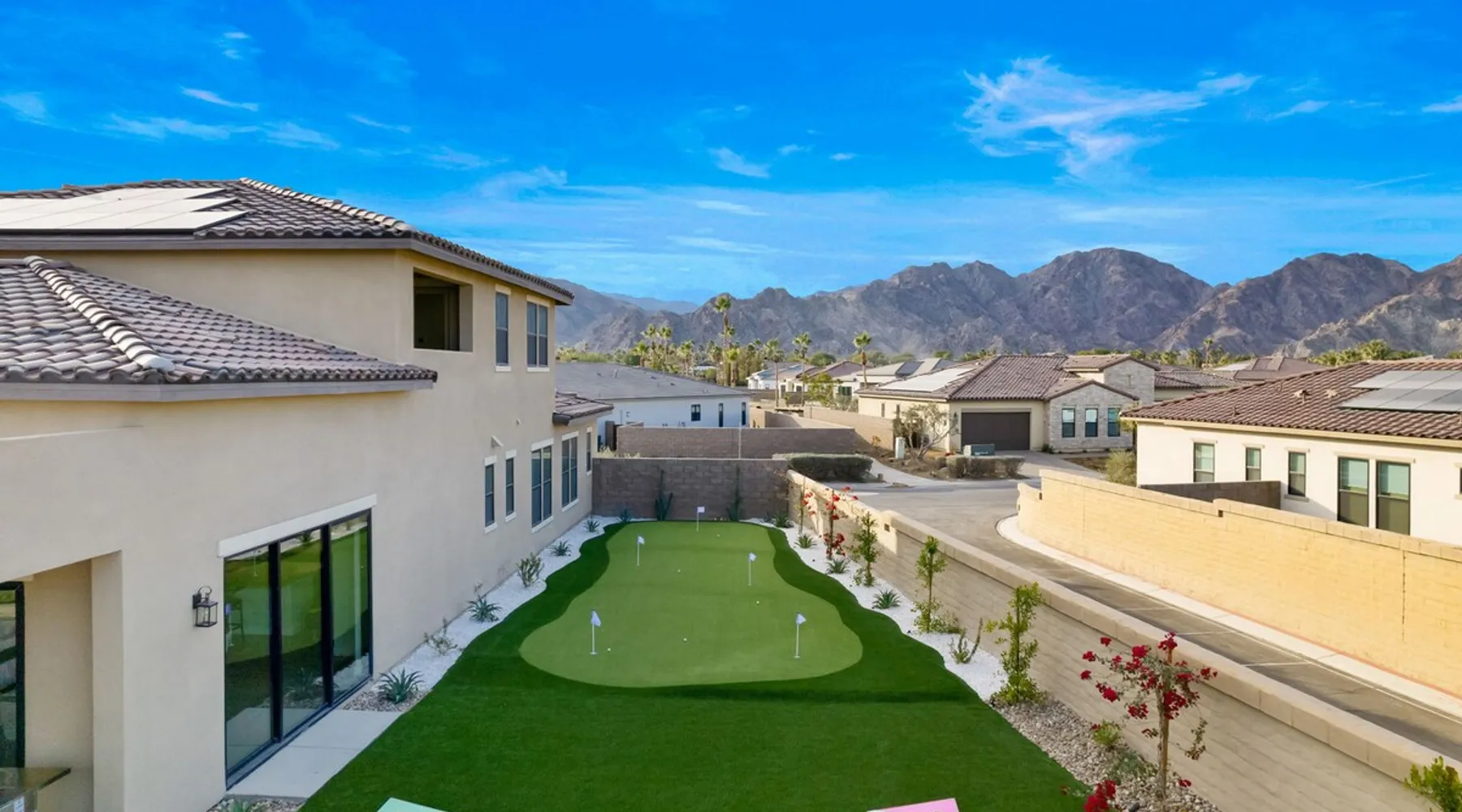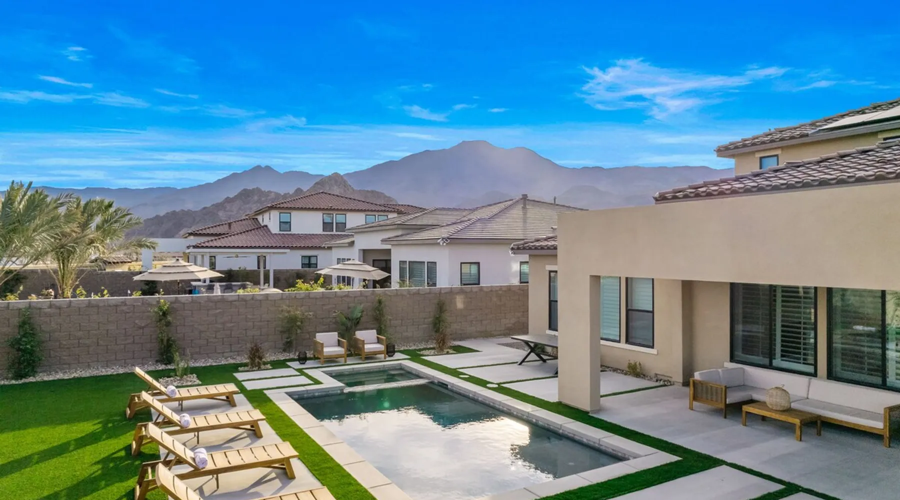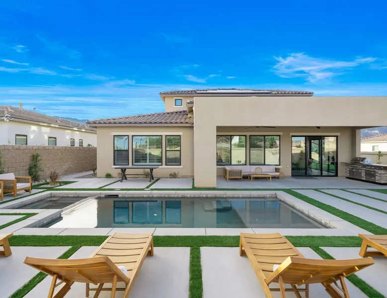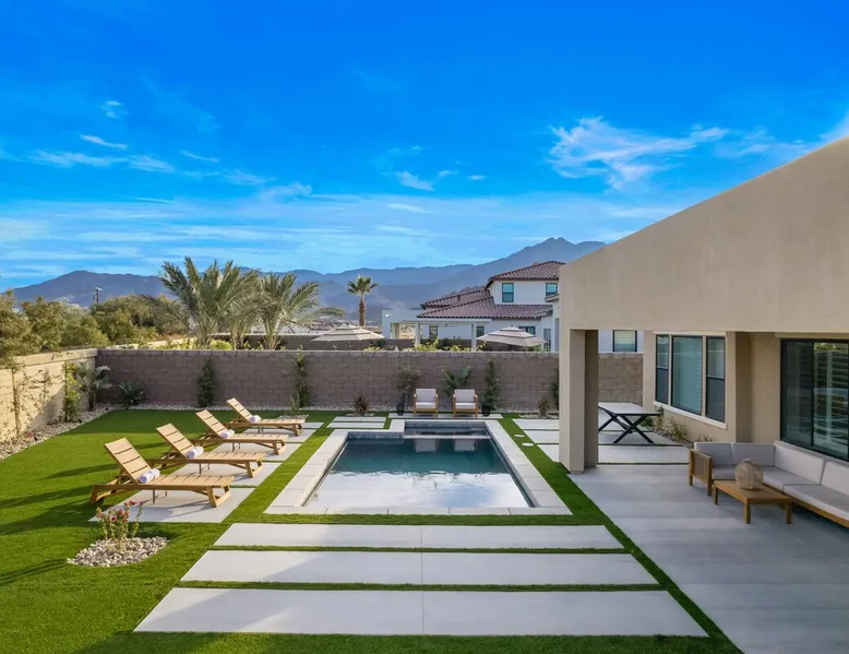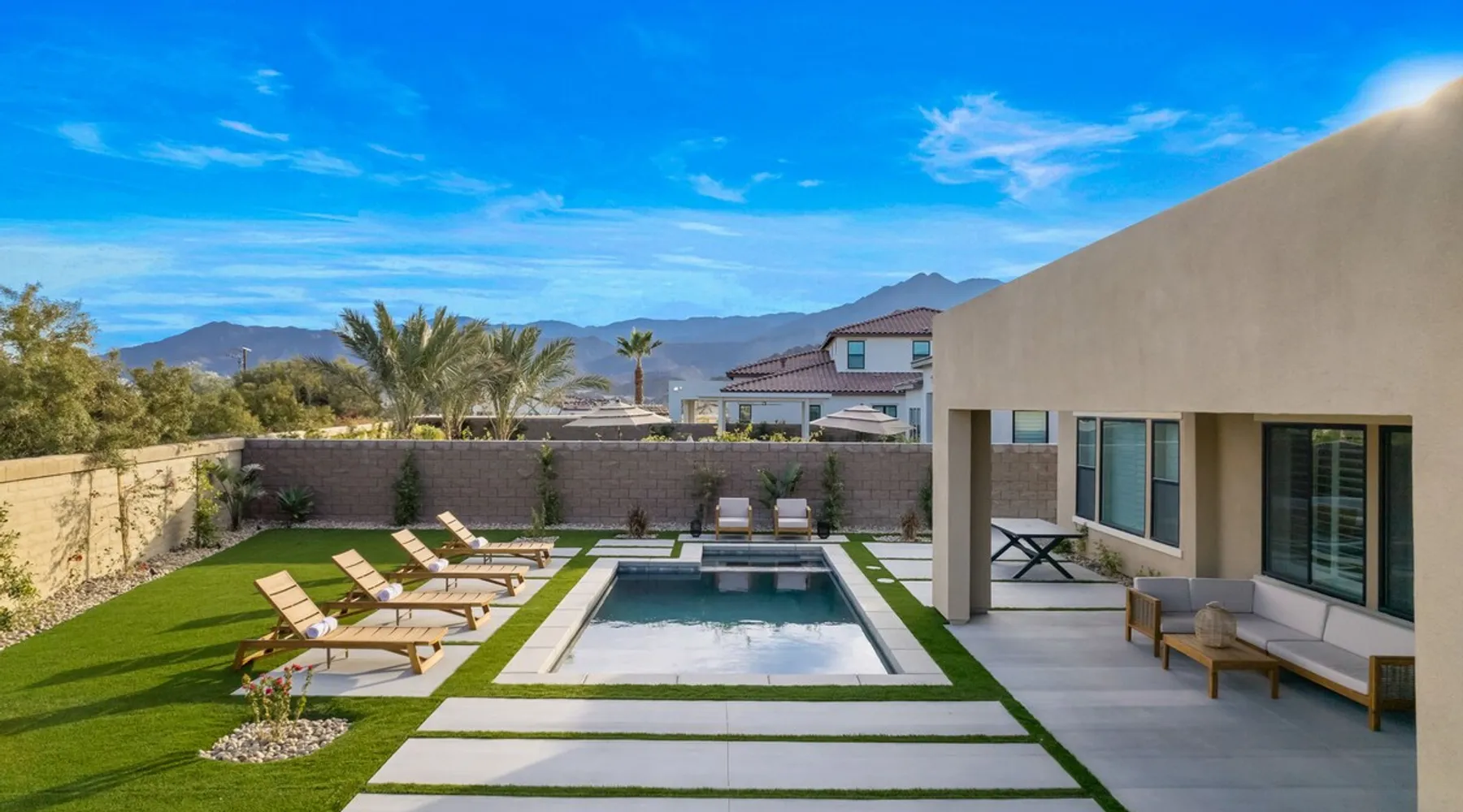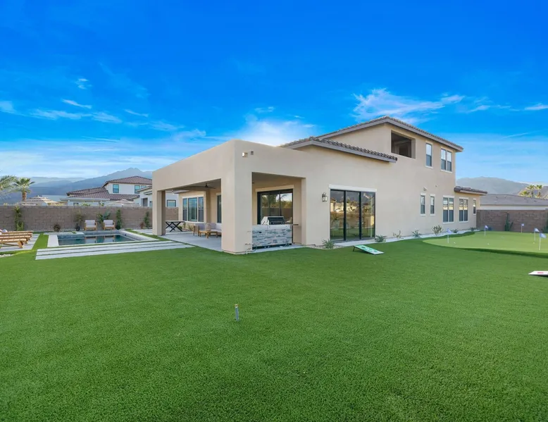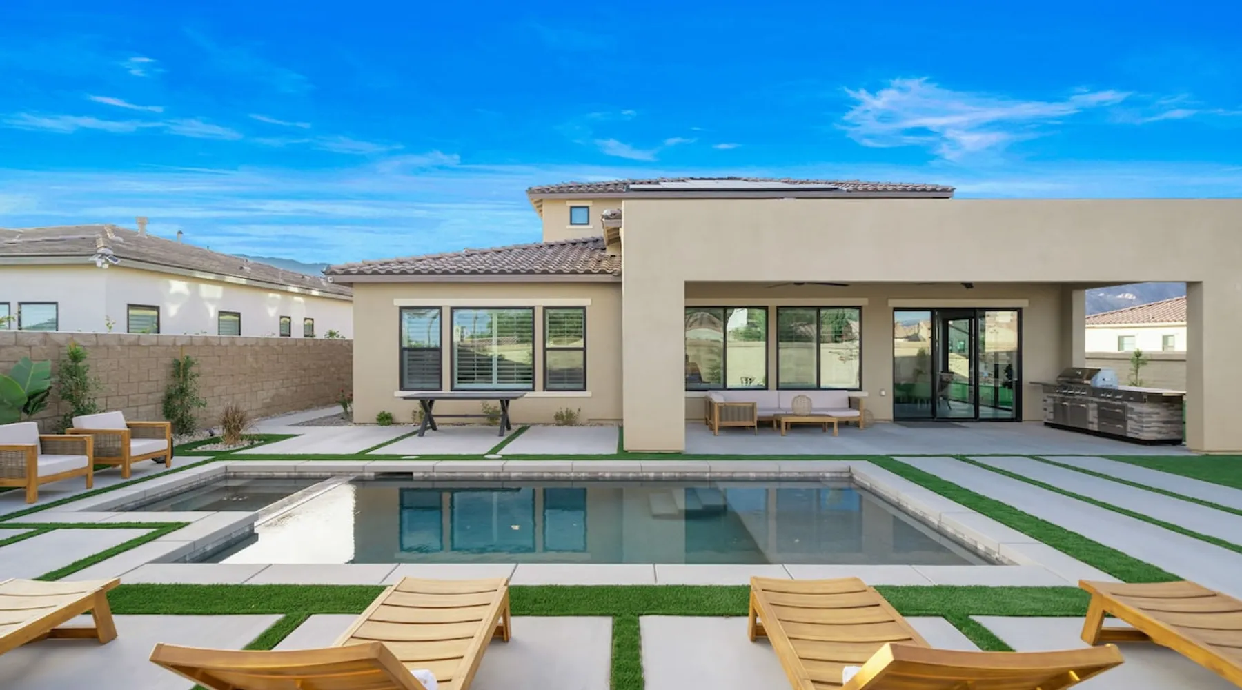 Experience luxury in this new gated Toll Bros. home in La Quinta. Featuring over 10-ft ceilings and large sliding doors, it opens to a resort-like backyard with a saltwater pool, spa, oversized putting green, games area, BBQ, & firepit. The main level includes a gourmet kitchen, master suite, 2 additional bedrooms, 2 bathrooms, and an office. Upstairs offers a spacious loft w/ air hockey, arcade games, covered patio with mountain views, plus 2 more bedrooms and bathroom. Perfect for 2 families ! Guest access Entire home