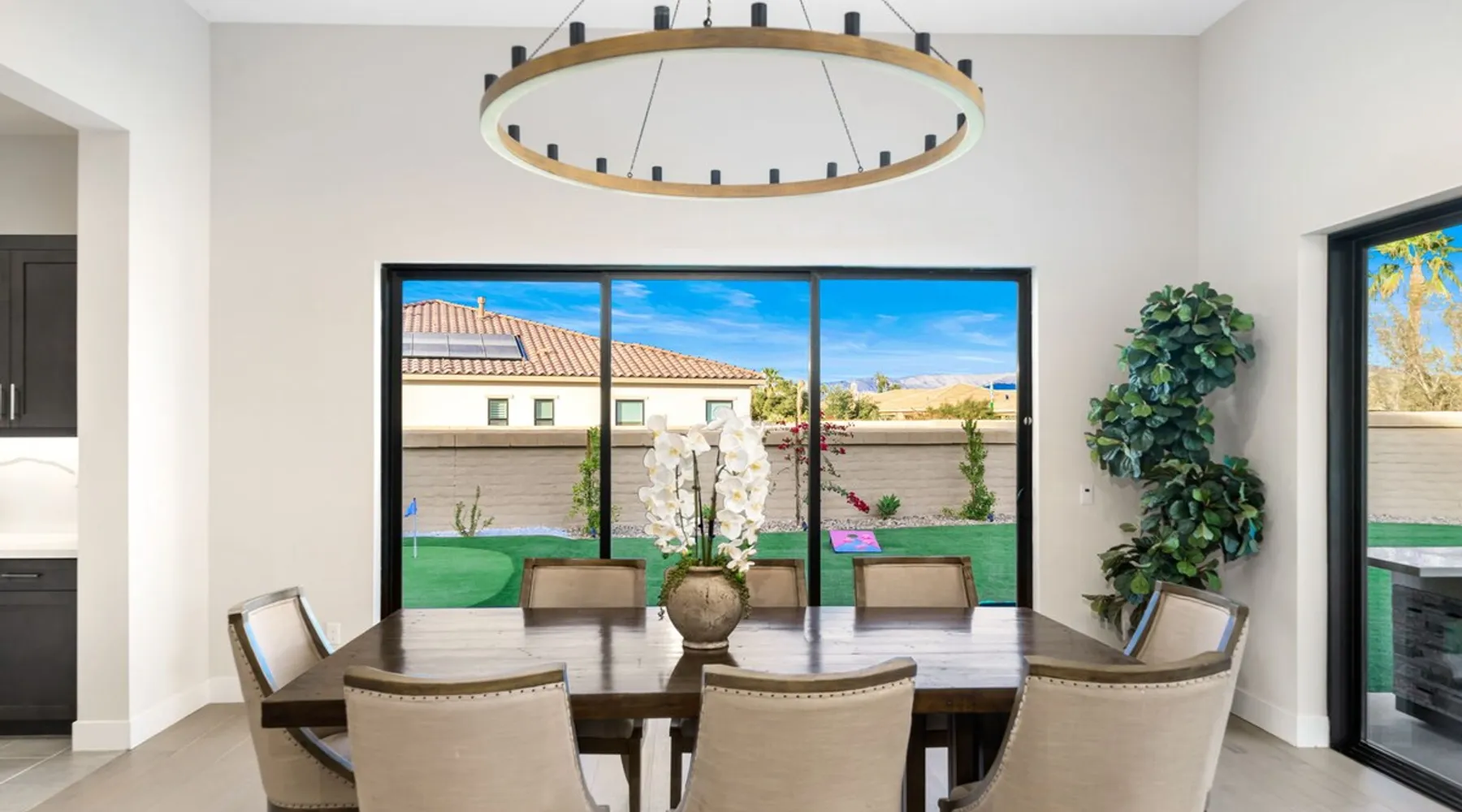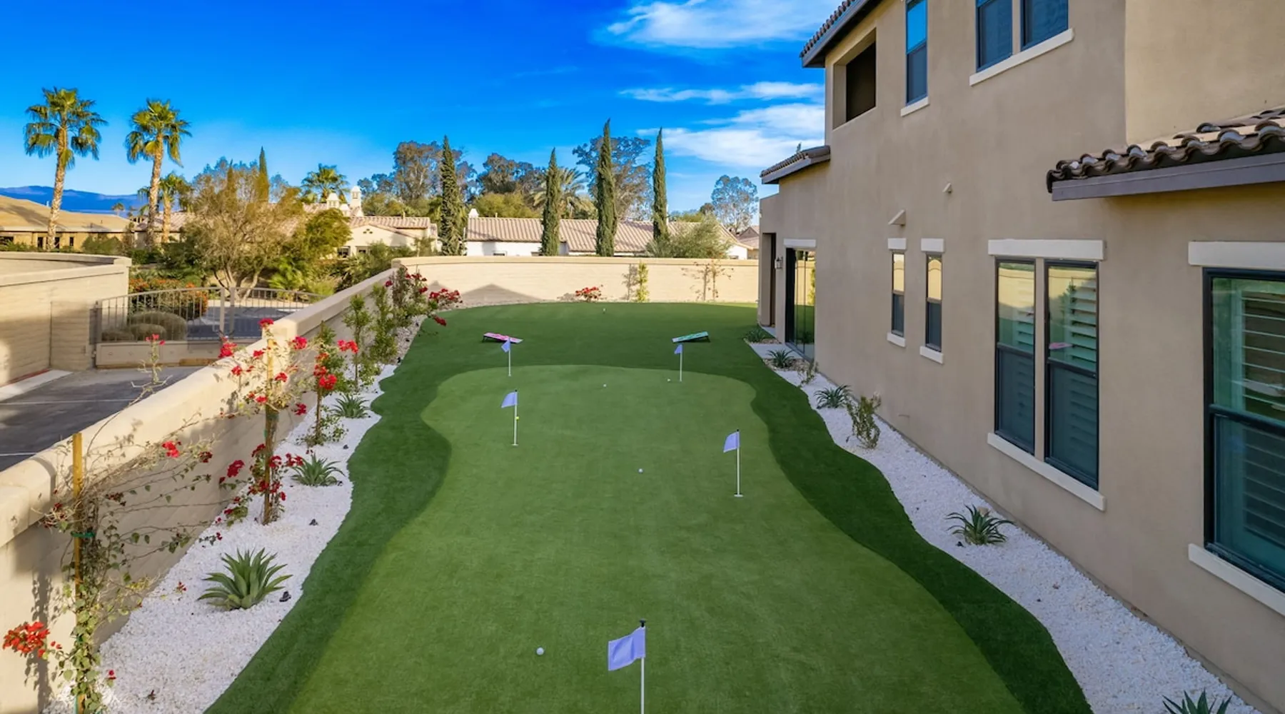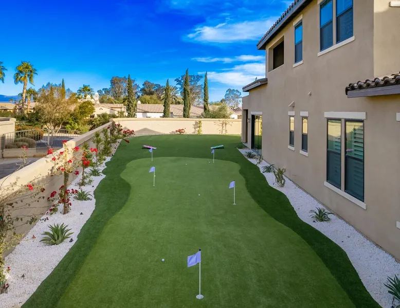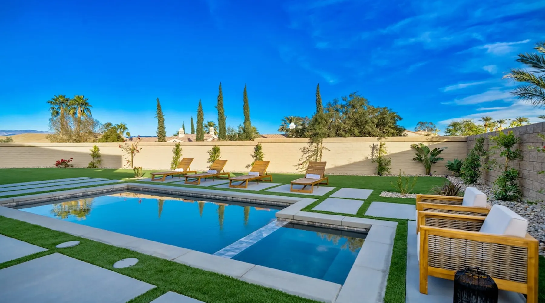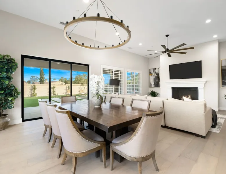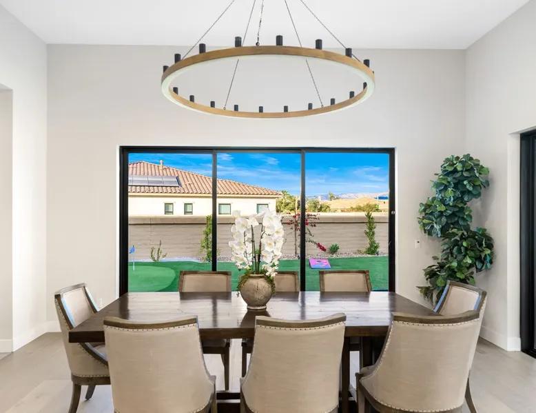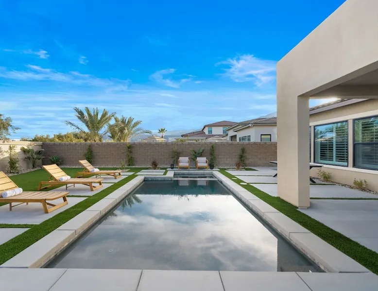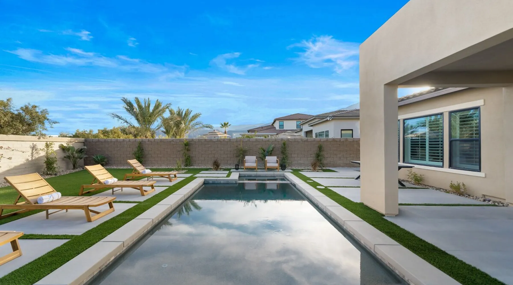Experience luxury in this new gated Toll Bros. home in La Quinta. Featuring over 10-ft ceilings and large sliding doors, it opens to a resort-like backyard with a saltwater pool, spa, oversized putting green, games area, BBQ, & firepit. The main level includes a gourmet kitchen, master suite, 2 additional bedrooms, 2 bathrooms, and an office. Upstairs offers a spacious loft w/ air hockey, arcade games, covered patio with mountain views, plus 2 more bedrooms and bathroom. Perfect for 2 families ! Guest access Entire home