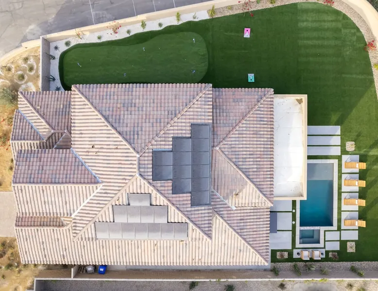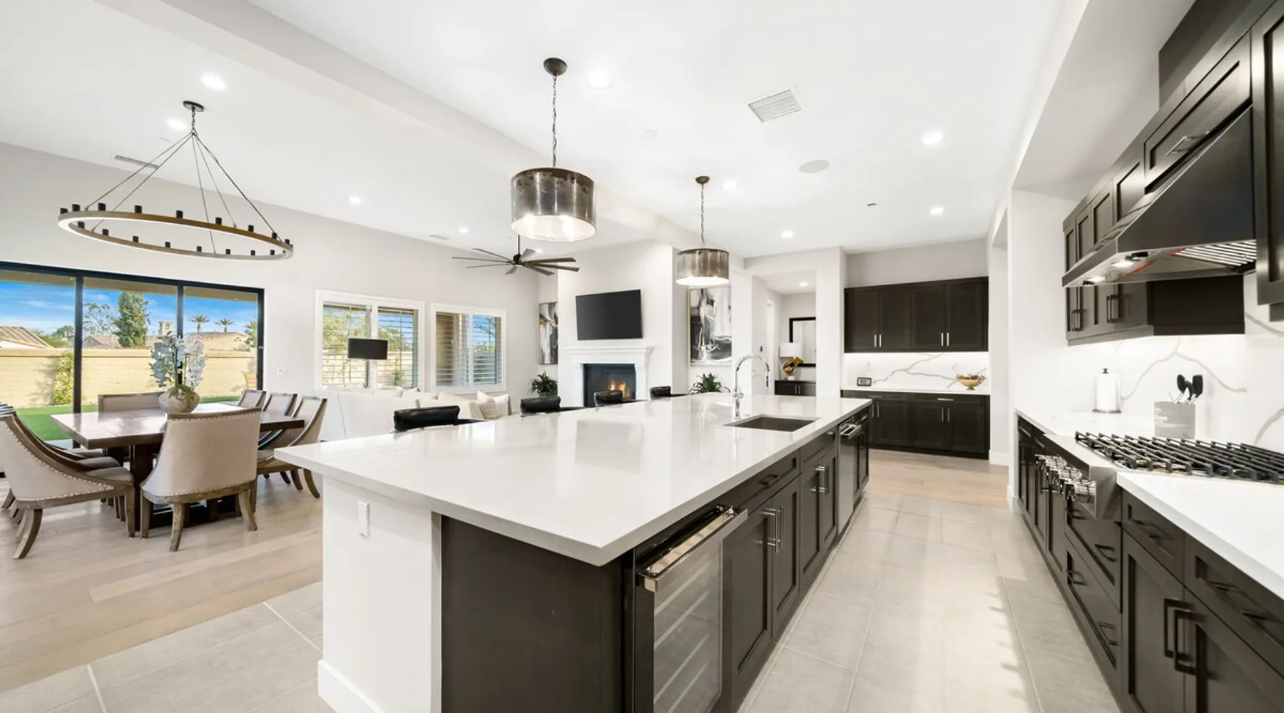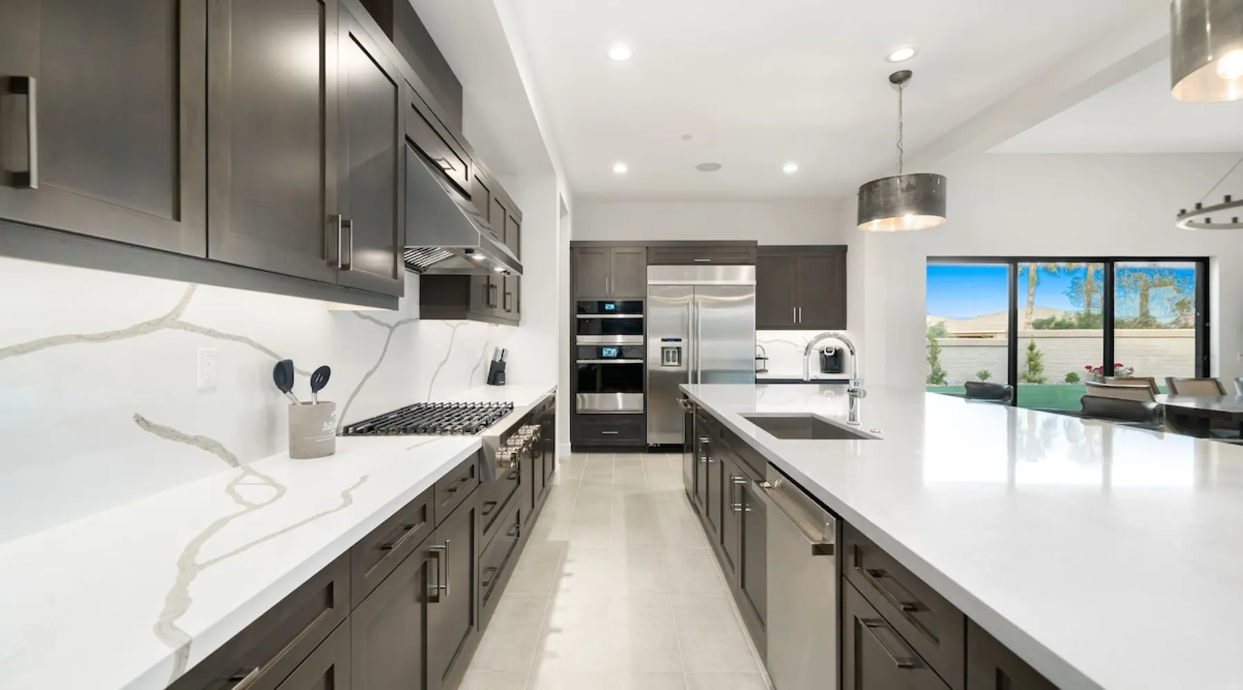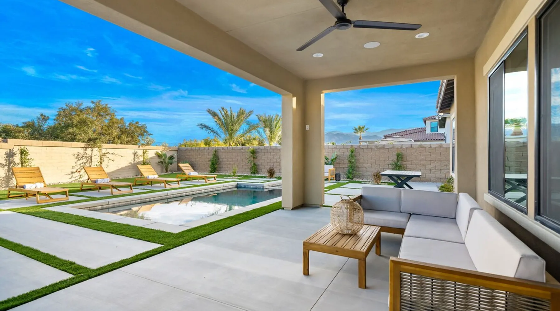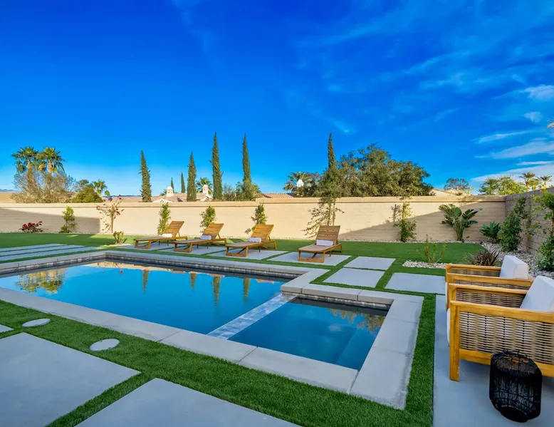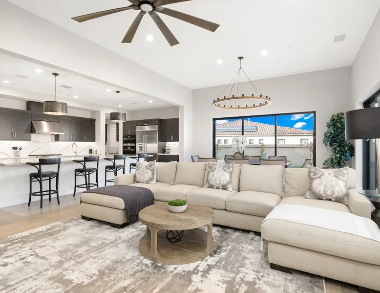 Experience luxury in this new gated Toll Bros. home in La Quinta. Featuring over 10-ft ceilings and large sliding doors, it opens to a resort-like backyard with a saltwater pool, spa, oversized putting green, games area, BBQ, & firepit. The main level includes a gourmet kitchen, master suite, 2 additional bedrooms, 2 bathrooms, and an office. Upstairs offers a spacious loft w/ air hockey, arcade games, covered patio with mountain views, plus 2 more bedrooms and bathroom. Perfect for 2 families ! Guest access Entire home