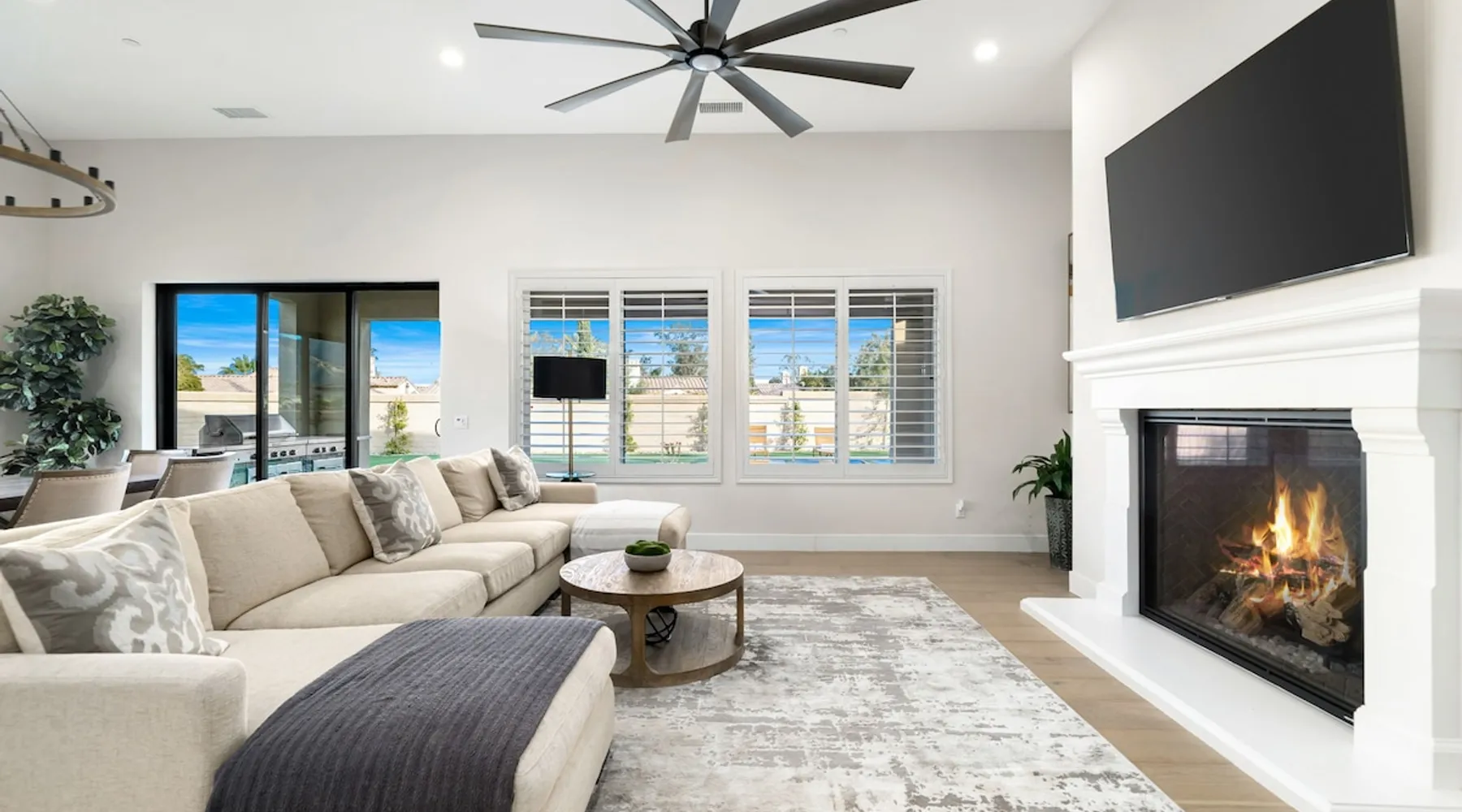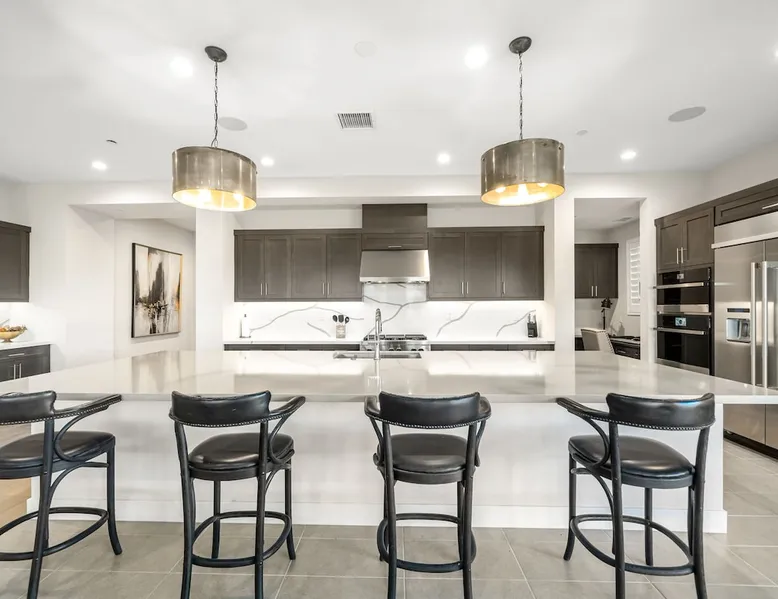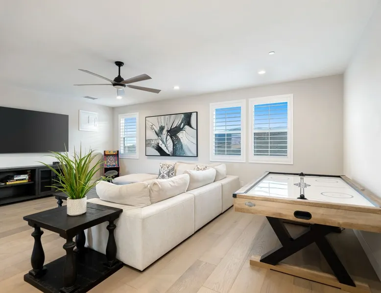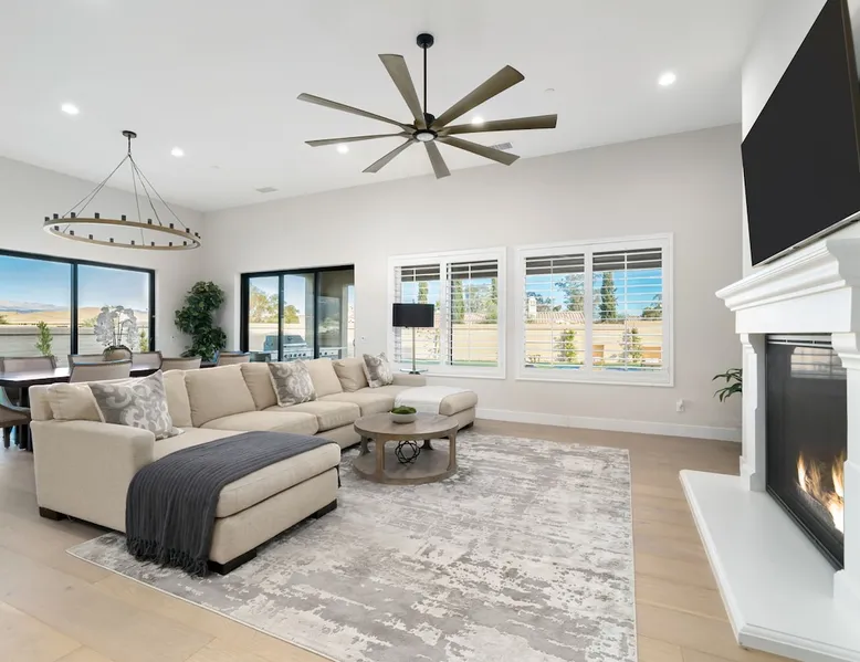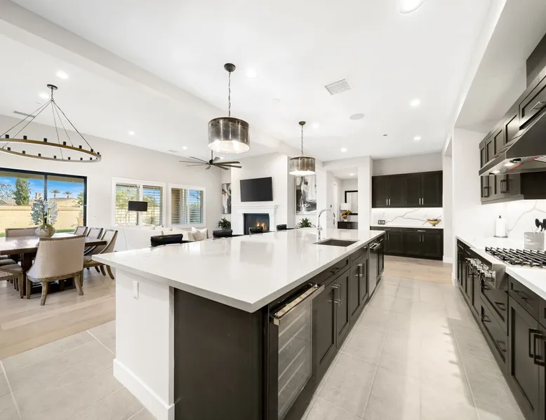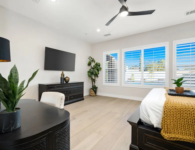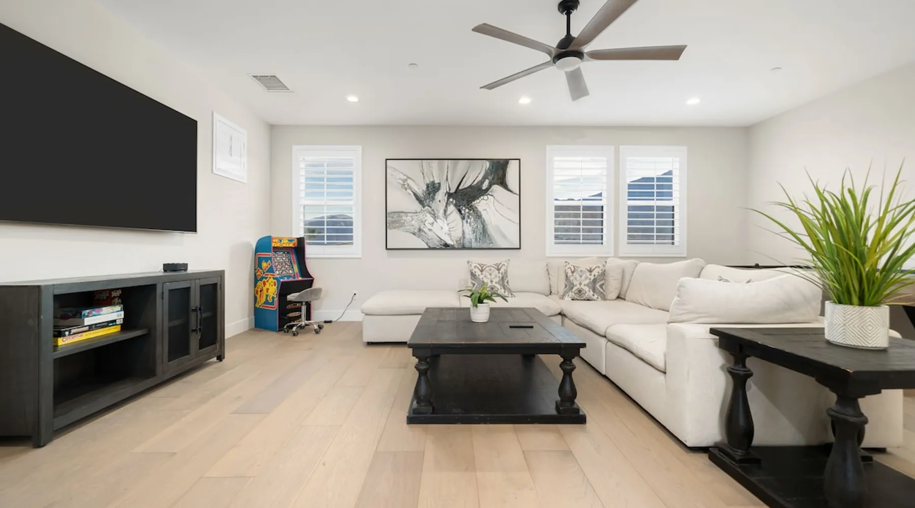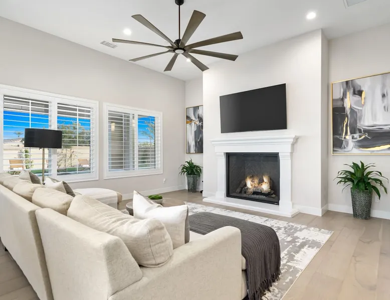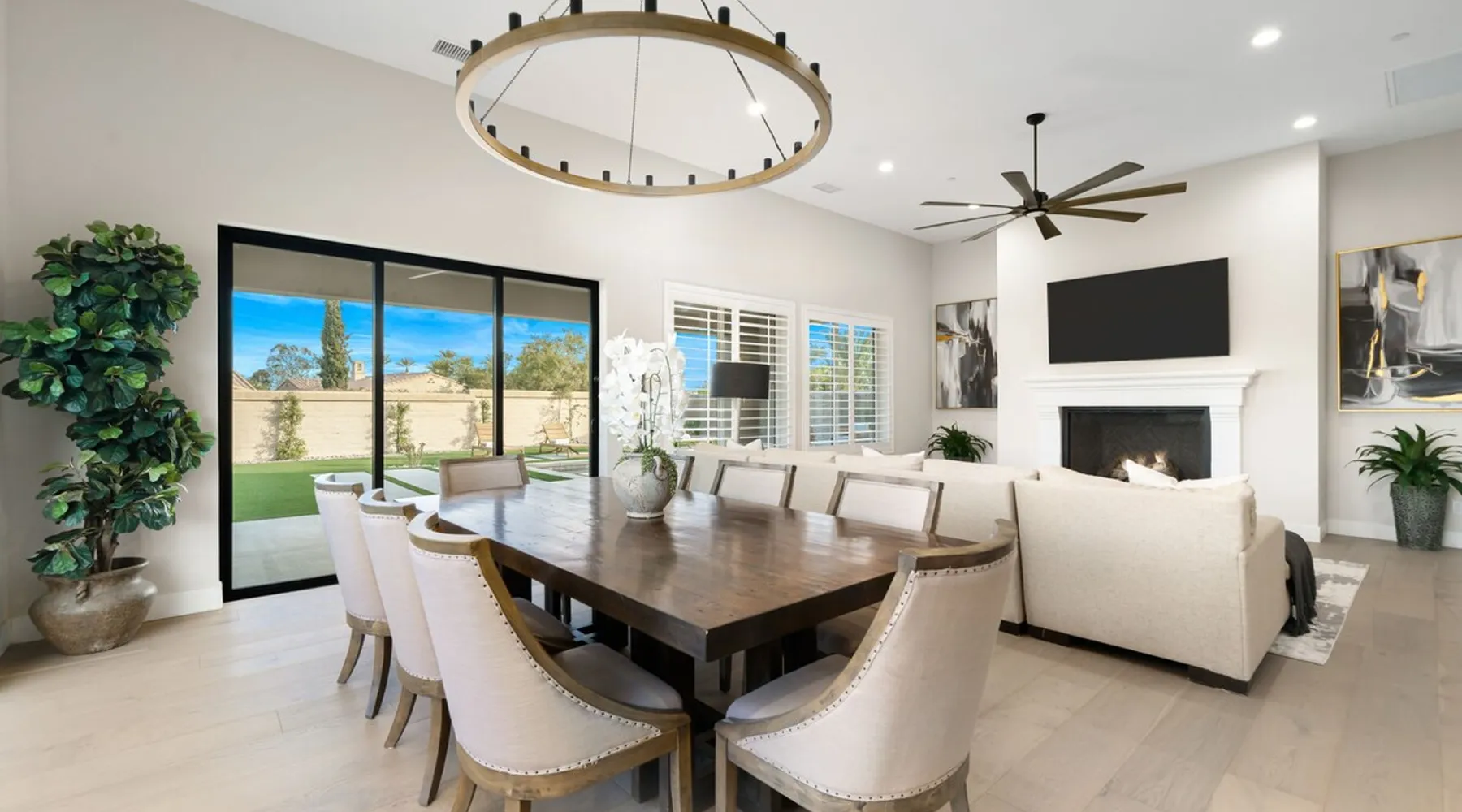 Experience luxury in this new gated Toll Bros. home in La Quinta. Featuring over 10-ft ceilings and large sliding doors, it opens to a resort-like backyard with a saltwater pool, spa, oversized putting green, games area, BBQ, & firepit. The main level includes a gourmet kitchen, master suite, 2 additional bedrooms, 2 bathrooms, and an office. Upstairs offers a spacious loft w/ air hockey, arcade games, covered patio with mountain views, plus 2 more bedrooms and bathroom. Perfect for 2 families ! Guest access Entire home