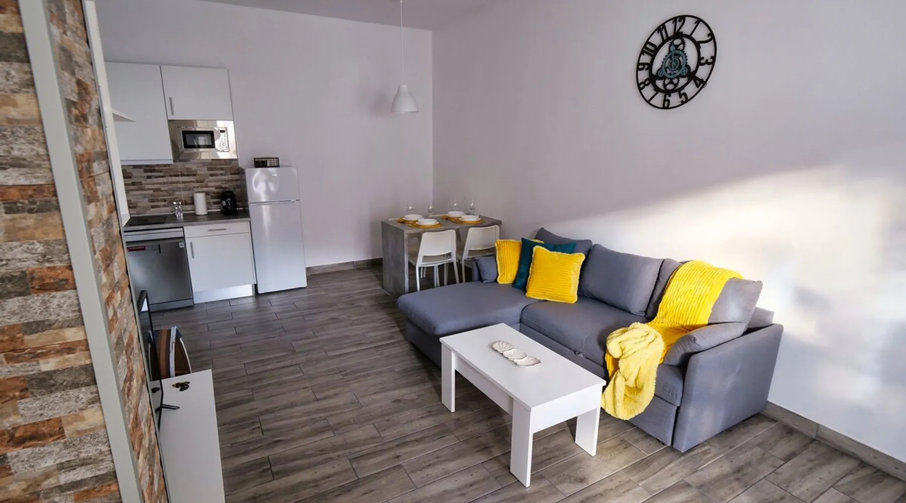 Apartment in a quiet area but at the same time located in the heart of Corralejo, near the main street, where you can find all kinds of shops, supermarket, Las Palmeras Shopping Center, restaurants, bars, casino, Aqua water park Baku and about 200 meters from the beach. The space Casa Aguamarina has a separate bedroom with a double bed and a large closet, a living room with a sofa bed for two more people, a kitchen with a dining room for up to four people, a bathroom with a shower with hydromassage, a laundry room and a terrace with furniture. Guest access The apartment is located in a complex with community pool (not heated) Gated complex with key access gate. Other things to note With the Dunes of Corralejo about 3 km. Close to the villages of Lajares and Cotillo. It is approximately 30 minutes by car from the capital, Puerto del Rosario and about 45 minutes from the airport. Great for water sports. If you need anything in particular that is within our reach, we will gladly assist you. Registration Details Spain - National registration number ESFCTU0000350250003532970000000000000VV-35-2-00073643