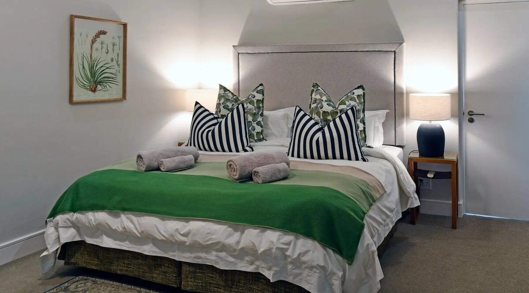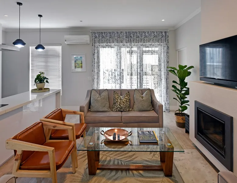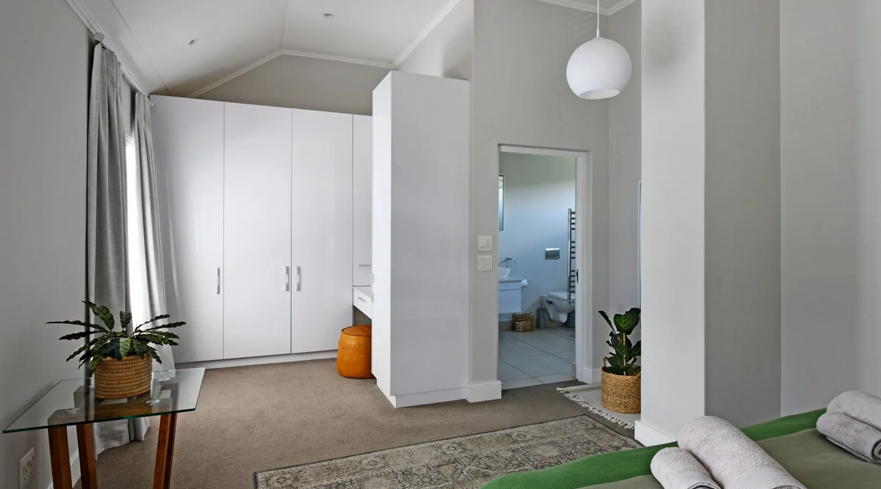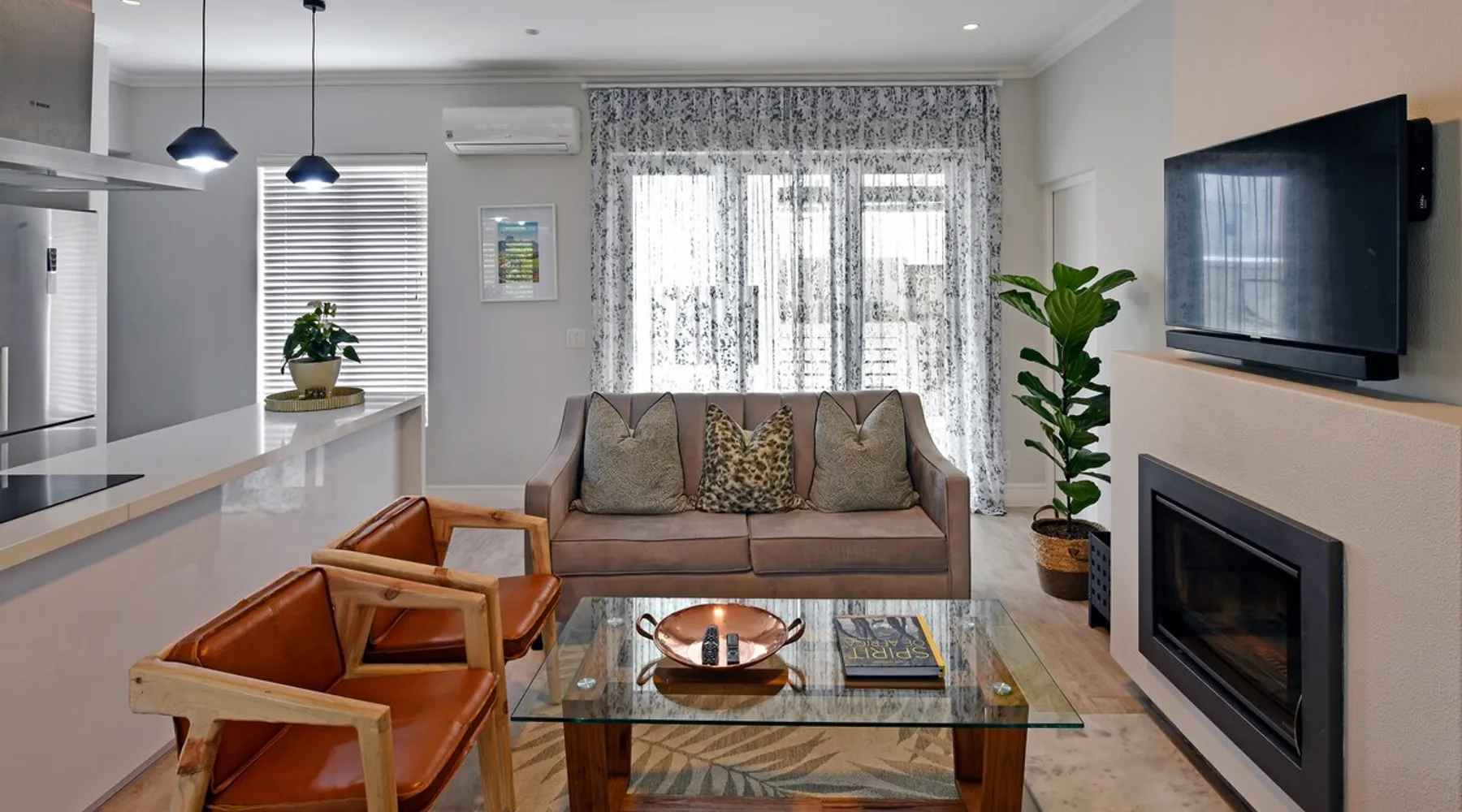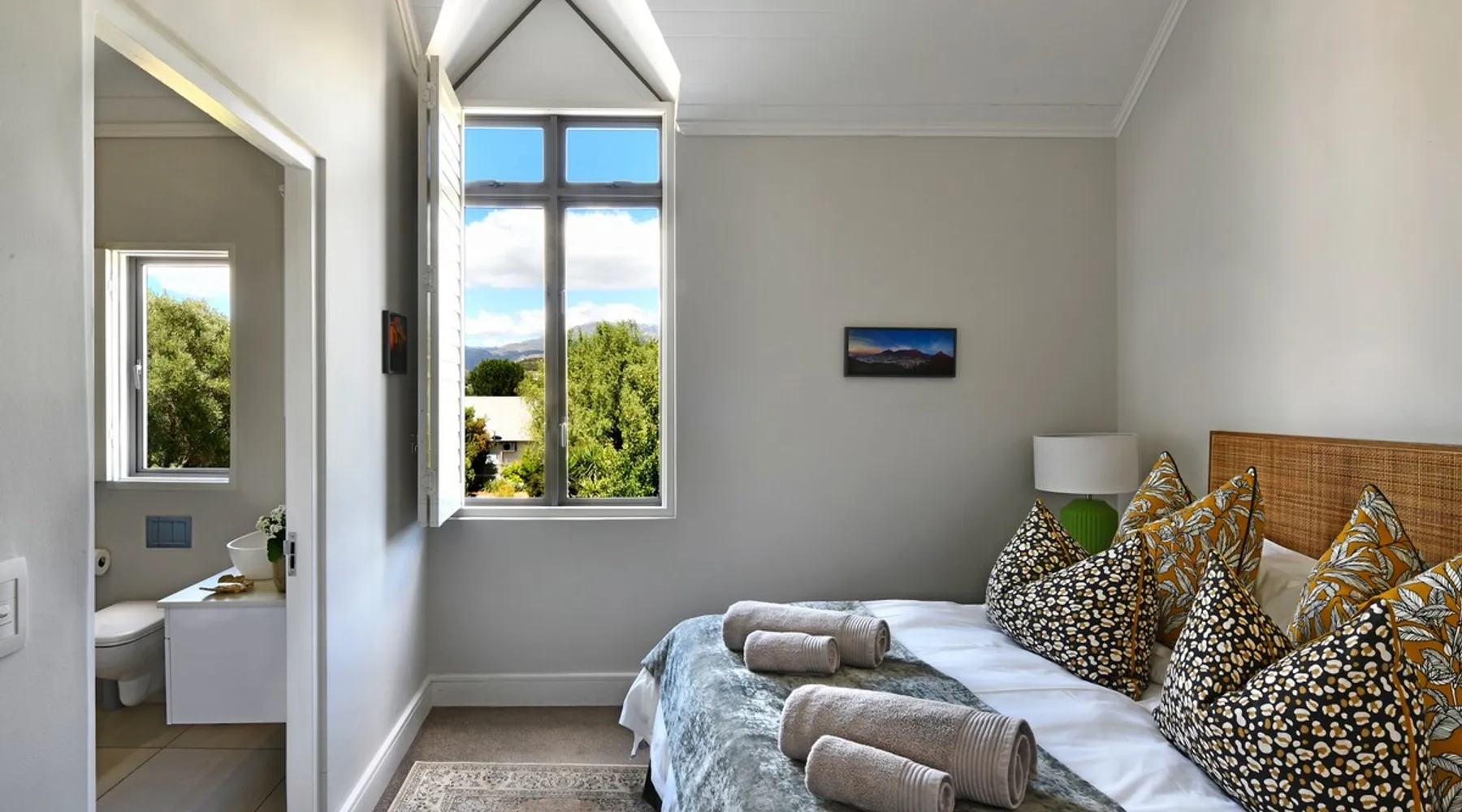If you’re wanting to explore Franschhoek, The Village Cottage is located in the heart of this elegant historic town. Filled with art galleries, shops, boutiques and world class restaurants, Franschhoek is one of the oldest towns in South Africa, founded in 1688 by French Huguenot settlers. Quaint and vibey, it’s situated about a half-hour drive from Stellenbosch and a 45-minute drive from Cape Town. You’ll find it well worth the trip! The space The Village Cottage is the perfect place to call home after you’ve spent a day sampling delicious wine at one of the nearby estates or strolling the main stretch (just around the corner) with a shopping bag or two. Unwind in pure, blissful comfort – no detail was too small in ensuring that you have a luxurious and memorable stay. We hope you’ll make yourself right at home in our open-plan, air-conditioned kitchen and stylish lounge area. For cosy nights in, make use of the fireplace or television. Make your way upstairs and you’re in for a treat! Both bedrooms are equipped with aircon for those hot summer days. You’ll find it hard to leave the plush, king-sized bed in the main bedroom, which has a spacious dressing table and modern en suite bathroom (make time for a soak in the free-standing bathtub!). Bringing your laptop? Catch up on a few emails at the convenient work space on the upstairs landing. Our comfy second bedroom also has an en suite bathroom. If you’re craving fresh air, the townhouse features an outdoor sitting area where you can enjoy a braai (barbecue) with friends in the sunshine. Top-notch, stable Wi-Fi will help you stay calm and connected. Your car is safe and secure in our garage with direct access to the townhouse. Should loadshedding (a power outage) occur, rest easy – there’s an inverter and back-up battery system that will kick in automatically to keep the lights up and running. There is additional parking for another car in the complex. Franschhoek, Afrikaans for ‘French corner’, is nothing short of idyllic, with balmy summers and, more often than not, gorgeous snow-capped mountain peaks in winter. The town and surrounds will keep you captivated, so go on – extend your stay and make the most of this Western Cape gem! Hop on the world-famous Franschhoek Wine Tram. Dine at some of the country’s best restaurants. Explore our bohemian Saturday market. Bike or hike to soak up the spectacular valley scenery. Take in art and architecture and, most importantly, take your time. We hope your stay feels like an exhale and your heart feels full. Until then!