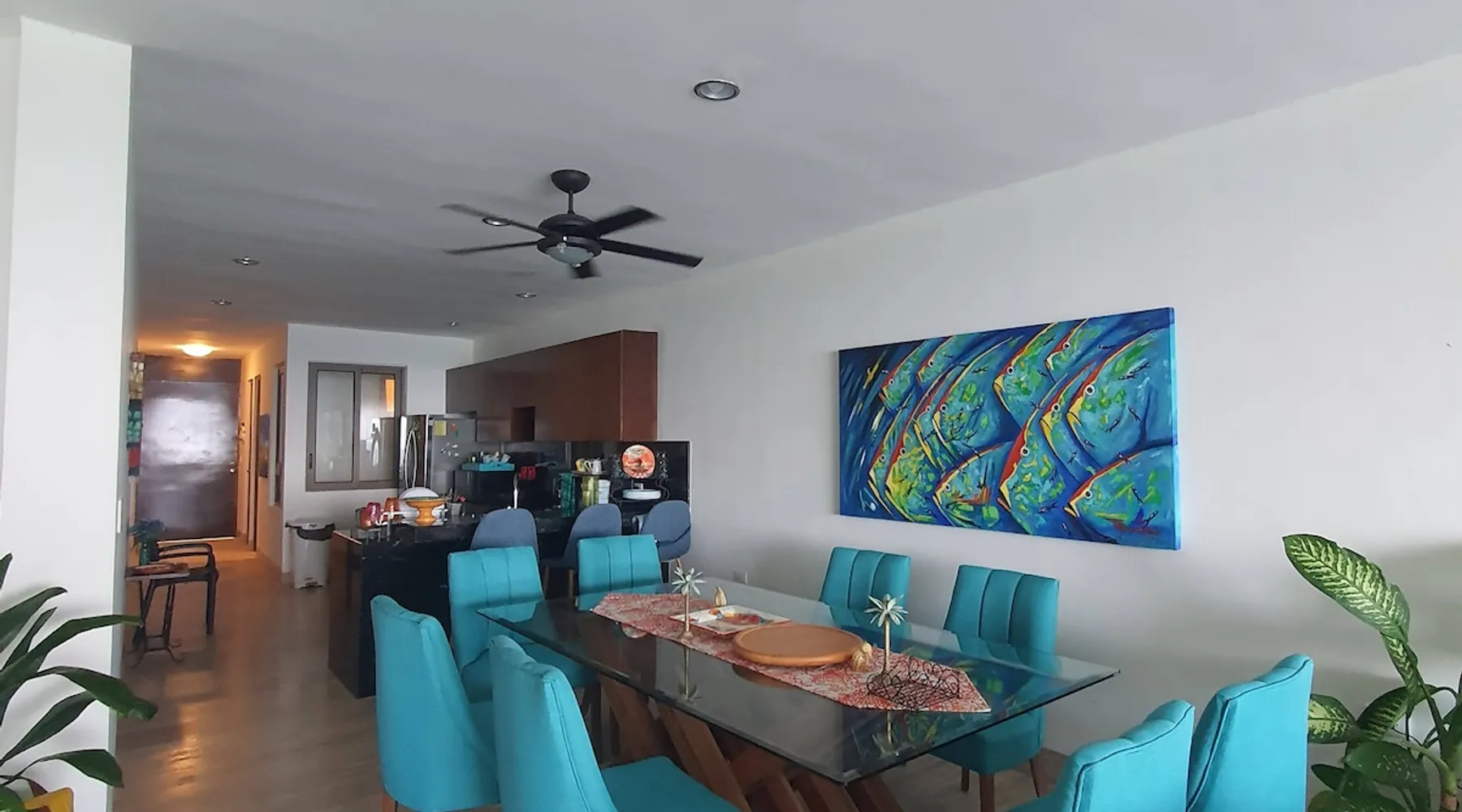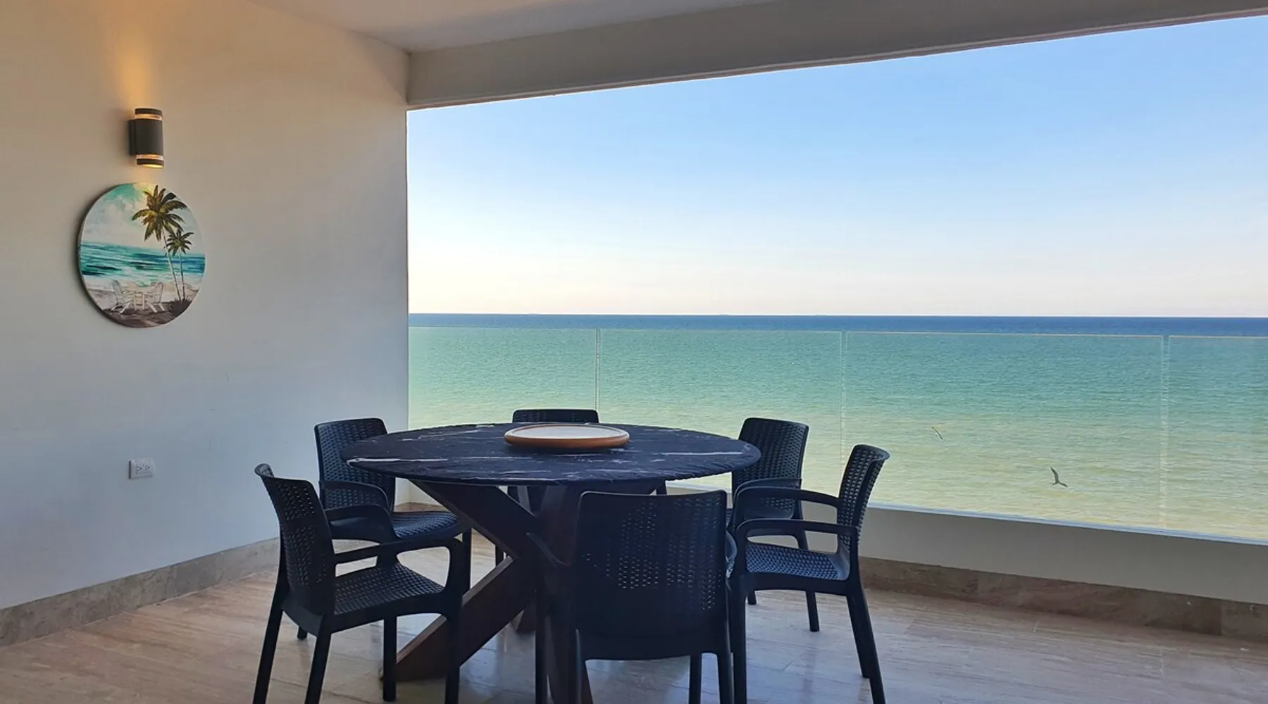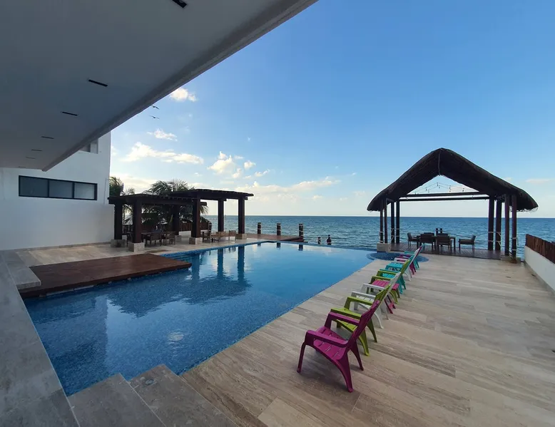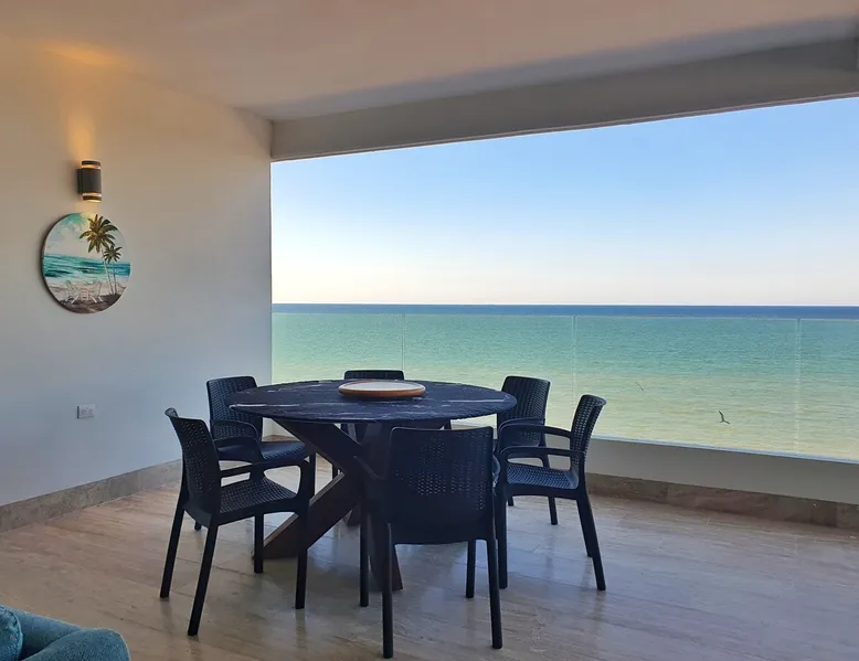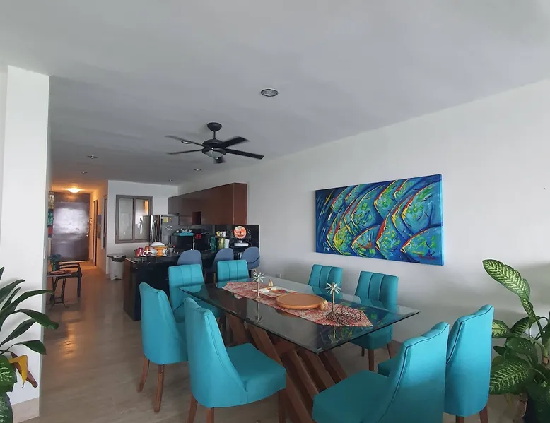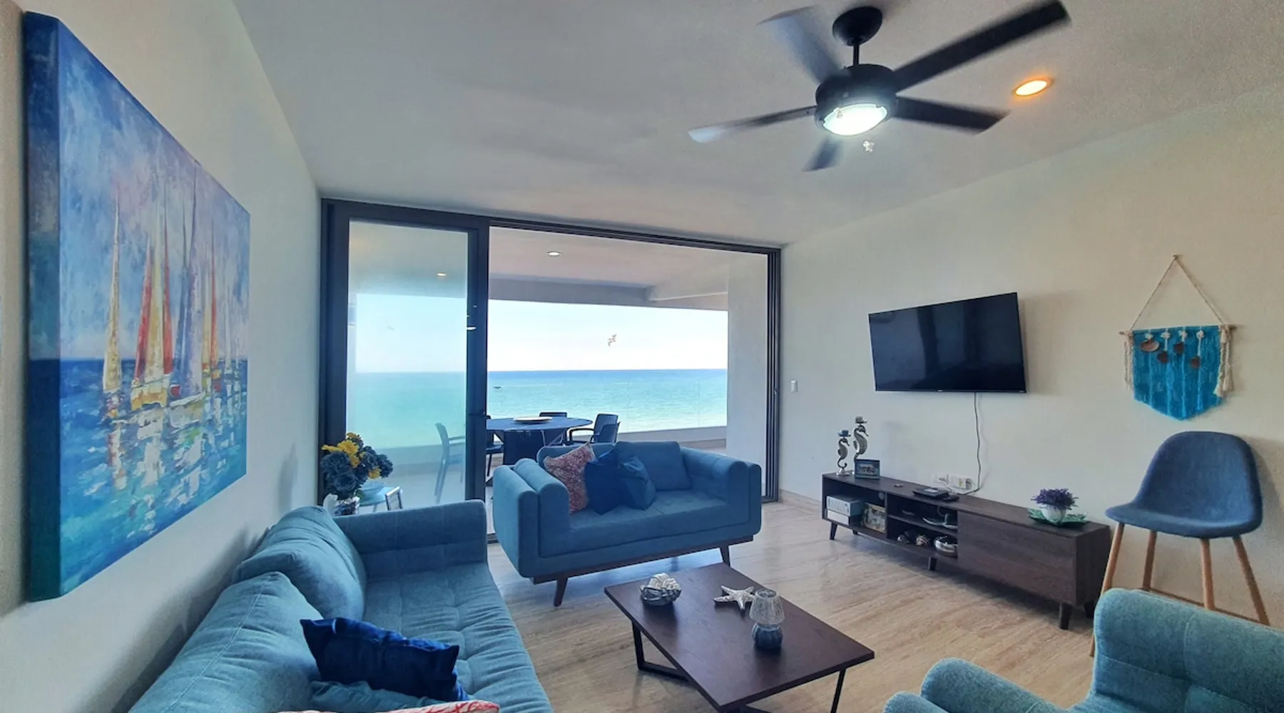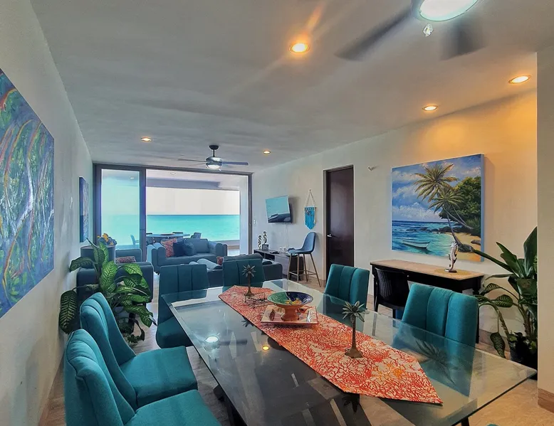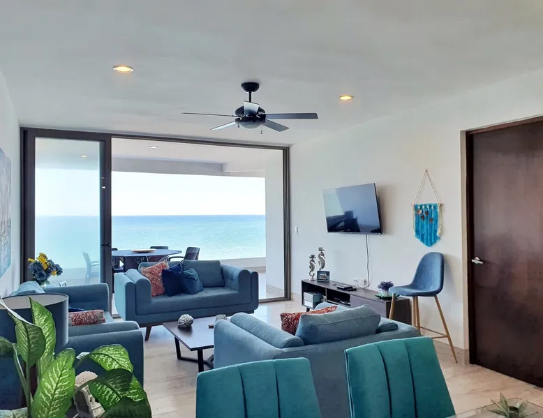 Decorated with the colors of the sea, with direct ocean views and a large social area on the terrace. The space A residential-sized apartment. Fully equipped and its common areas such as gym and pool are Free Access. A very short distance from the village you can walk. Guest access The common areas are the pool, terraces, bar, dining and lobby rooms, jacuzzi, gym, parking and elevator Other things to note We are located very close to downtown Chicxulub Puerto. Ideal for walking and returning.