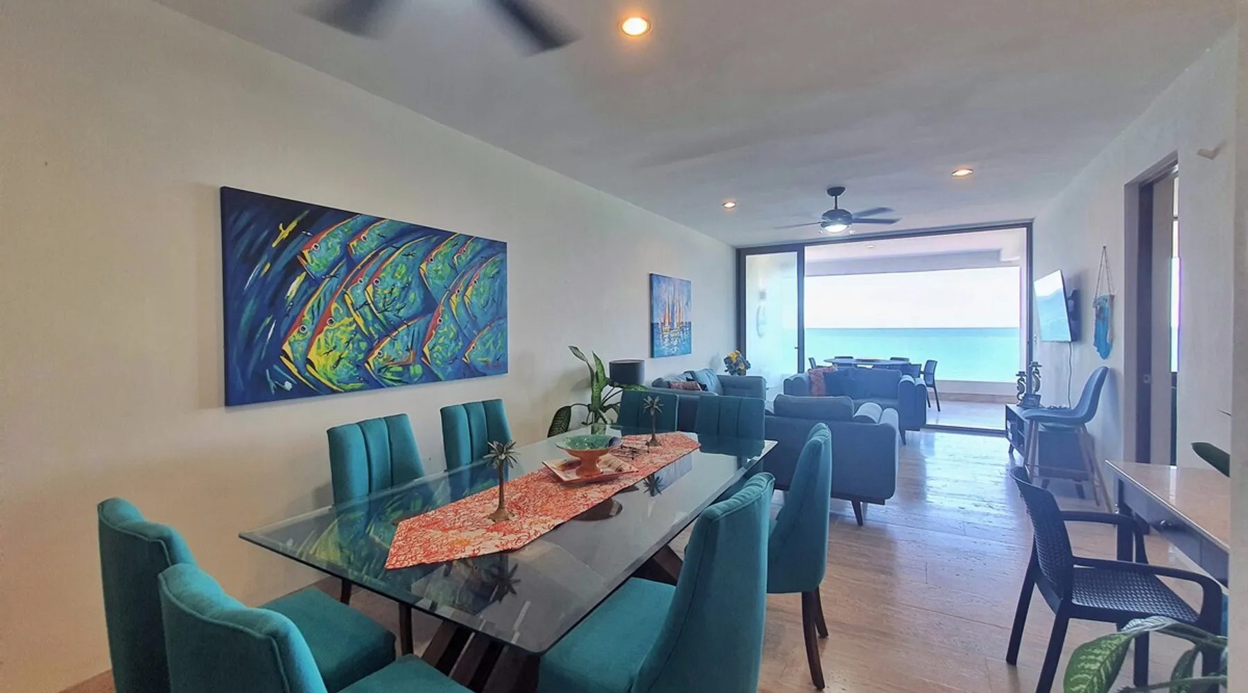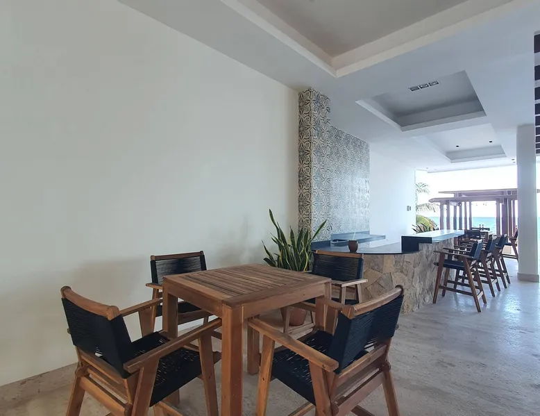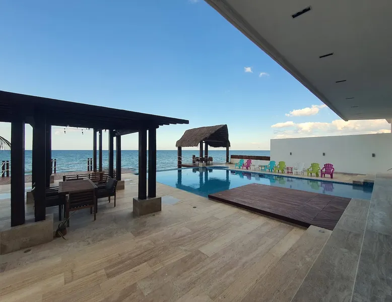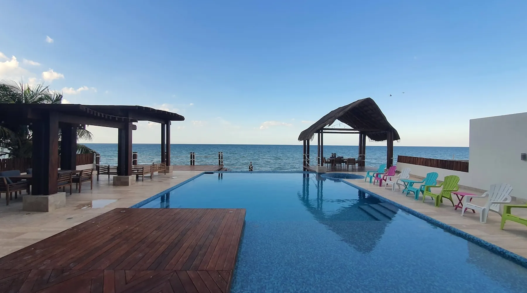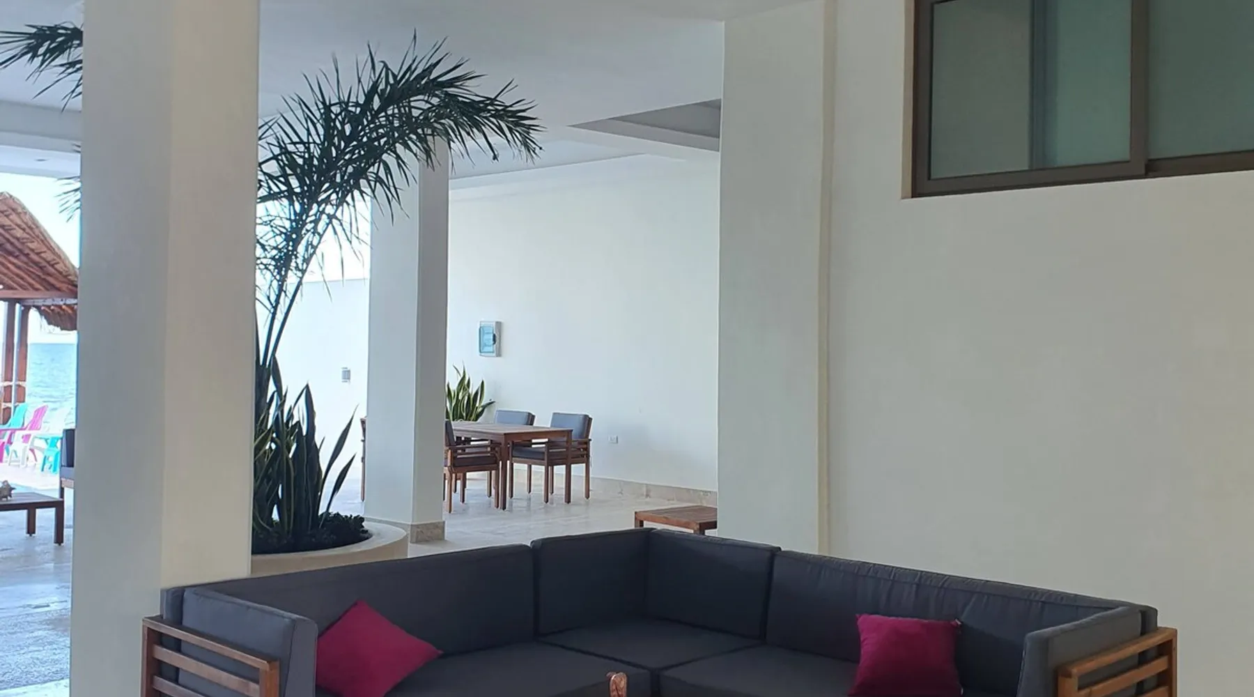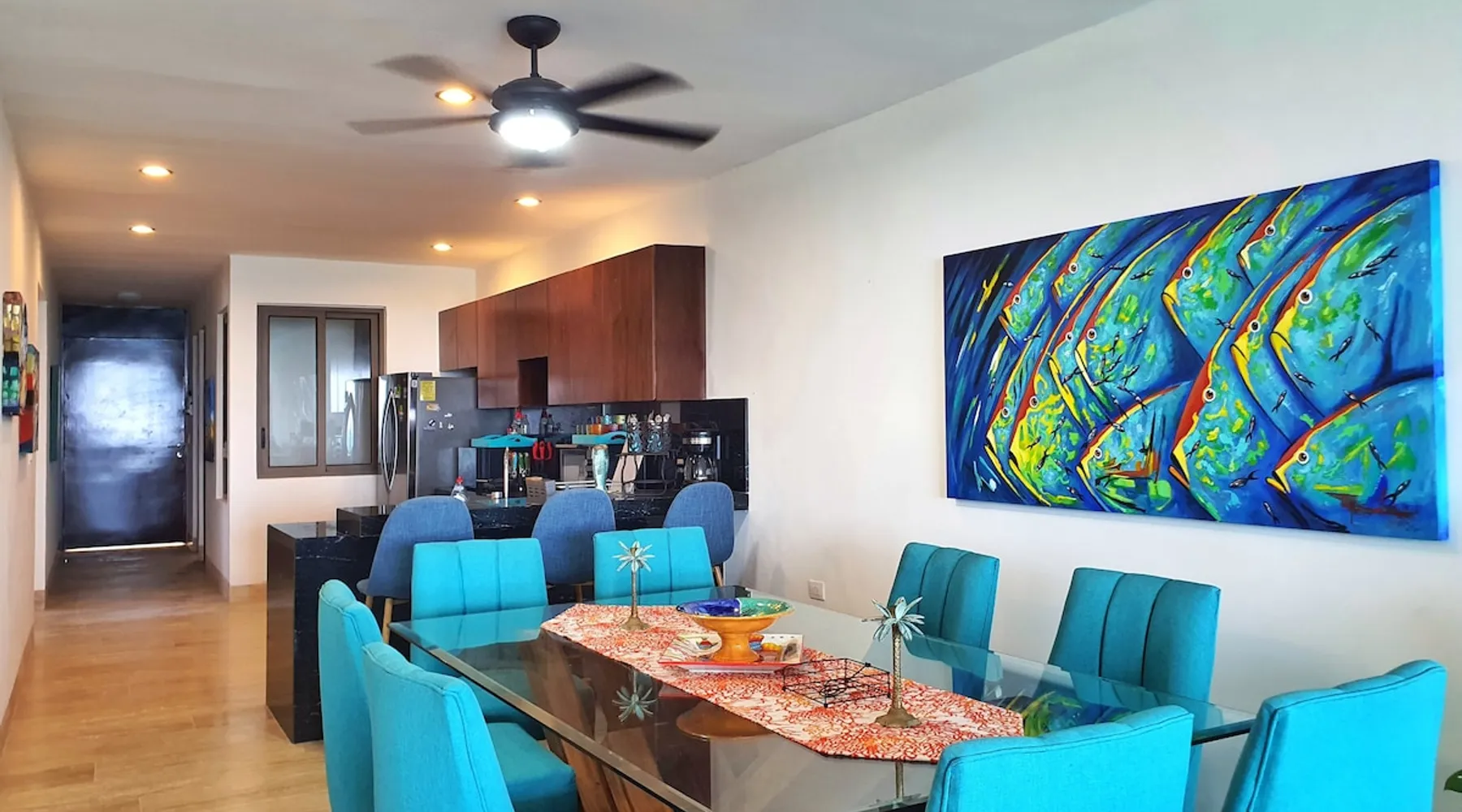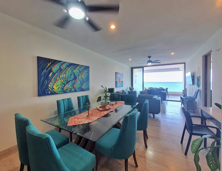 Decorated with the colors of the sea, with direct ocean views and a large social area on the terrace. The space A residential-sized apartment. Fully equipped and its common areas such as gym and pool are Free Access. A very short distance from the village you can walk. Guest access The common areas are the pool, terraces, bar, dining and lobby rooms, jacuzzi, gym, parking and elevator Other things to note We are located very close to downtown Chicxulub Puerto. Ideal for walking and returning.