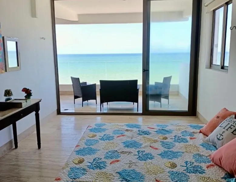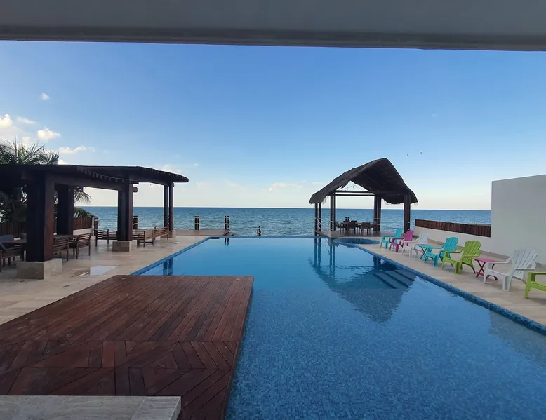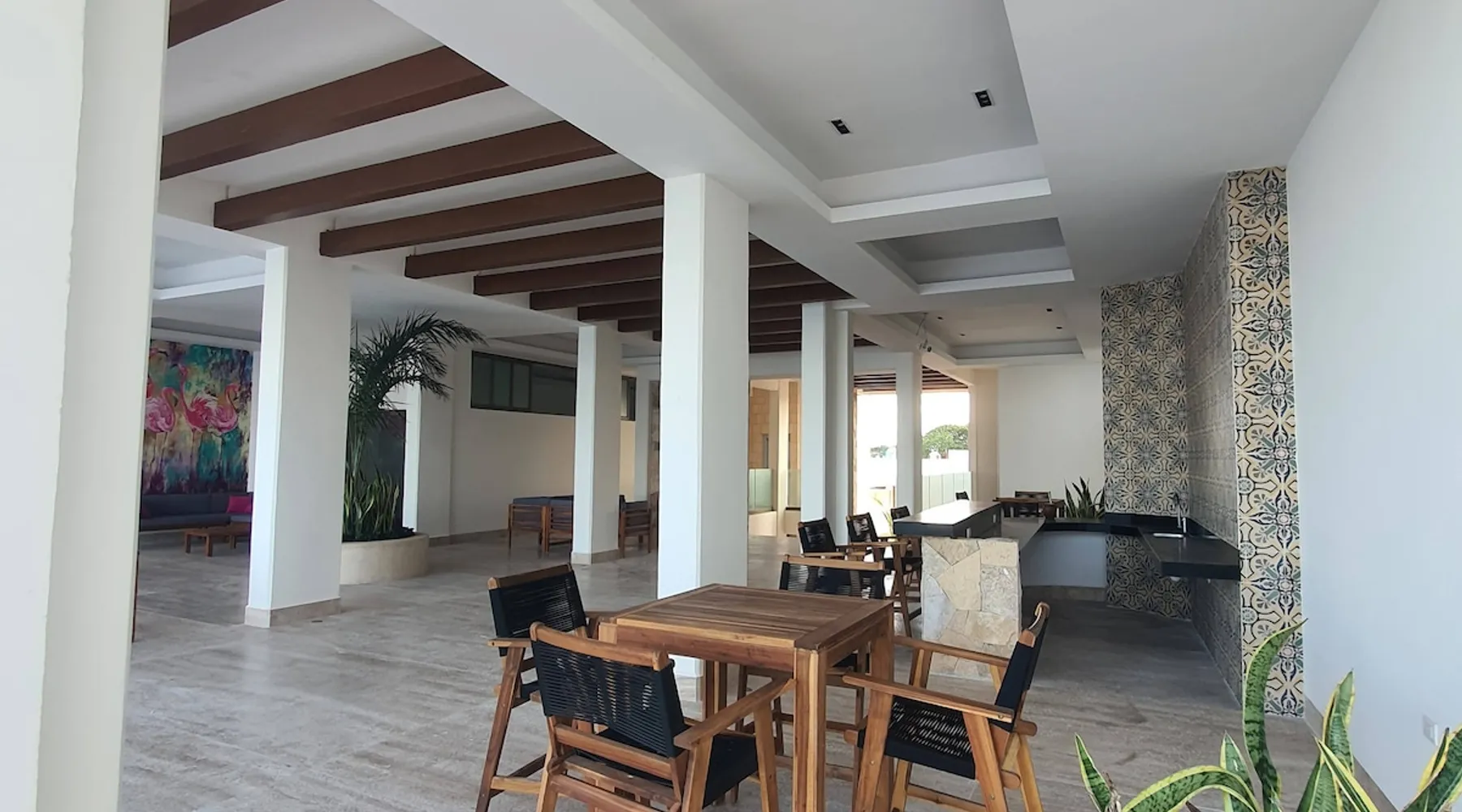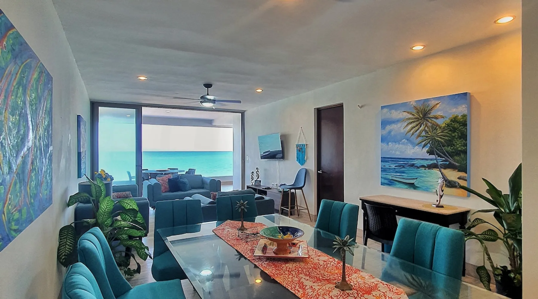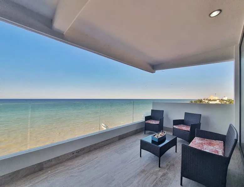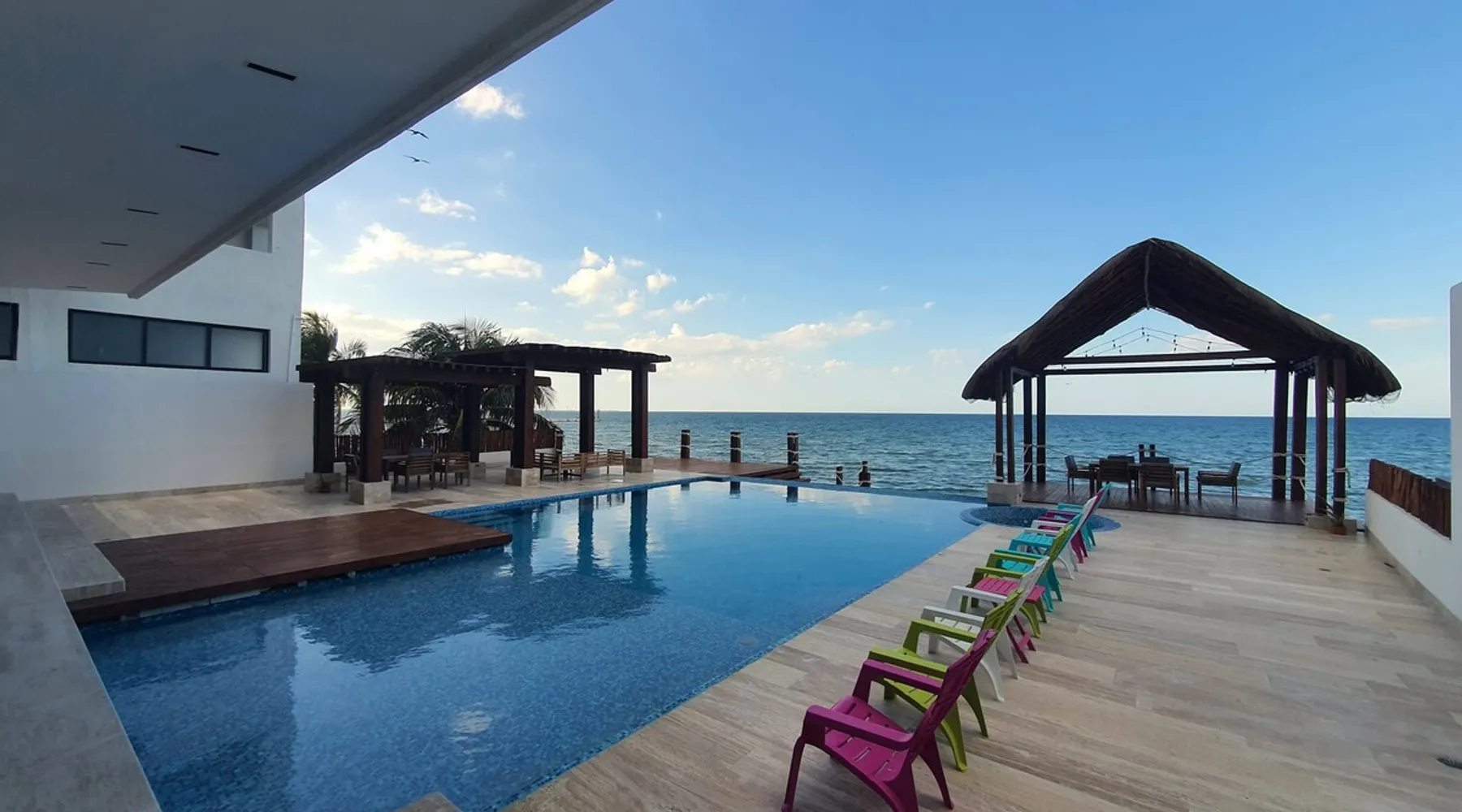 Decorated with the colors of the sea, with direct ocean views and a large social area on the terrace. The space A residential-sized apartment. Fully equipped and its common areas such as gym and pool are Free Access. A very short distance from the village you can walk. Guest access The common areas are the pool, terraces, bar, dining and lobby rooms, jacuzzi, gym, parking and elevator Other things to note We are located very close to downtown Chicxulub Puerto. Ideal for walking and returning.