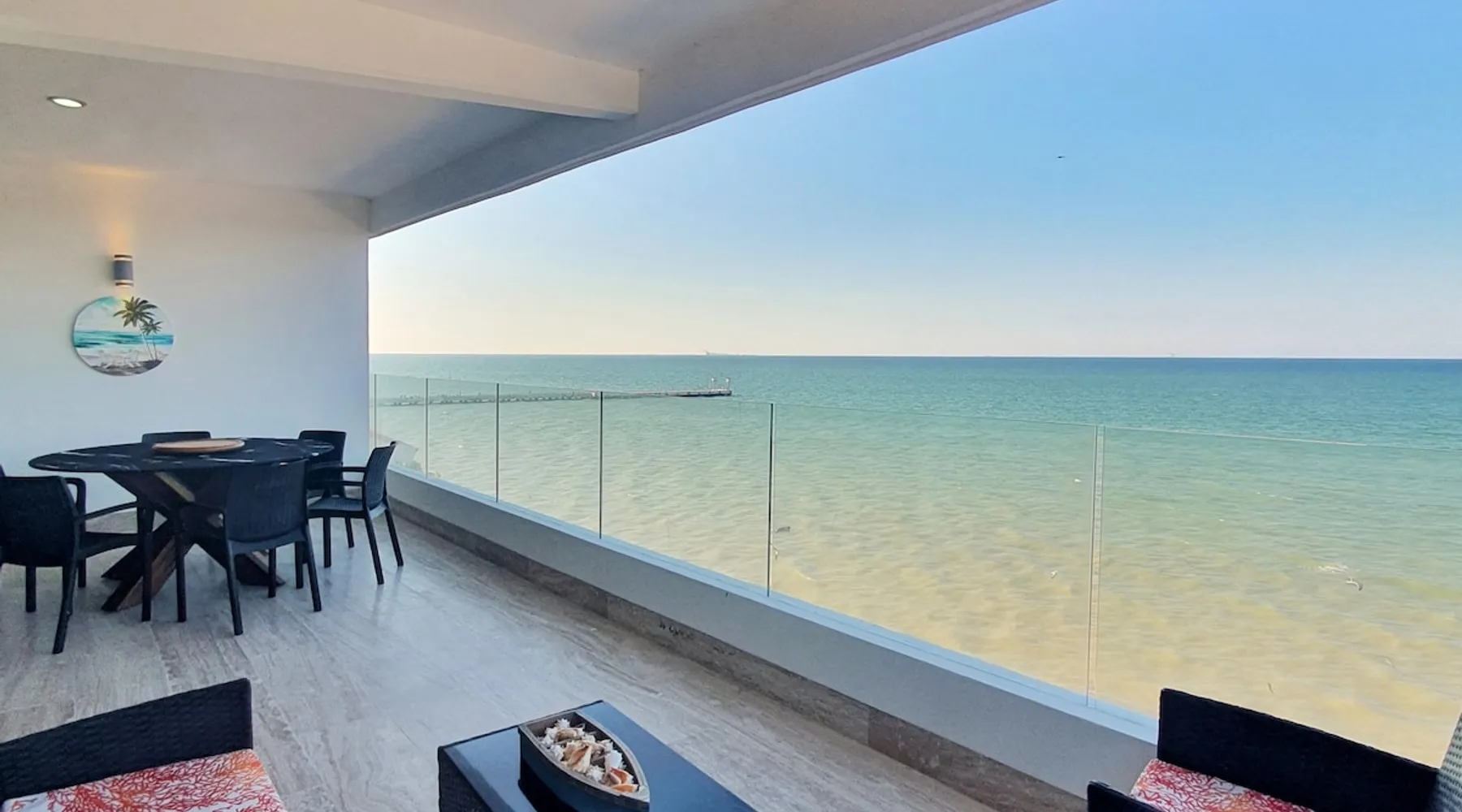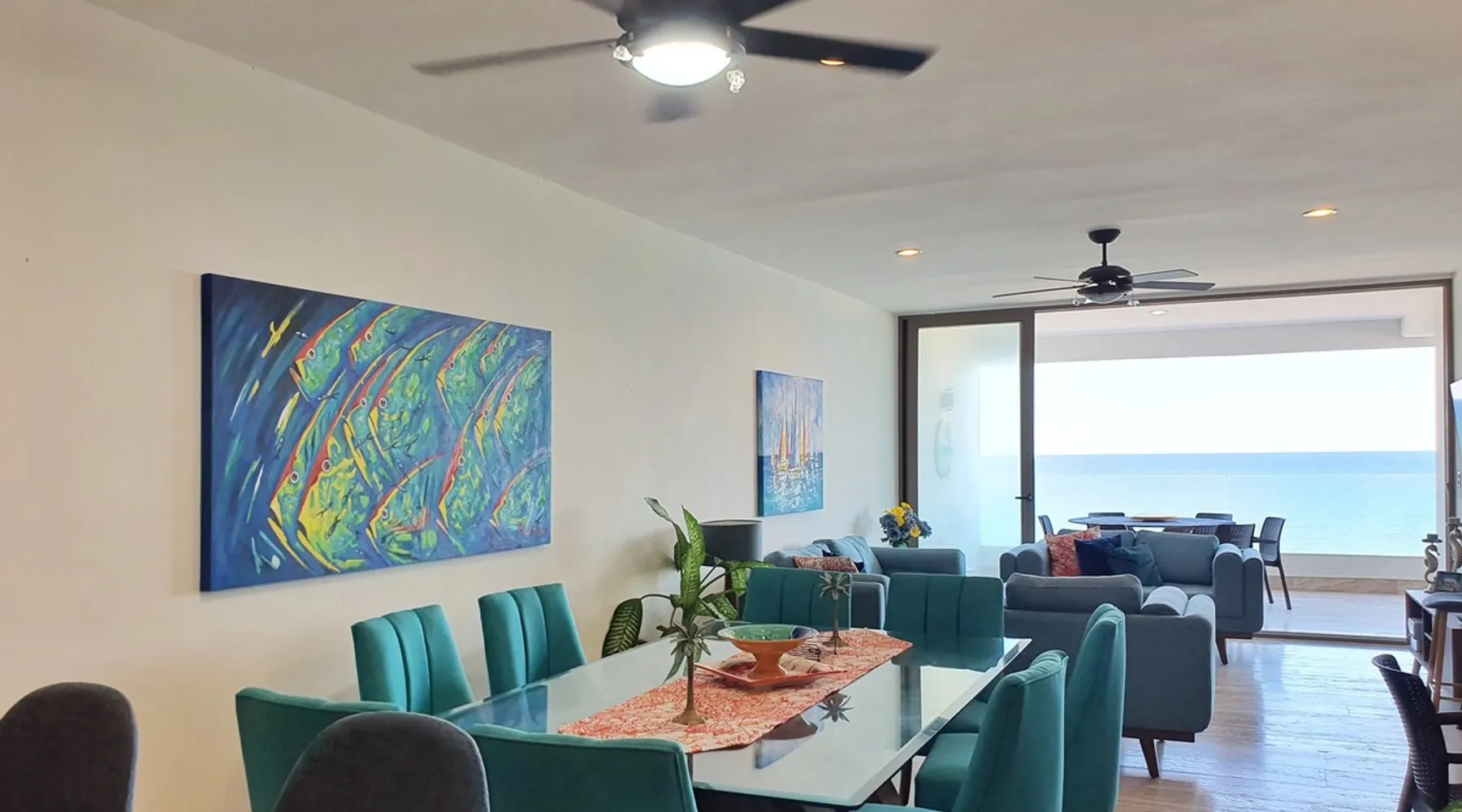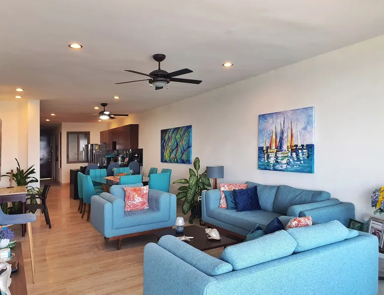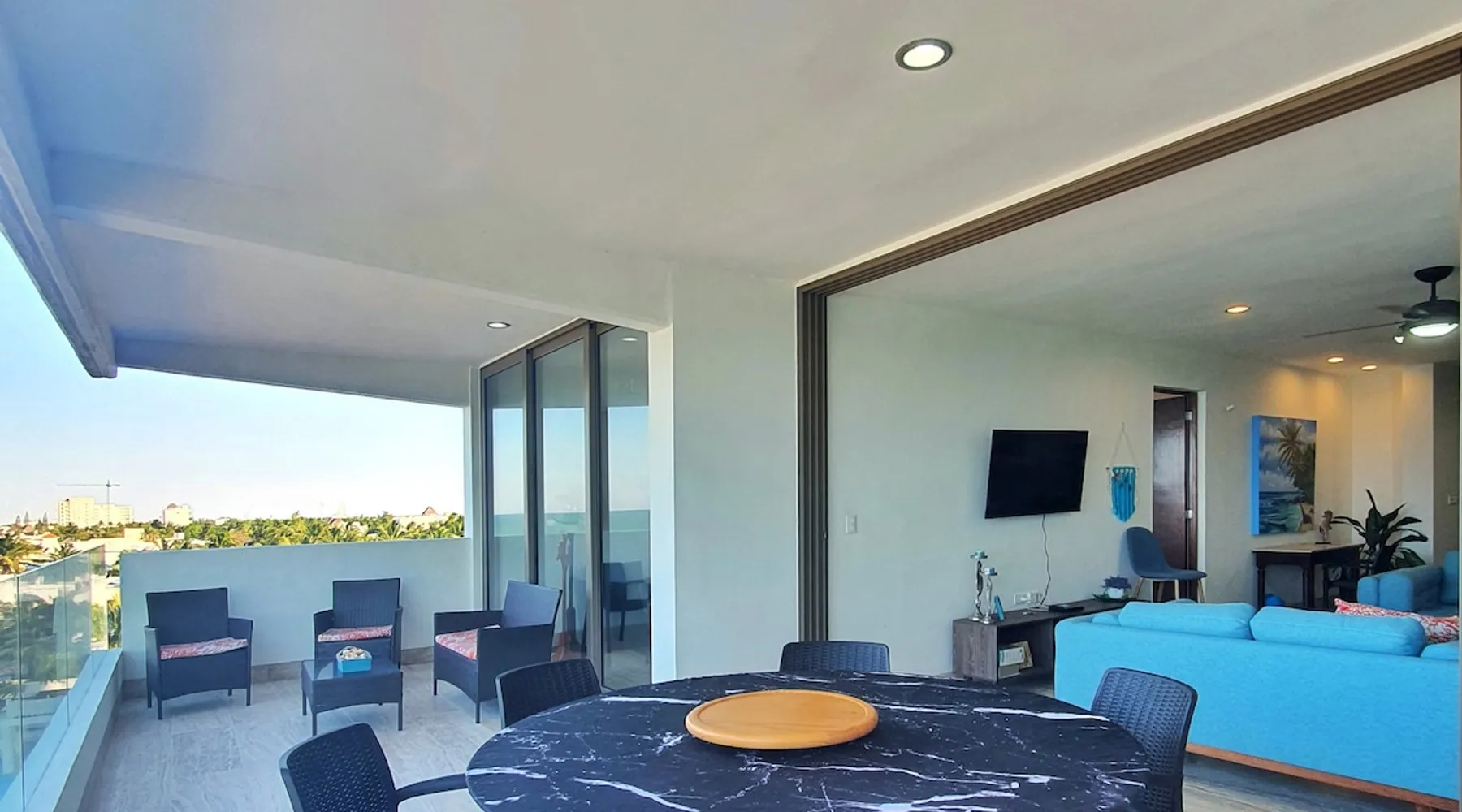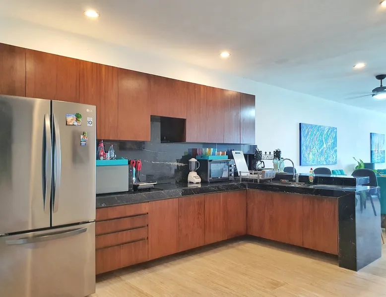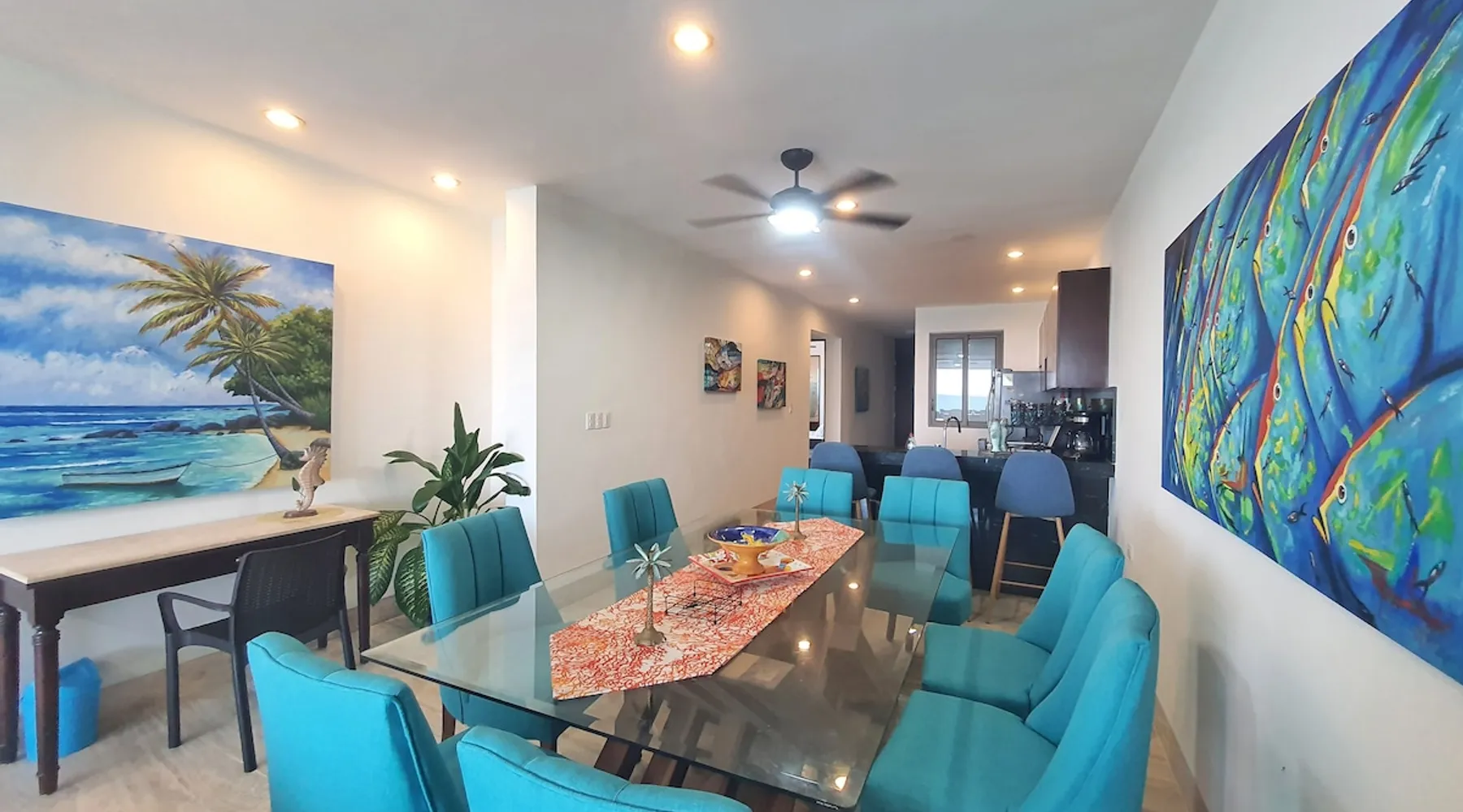 Decorated with the colors of the sea, with direct ocean views and a large social area on the terrace. The space A residential-sized apartment. Fully equipped and its common areas such as gym and pool are Free Access. A very short distance from the village you can walk. Guest access The common areas are the pool, terraces, bar, dining and lobby rooms, jacuzzi, gym, parking and elevator Other things to note We are located very close to downtown Chicxulub Puerto. Ideal for walking and returning.
