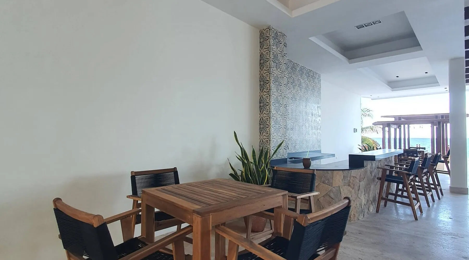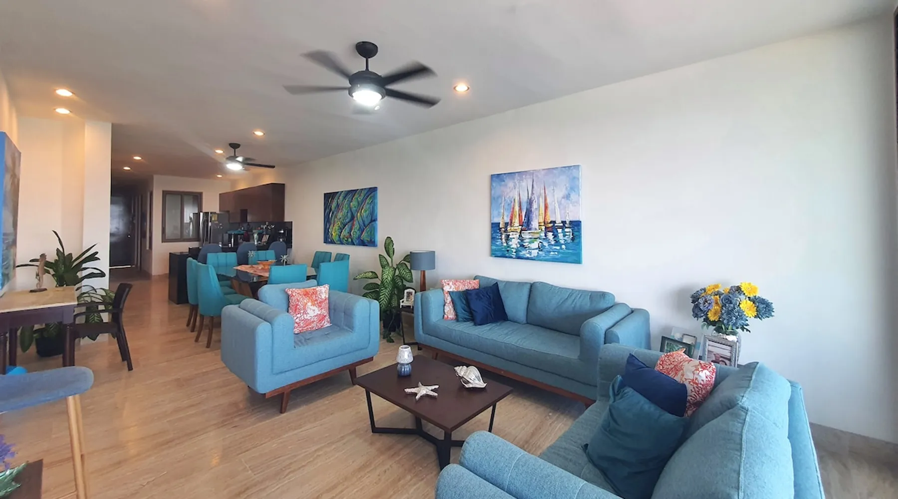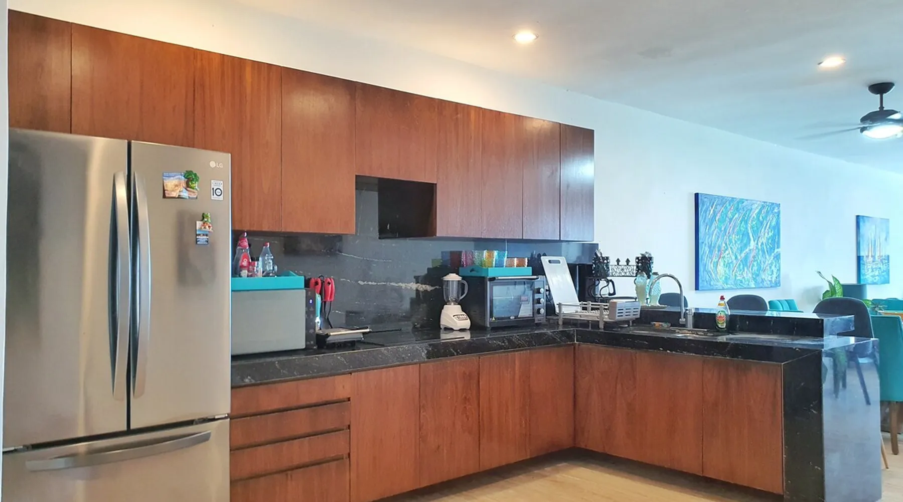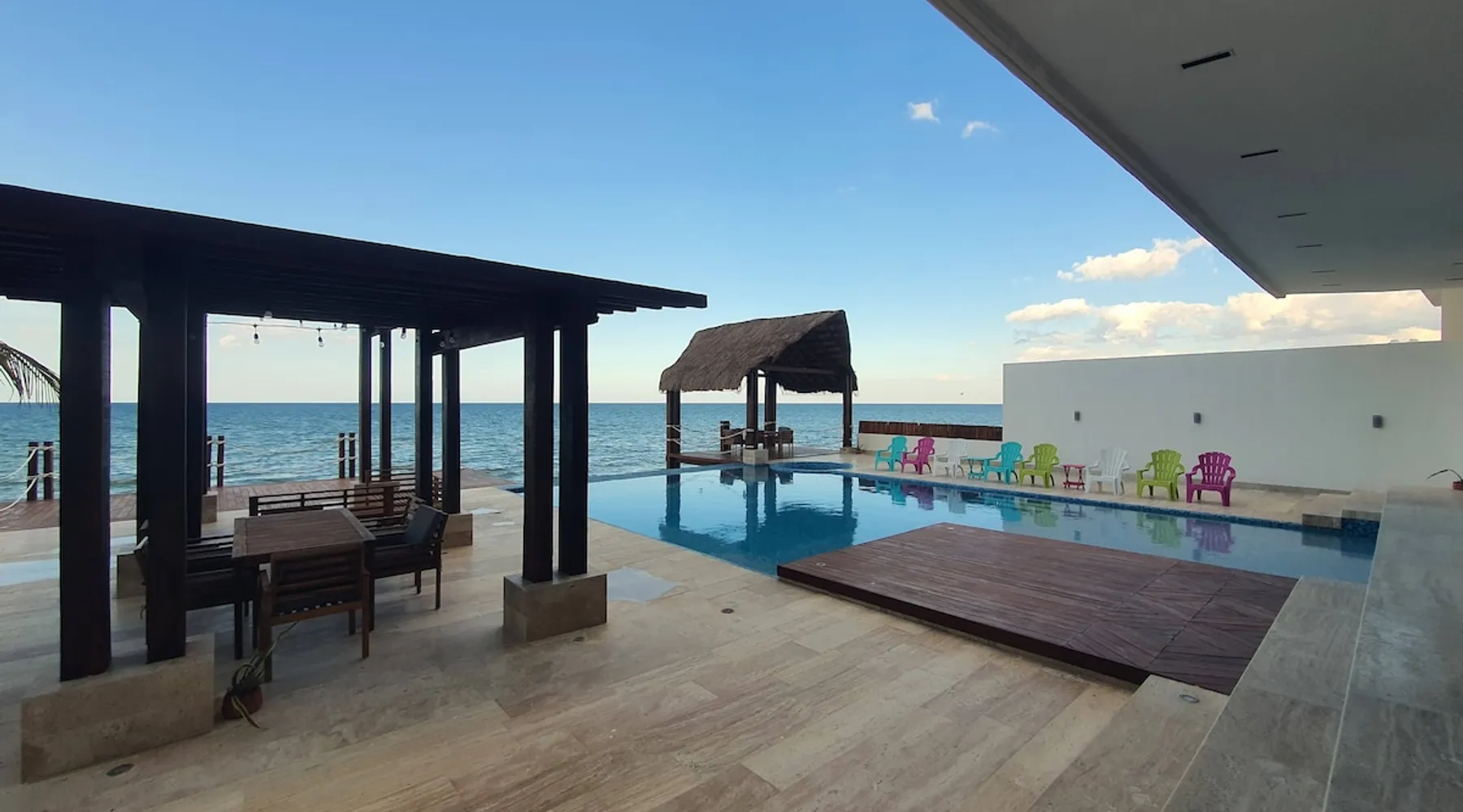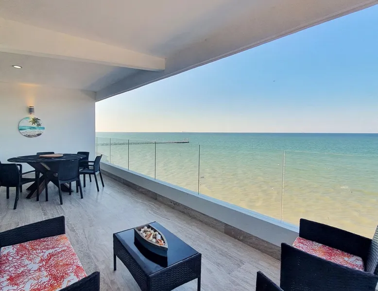 Decorated with the colors of the sea, with direct ocean views and a large social area on the terrace. The space A residential-sized apartment. Fully equipped and its common areas such as gym and pool are Free Access. A very short distance from the village you can walk. Guest access The common areas are the pool, terraces, bar, dining and lobby rooms, jacuzzi, gym, parking and elevator Other things to note We are located very close to downtown Chicxulub Puerto. Ideal for walking and returning.