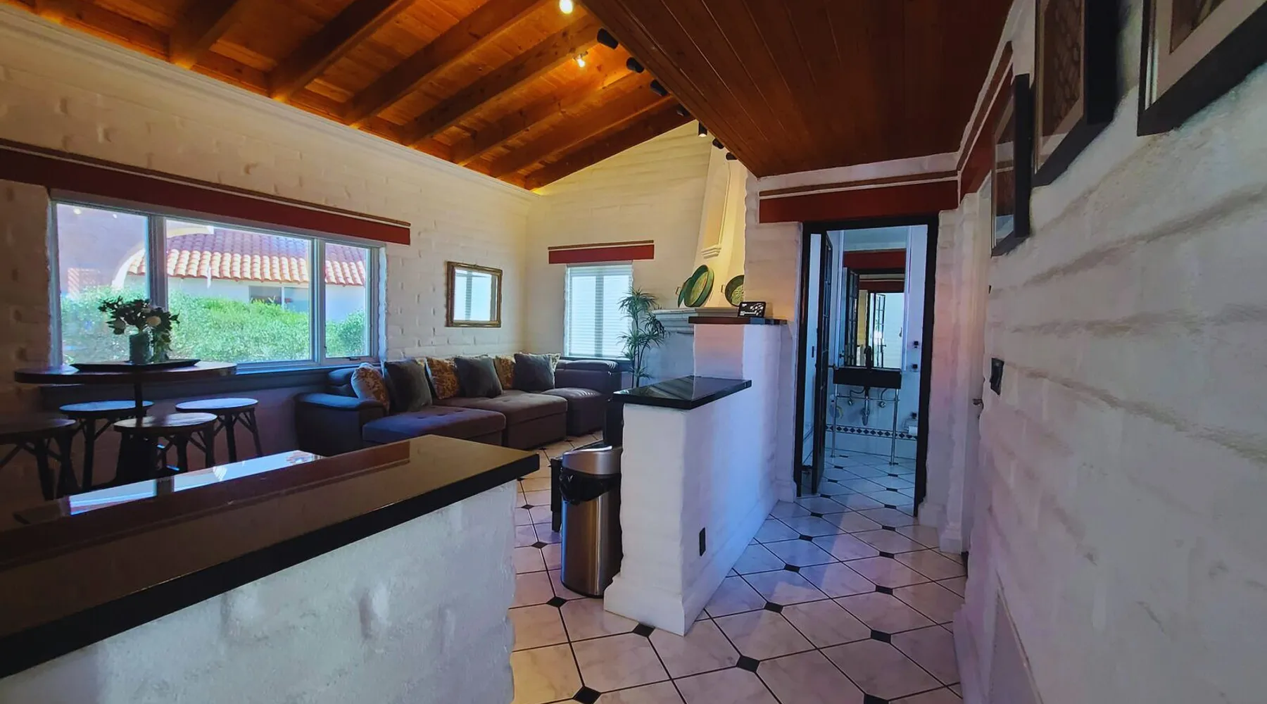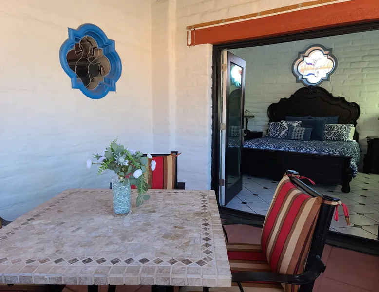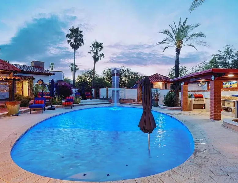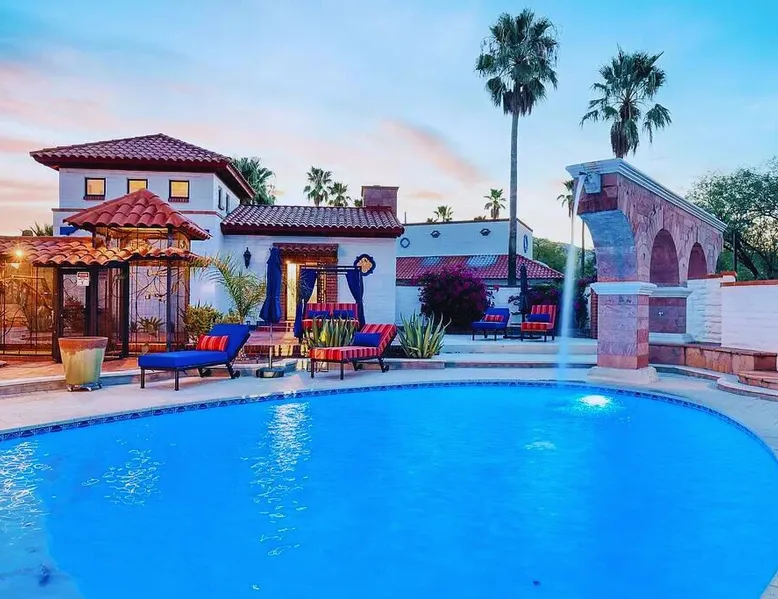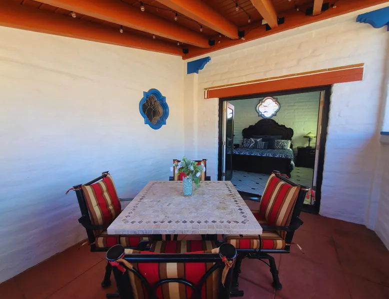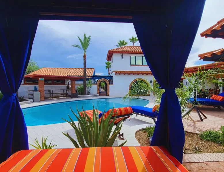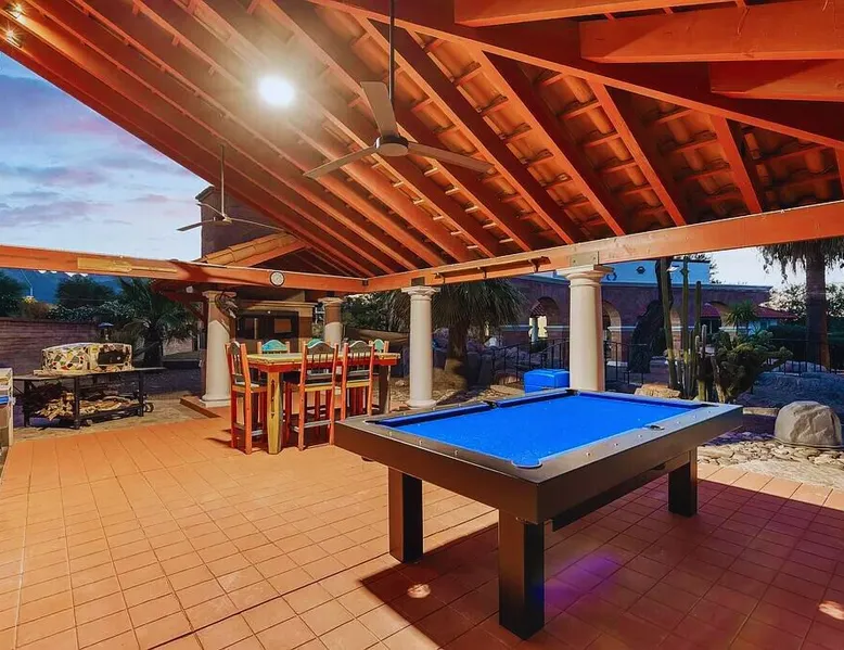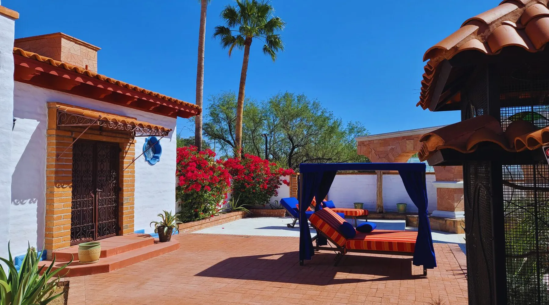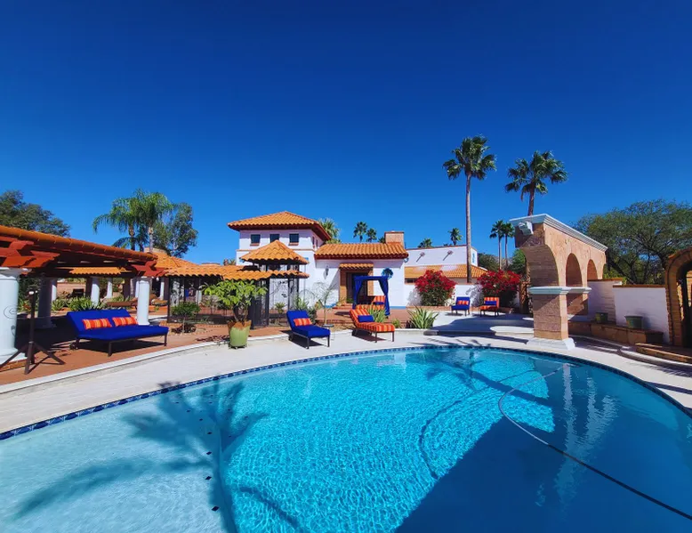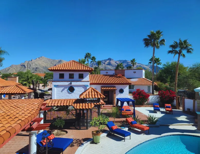 The White Hacienda is a private estate located in sought-after Casas Adobes. Located in the northern metropolitan area of Tucson, the owners are excited to share a rare piece of history with those that appreciate a thoughtfully crafted and timeless "Adobe Estate". This one-of-a kind casita allows you the opportunity to immerse yourself in your own private resort. The luxurious 1 bedroom, 1 bathroom casita offers a mini kitchen with a cooktop, microwave, mini fridge, and quartz countertops. You'll fall in love with the custom mesquite wood finishes throughout the casita and beautiful exposed wood beam ceilings. Did we mention your own private patio to have morning coffee or afternoon high tea? The property features a fully equipped outdoor kitchen(s) with a rotisserie, pizza oven, smoker and grill, large salt water pool with large lagoon fountains, water features throughout the property, and a large, covered patio and Ramada for outdoor living. Other unique features include an aviary for exotic birds, UofA Basketball court, an indoor racquetball court and gym. The property is right off the main road here in Tucson (Casas Adobes), we are within walking distance to the upscale shopping center, Casas Adobes Plaza, a historical retail destination, dating back to 1948 (Casas Adobes is considered to be the first developed suburb of Tucson). This incredible location has it all-walkability to fantastic restaurants, coffee, bars, shops, and more, easy access to world-class golf resorts & country clubs, and access to I-10, the University of Arizona, and downtown Tucson. The following amenities are included with your stay at NO EXTRA charge: - Basketball Court - Racquetball Court - Private Gym - Outdoor Pool Table - Outdoor Kitchen(s) - Outdoor Pizza Wood Oven(s) - Outdoor Pool - Cabana The total square footage of the casita is 763 square feet *** Please note that renting the casita does not include hosting events on the property. While we understand that our location and property can be a beautiful backdrop for events, we would like to emphasize that event hosting is completely separate from casita rental. We kindly ask that you do not assume that renting our casita entitles you to host an event on the property. If you are interested in hosting an event at our location, please contact us to discuss further arrangements. We will be happy to work with you to find the perfect solution for your event needs.*** More pictures coming soon, we are still getting the property set-up... **The property has been and will continue to be updated**
