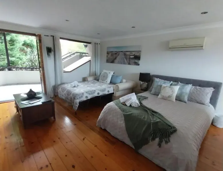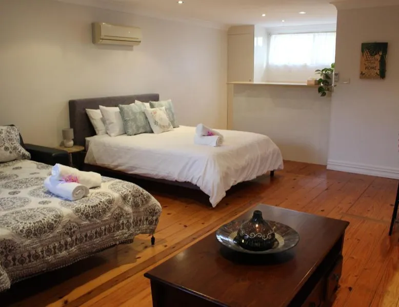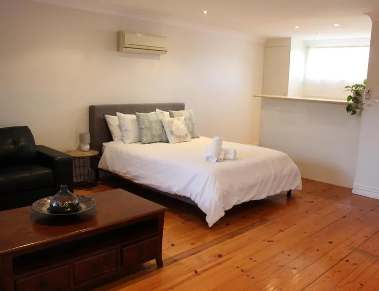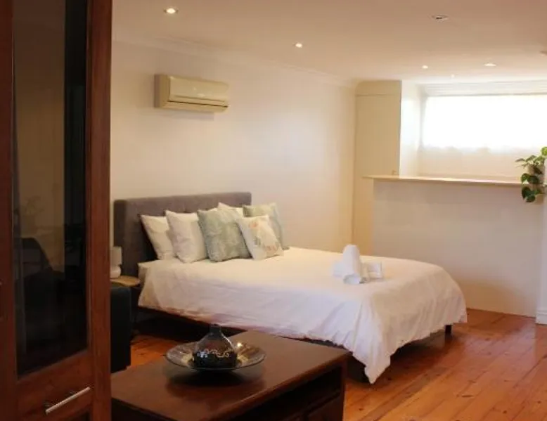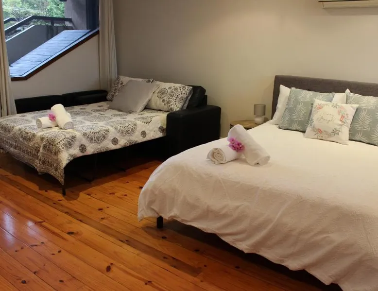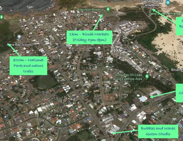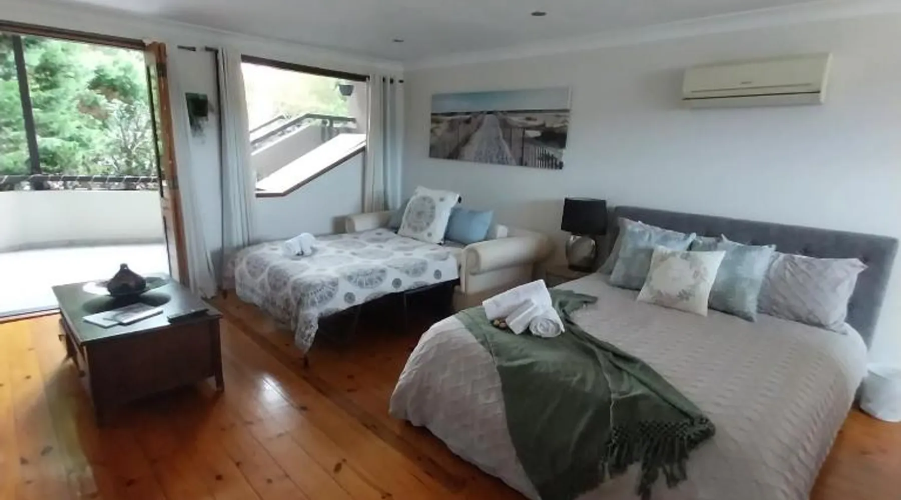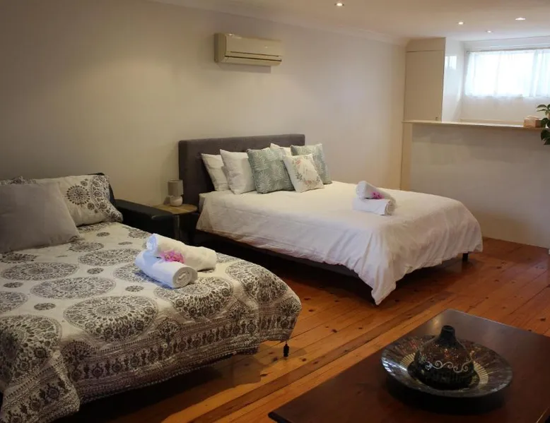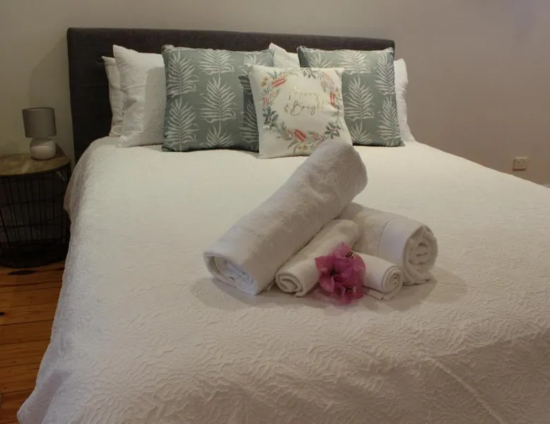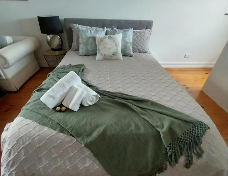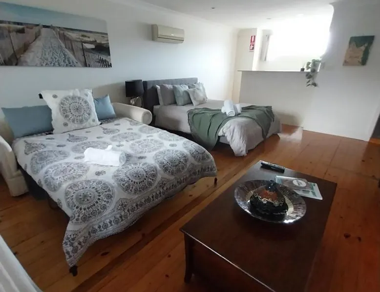 Comfortable Accommodations: Bubbles and Waves in Anna Bay offers family rooms with air-conditioning, balconies, and private bathrooms. Each room includes a tea and coffee maker, refrigerator, free toiletries, shower, TV, electric kettle, and kitchenware. Essential Facilities: Guests enjoy a sun terrace and free WiFi. The property features an outdoor seating area and private check-in and check-out services. Free on-site private parking is available. Prime Location: Located less than 0.6 mi from Stockton Beach and 16 mi from Newcastle Airport, Bubbles and Waves is near attractions such as Anchorage Marina Port Stephens (6.8 mi) and D'Albora Marinas Nelson Bay (6.8 mi). Surfing opportunities are available in the surrounding area. This air-conditioned family room has a private bathroom, a tea and coffee maker, heating as well as a balcony. The unit has 2 beds.