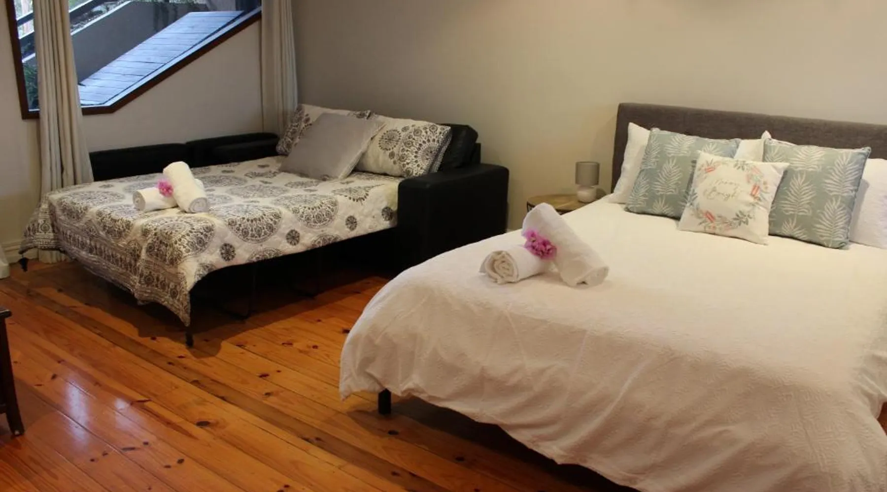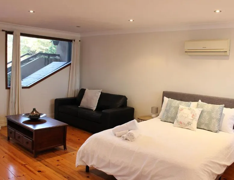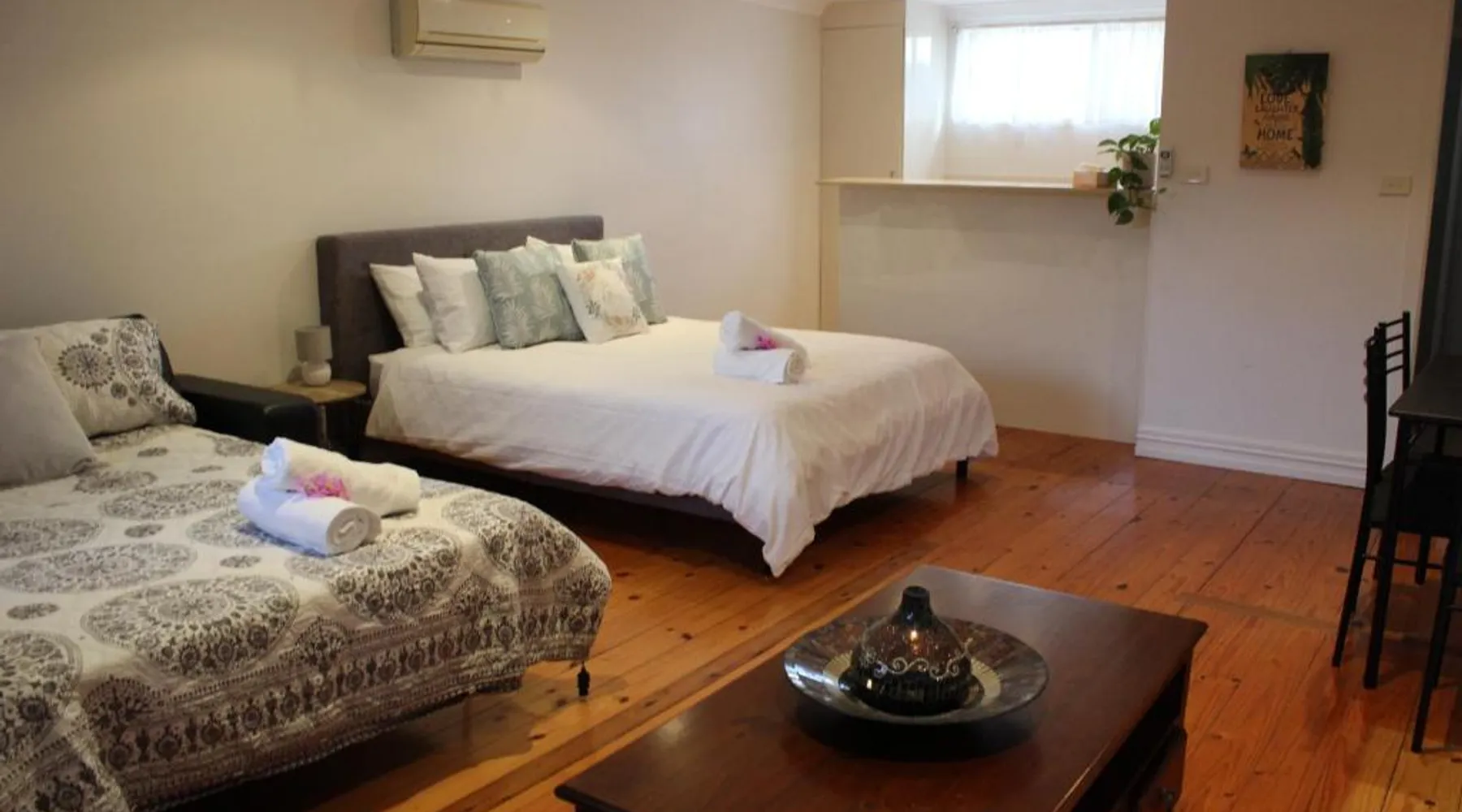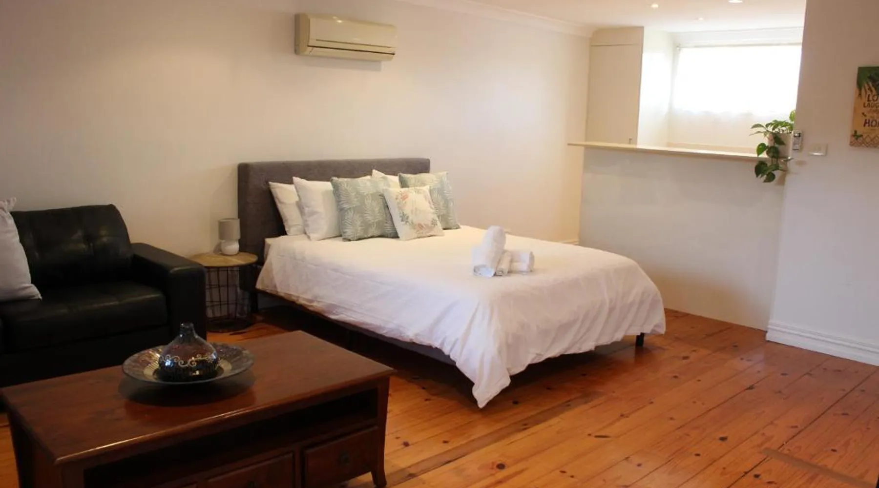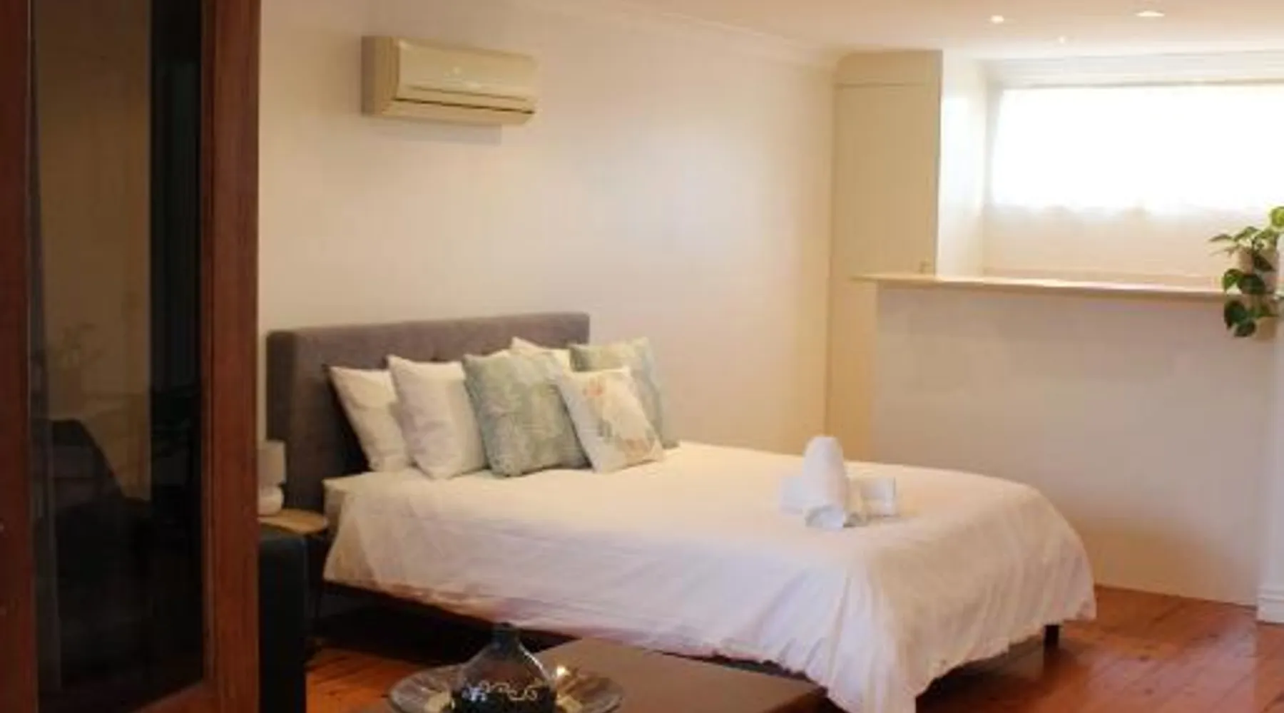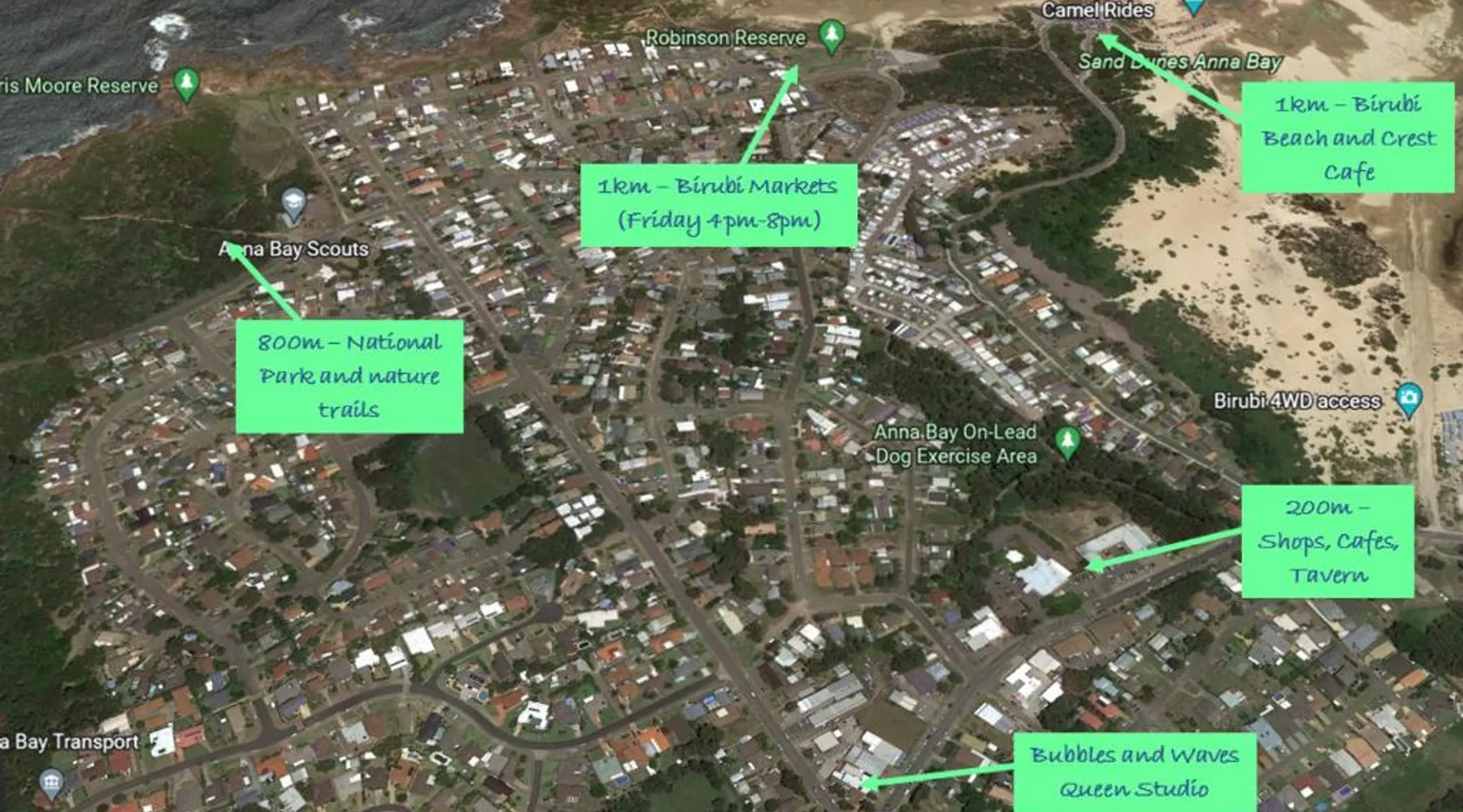 Comfortable Accommodations: Bubbles and Waves in Anna Bay offers family rooms with air-conditioning, balconies, and private bathrooms. Each room includes a tea and coffee maker, refrigerator, free toiletries, shower, TV, electric kettle, and kitchenware. Essential Facilities: Guests enjoy a sun terrace and free WiFi. The property features an outdoor seating area and private check-in and check-out services. Free on-site private parking is available. Prime Location: Located less than 0.6 mi from Stockton Beach and 16 mi from Newcastle Airport, Bubbles and Waves is near attractions such as Anchorage Marina Port Stephens (6.8 mi) and D'Albora Marinas Nelson Bay (6.8 mi). Surfing opportunities are available in the surrounding area. This air-conditioned family room has a private bathroom, a tea and coffee maker, heating as well as a balcony. The unit has 2 beds.