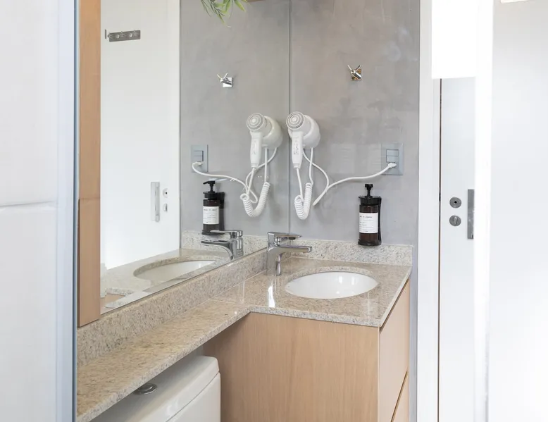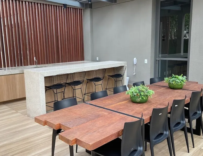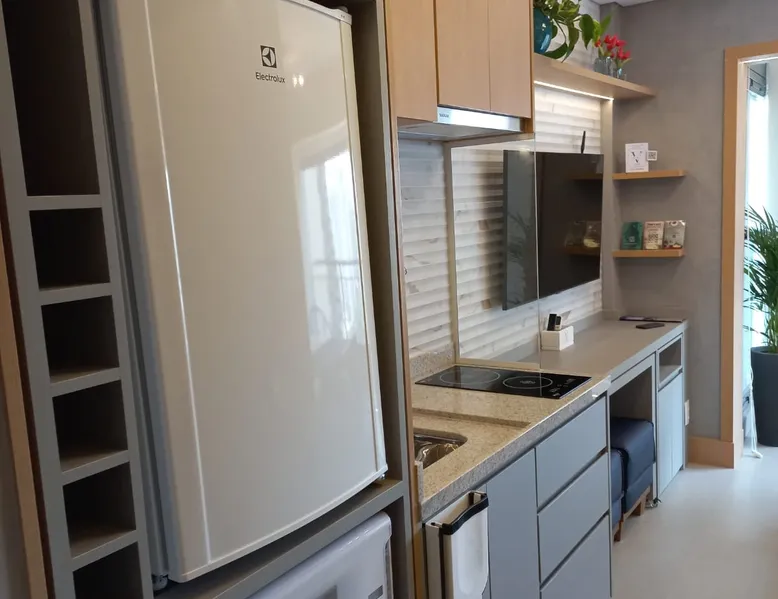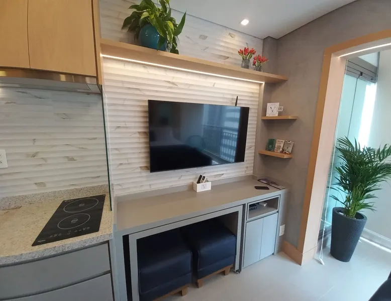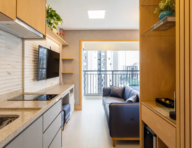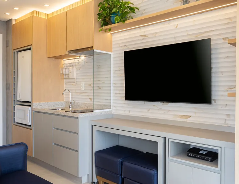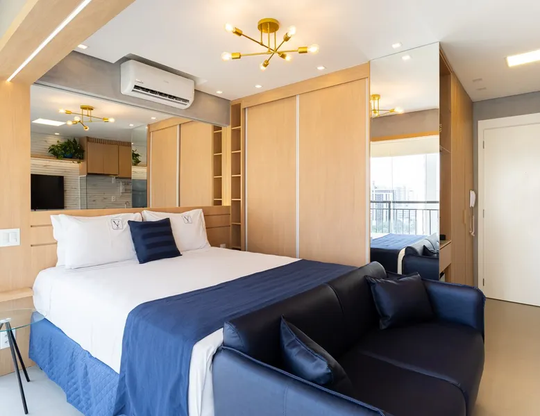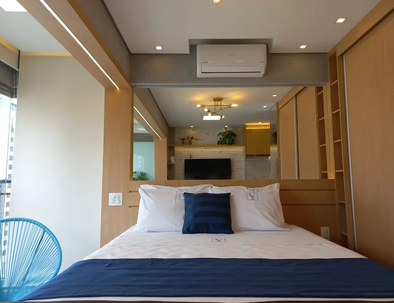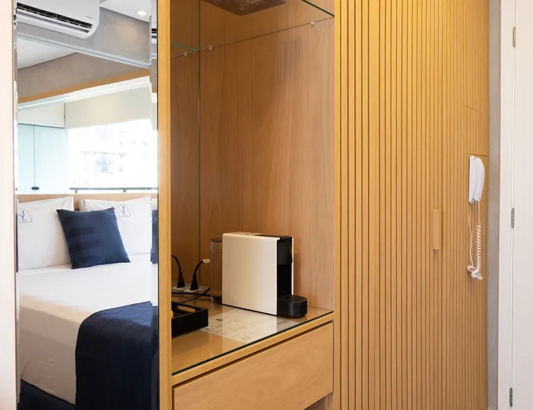 Studio in the heart of Moema, equipped with a queen-size bed + single auxiliary bed, wine cellar, minibar, stove, coffee maker, air-conditioning.50" TV, Wi-Fi, in a cozy atmosphere next to the Moema subway, close to Ibirapuera parks, bicycles and the best restaurants in the region. The decoration and lighting make the studio exclusive, adding personality and sophistication. Agreement: 24-hour valet parking (R$ 30.00/day); Location: Av Jamaris, 100 - Time Square hotel (building next door)