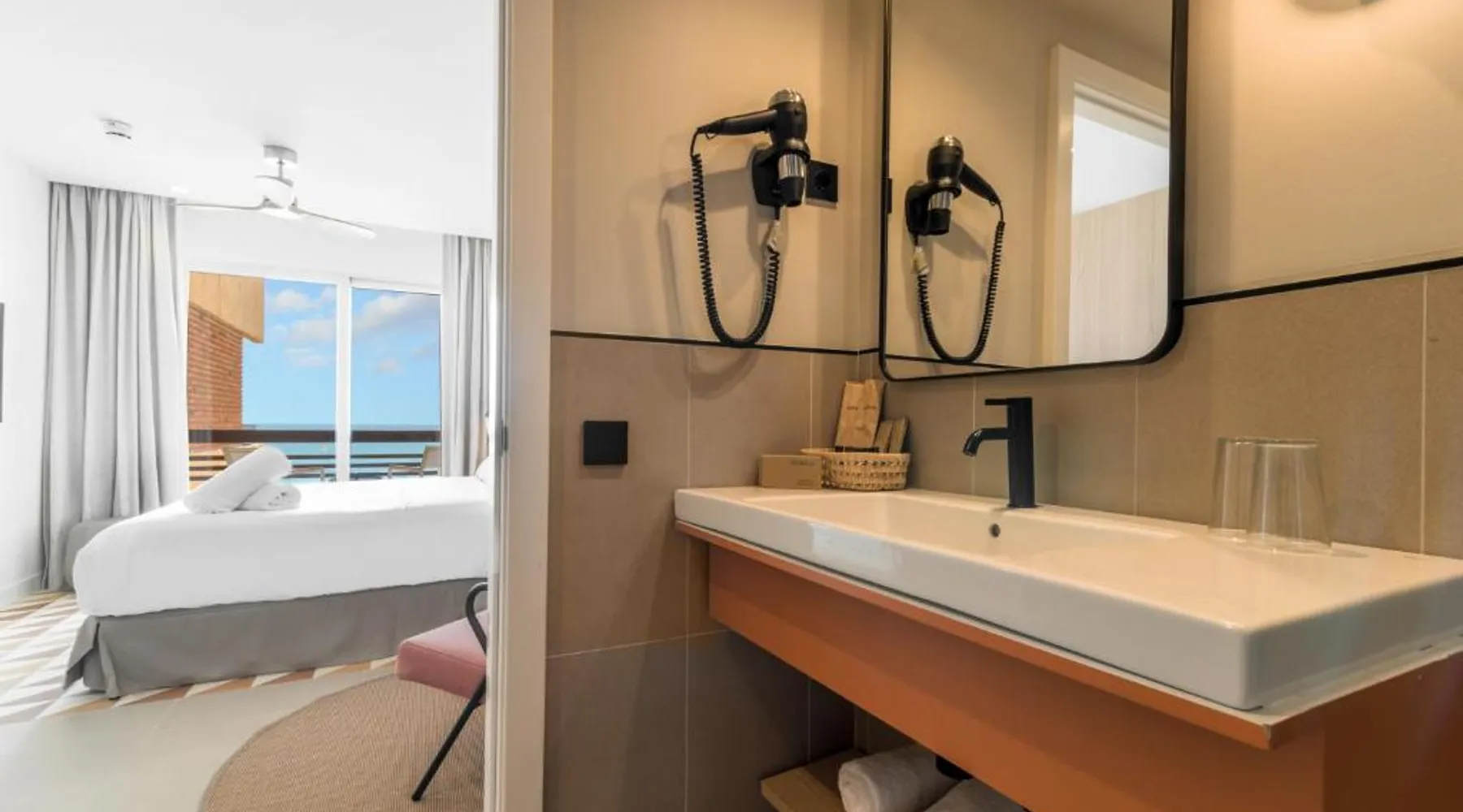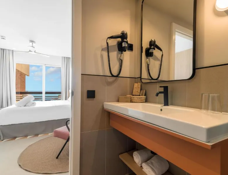 Located on Calafell beach, Akquaaa Boutique Hotel has a beach bar and restaurant with a terrace on the seafront with sea views. All rooms have high-speed Wi-Fi, fan, air conditioning, Smart TV, safe and modern bathrooms with MAAR amenities. All rooms at the Akquaaa Boutique Hotel have a mini-bar, heating and telephone. Some rooms have a terrace and the classic rooms have side sea views. Guests can enjoy a buffet breakfast in the morning and at noon and in the evening from a wide variety of dishes offered by the restaurant. Guests can also dine on the terrace overlooking the beach during the summer, and at the beach bar. The Akquaaa Boutique Hotel is located in Calafell, on the Costa Daurada. There are shops and restaurants just 5 minutes from Akquaaa Boutique Hotel. This room has a private balcony and sea views.
